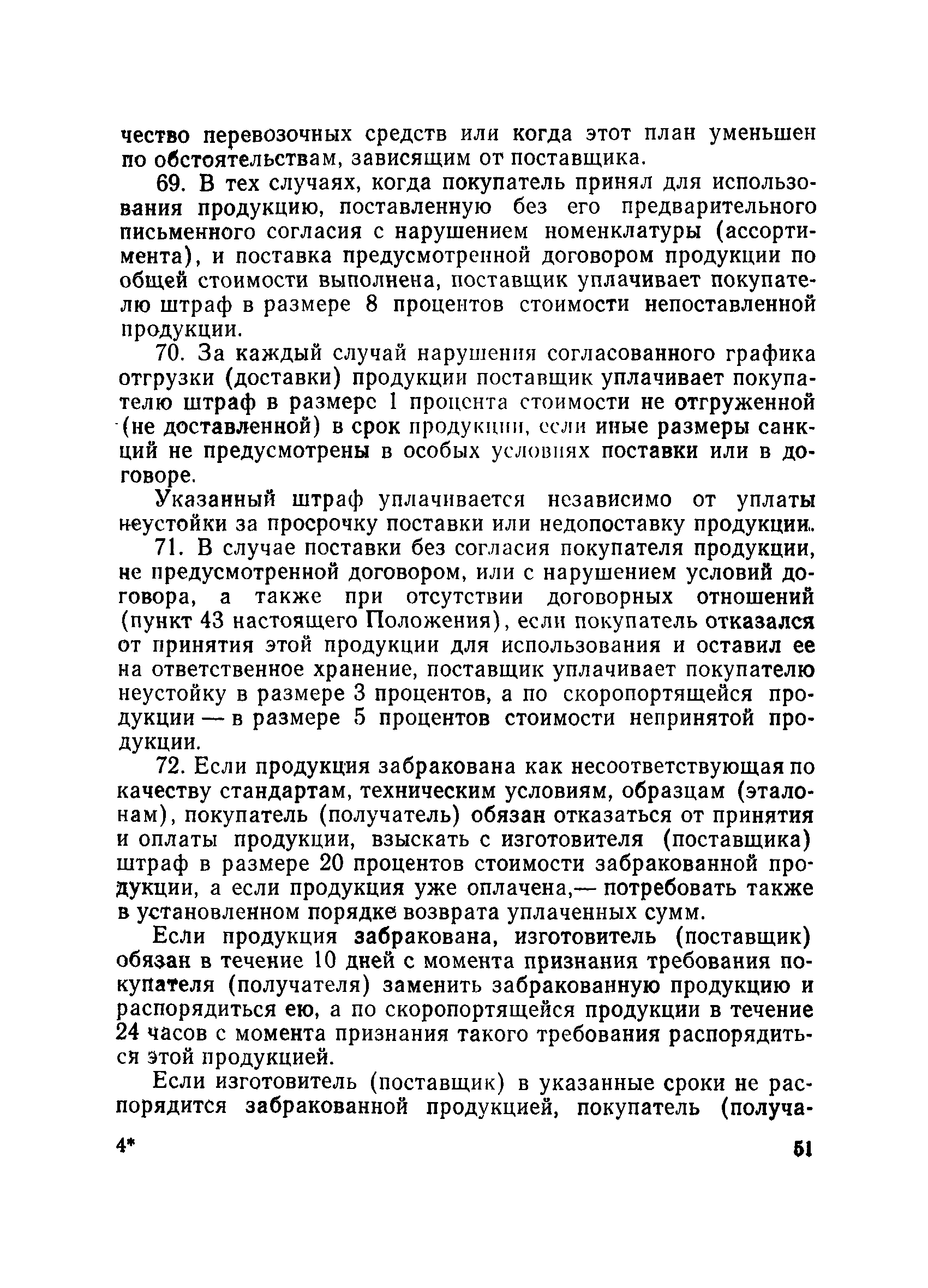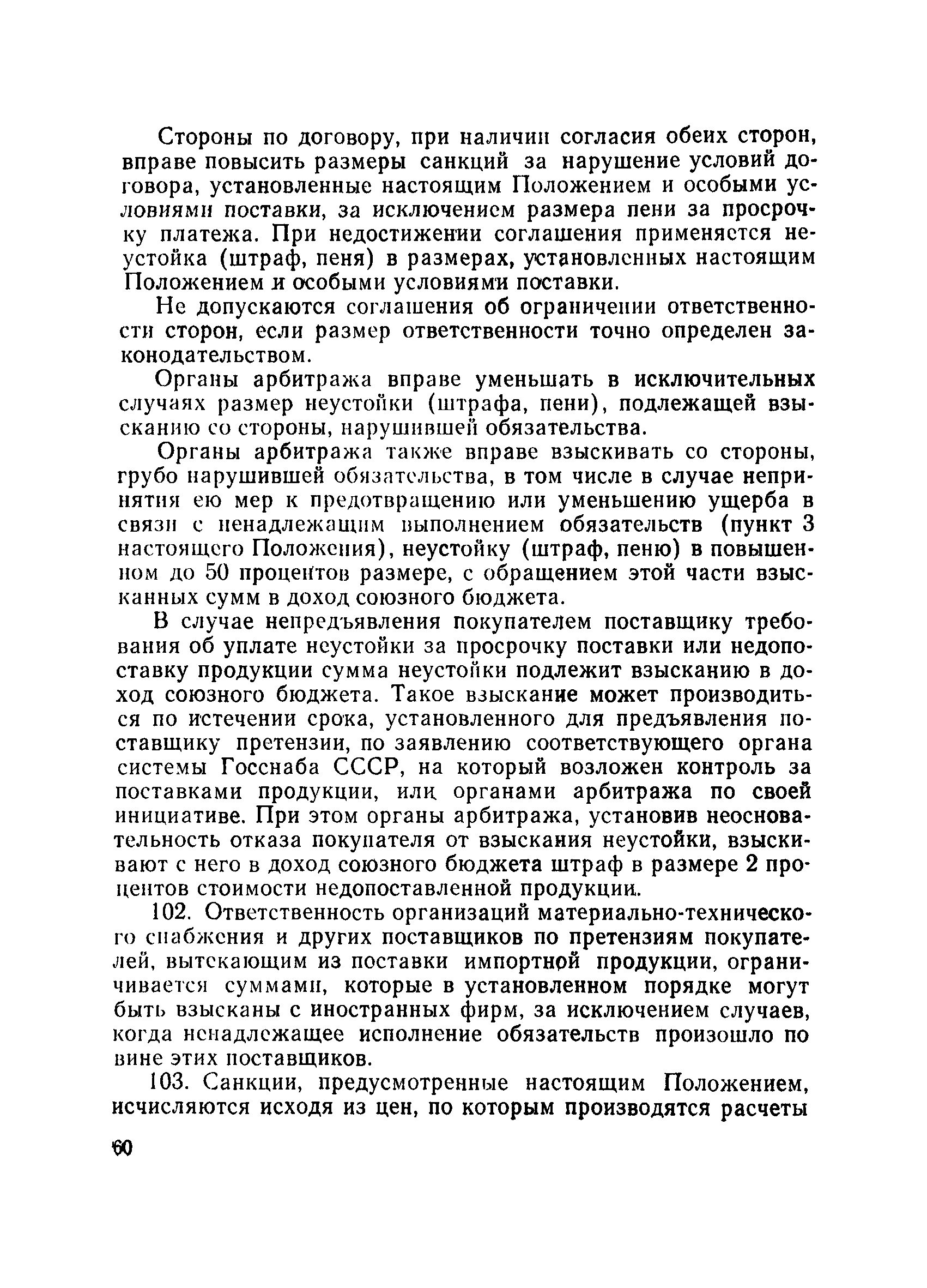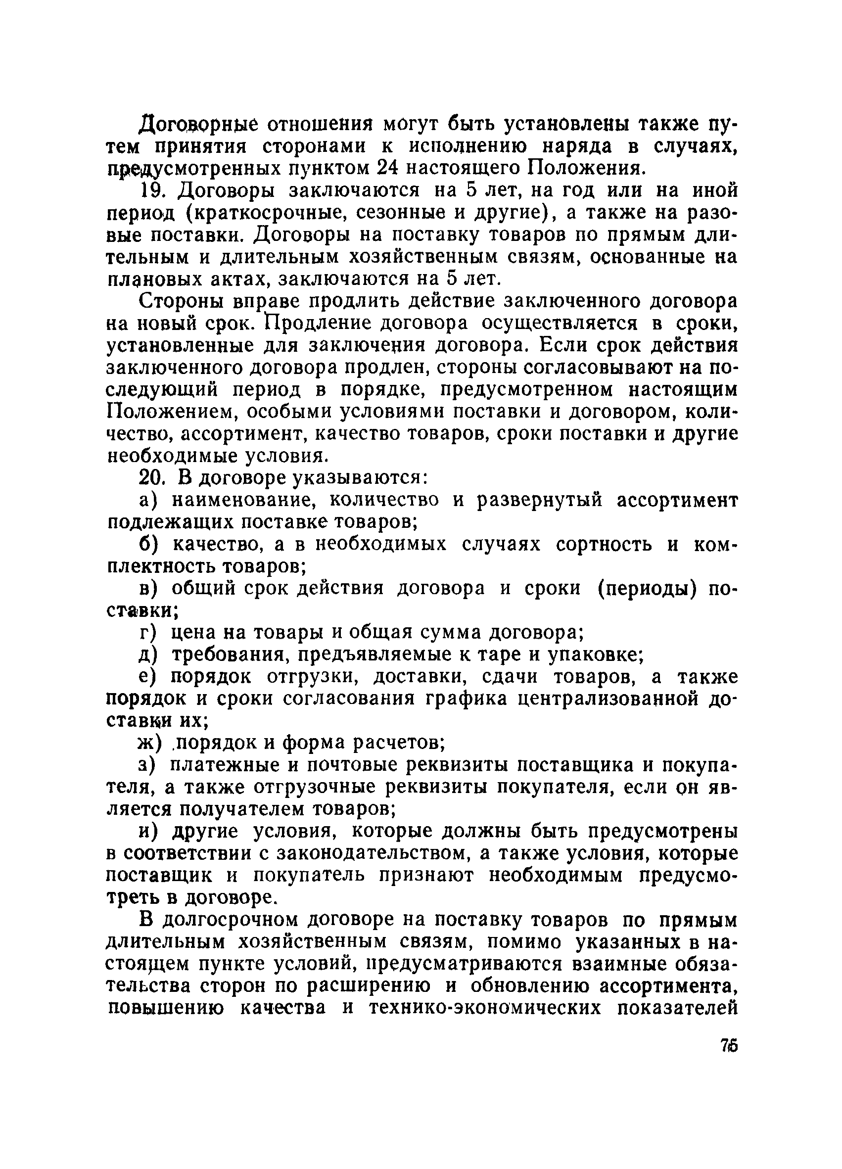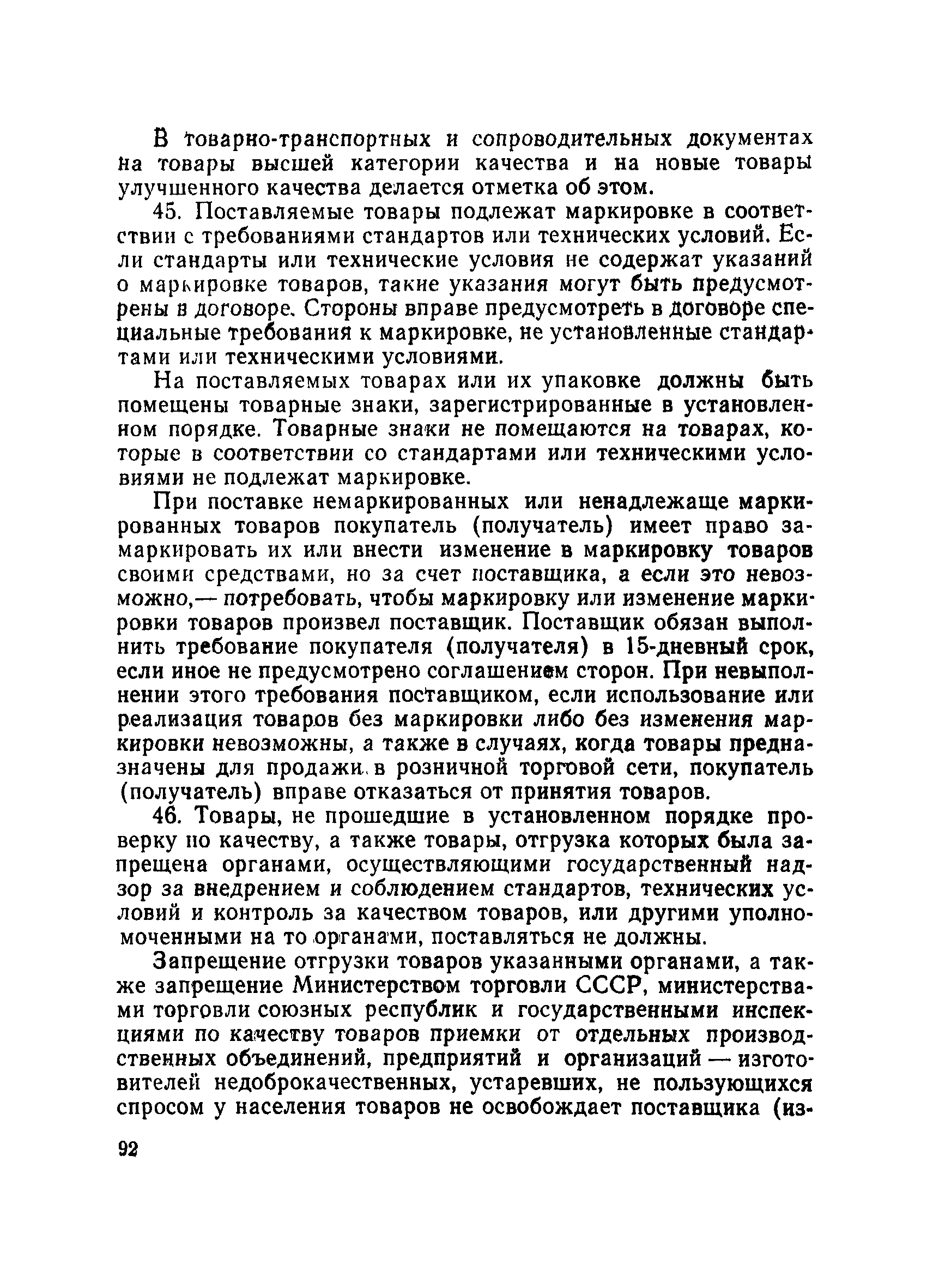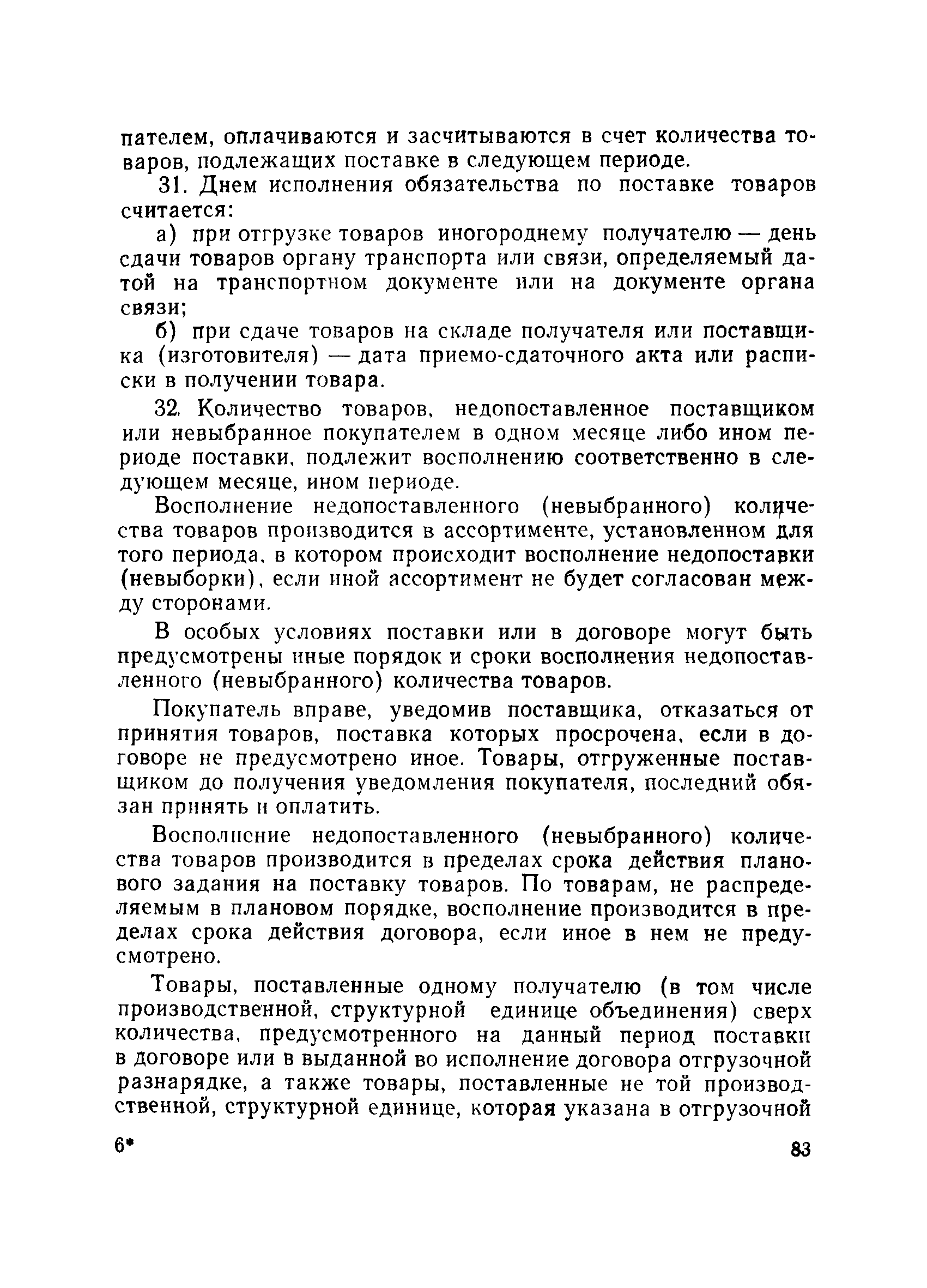 | Оглавление: | Положение о поставках продукции производственно-технического назначения I. Общие положения II. Плановые основания заключения договоров и организация хозяйственных связей III. Порядок и сроки заключения договоров IV. Количество, сроки и порядок поставки продукции V. Качество и комплектность продукции VI. Тара, упаковка и средства пакетирования продукции VII. Цены и порядок расчетов VIII. Имущественная ответственность Положение о поставках товаров народного потребления I. Общие положения II. Плановые основания заключения договоров и организация хозяйственных связей III. Порядок и сроки заключения договоров на поставку товаров IV. Количество, ассортимент, сроки и порядок поставки товаров V. Качество и комплектность товаров VI. Тара, упаковка и средства пакетирования товаров VII. Цены и порядок расчетов VIII. Имущественная ответственность Перечень утративших силу решений Правительства СССР Изменения, которые вносятся в решения Правительства СССР |