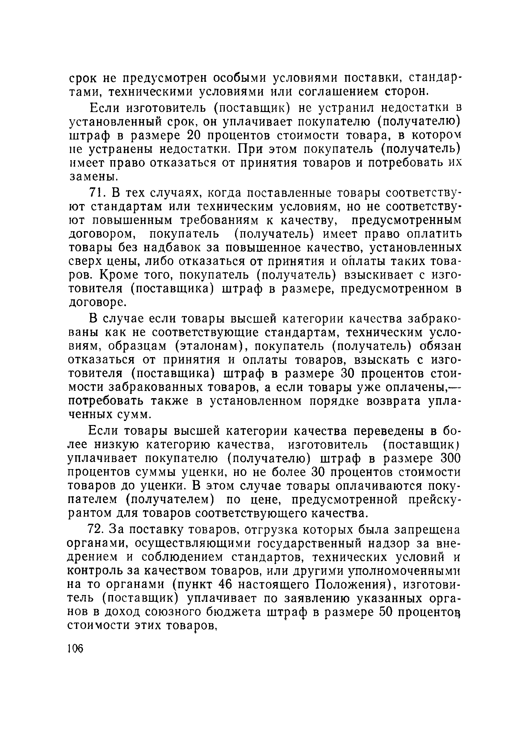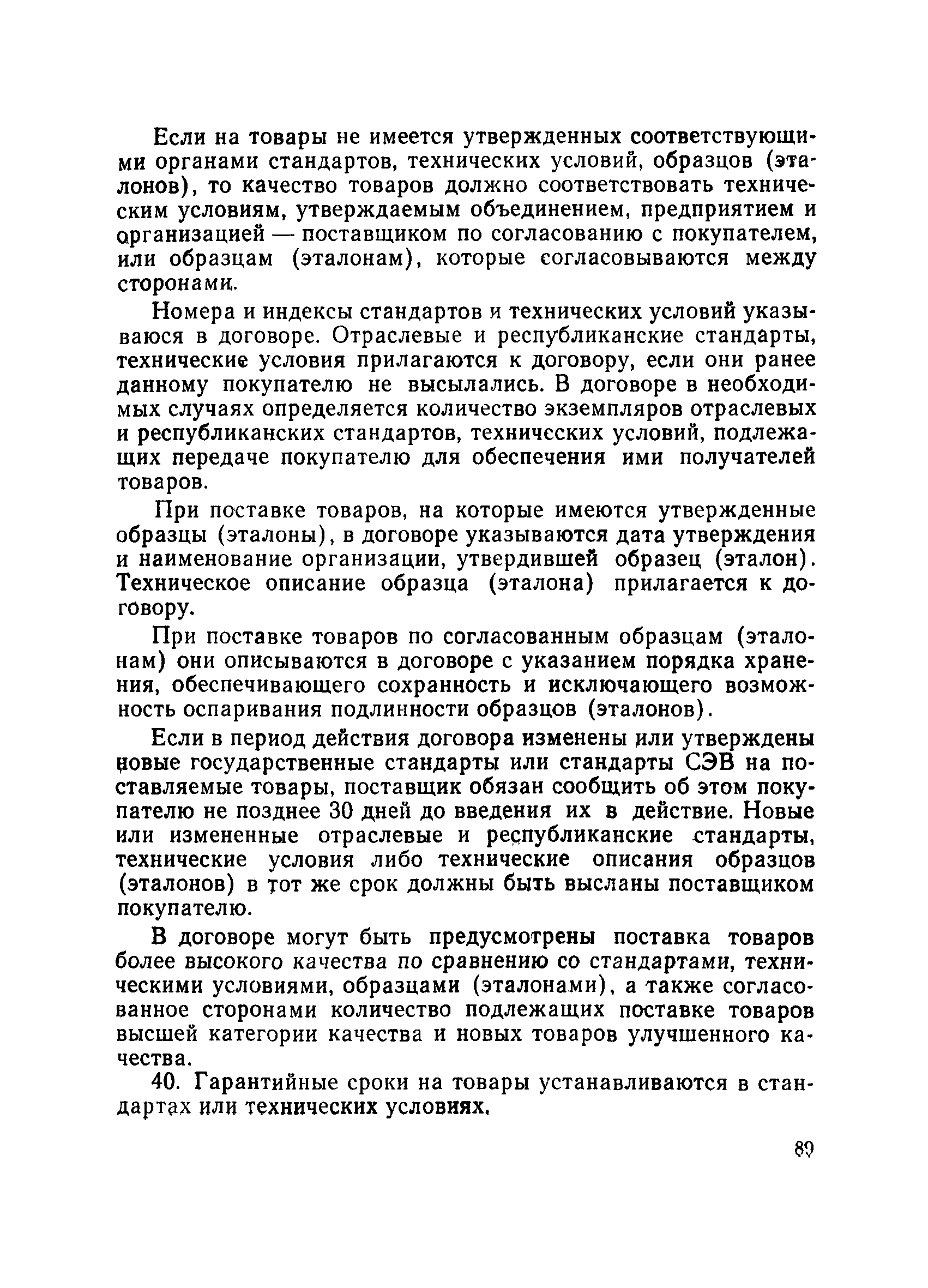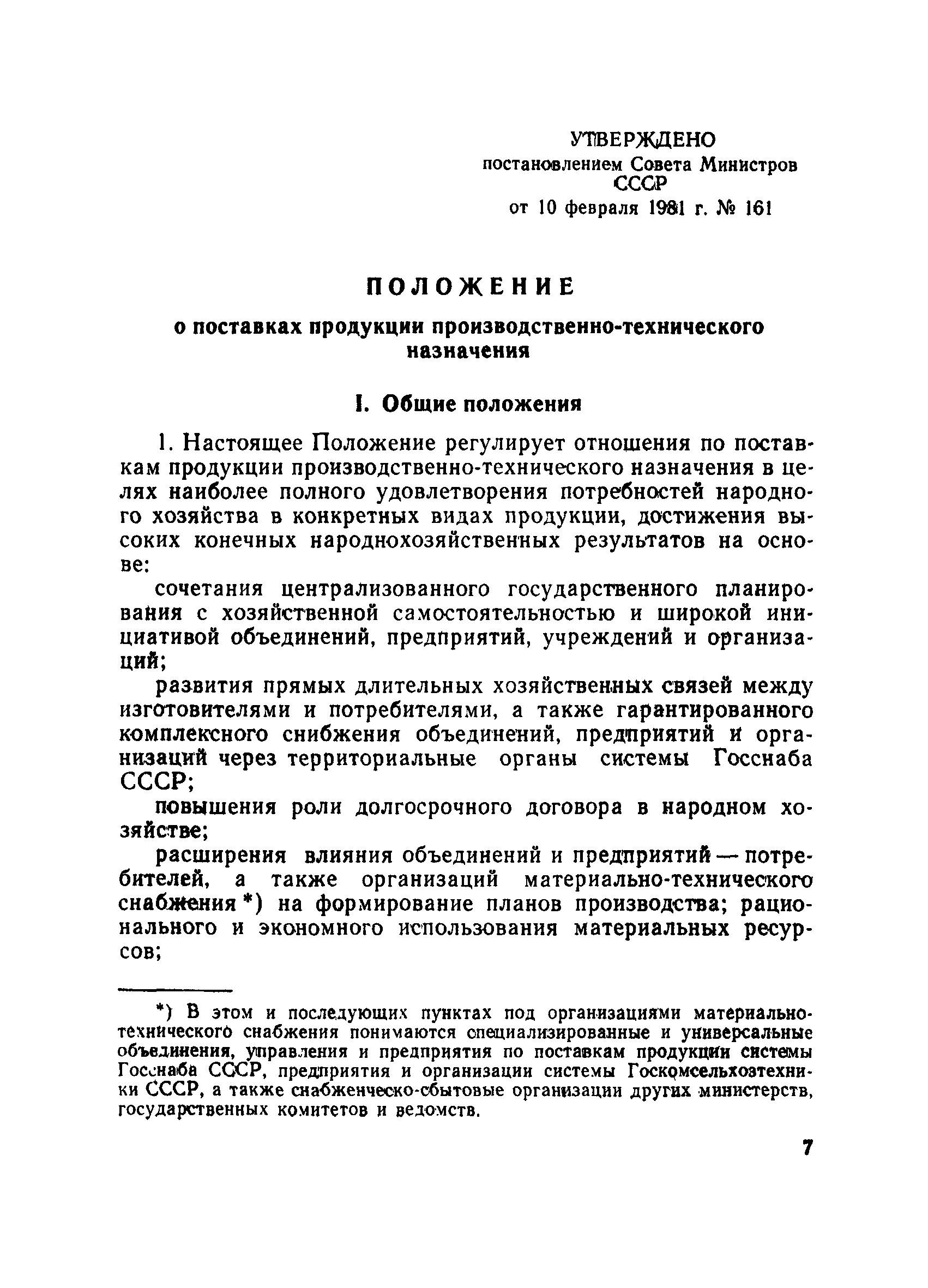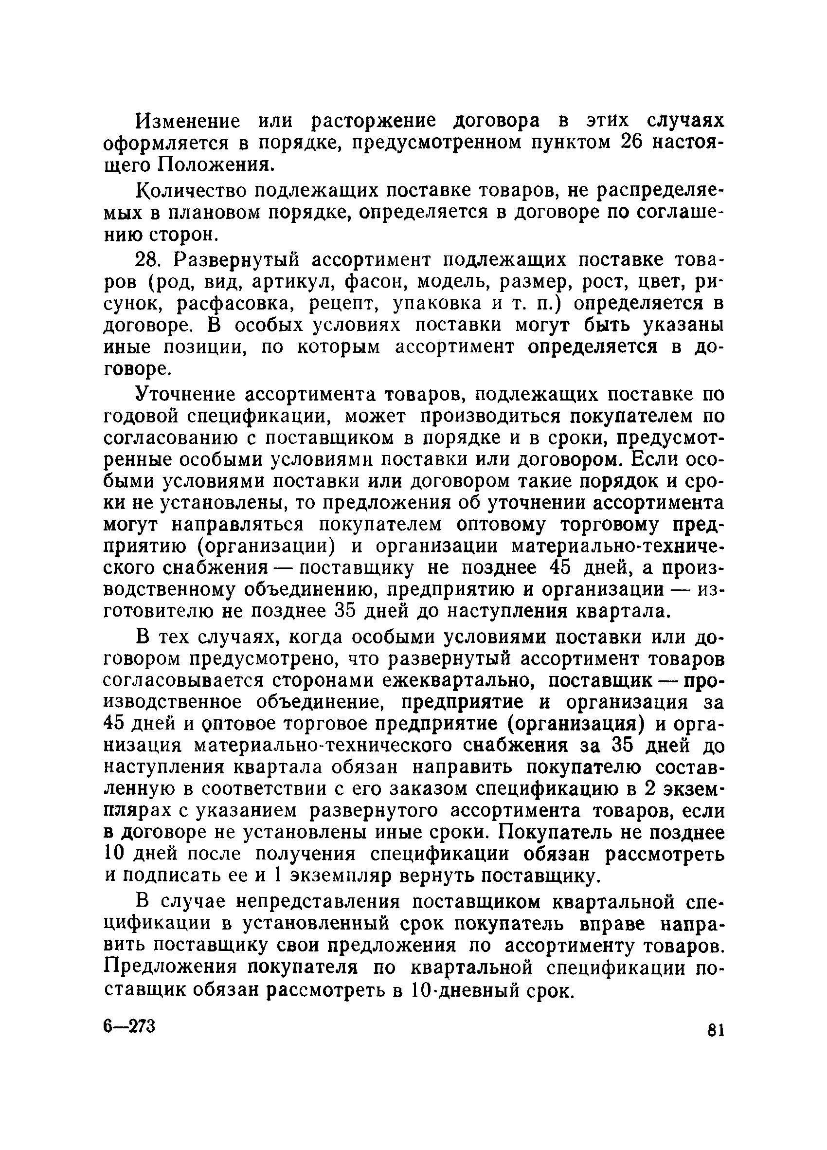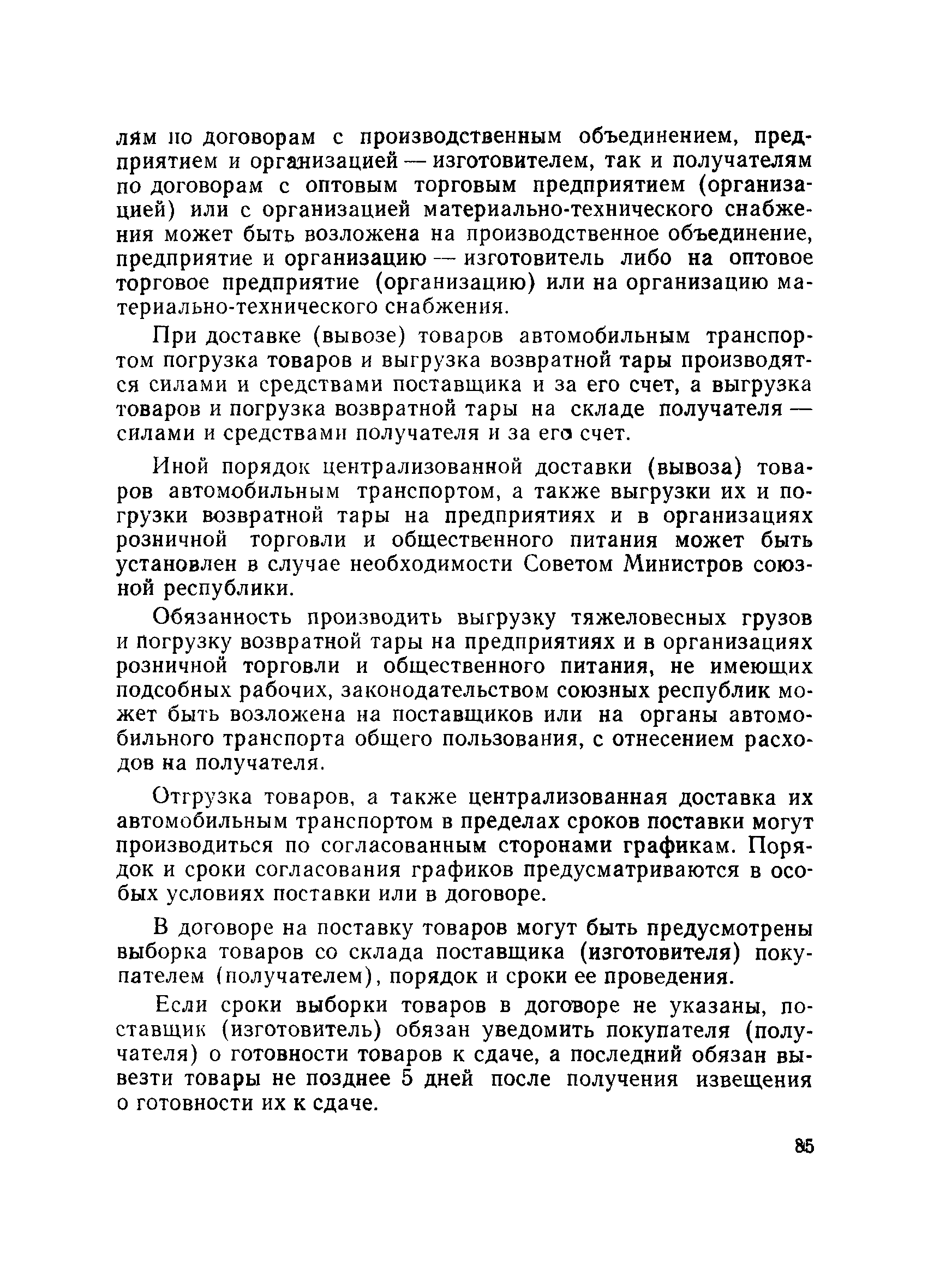 | Оглавление: | Положение о поставках продукции производственно-технического назначения I. Общие положения II. Плановые основания заключения договоров и организация хозяйственных связей III. Порядок и сроки заключения договоров IV. Количество, сроки и порядок поставки продукции V. Качество и комплектность продукции VI. Тара, упаковка и средства пакетирования продукции VII. Цены и порядок расчетов VIII. Имущественная ответственность Положение о поставках товаров народного потребления I. Общие положения II. Плановые основания заключения договоров и организация хозяйственных связей III. Порядок и сроки заключения договоров на поставку товаров IV. Количество, ассортимент, сроки и порядок поставки товаров V. Качество и комплектность товаров VI. Тара, упаковка и средства пакетирования товаров VII. Цены и порядок расчетов VIII. Имущественная ответственность Перечень утративших силу решений Правительства СССР Изменения, которые вносятся в решения Правительства СССР |