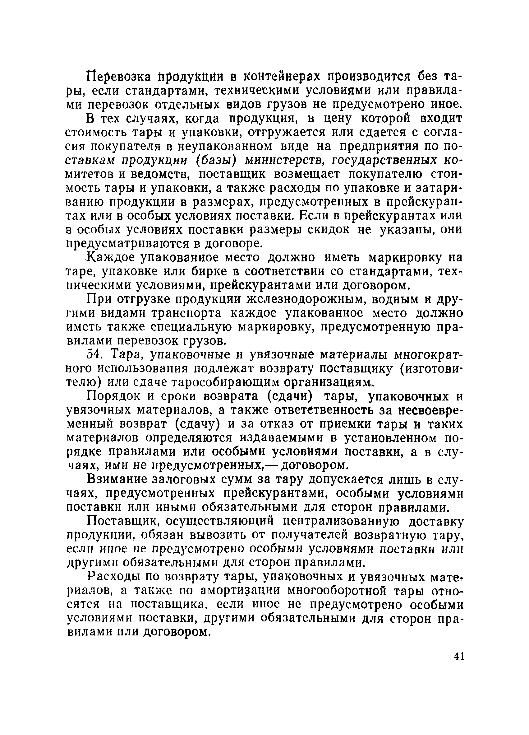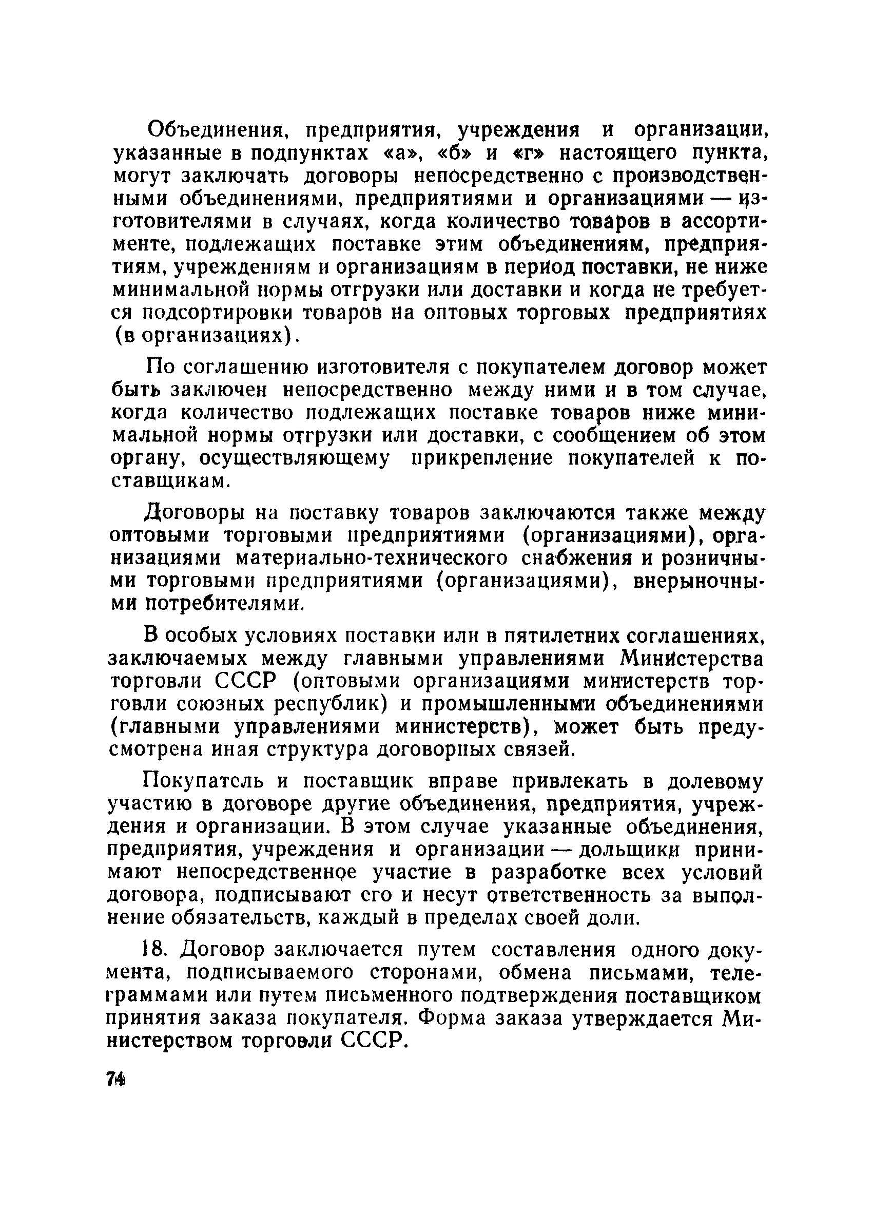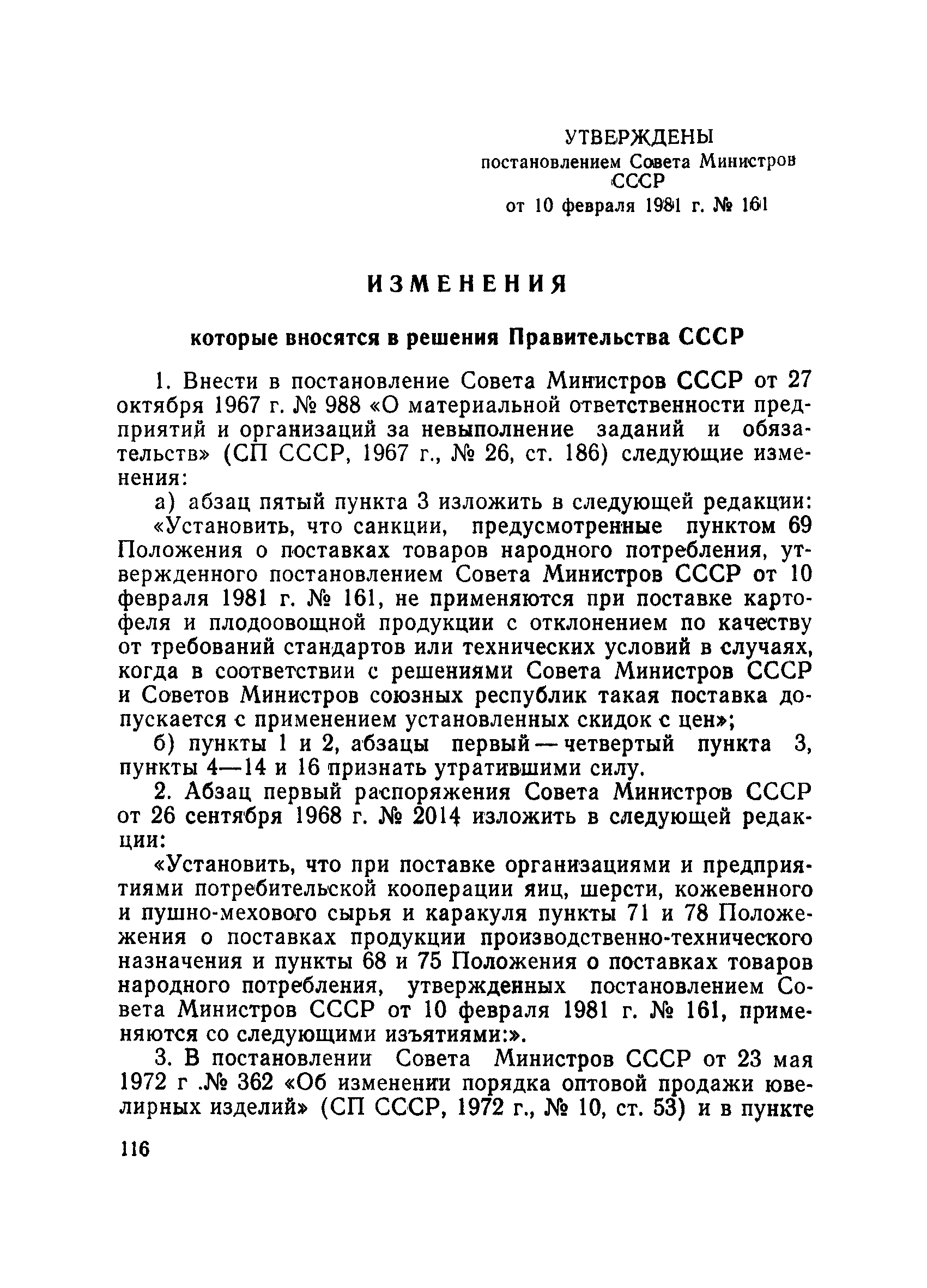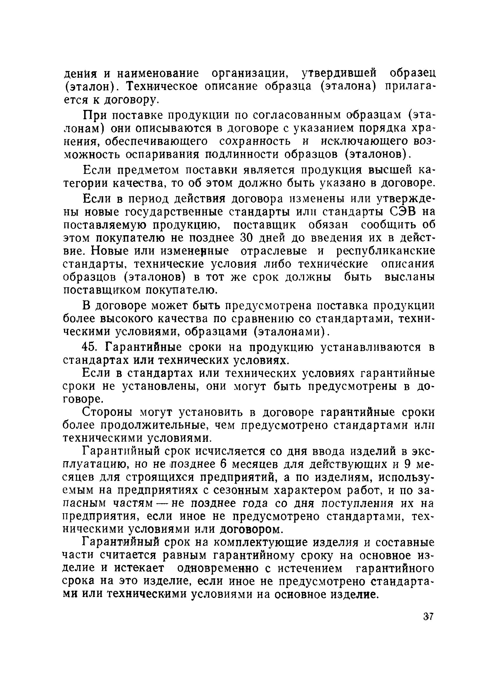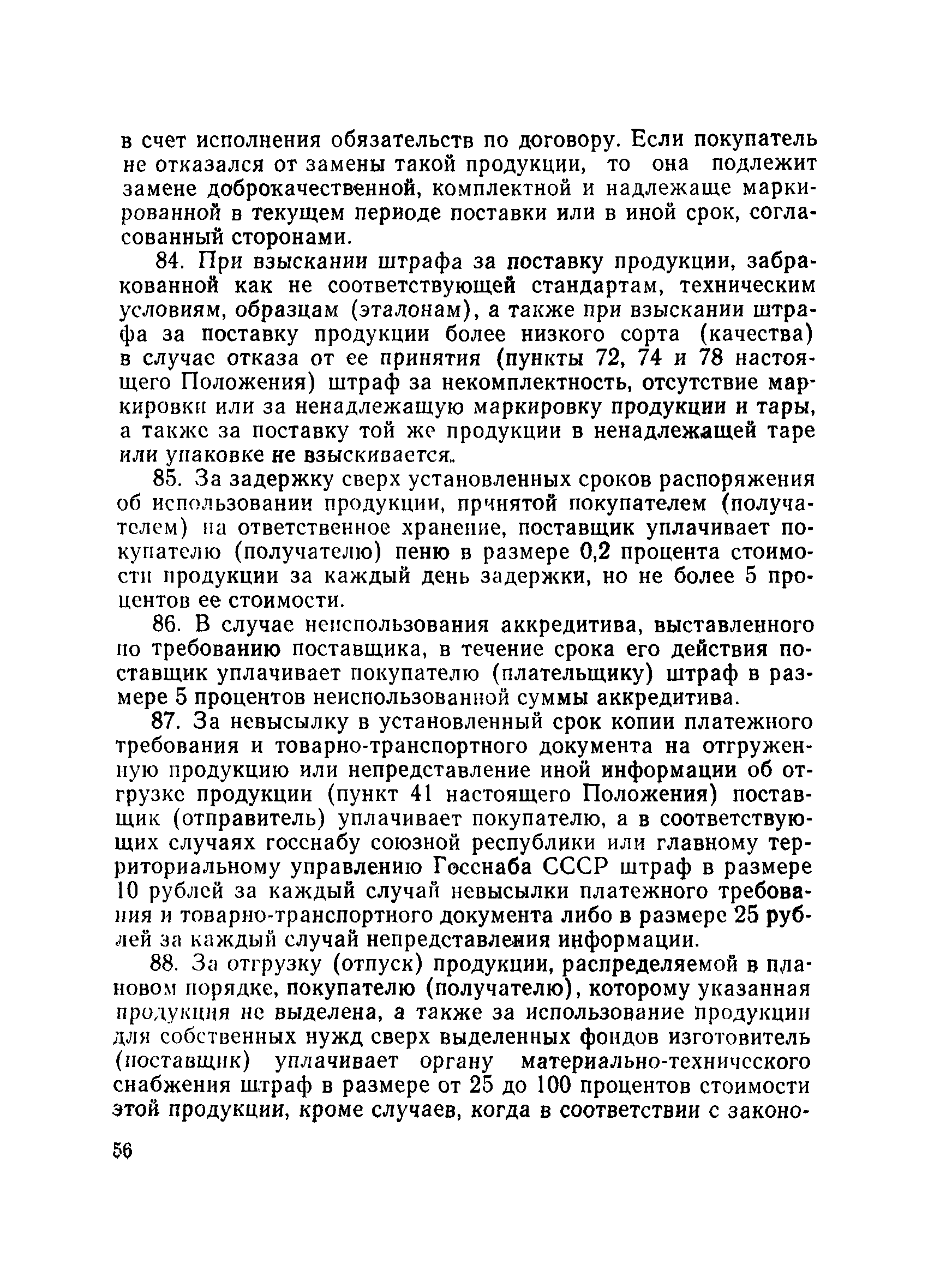 | Оглавление: | Положение о поставках продукции производственно-технического назначения I. Общие положения II. Плановые основания заключения договоров и организация хозяйственных связей III. Порядок и сроки заключения договоров IV. Количество, сроки и порядок поставки продукции V. Качество и комплектность продукции VI. Тара, упаковка и средства пакетирования продукции VII. Цены и порядок расчетов VIII. Имущественная ответственность Положение о поставках товаров народного потребления I. Общие положения II. Плановые основания заключения договоров и организация хозяйственных связей III. Порядок и сроки заключения договоров на поставку товаров IV. Количество, ассортимент, сроки и порядок поставки товаров V. Качество и комплектность товаров VI. Тара, упаковка и средства пакетирования товаров VII. Цены и порядок расчетов VIII. Имущественная ответственность Перечень утративших силу решений Правительства СССР Изменения, которые вносятся в решения Правительства СССР |