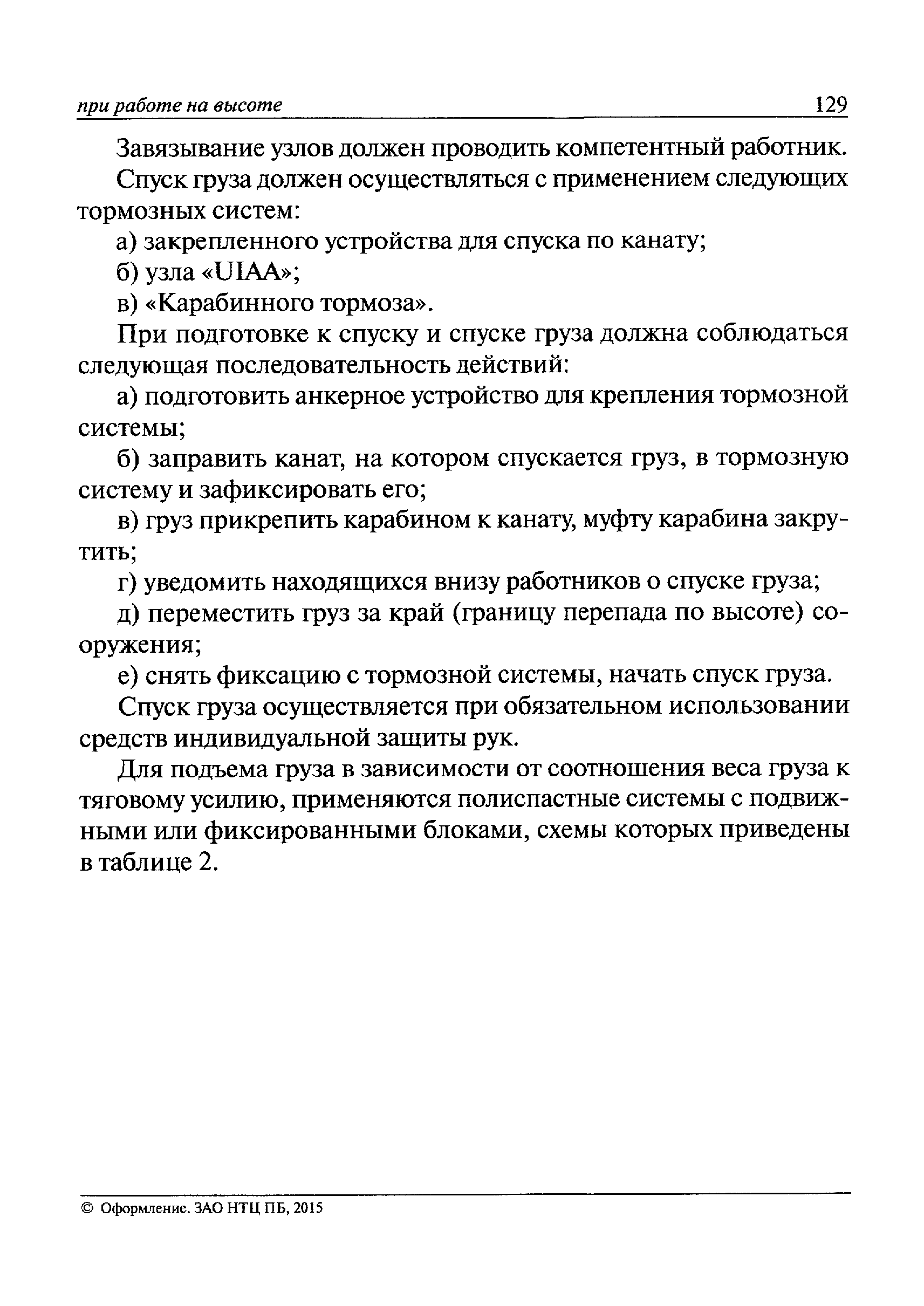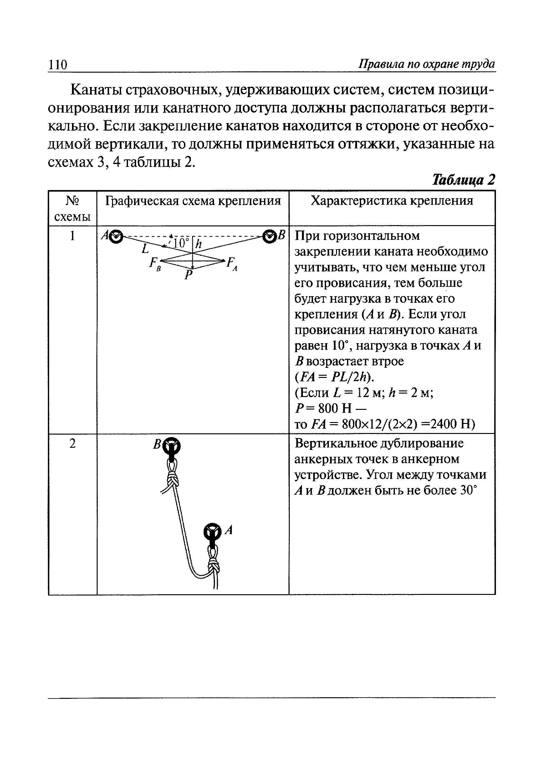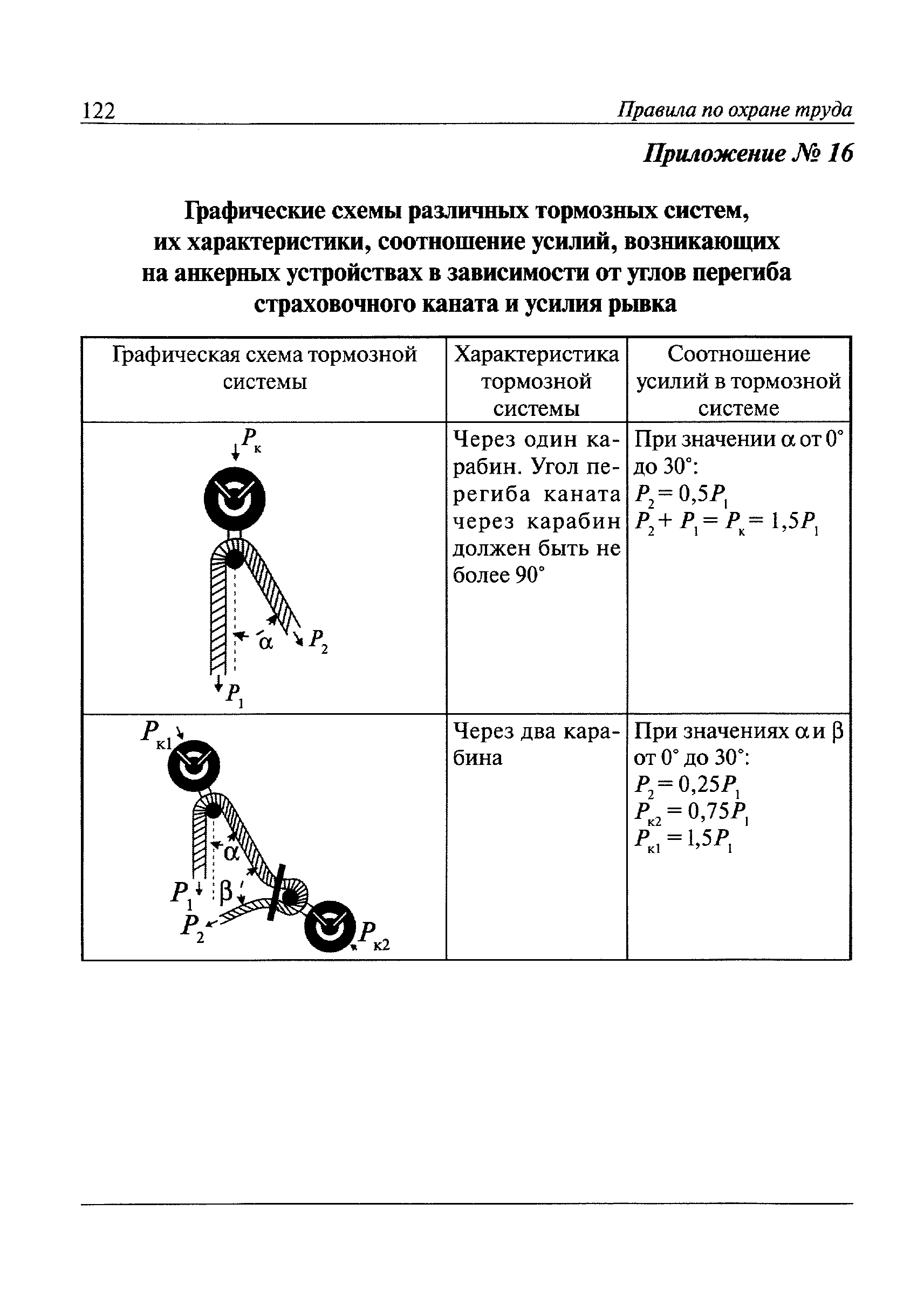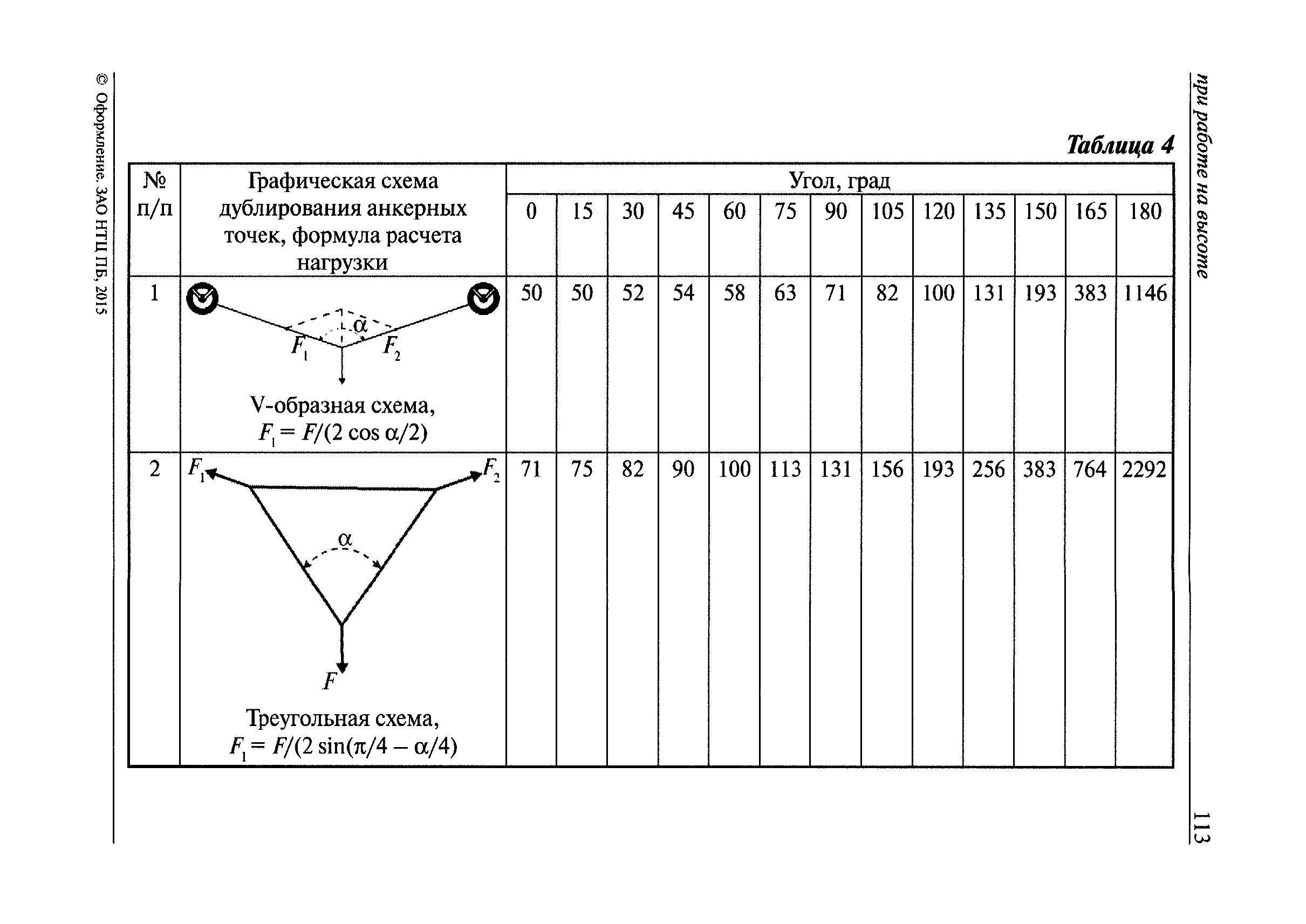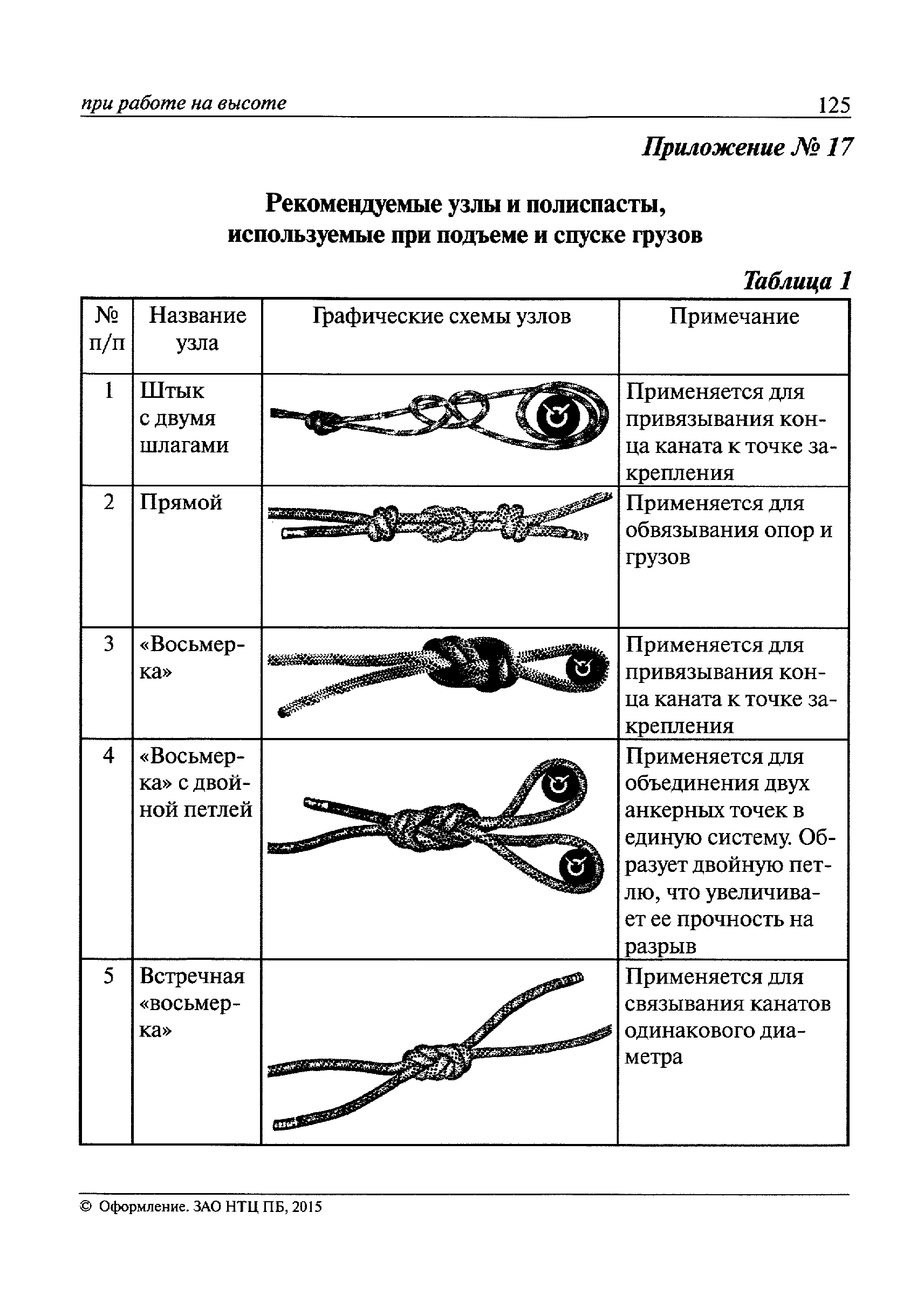 | Оглавление: | I. Общие положения II. Требования по охране труда при организации и проведении работ на высоте III. Требования по охране труда, предъявляемые к производственным помещениям и производственным площадкам IV. Требования к применению систем обеспечения безопасности работ на высоте V. Специальные требования по охране труда, предъявляемые к производству работ на высоте Приложение № 1. Примерный перечень требований, предъявляемых к работникам, проводящим работы на высоте Приложение № 2. Удостоверение о допуске к работам на высоте Приложение № 3. Наряд-допуск на производство работ на высоте Приложение № 4. Удостоверение о допуске к работам на высоте без применения инвентарных лесов и подмостей, с применением систем канатного доступа Приложение № 5. Личная книжка учета работ на высоте без применения инвентарных лесов и подмостей, с применением систем канатного доступа Приложение № 6. Содержание плана производства работ на высоте Приложение № 7. Журнал учета работ по наряду-допуску Приложение № 8. Журнал приема и осмотра лесов и подмостей Приложение № 9. Журнал учета и осмотра такелажных средств, механизмов и приспособлений Приложение № 10. Опасные факторы, обусловленные местоположением анкерных устройств Приложение № 11. Порядок установления зон повышенной опасности Приложение № 12. Системы обеспечения безопасности работ на высоте Приложение № 13. Расчет значения нагрузки в анкерном устройстве Приложение № 14. Система канатного доступа Приложение № 15. Системы обеспечения безопасности работника при перемещении по конструкциям Приложение № 16. Графические схемы различных тормозных систем, их характеристики, соотношение усилий, возникающих на анкерных устройствах в зависимости от углов перегиба страховочного каната и усилия рывка Приложение № 17. Рекомендуемые узлы и полиспасты, используемые при подъеме и спуске грузов |