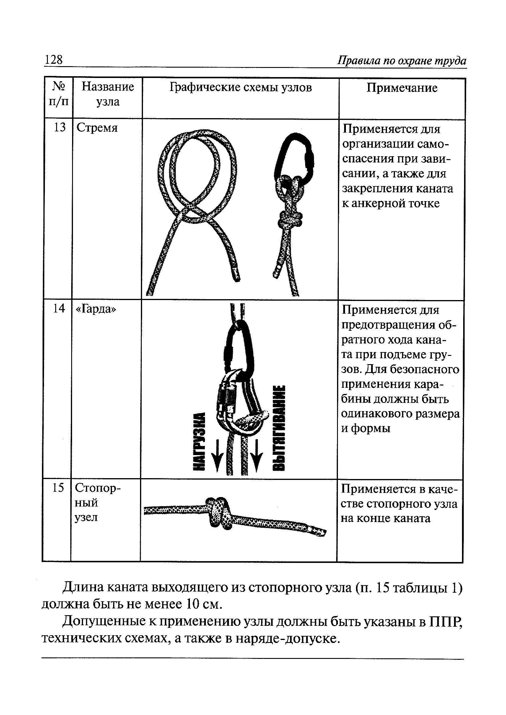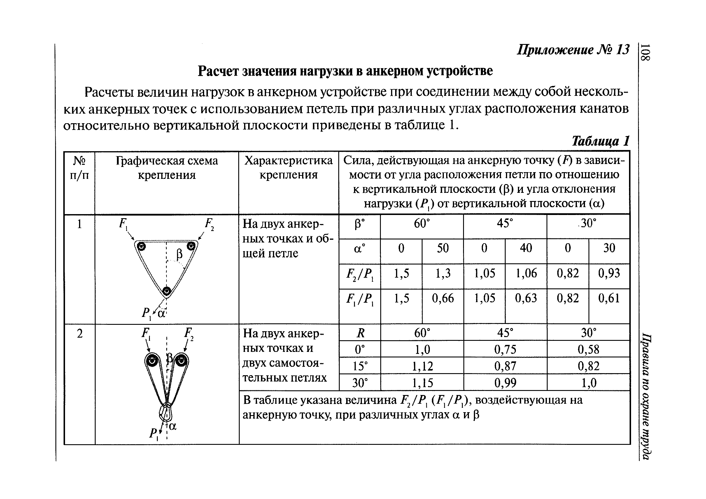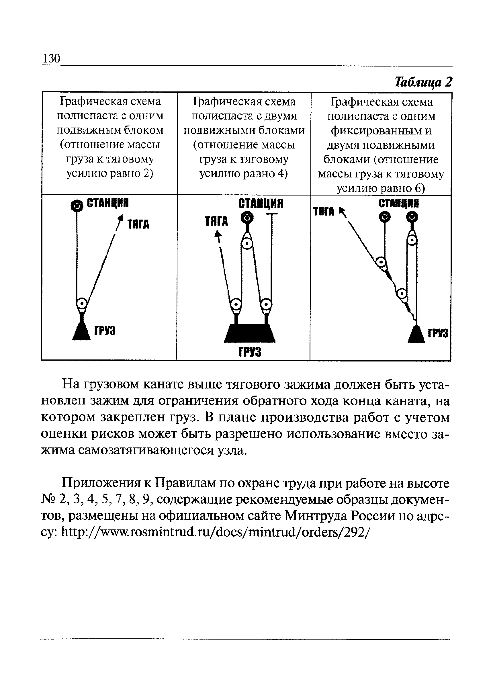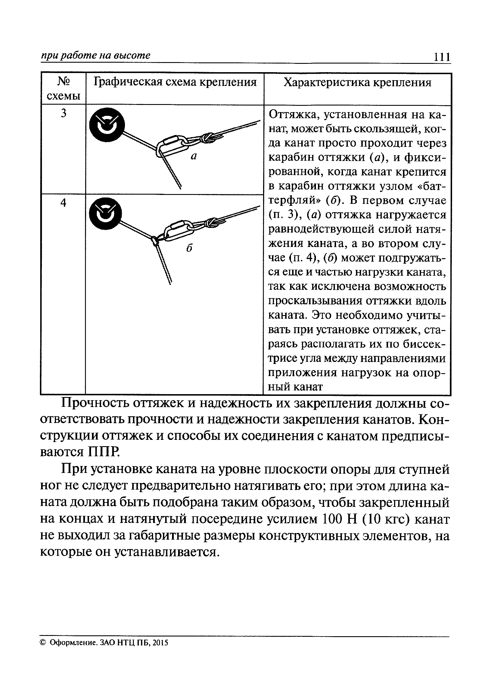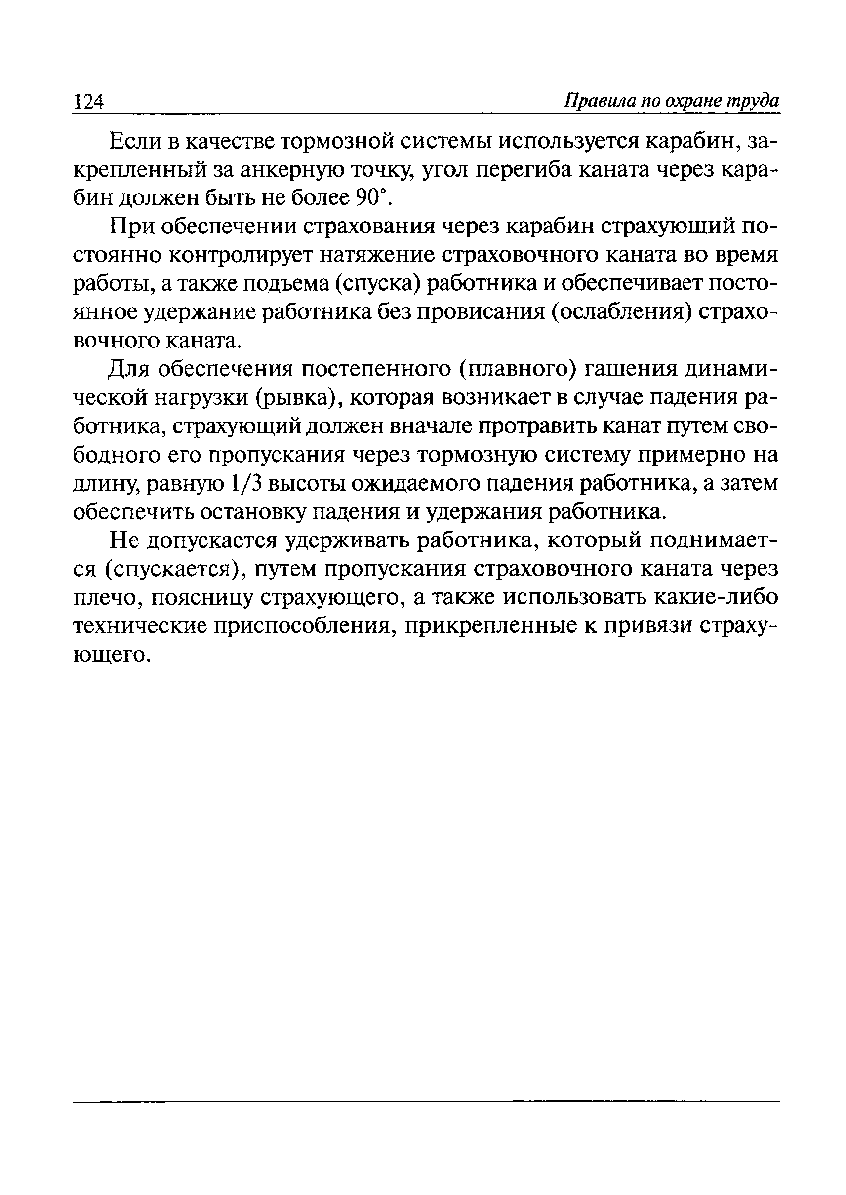 | Оглавление: | I. Общие положения II. Требования по охране труда при организации и проведении работ на высоте III. Требования по охране труда, предъявляемые к производственным помещениям и производственным площадкам IV. Требования к применению систем обеспечения безопасности работ на высоте V. Специальные требования по охране труда, предъявляемые к производству работ на высоте Приложение № 1. Примерный перечень требований, предъявляемых к работникам, проводящим работы на высоте Приложение № 2. Удостоверение о допуске к работам на высоте Приложение № 3. Наряд-допуск на производство работ на высоте Приложение № 4. Удостоверение о допуске к работам на высоте без применения инвентарных лесов и подмостей, с применением систем канатного доступа Приложение № 5. Личная книжка учета работ на высоте без применения инвентарных лесов и подмостей, с применением систем канатного доступа Приложение № 6. Содержание плана производства работ на высоте Приложение № 7. Журнал учета работ по наряду-допуску Приложение № 8. Журнал приема и осмотра лесов и подмостей Приложение № 9. Журнал учета и осмотра такелажных средств, механизмов и приспособлений Приложение № 10. Опасные факторы, обусловленные местоположением анкерных устройств Приложение № 11. Порядок установления зон повышенной опасности Приложение № 12. Системы обеспечения безопасности работ на высоте Приложение № 13. Расчет значения нагрузки в анкерном устройстве Приложение № 14. Система канатного доступа Приложение № 15. Системы обеспечения безопасности работника при перемещении по конструкциям Приложение № 16. Графические схемы различных тормозных систем, их характеристики, соотношение усилий, возникающих на анкерных устройствах в зависимости от углов перегиба страховочного каната и усилия рывка Приложение № 17. Рекомендуемые узлы и полиспасты, используемые при подъеме и спуске грузов |