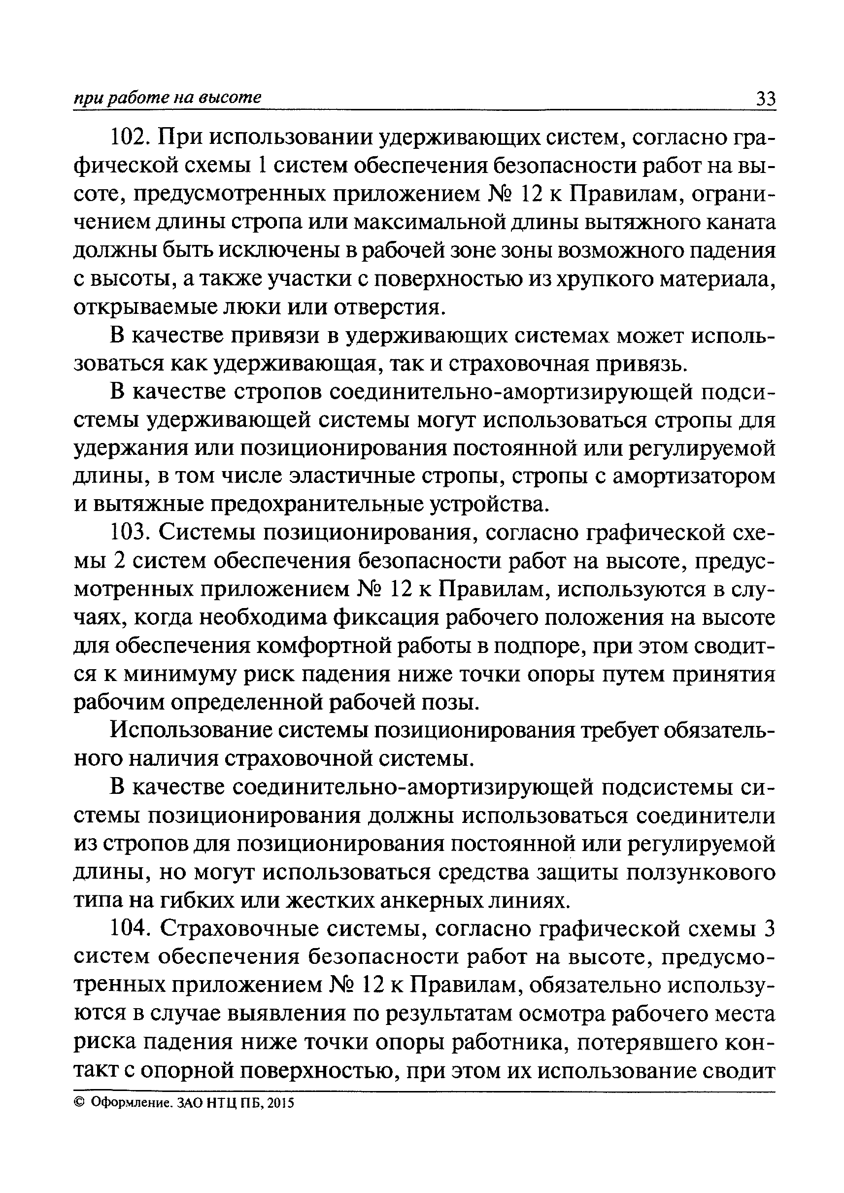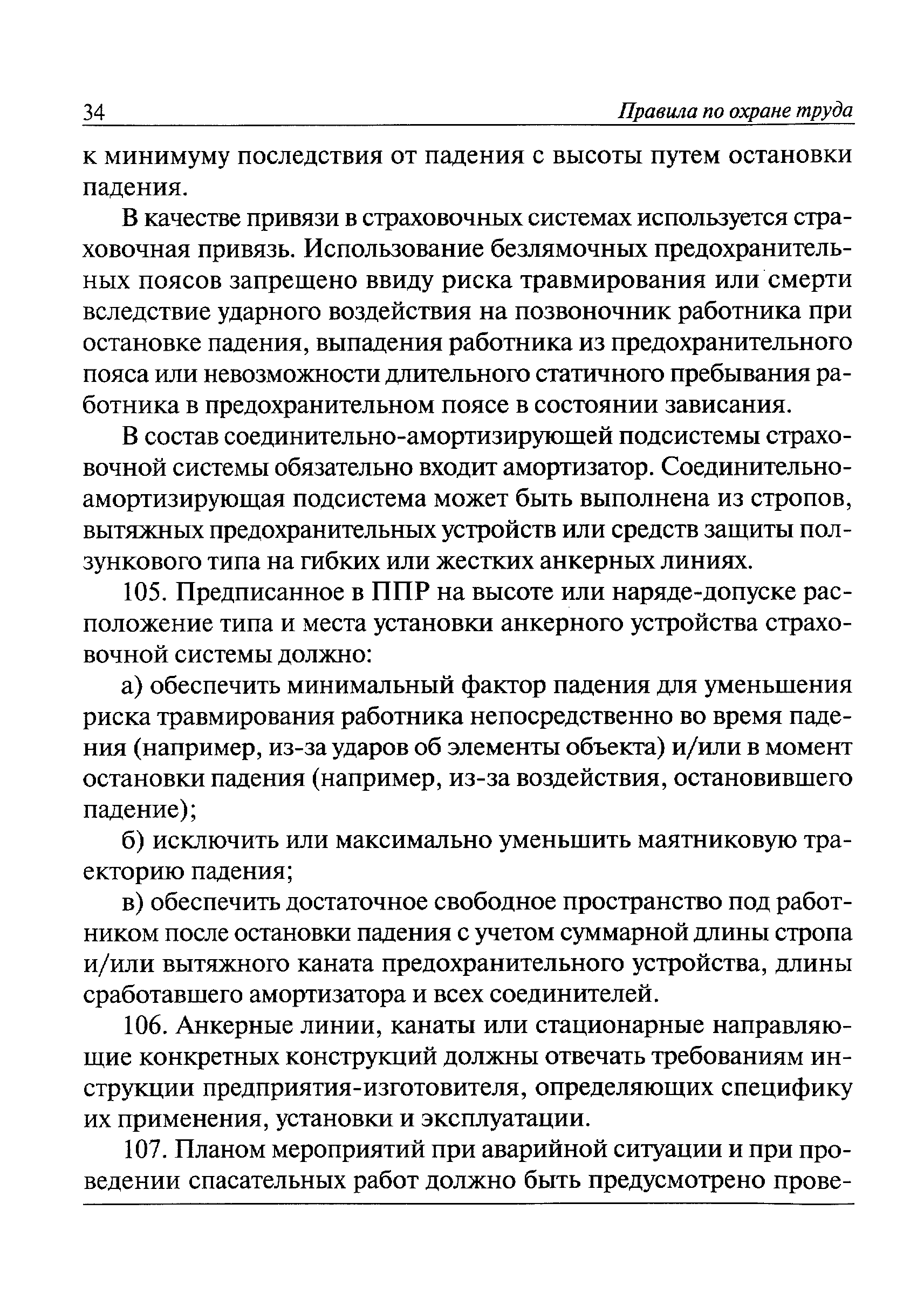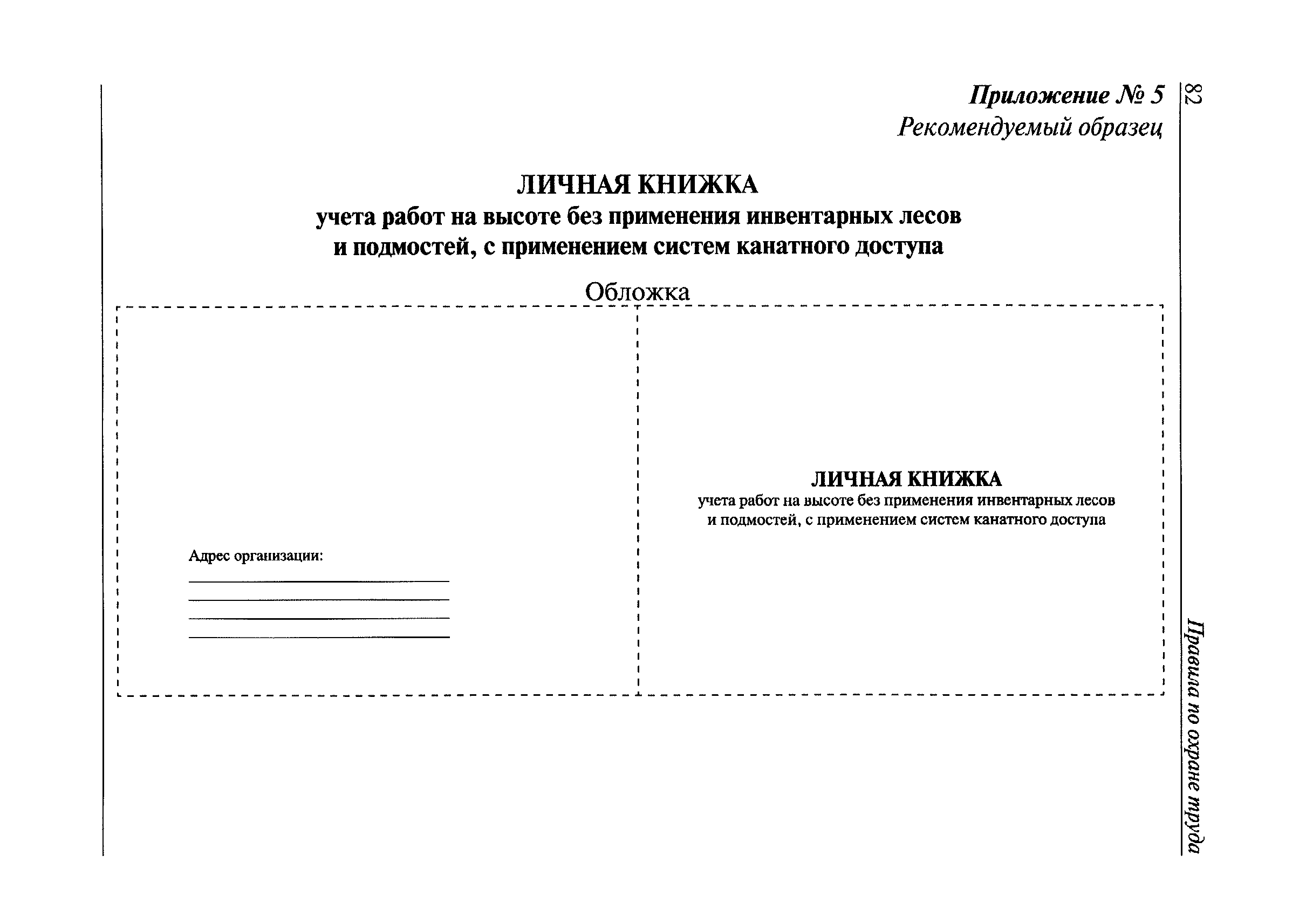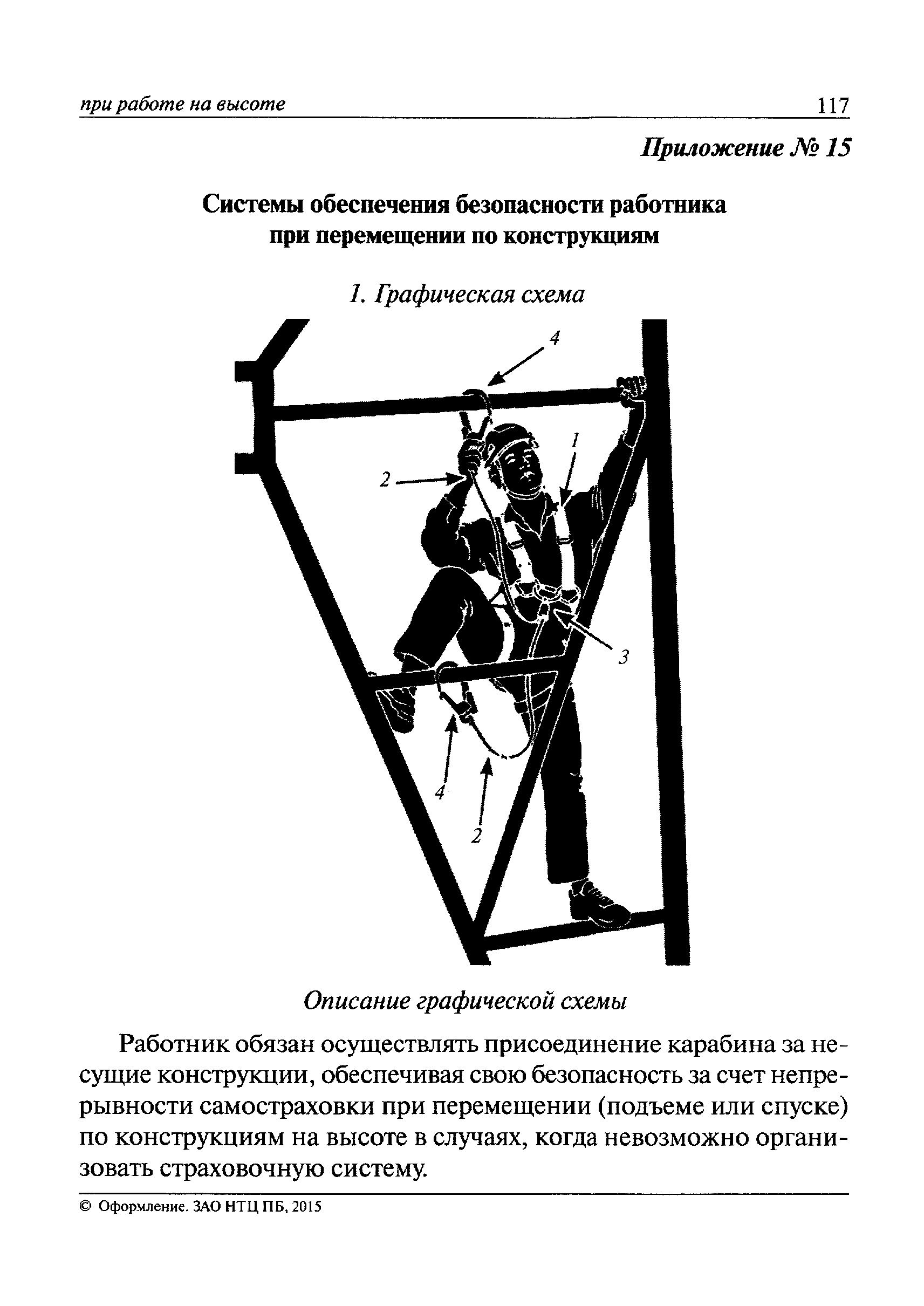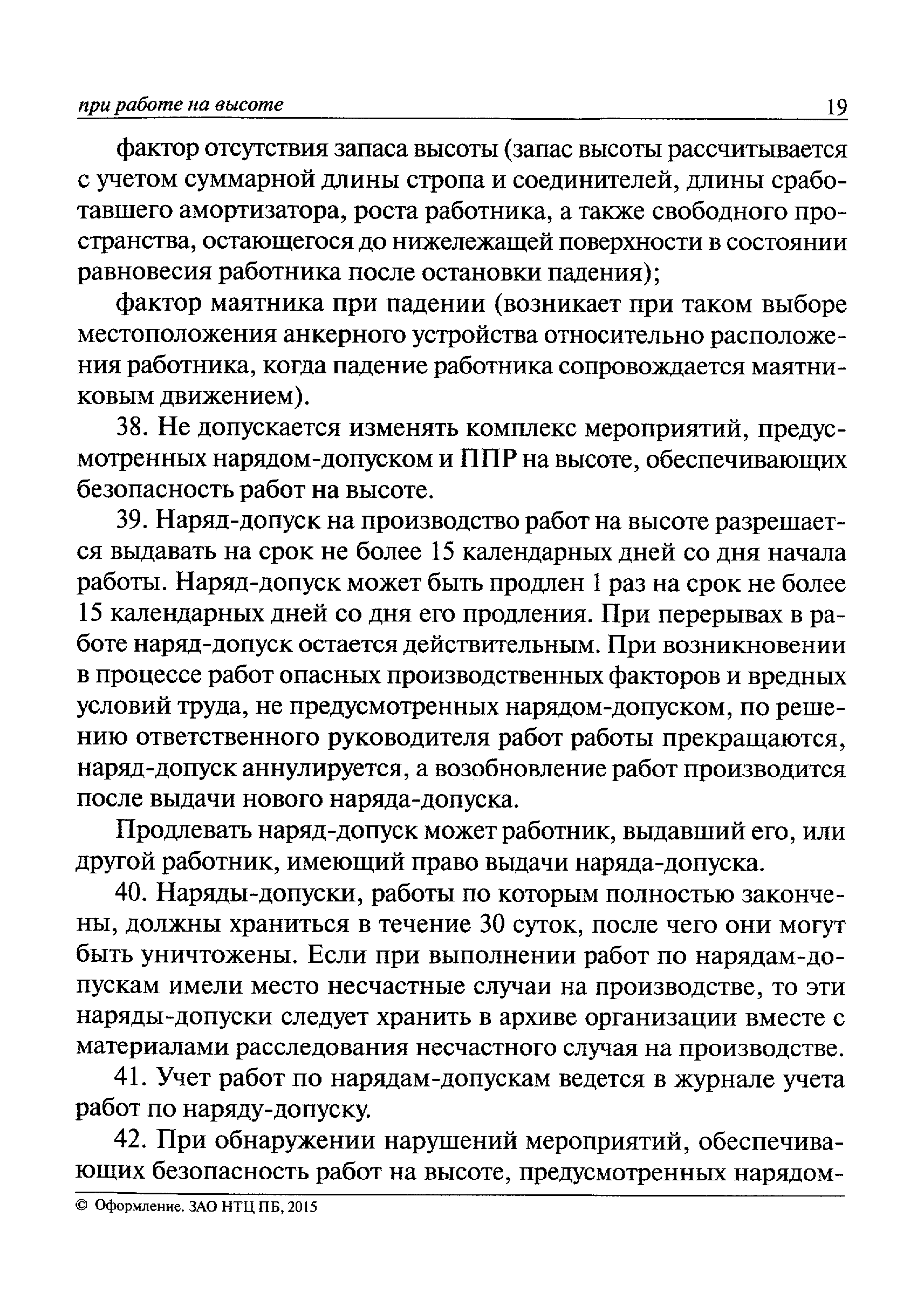 | Оглавление: | I. Общие положения II. Требования по охране труда при организации и проведении работ на высоте III. Требования по охране труда, предъявляемые к производственным помещениям и производственным площадкам IV. Требования к применению систем обеспечения безопасности работ на высоте V. Специальные требования по охране труда, предъявляемые к производству работ на высоте Приложение № 1. Примерный перечень требований, предъявляемых к работникам, проводящим работы на высоте Приложение № 2. Удостоверение о допуске к работам на высоте Приложение № 3. Наряд-допуск на производство работ на высоте Приложение № 4. Удостоверение о допуске к работам на высоте без применения инвентарных лесов и подмостей, с применением систем канатного доступа Приложение № 5. Личная книжка учета работ на высоте без применения инвентарных лесов и подмостей, с применением систем канатного доступа Приложение № 6. Содержание плана производства работ на высоте Приложение № 7. Журнал учета работ по наряду-допуску Приложение № 8. Журнал приема и осмотра лесов и подмостей Приложение № 9. Журнал учета и осмотра такелажных средств, механизмов и приспособлений Приложение № 10. Опасные факторы, обусловленные местоположением анкерных устройств Приложение № 11. Порядок установления зон повышенной опасности Приложение № 12. Системы обеспечения безопасности работ на высоте Приложение № 13. Расчет значения нагрузки в анкерном устройстве Приложение № 14. Система канатного доступа Приложение № 15. Системы обеспечения безопасности работника при перемещении по конструкциям Приложение № 16. Графические схемы различных тормозных систем, их характеристики, соотношение усилий, возникающих на анкерных устройствах в зависимости от углов перегиба страховочного каната и усилия рывка Приложение № 17. Рекомендуемые узлы и полиспасты, используемые при подъеме и спуске грузов |