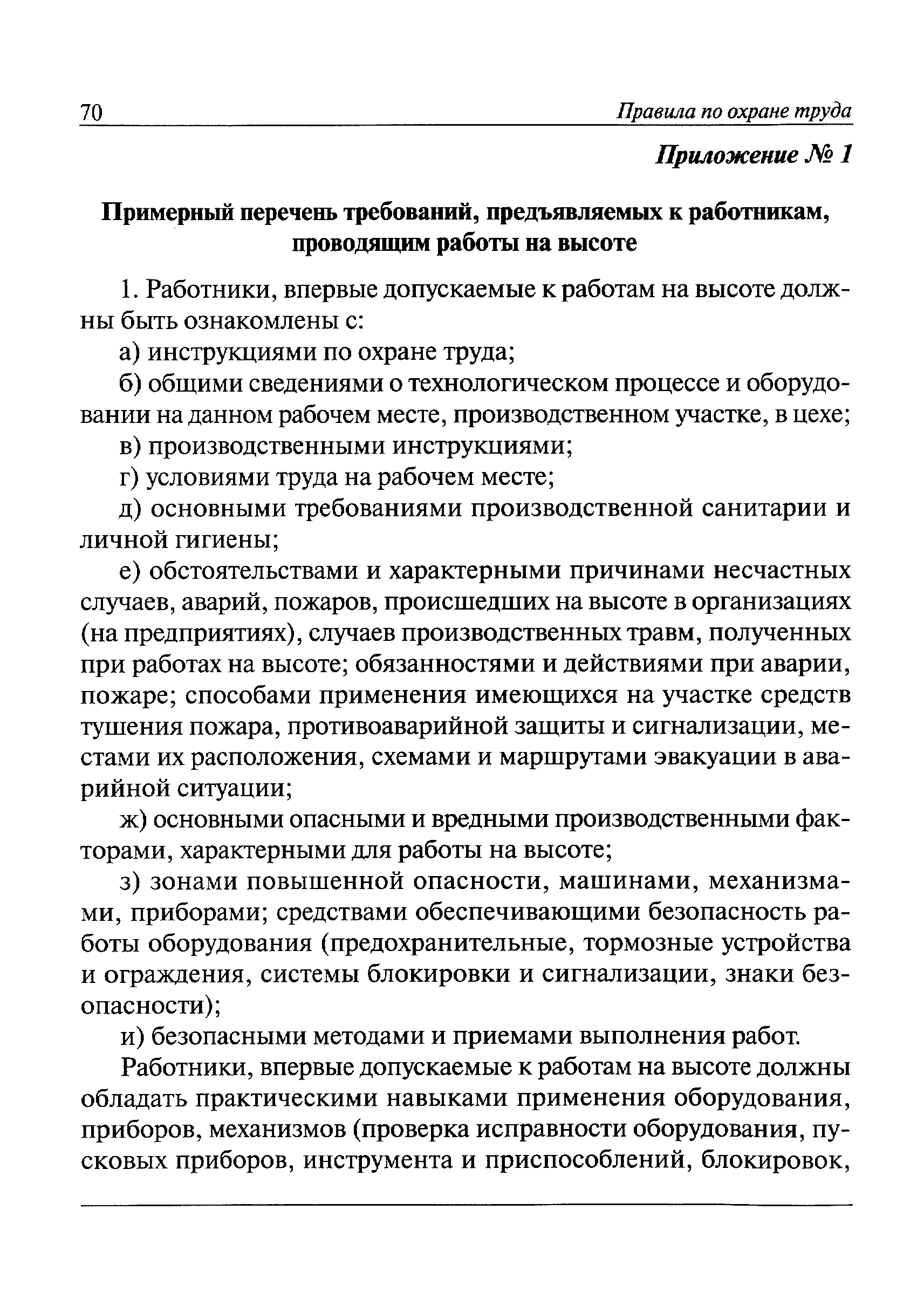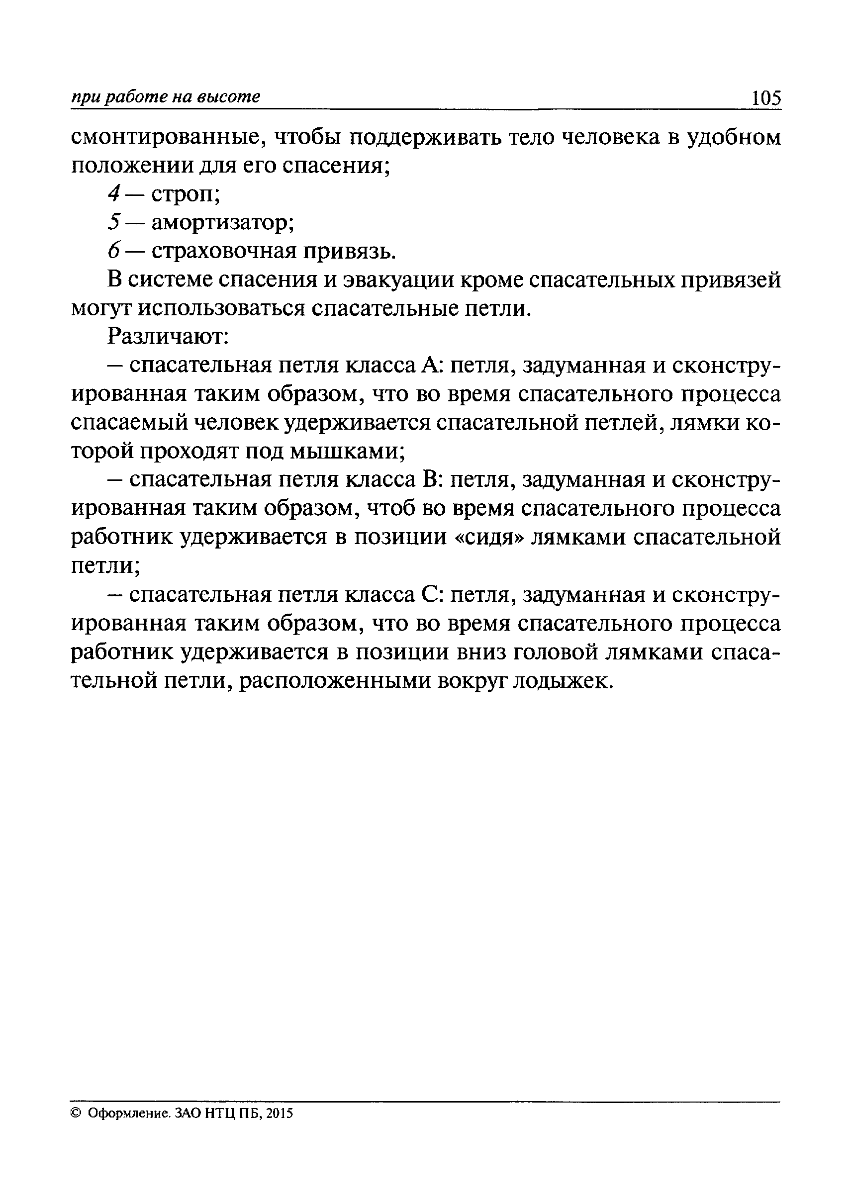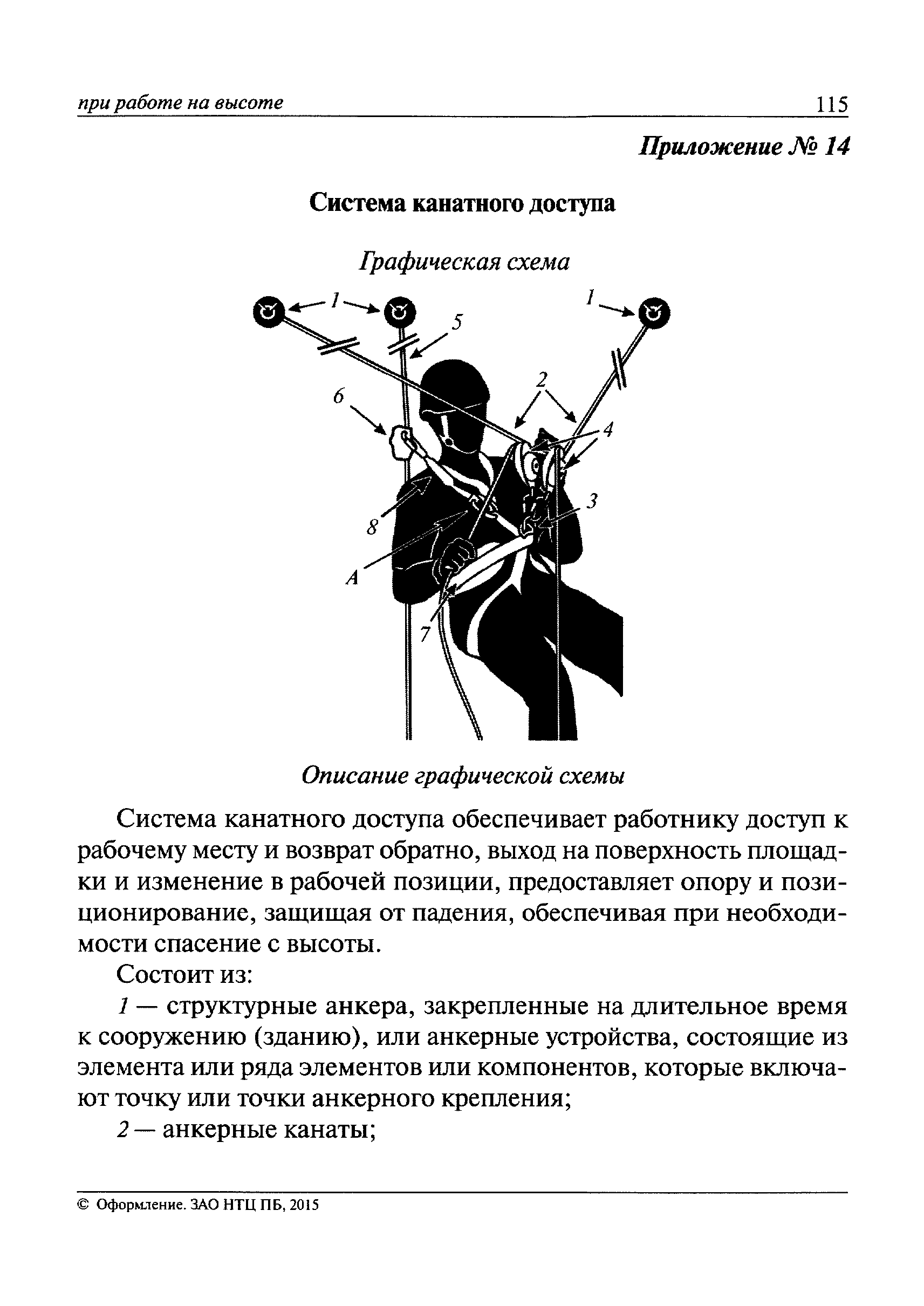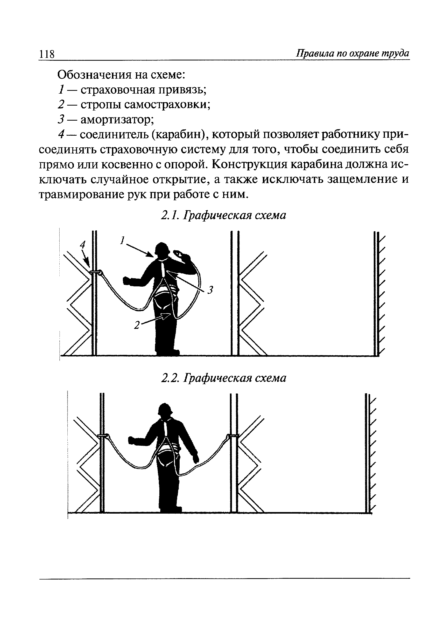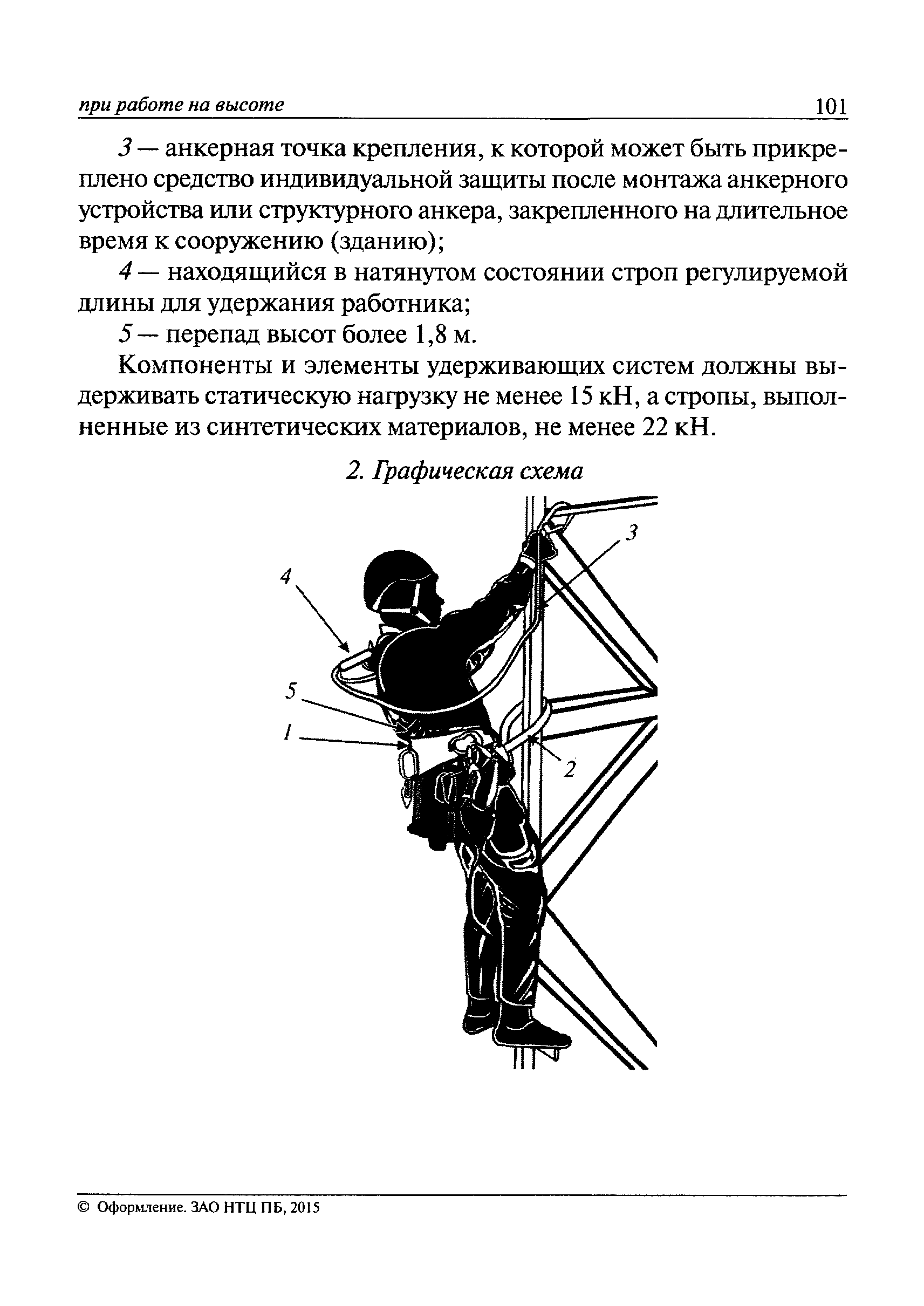 | Оглавление: | I. Общие положения II. Требования по охране труда при организации и проведении работ на высоте III. Требования по охране труда, предъявляемые к производственным помещениям и производственным площадкам IV. Требования к применению систем обеспечения безопасности работ на высоте V. Специальные требования по охране труда, предъявляемые к производству работ на высоте Приложение № 1. Примерный перечень требований, предъявляемых к работникам, проводящим работы на высоте Приложение № 2. Удостоверение о допуске к работам на высоте Приложение № 3. Наряд-допуск на производство работ на высоте Приложение № 4. Удостоверение о допуске к работам на высоте без применения инвентарных лесов и подмостей, с применением систем канатного доступа Приложение № 5. Личная книжка учета работ на высоте без применения инвентарных лесов и подмостей, с применением систем канатного доступа Приложение № 6. Содержание плана производства работ на высоте Приложение № 7. Журнал учета работ по наряду-допуску Приложение № 8. Журнал приема и осмотра лесов и подмостей Приложение № 9. Журнал учета и осмотра такелажных средств, механизмов и приспособлений Приложение № 10. Опасные факторы, обусловленные местоположением анкерных устройств Приложение № 11. Порядок установления зон повышенной опасности Приложение № 12. Системы обеспечения безопасности работ на высоте Приложение № 13. Расчет значения нагрузки в анкерном устройстве Приложение № 14. Система канатного доступа Приложение № 15. Системы обеспечения безопасности работника при перемещении по конструкциям Приложение № 16. Графические схемы различных тормозных систем, их характеристики, соотношение усилий, возникающих на анкерных устройствах в зависимости от углов перегиба страховочного каната и усилия рывка Приложение № 17. Рекомендуемые узлы и полиспасты, используемые при подъеме и спуске грузов |