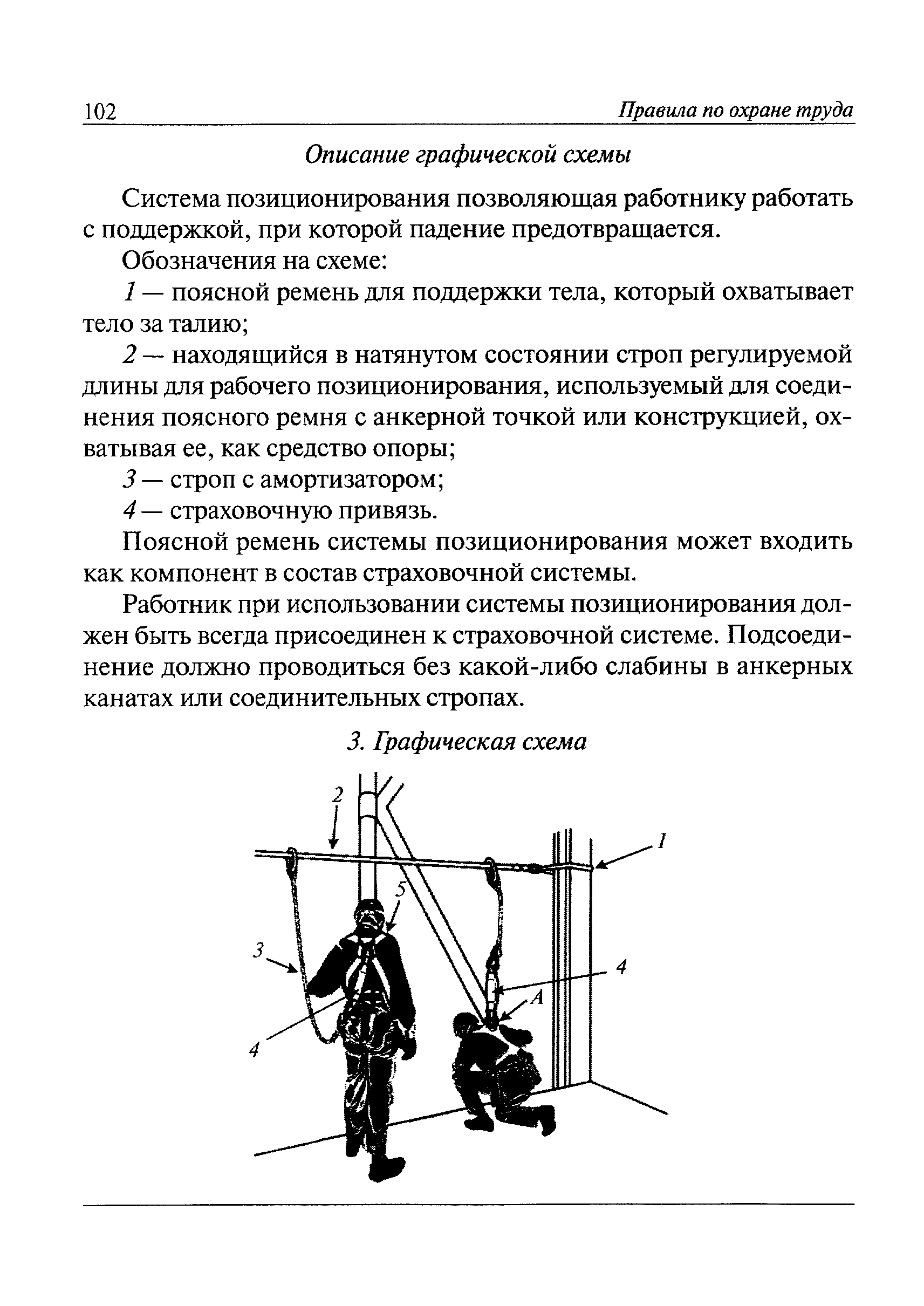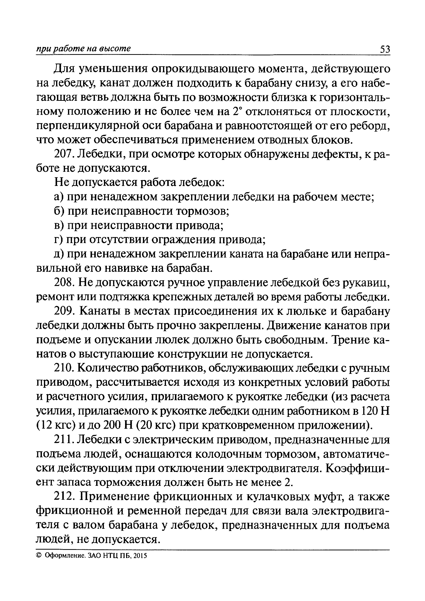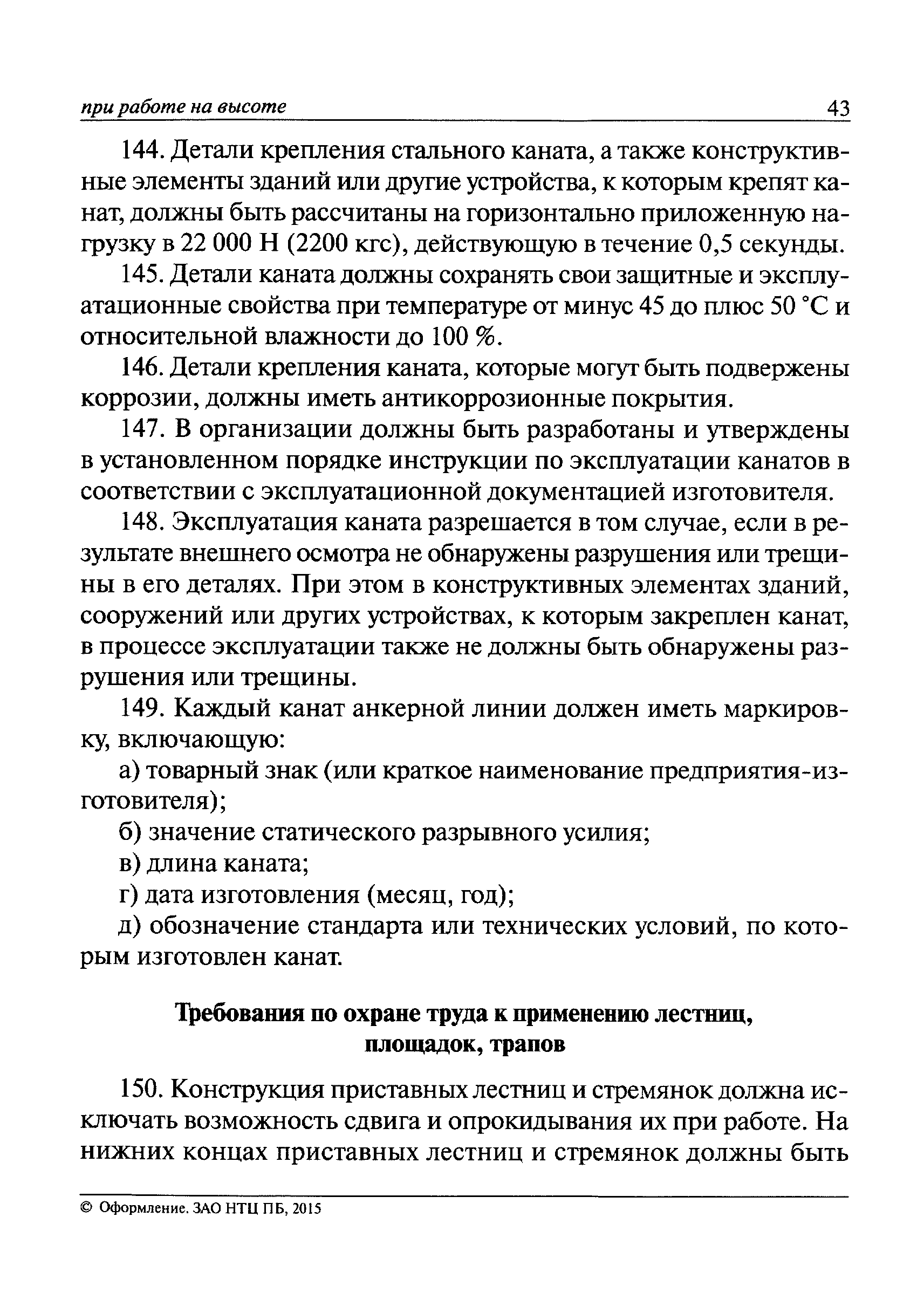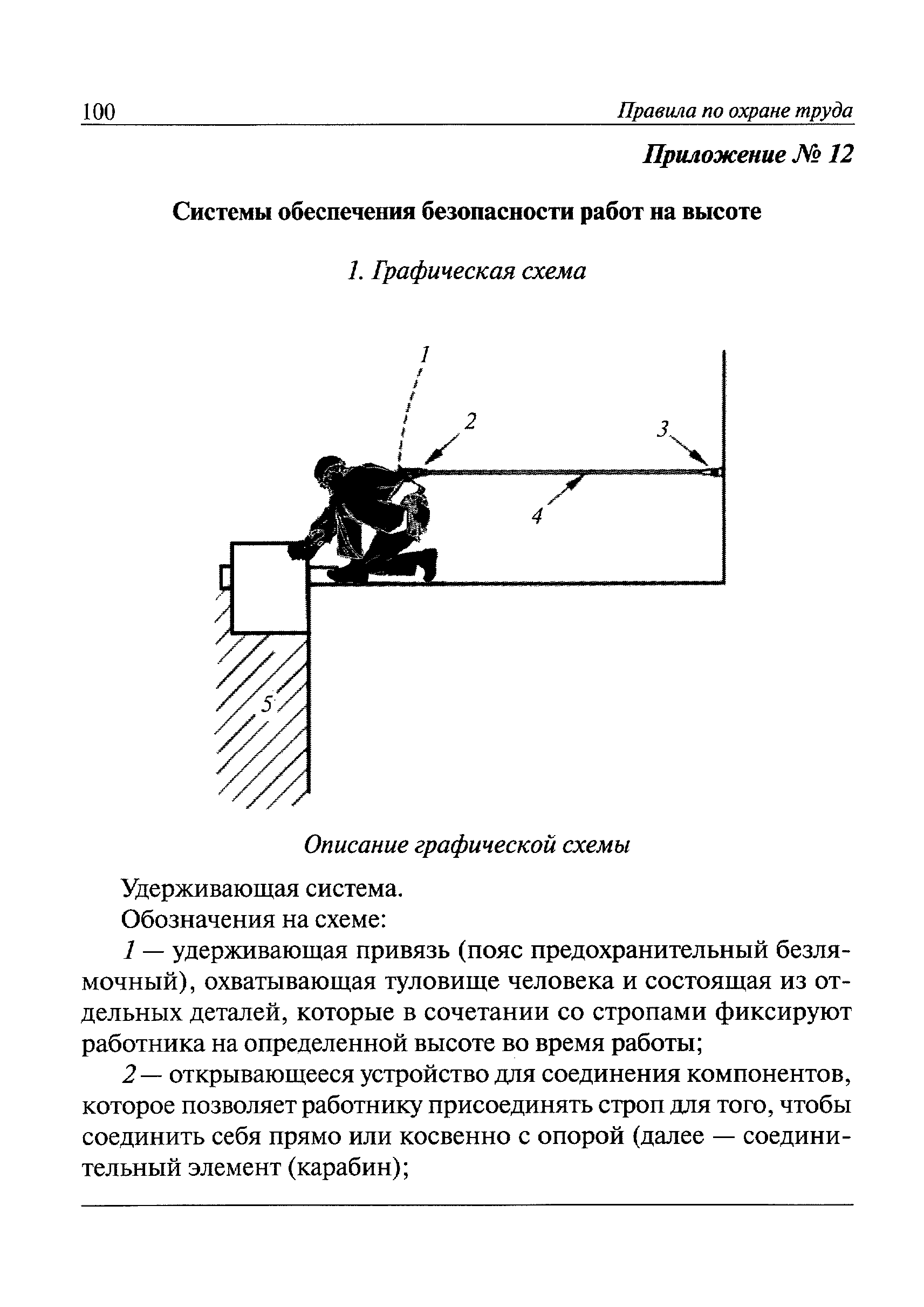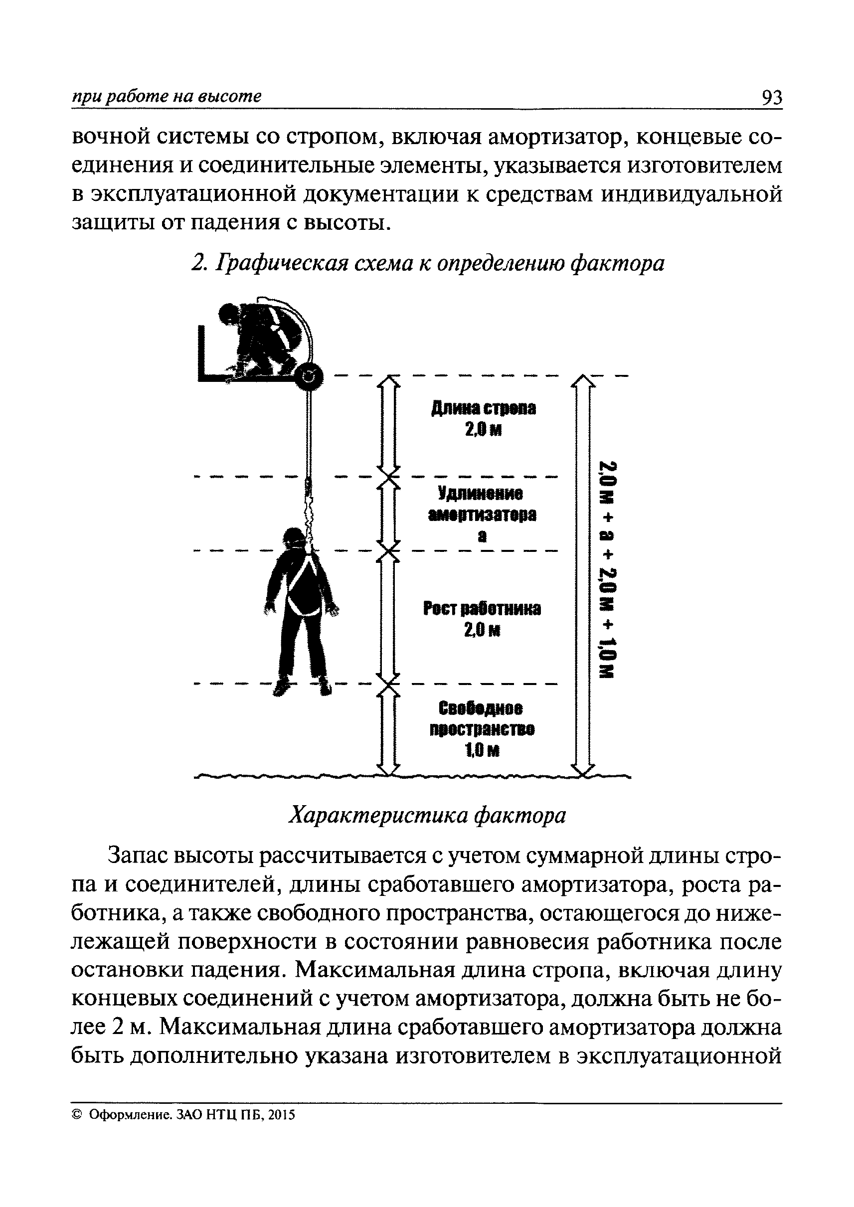 | Оглавление: | I. Общие положения II. Требования по охране труда при организации и проведении работ на высоте III. Требования по охране труда, предъявляемые к производственным помещениям и производственным площадкам IV. Требования к применению систем обеспечения безопасности работ на высоте V. Специальные требования по охране труда, предъявляемые к производству работ на высоте Приложение № 1. Примерный перечень требований, предъявляемых к работникам, проводящим работы на высоте Приложение № 2. Удостоверение о допуске к работам на высоте Приложение № 3. Наряд-допуск на производство работ на высоте Приложение № 4. Удостоверение о допуске к работам на высоте без применения инвентарных лесов и подмостей, с применением систем канатного доступа Приложение № 5. Личная книжка учета работ на высоте без применения инвентарных лесов и подмостей, с применением систем канатного доступа Приложение № 6. Содержание плана производства работ на высоте Приложение № 7. Журнал учета работ по наряду-допуску Приложение № 8. Журнал приема и осмотра лесов и подмостей Приложение № 9. Журнал учета и осмотра такелажных средств, механизмов и приспособлений Приложение № 10. Опасные факторы, обусловленные местоположением анкерных устройств Приложение № 11. Порядок установления зон повышенной опасности Приложение № 12. Системы обеспечения безопасности работ на высоте Приложение № 13. Расчет значения нагрузки в анкерном устройстве Приложение № 14. Система канатного доступа Приложение № 15. Системы обеспечения безопасности работника при перемещении по конструкциям Приложение № 16. Графические схемы различных тормозных систем, их характеристики, соотношение усилий, возникающих на анкерных устройствах в зависимости от углов перегиба страховочного каната и усилия рывка Приложение № 17. Рекомендуемые узлы и полиспасты, используемые при подъеме и спуске грузов |