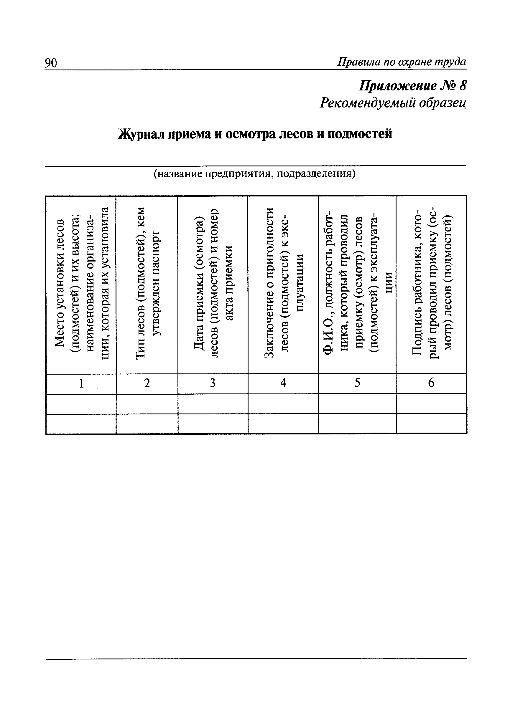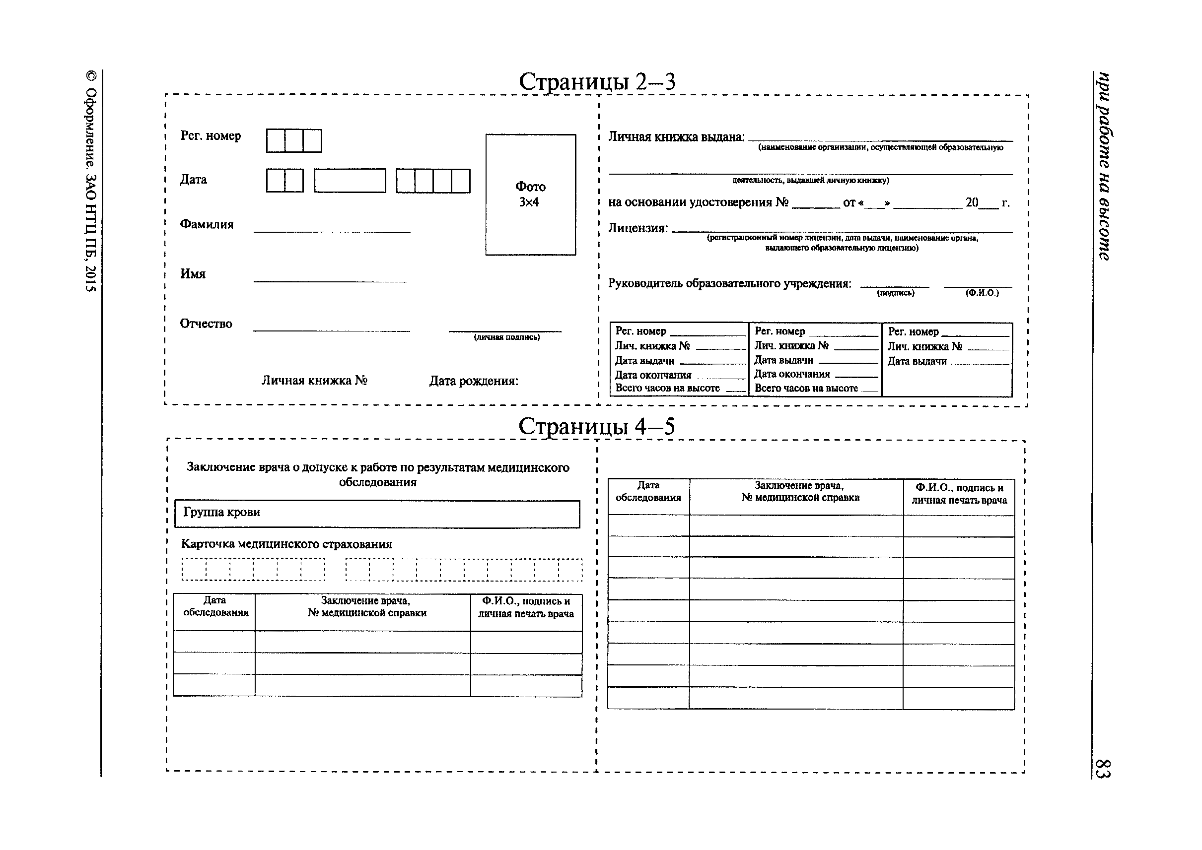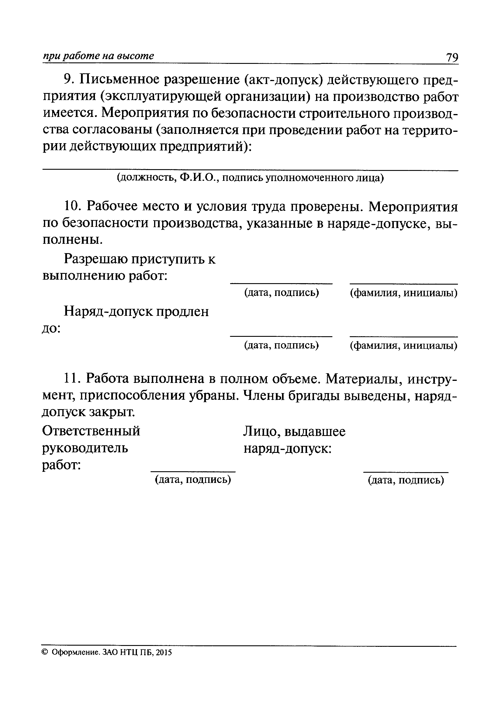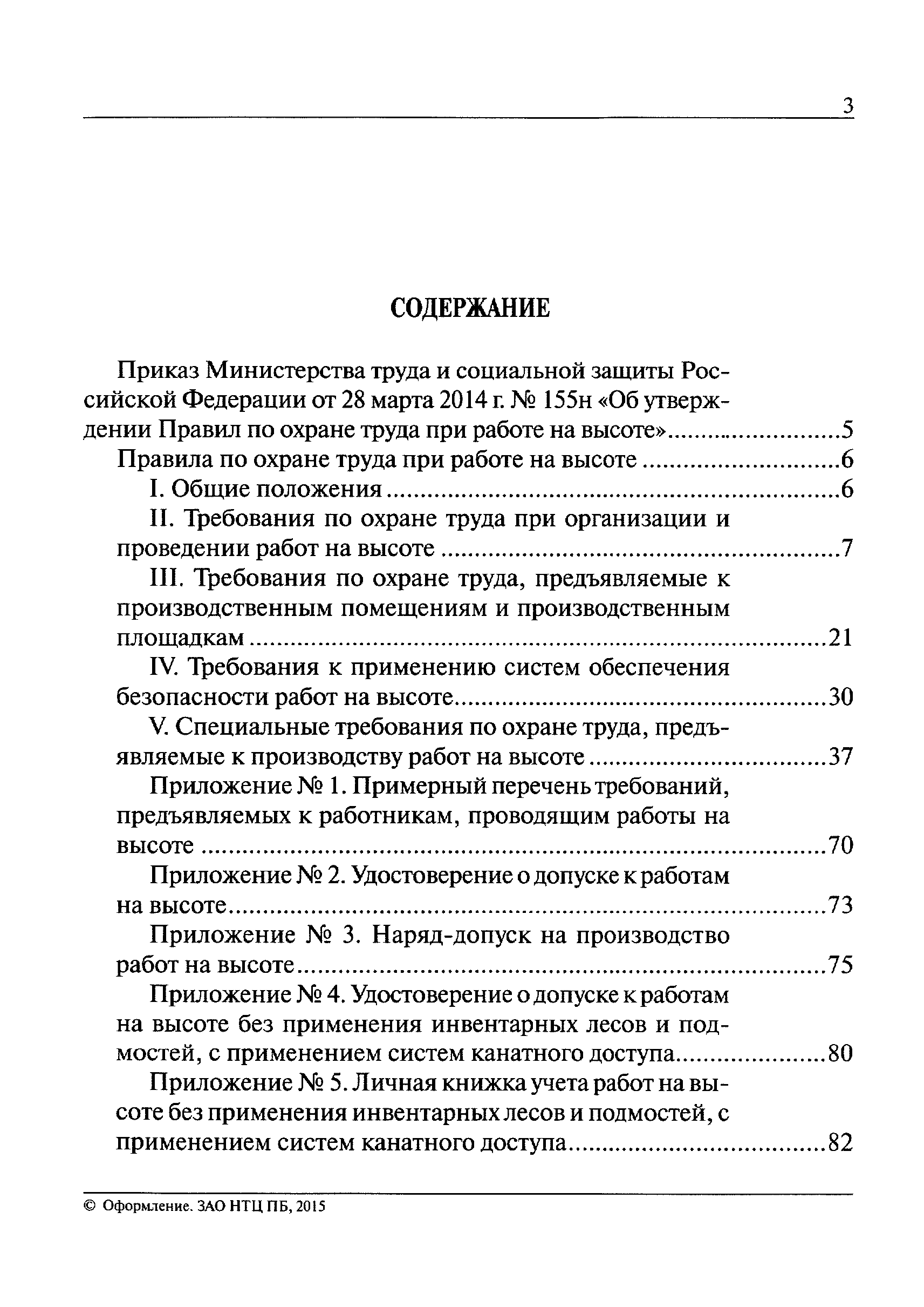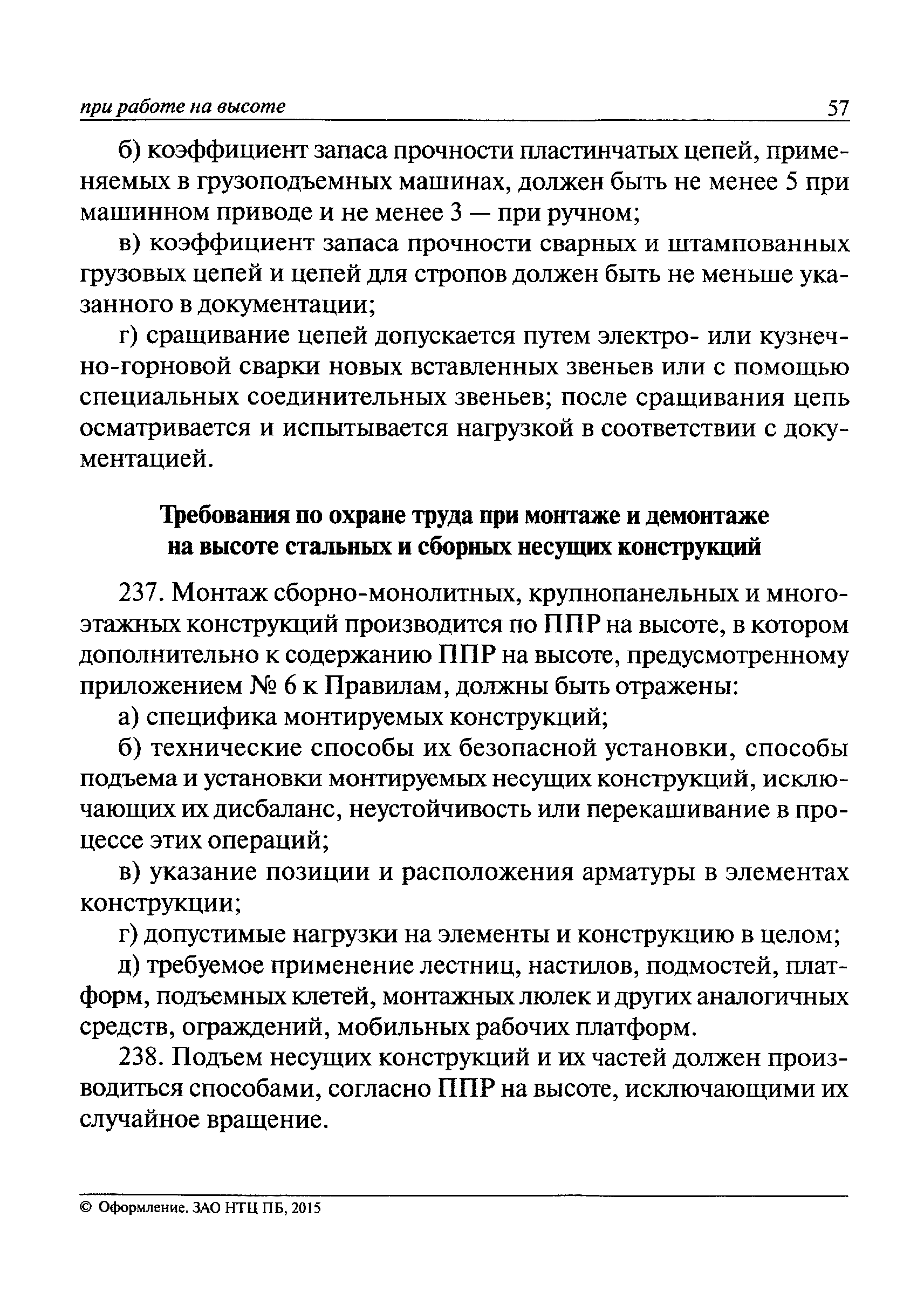 | Оглавление: | I. Общие положения II. Требования по охране труда при организации и проведении работ на высоте III. Требования по охране труда, предъявляемые к производственным помещениям и производственным площадкам IV. Требования к применению систем обеспечения безопасности работ на высоте V. Специальные требования по охране труда, предъявляемые к производству работ на высоте Приложение № 1. Примерный перечень требований, предъявляемых к работникам, проводящим работы на высоте Приложение № 2. Удостоверение о допуске к работам на высоте Приложение № 3. Наряд-допуск на производство работ на высоте Приложение № 4. Удостоверение о допуске к работам на высоте без применения инвентарных лесов и подмостей, с применением систем канатного доступа Приложение № 5. Личная книжка учета работ на высоте без применения инвентарных лесов и подмостей, с применением систем канатного доступа Приложение № 6. Содержание плана производства работ на высоте Приложение № 7. Журнал учета работ по наряду-допуску Приложение № 8. Журнал приема и осмотра лесов и подмостей Приложение № 9. Журнал учета и осмотра такелажных средств, механизмов и приспособлений Приложение № 10. Опасные факторы, обусловленные местоположением анкерных устройств Приложение № 11. Порядок установления зон повышенной опасности Приложение № 12. Системы обеспечения безопасности работ на высоте Приложение № 13. Расчет значения нагрузки в анкерном устройстве Приложение № 14. Система канатного доступа Приложение № 15. Системы обеспечения безопасности работника при перемещении по конструкциям Приложение № 16. Графические схемы различных тормозных систем, их характеристики, соотношение усилий, возникающих на анкерных устройствах в зависимости от углов перегиба страховочного каната и усилия рывка Приложение № 17. Рекомендуемые узлы и полиспасты, используемые при подъеме и спуске грузов |