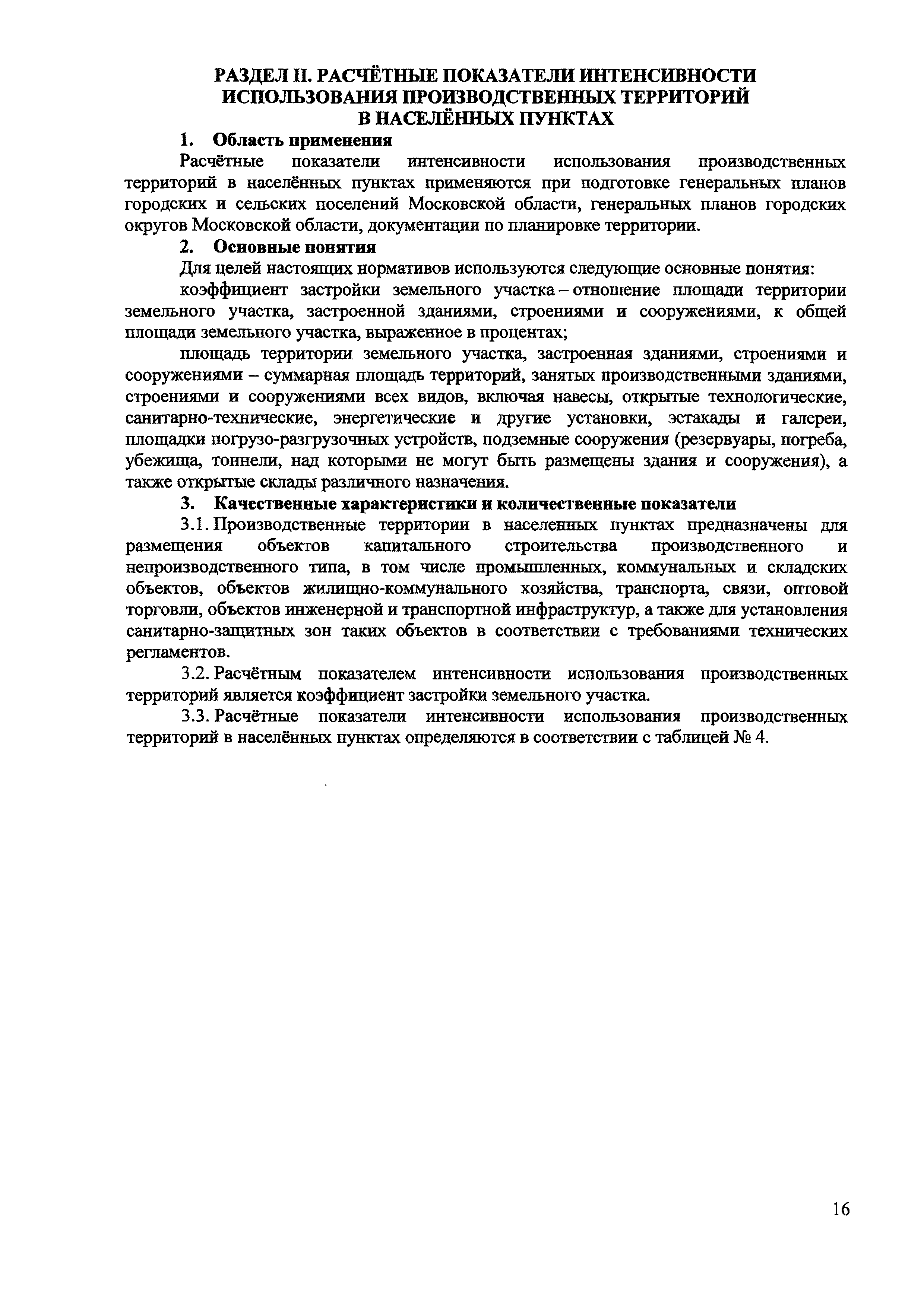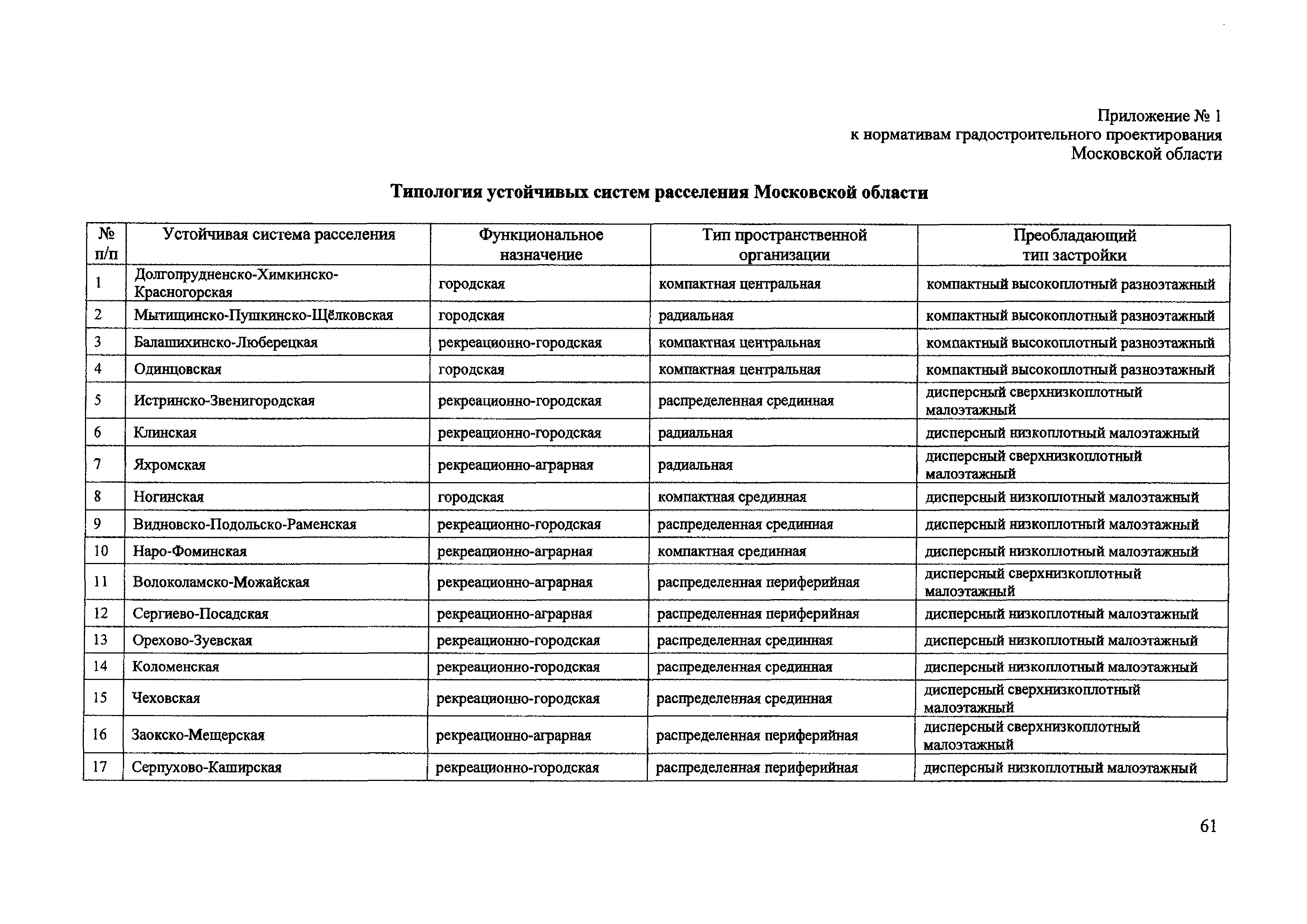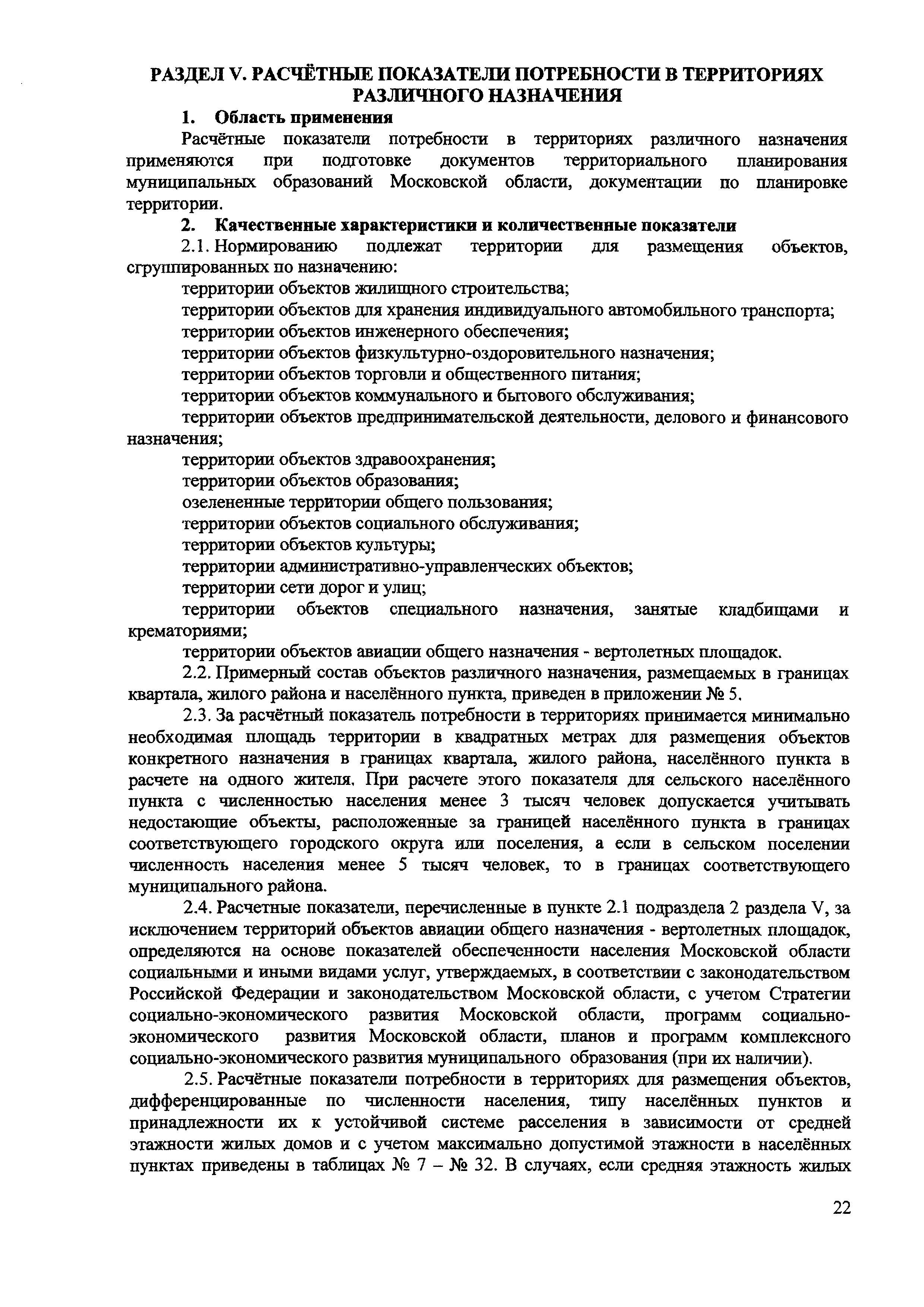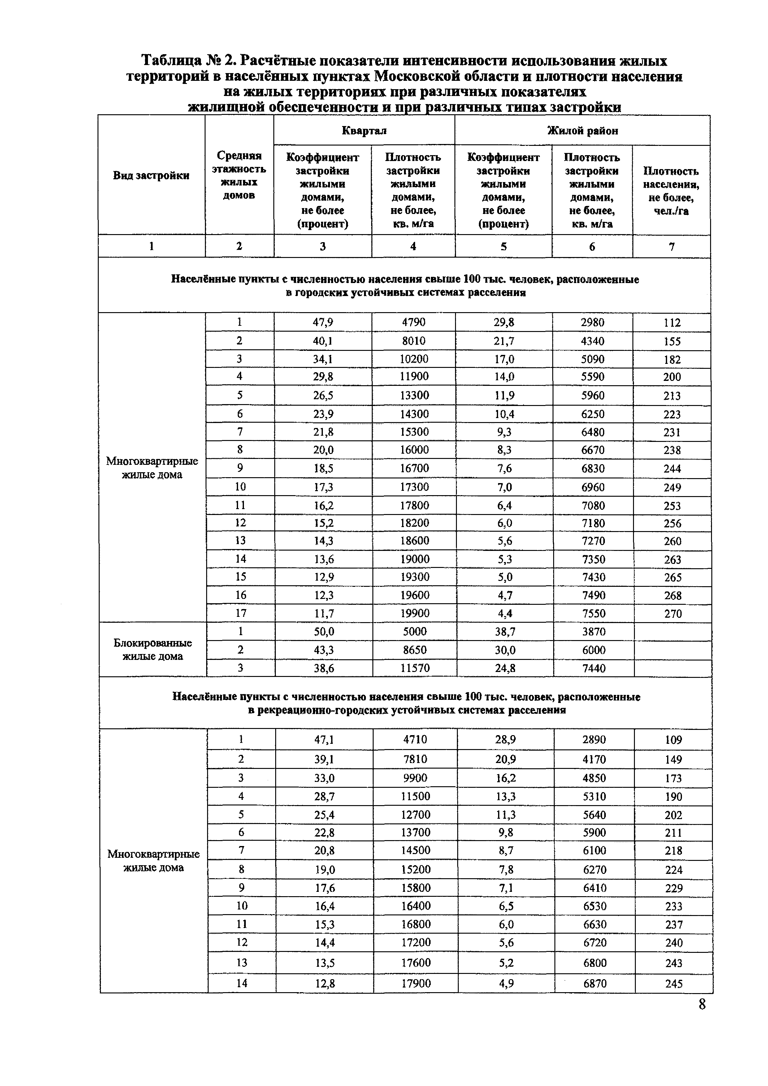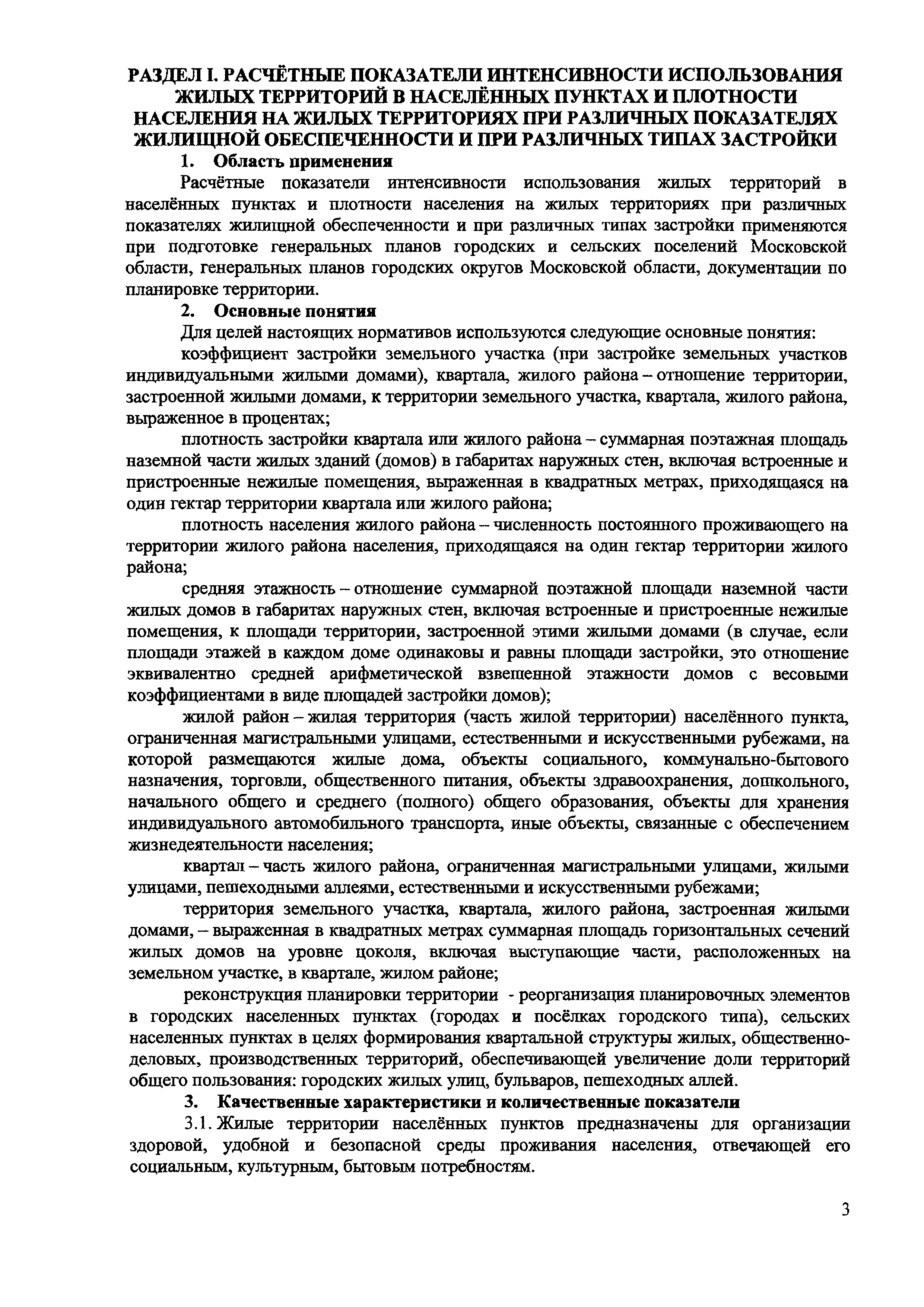 | Оглавление: | Общие положения Раздел I. Расчетные показатели интенсивности использования жилых территорий в населенных пунктах и плотности населения на жилых территориях при различных показателях жилищной обеспеченности и при различных типах застройки Раздел II. Расчетные показатели интенсивности использования производственных территорий в населенных пунктах Раздел III. Расчетные показатели плотности сети автомобильных дорог общего пользования Раздел IV. Расчетные показатели плотности сети общественного пассажирского транспорта Раздел V. Расчетные показатели потребности в территориях различного назначения Раздел VI. Расчетные показатели допустимой пешеходной и транспортной доступности объектов социального и культурного обслуживания Раздел VII. Расчетные показатели при различных планировочных условиях минимально и максимально допустимых расстояний между проектируемыми: улицами, проездами, разъездными площадками применительно к различным элементам планировочной структуры территории; зданиями, строениями и сооружениями различных типов Раздел VIII. Расчетные показатели обеспеченности жителей Московской области основными видами инженерного обеспечения (энерго-, тепло-, газоснабжение, водоснабжение, водоотведение) в целом по Московской области и дифференцированные по отдельным территориям Московской области Раздел IX. Допустимые соотношения застроенных, лесных и сельскохозяйственных территорий по Московской области в целом и дифференцированные по отдельным территориям Московской области Приложение № 1. Типология устойчивых систем расселения Московской области Приложение № 2. Состав устойчивых систем расселения Московской области Приложение № 3. Дифференциация городов Московской области по численности населения Приложение № 4. Дифференциация поселков городского типа Московской области по численности населения Приложение № 5. Примерный состав объектов различного назначения, размещаемых в границах квартала, жилого района и населенного пункта |