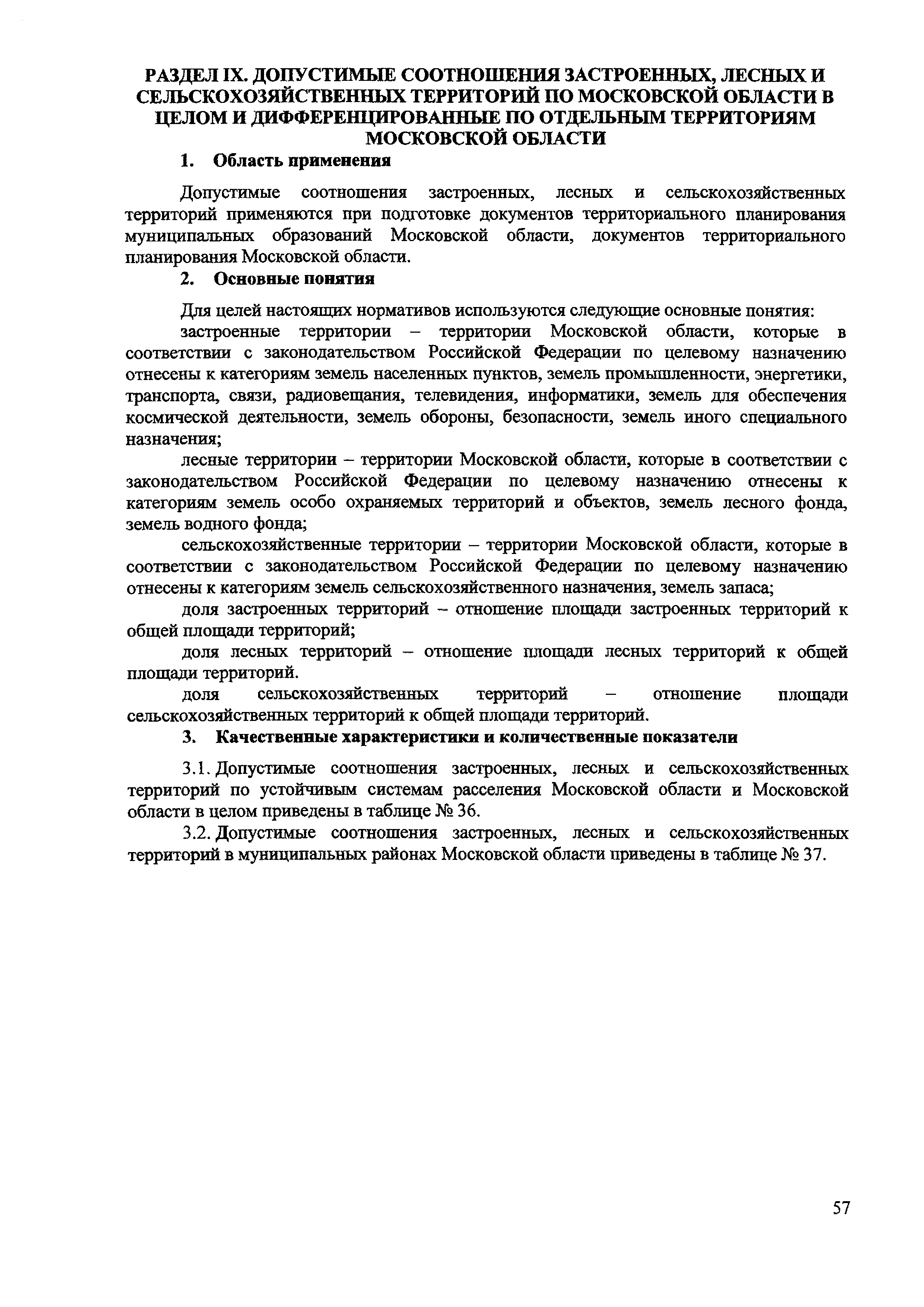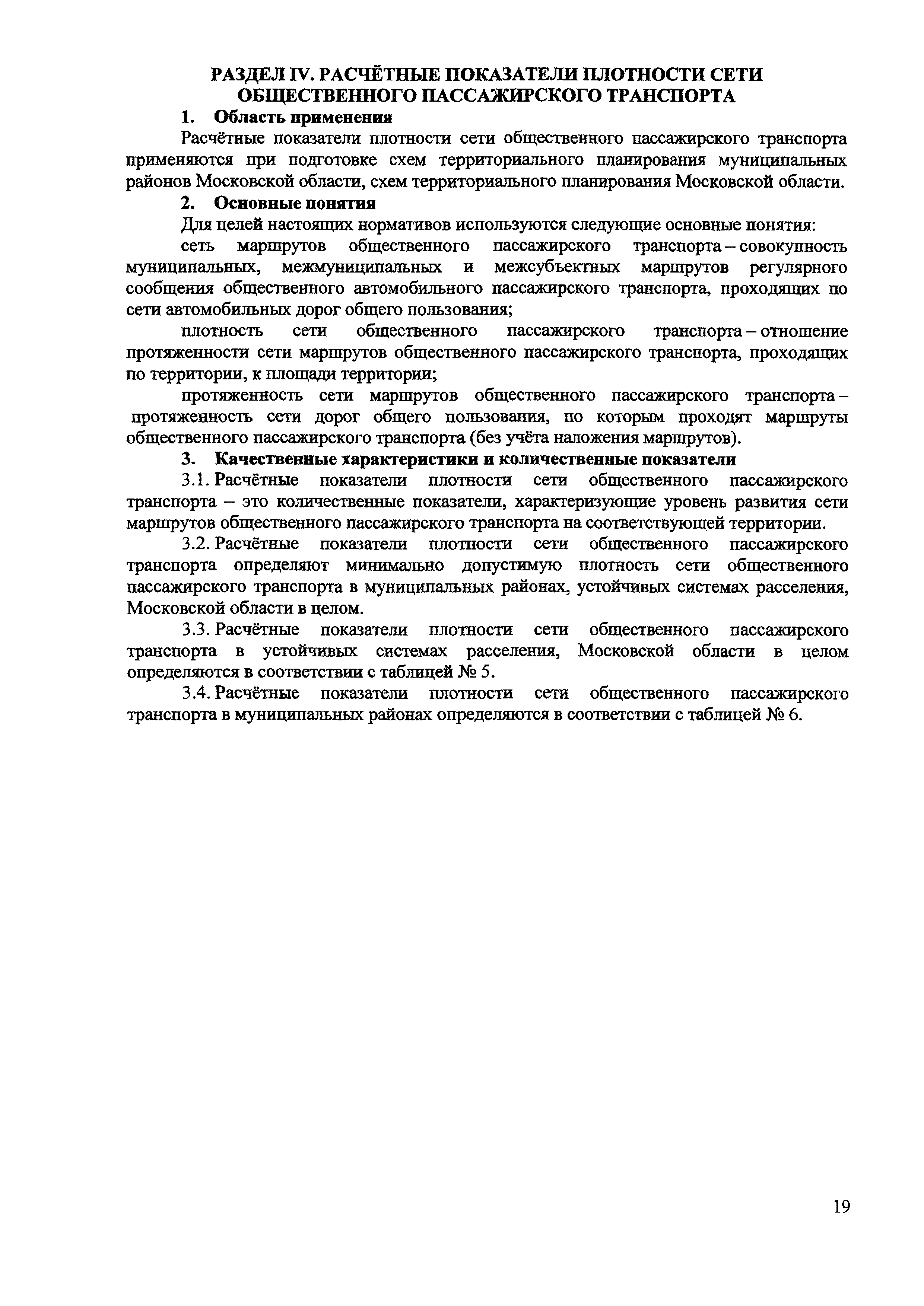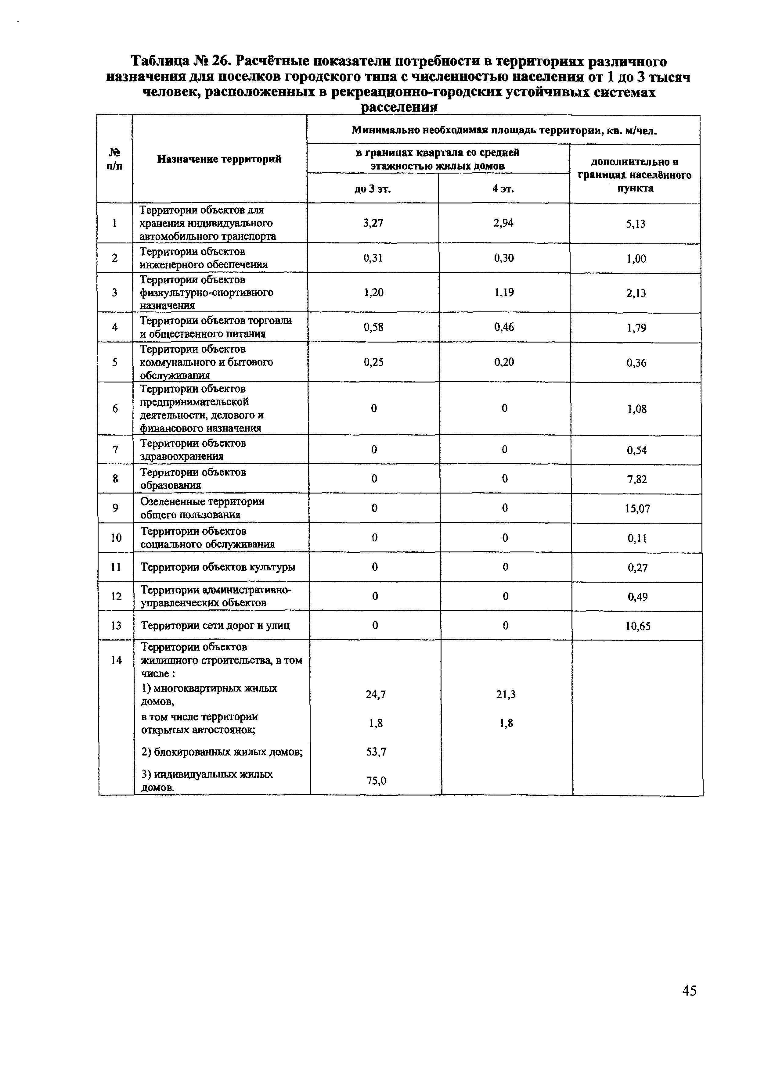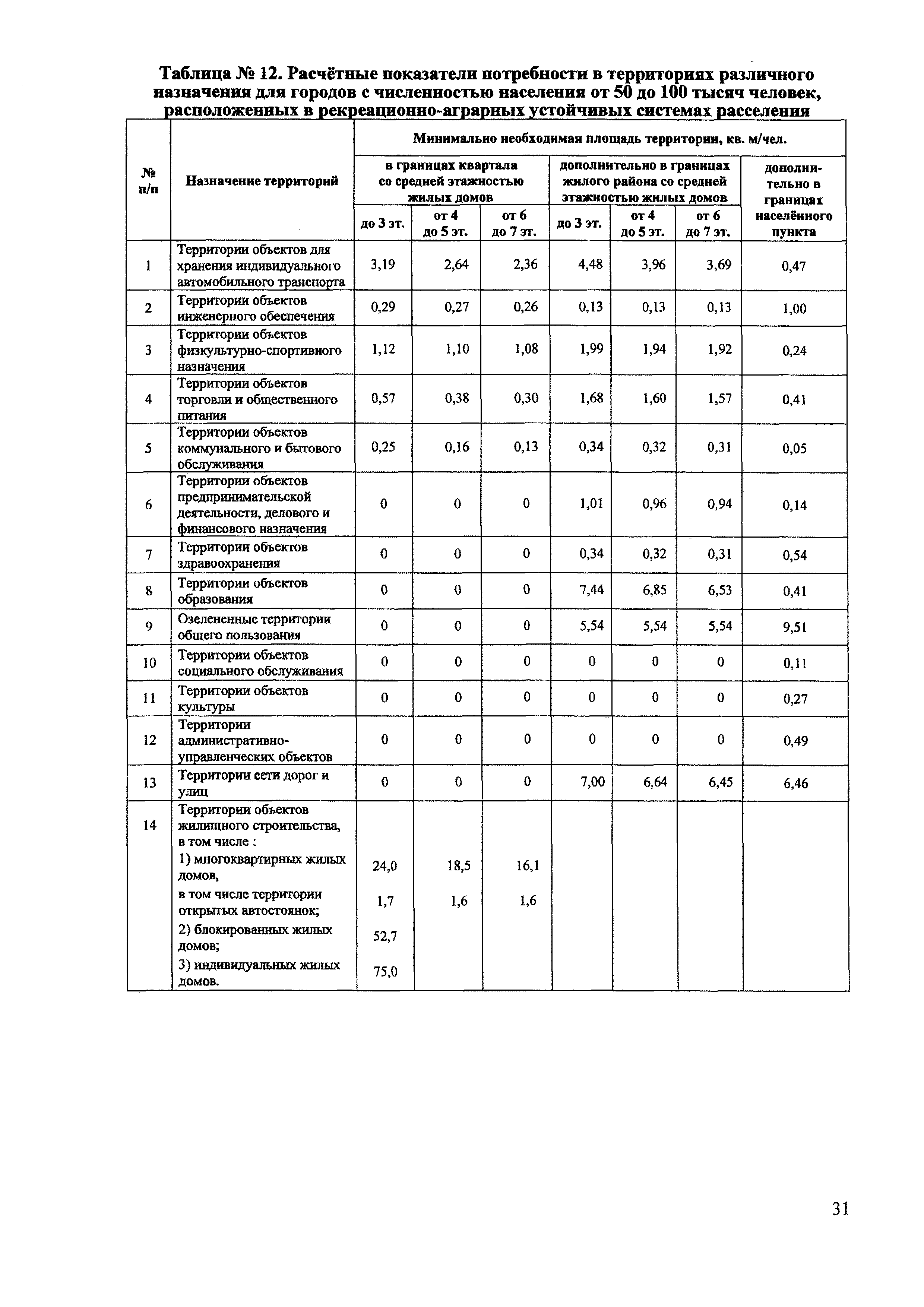 | Оглавление: | Общие положения Раздел I. Расчетные показатели интенсивности использования жилых территорий в населенных пунктах и плотности населения на жилых территориях при различных показателях жилищной обеспеченности и при различных типах застройки Раздел II. Расчетные показатели интенсивности использования производственных территорий в населенных пунктах Раздел III. Расчетные показатели плотности сети автомобильных дорог общего пользования Раздел IV. Расчетные показатели плотности сети общественного пассажирского транспорта Раздел V. Расчетные показатели потребности в территориях различного назначения Раздел VI. Расчетные показатели допустимой пешеходной и транспортной доступности объектов социального и культурного обслуживания Раздел VII. Расчетные показатели при различных планировочных условиях минимально и максимально допустимых расстояний между проектируемыми: улицами, проездами, разъездными площадками применительно к различным элементам планировочной структуры территории; зданиями, строениями и сооружениями различных типов Раздел VIII. Расчетные показатели обеспеченности жителей Московской области основными видами инженерного обеспечения (энерго-, тепло-, газоснабжение, водоснабжение, водоотведение) в целом по Московской области и дифференцированные по отдельным территориям Московской области Раздел IX. Допустимые соотношения застроенных, лесных и сельскохозяйственных территорий по Московской области в целом и дифференцированные по отдельным территориям Московской области Приложение № 1. Типология устойчивых систем расселения Московской области Приложение № 2. Состав устойчивых систем расселения Московской области Приложение № 3. Дифференциация городов Московской области по численности населения Приложение № 4. Дифференциация поселков городского типа Московской области по численности населения Приложение № 5. Примерный состав объектов различного назначения, размещаемых в границах квартала, жилого района и населенного пункта |