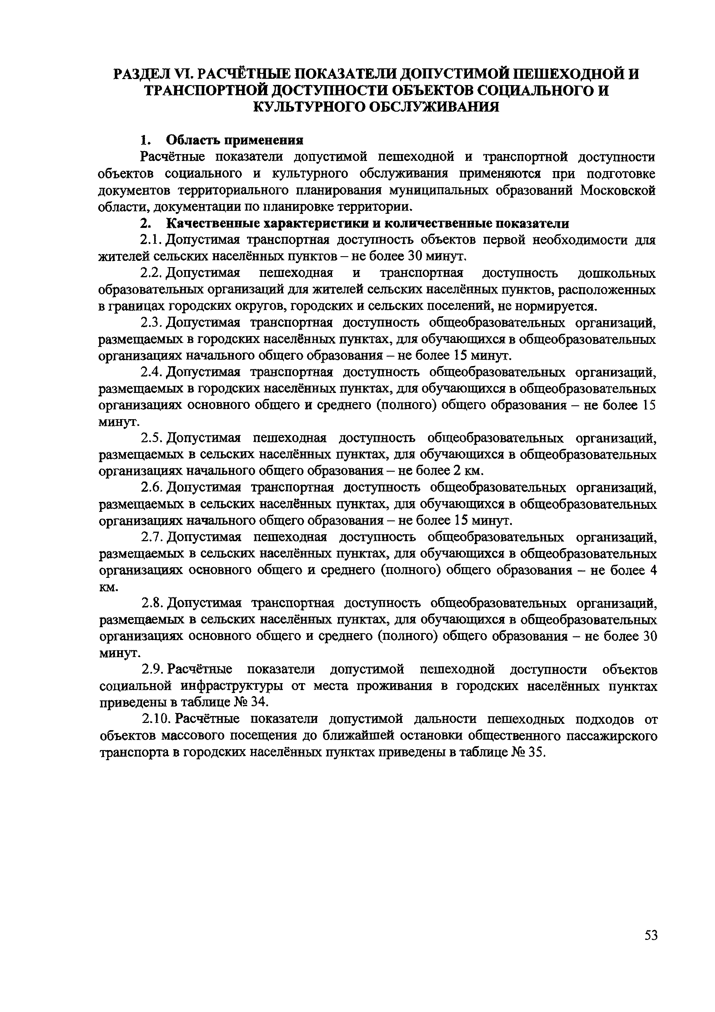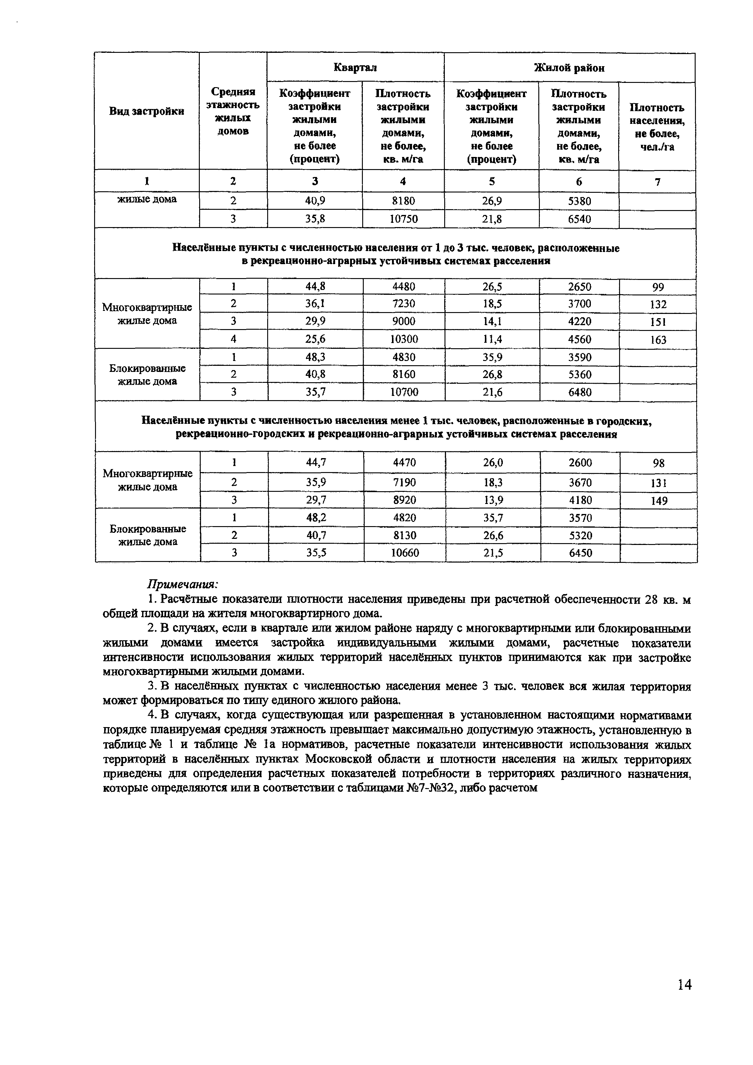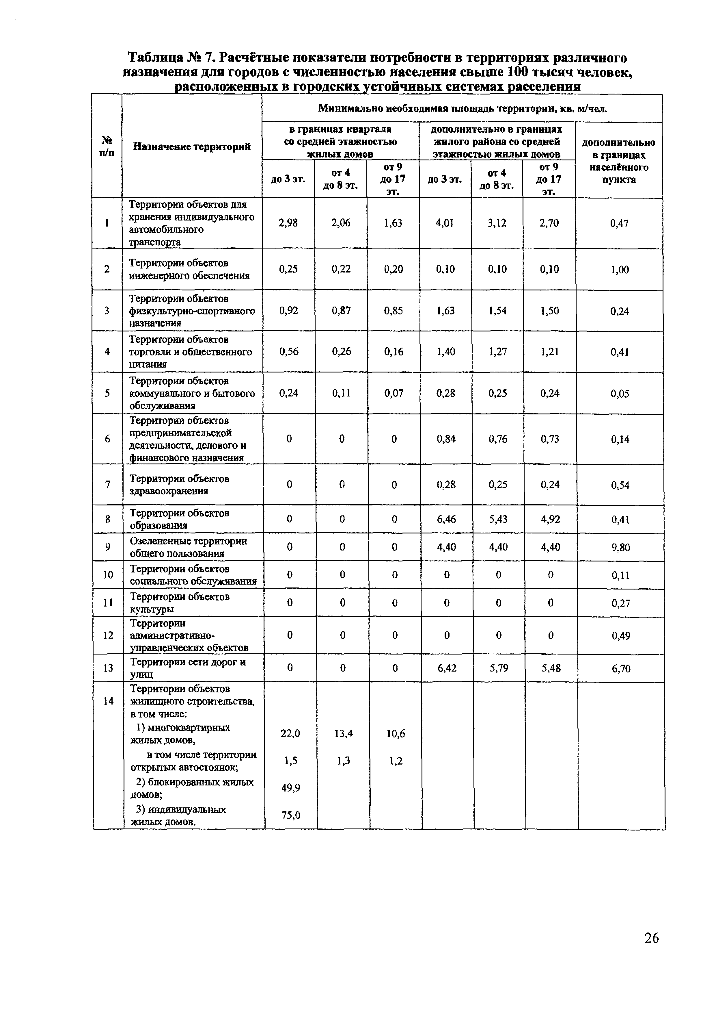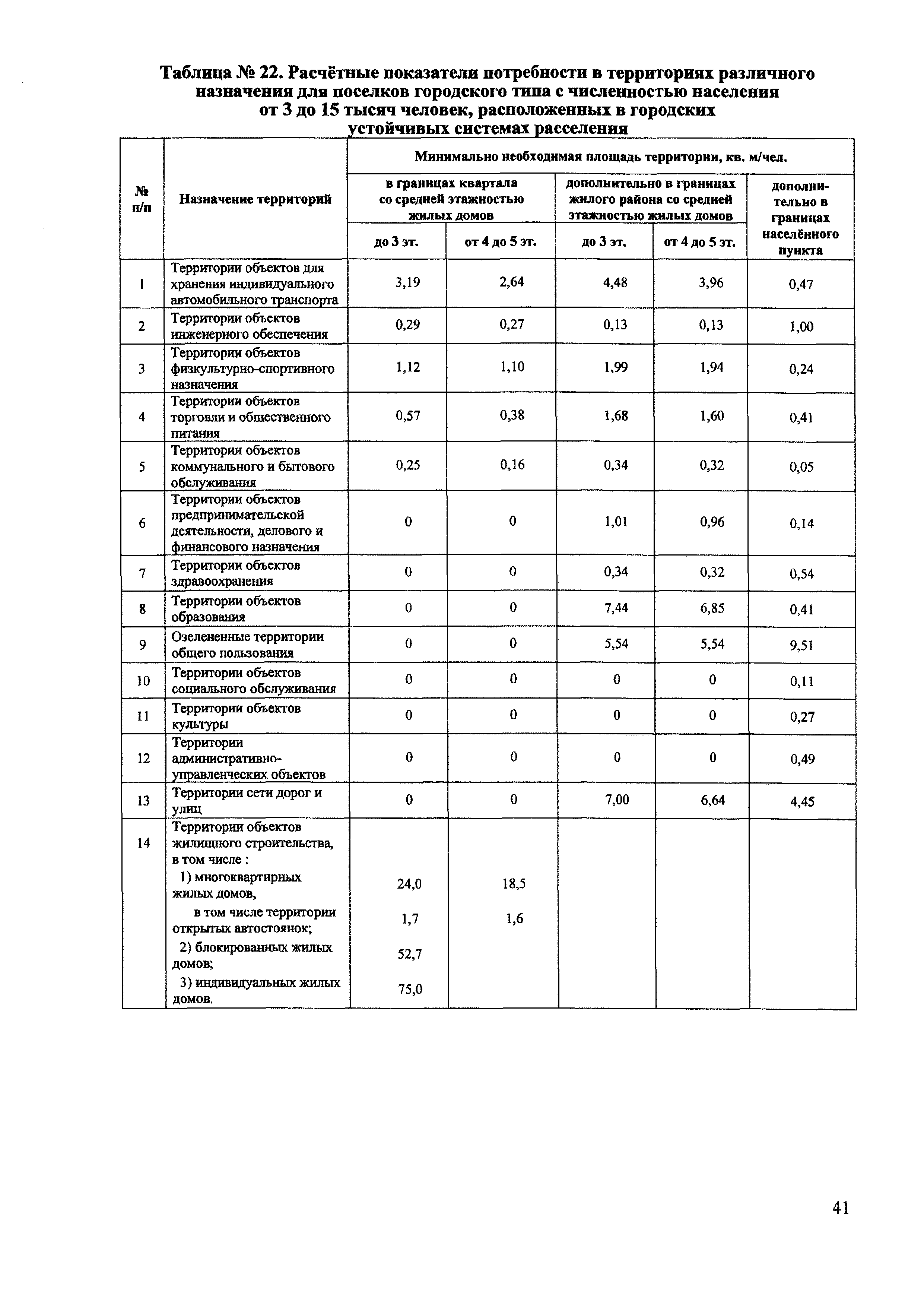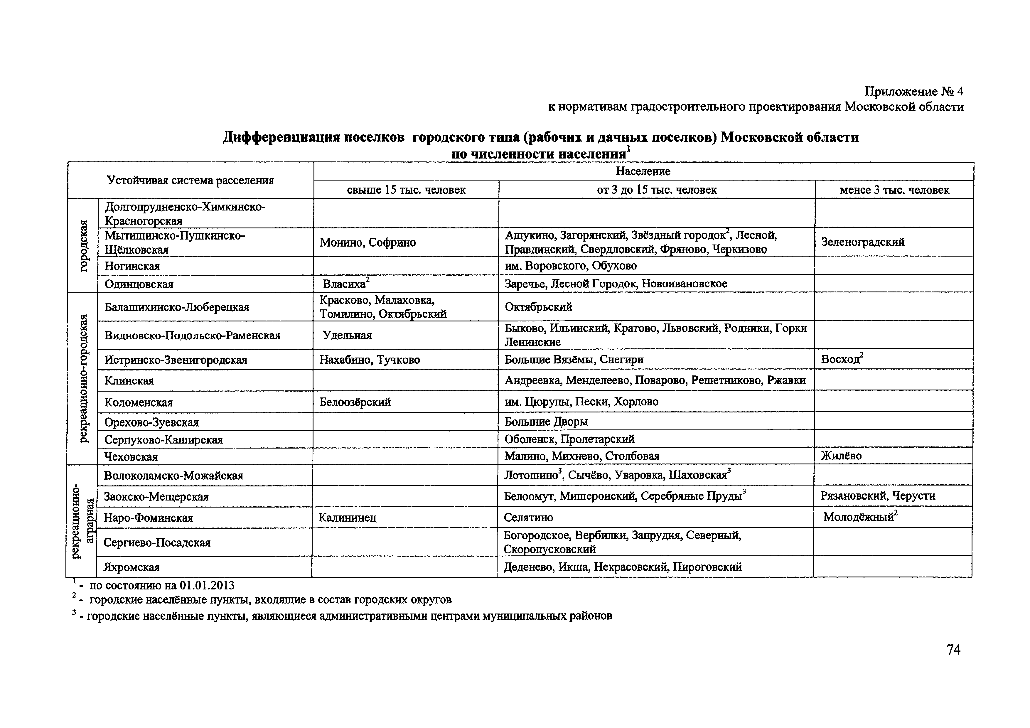 | Оглавление: | Общие положения Раздел I. Расчетные показатели интенсивности использования жилых территорий в населенных пунктах и плотности населения на жилых территориях при различных показателях жилищной обеспеченности и при различных типах застройки Раздел II. Расчетные показатели интенсивности использования производственных территорий в населенных пунктах Раздел III. Расчетные показатели плотности сети автомобильных дорог общего пользования Раздел IV. Расчетные показатели плотности сети общественного пассажирского транспорта Раздел V. Расчетные показатели потребности в территориях различного назначения Раздел VI. Расчетные показатели допустимой пешеходной и транспортной доступности объектов социального и культурного обслуживания Раздел VII. Расчетные показатели при различных планировочных условиях минимально и максимально допустимых расстояний между проектируемыми: улицами, проездами, разъездными площадками применительно к различным элементам планировочной структуры территории; зданиями, строениями и сооружениями различных типов Раздел VIII. Расчетные показатели обеспеченности жителей Московской области основными видами инженерного обеспечения (энерго-, тепло-, газоснабжение, водоснабжение, водоотведение) в целом по Московской области и дифференцированные по отдельным территориям Московской области Раздел IX. Допустимые соотношения застроенных, лесных и сельскохозяйственных территорий по Московской области в целом и дифференцированные по отдельным территориям Московской области Приложение № 1. Типология устойчивых систем расселения Московской области Приложение № 2. Состав устойчивых систем расселения Московской области Приложение № 3. Дифференциация городов Московской области по численности населения Приложение № 4. Дифференциация поселков городского типа Московской области по численности населения Приложение № 5. Примерный состав объектов различного назначения, размещаемых в границах квартала, жилого района и населенного пункта |