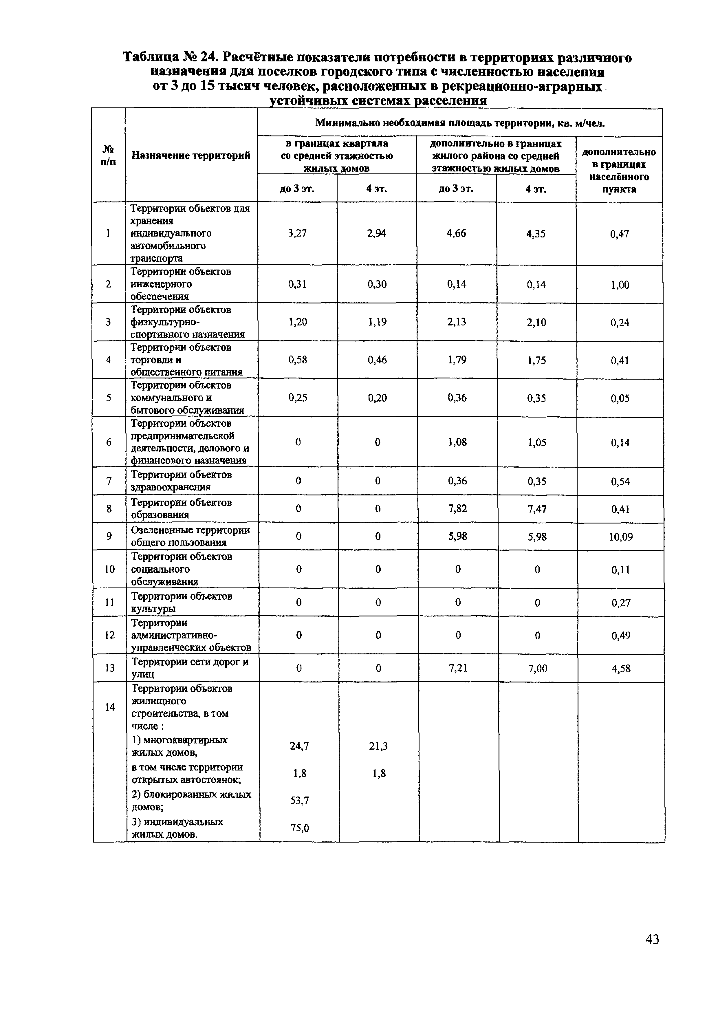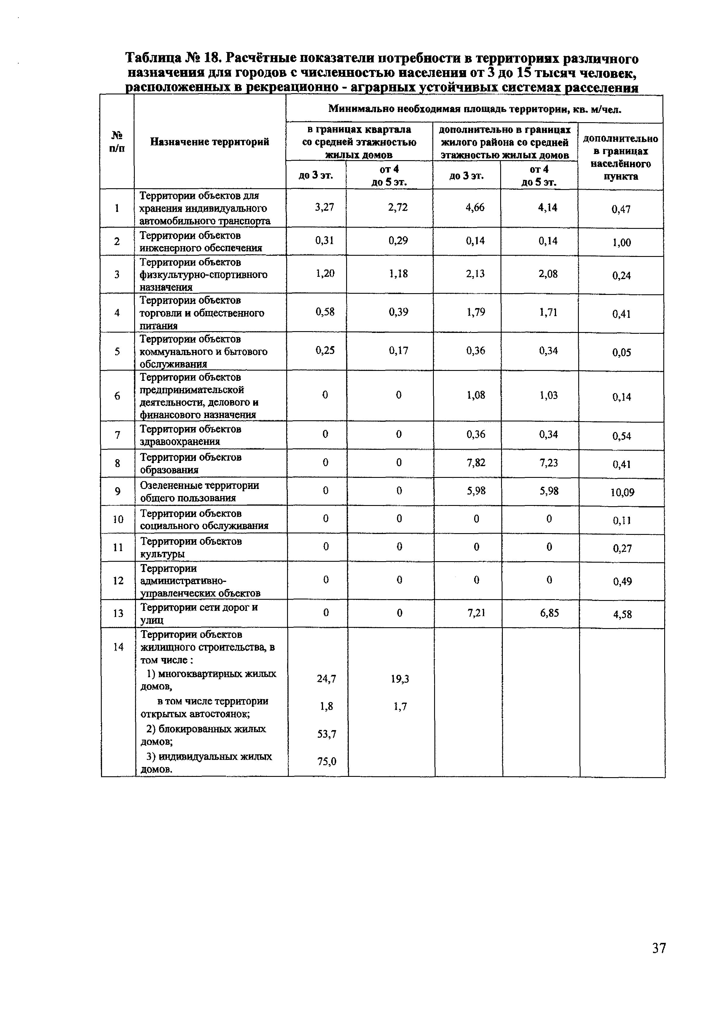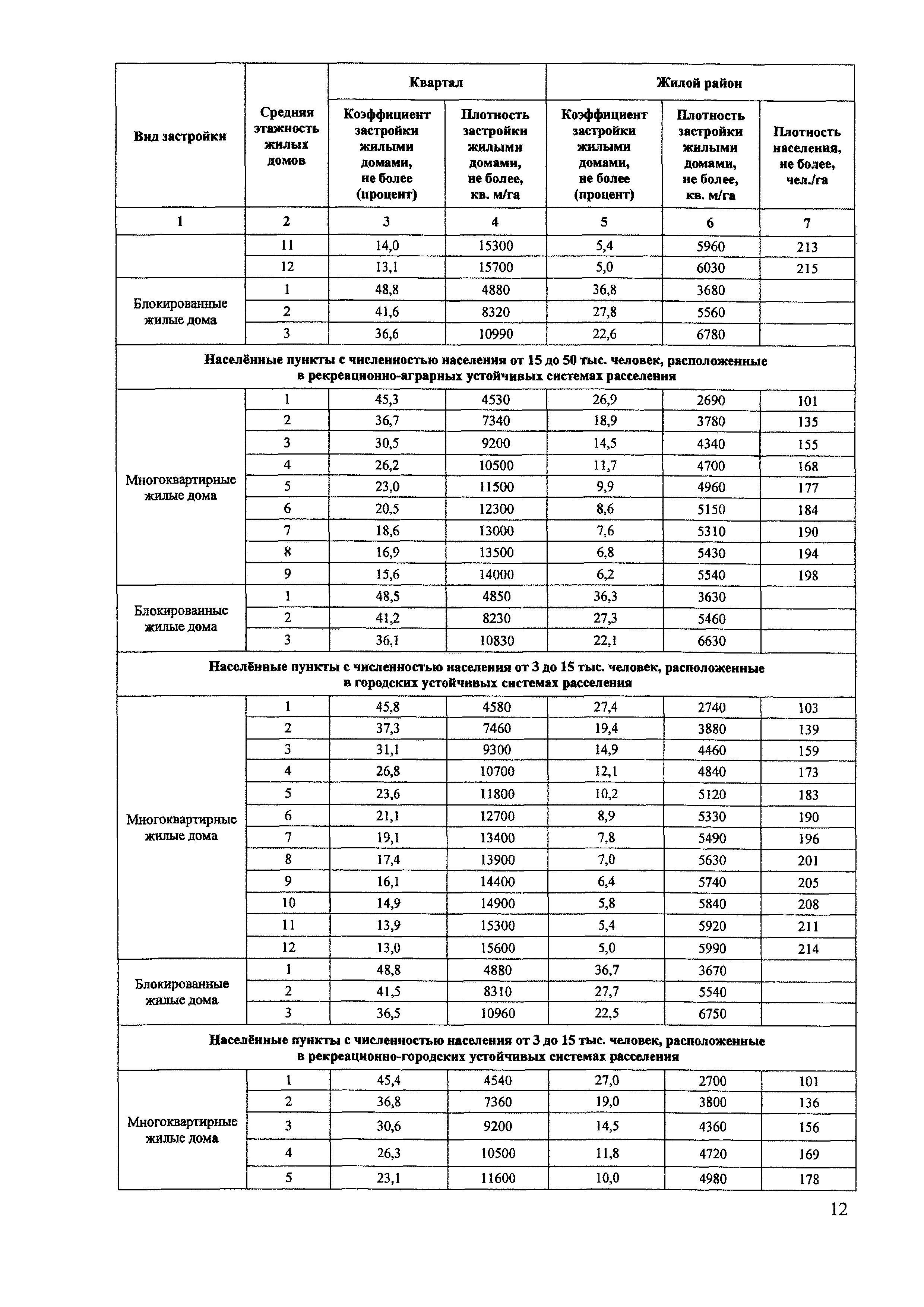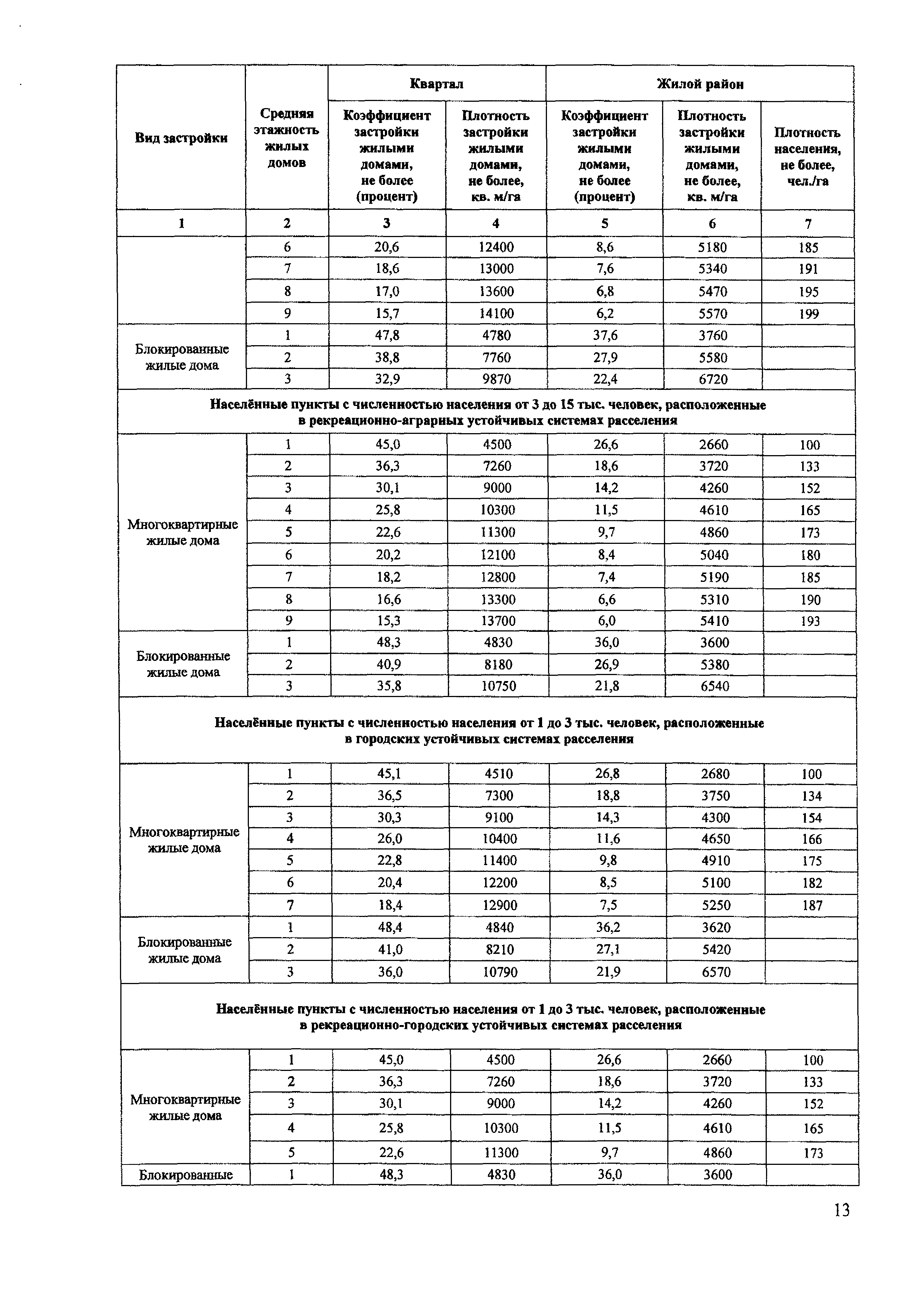 | Оглавление: | Общие положения Раздел I. Расчетные показатели интенсивности использования жилых территорий в населенных пунктах и плотности населения на жилых территориях при различных показателях жилищной обеспеченности и при различных типах застройки Раздел II. Расчетные показатели интенсивности использования производственных территорий в населенных пунктах Раздел III. Расчетные показатели плотности сети автомобильных дорог общего пользования Раздел IV. Расчетные показатели плотности сети общественного пассажирского транспорта Раздел V. Расчетные показатели потребности в территориях различного назначения Раздел VI. Расчетные показатели допустимой пешеходной и транспортной доступности объектов социального и культурного обслуживания Раздел VII. Расчетные показатели при различных планировочных условиях минимально и максимально допустимых расстояний между проектируемыми: улицами, проездами, разъездными площадками применительно к различным элементам планировочной структуры территории; зданиями, строениями и сооружениями различных типов Раздел VIII. Расчетные показатели обеспеченности жителей Московской области основными видами инженерного обеспечения (энерго-, тепло-, газоснабжение, водоснабжение, водоотведение) в целом по Московской области и дифференцированные по отдельным территориям Московской области Раздел IX. Допустимые соотношения застроенных, лесных и сельскохозяйственных территорий по Московской области в целом и дифференцированные по отдельным территориям Московской области Приложение № 1. Типология устойчивых систем расселения Московской области Приложение № 2. Состав устойчивых систем расселения Московской области Приложение № 3. Дифференциация городов Московской области по численности населения Приложение № 4. Дифференциация поселков городского типа Московской области по численности населения Приложение № 5. Примерный состав объектов различного назначения, размещаемых в границах квартала, жилого района и населенного пункта |