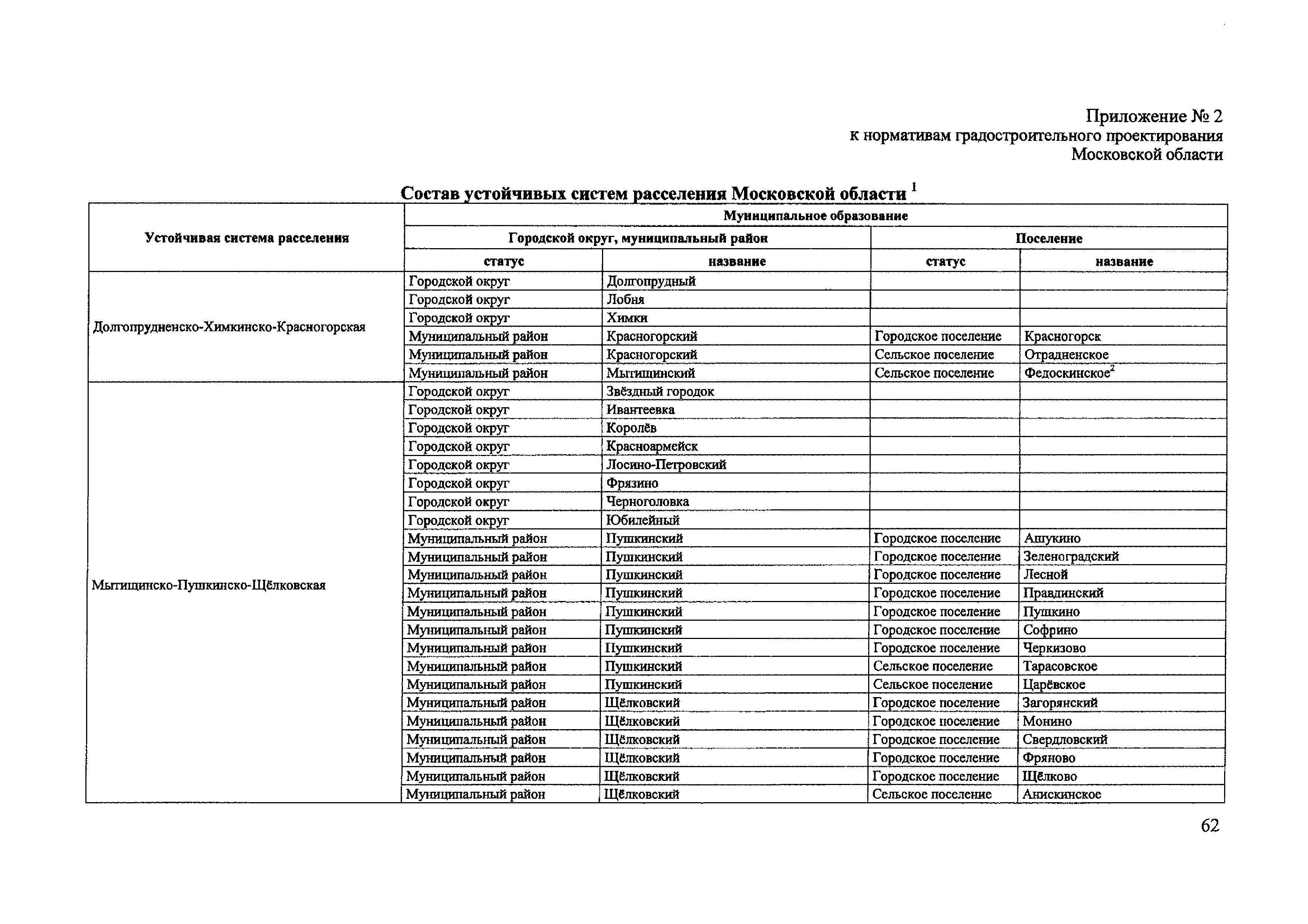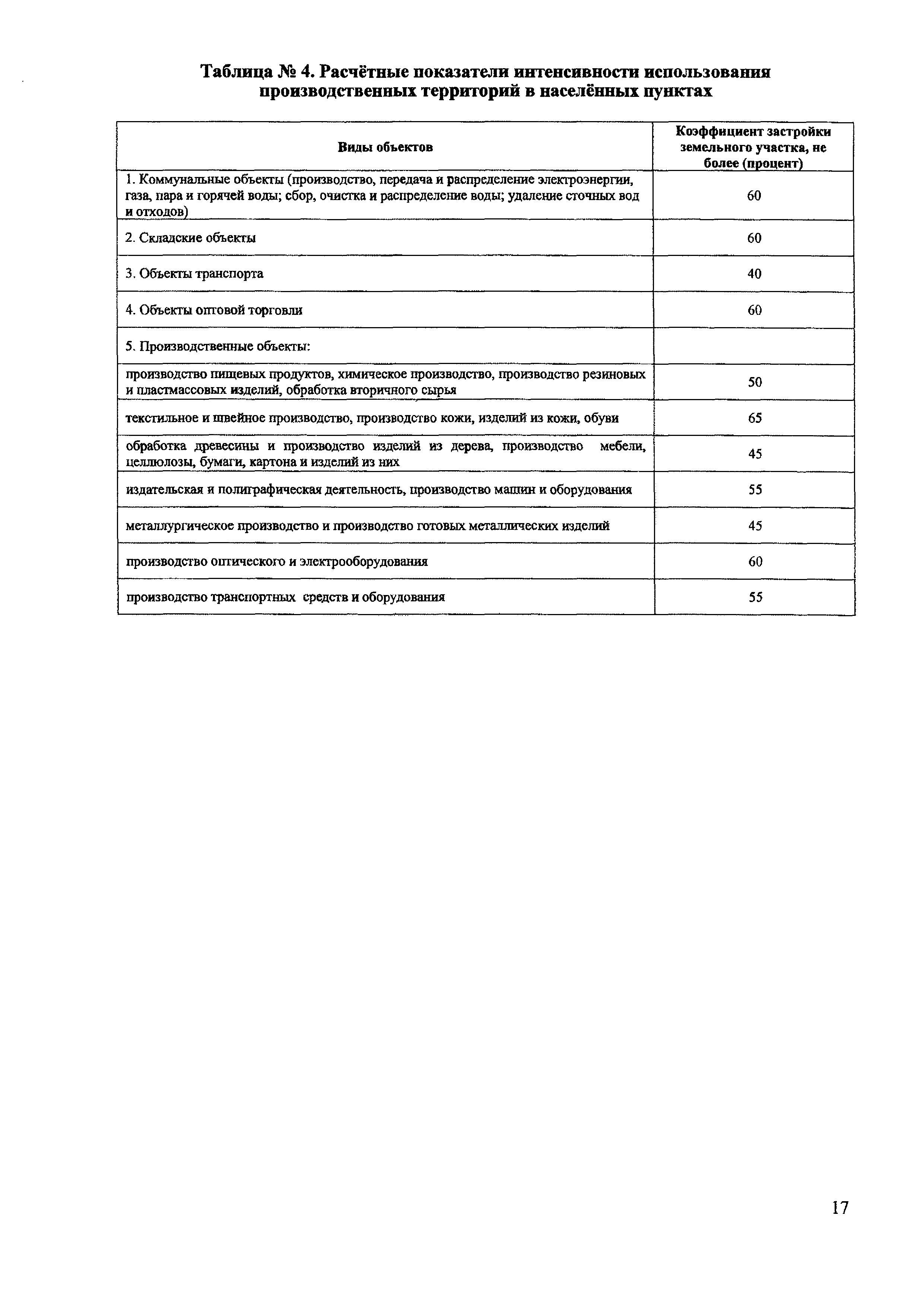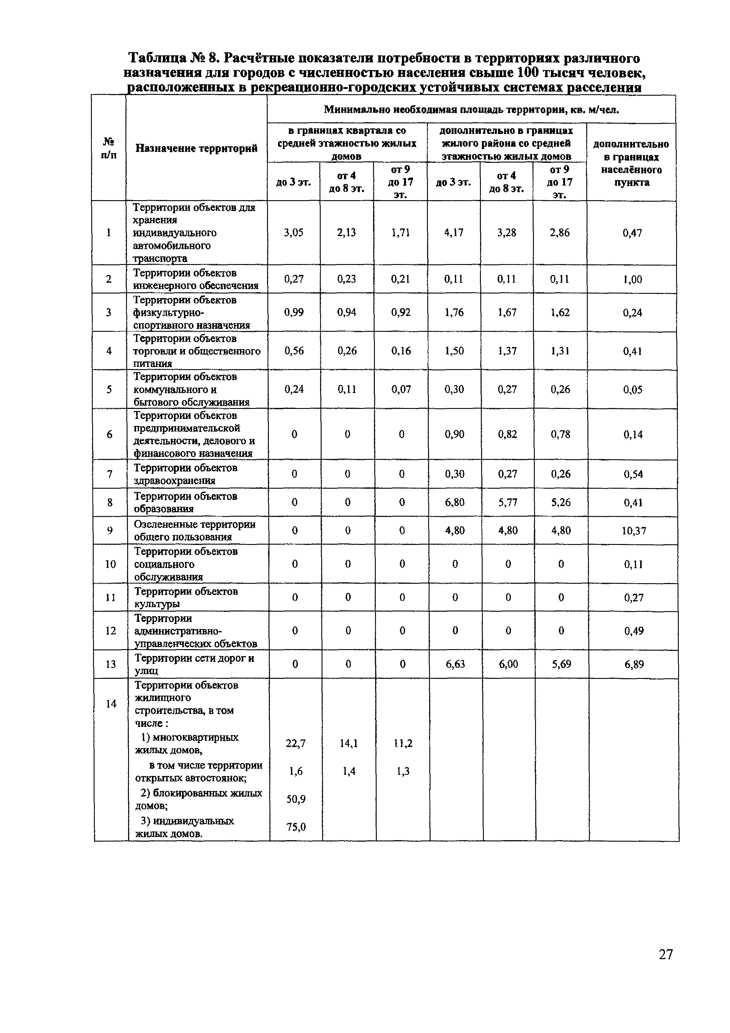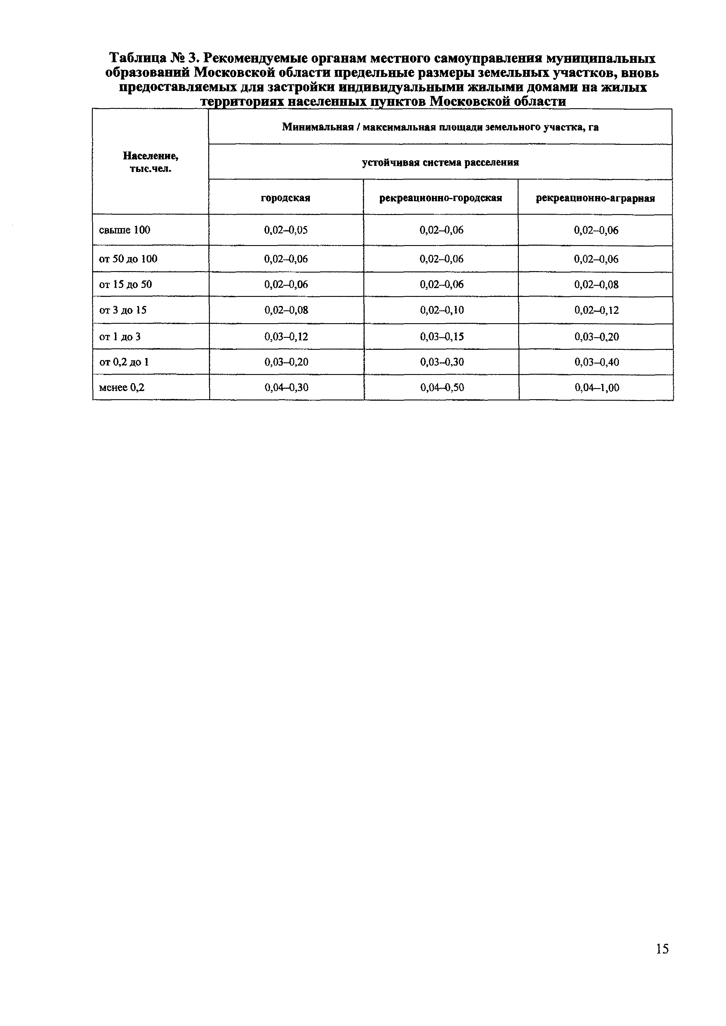 | Оглавление: | Общие положения Раздел I. Расчетные показатели интенсивности использования жилых территорий в населенных пунктах и плотности населения на жилых территориях при различных показателях жилищной обеспеченности и при различных типах застройки Раздел II. Расчетные показатели интенсивности использования производственных территорий в населенных пунктах Раздел III. Расчетные показатели плотности сети автомобильных дорог общего пользования Раздел IV. Расчетные показатели плотности сети общественного пассажирского транспорта Раздел V. Расчетные показатели потребности в территориях различного назначения Раздел VI. Расчетные показатели допустимой пешеходной и транспортной доступности объектов социального и культурного обслуживания Раздел VII. Расчетные показатели при различных планировочных условиях минимально и максимально допустимых расстояний между проектируемыми: улицами, проездами, разъездными площадками применительно к различным элементам планировочной структуры территории; зданиями, строениями и сооружениями различных типов Раздел VIII. Расчетные показатели обеспеченности жителей Московской области основными видами инженерного обеспечения (энерго-, тепло-, газоснабжение, водоснабжение, водоотведение) в целом по Московской области и дифференцированные по отдельным территориям Московской области Раздел IX. Допустимые соотношения застроенных, лесных и сельскохозяйственных территорий по Московской области в целом и дифференцированные по отдельным территориям Московской области Приложение № 1. Типология устойчивых систем расселения Московской области Приложение № 2. Состав устойчивых систем расселения Московской области Приложение № 3. Дифференциация городов Московской области по численности населения Приложение № 4. Дифференциация поселков городского типа Московской области по численности населения Приложение № 5. Примерный состав объектов различного назначения, размещаемых в границах квартала, жилого района и населенного пункта |