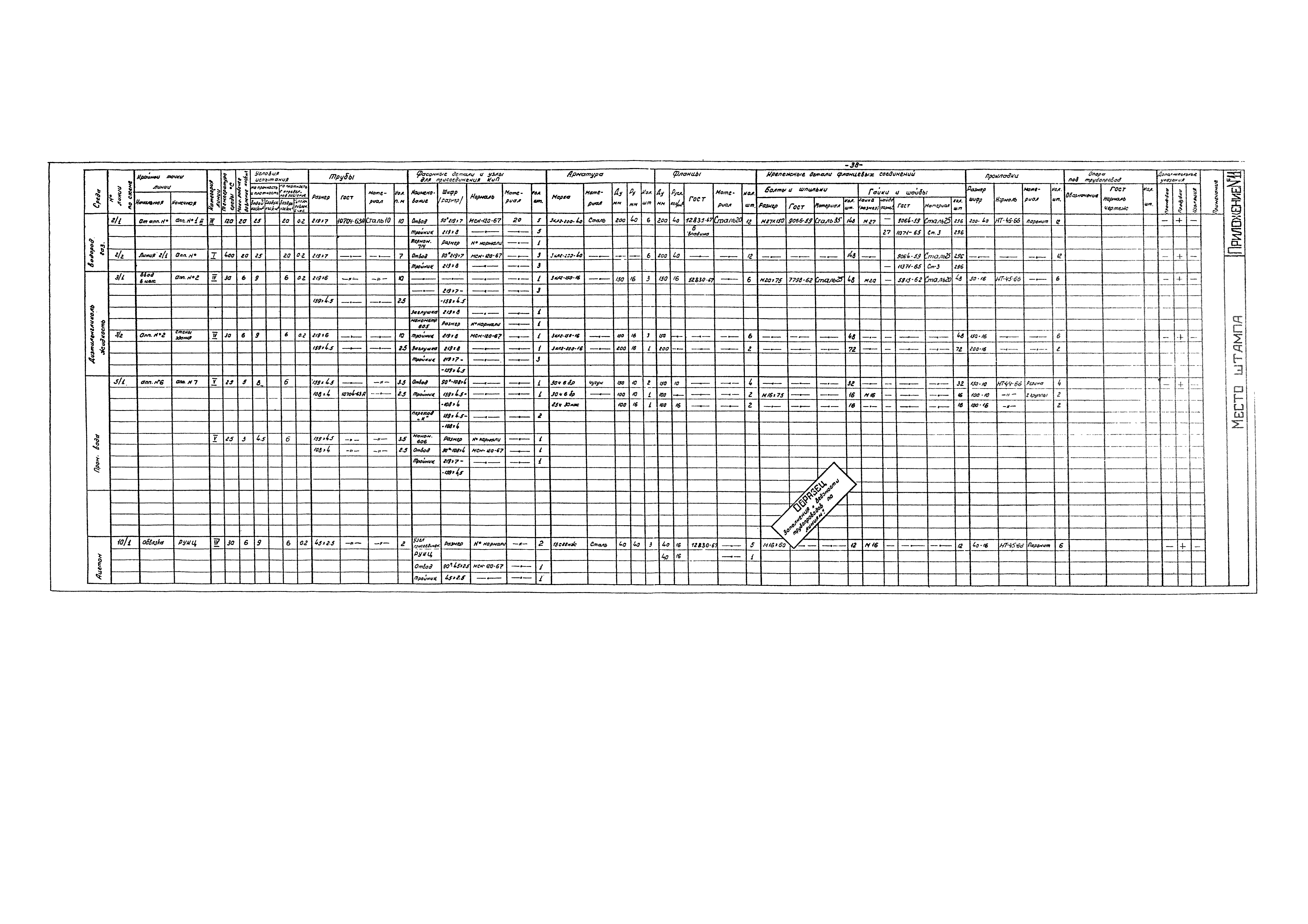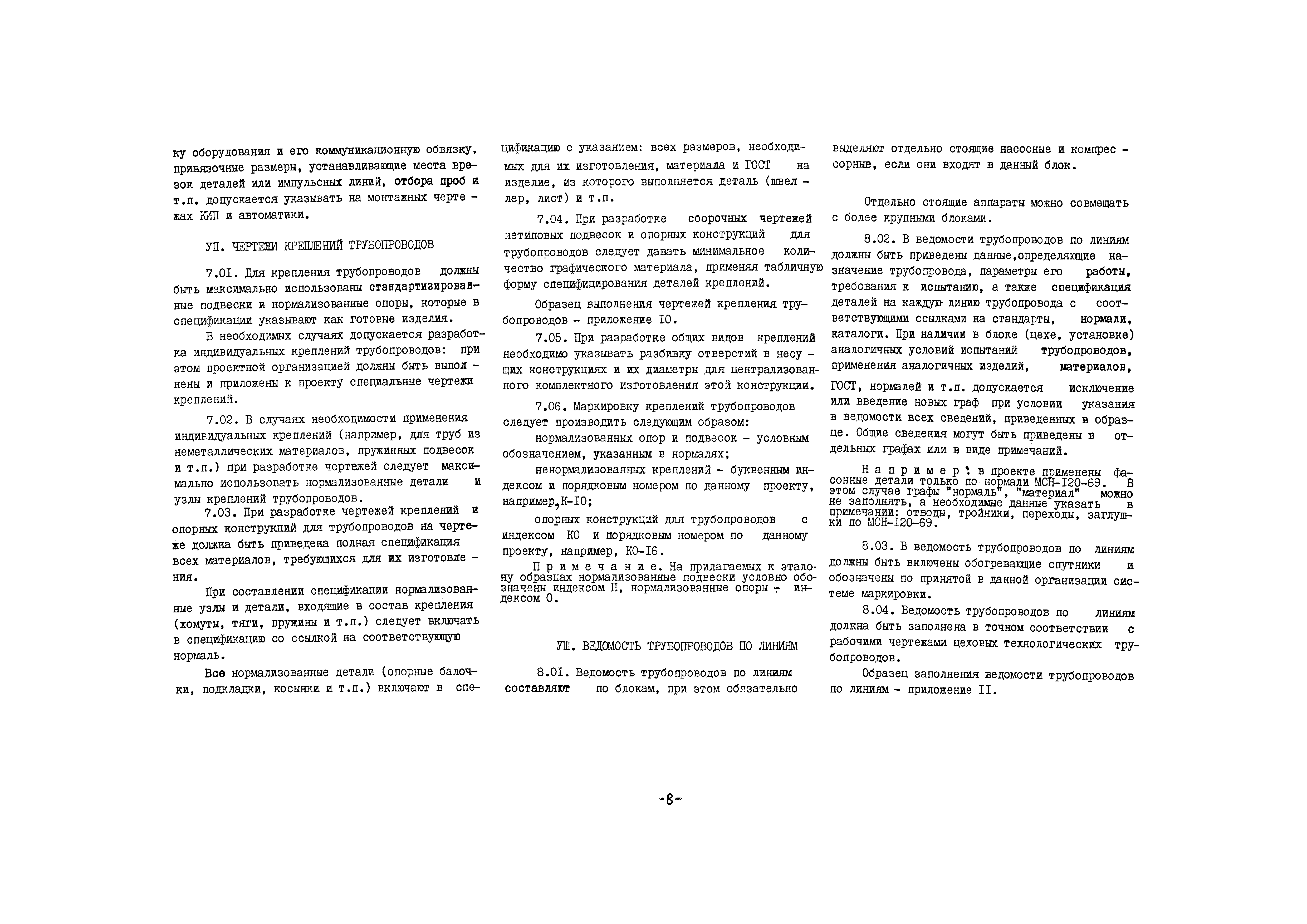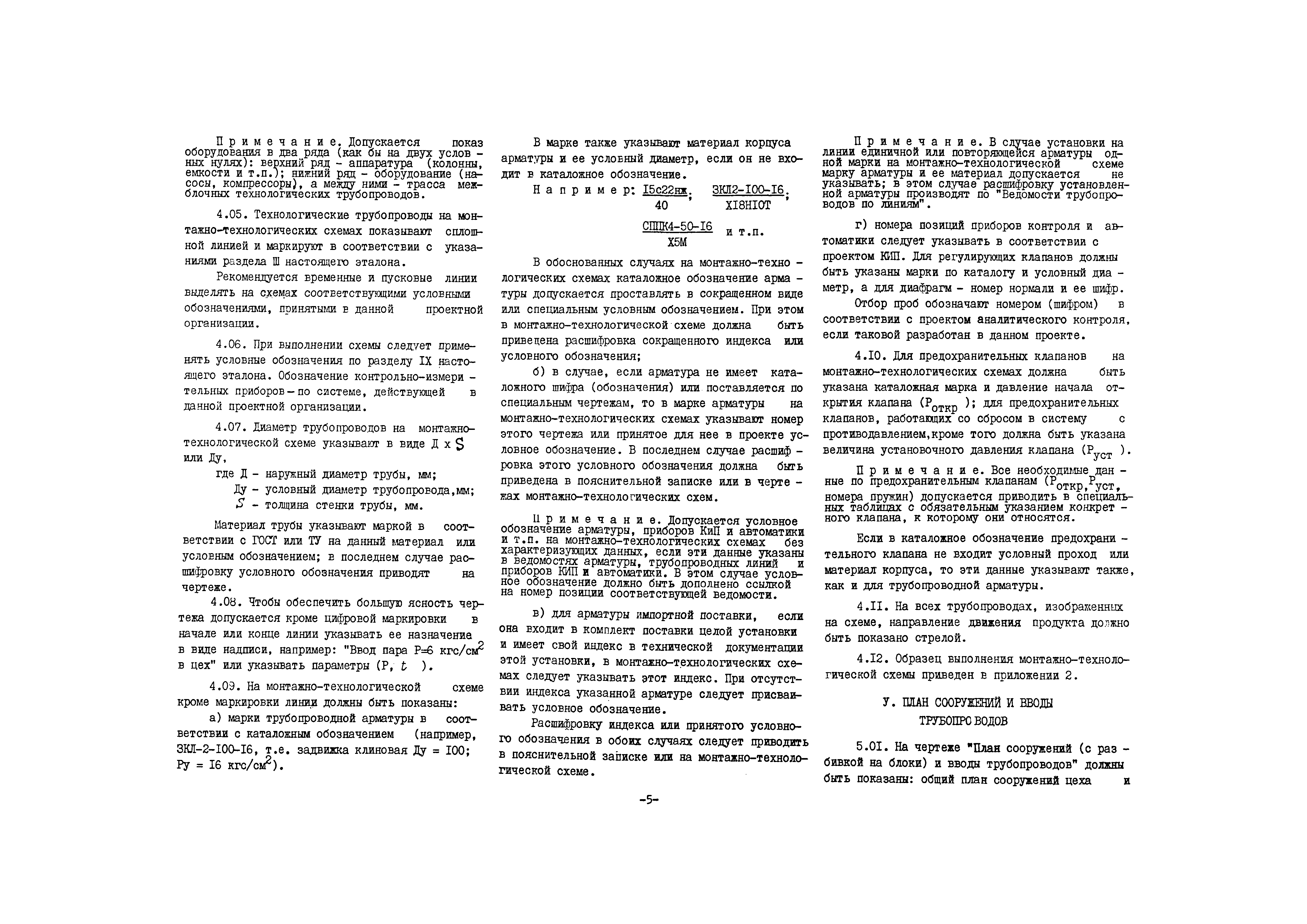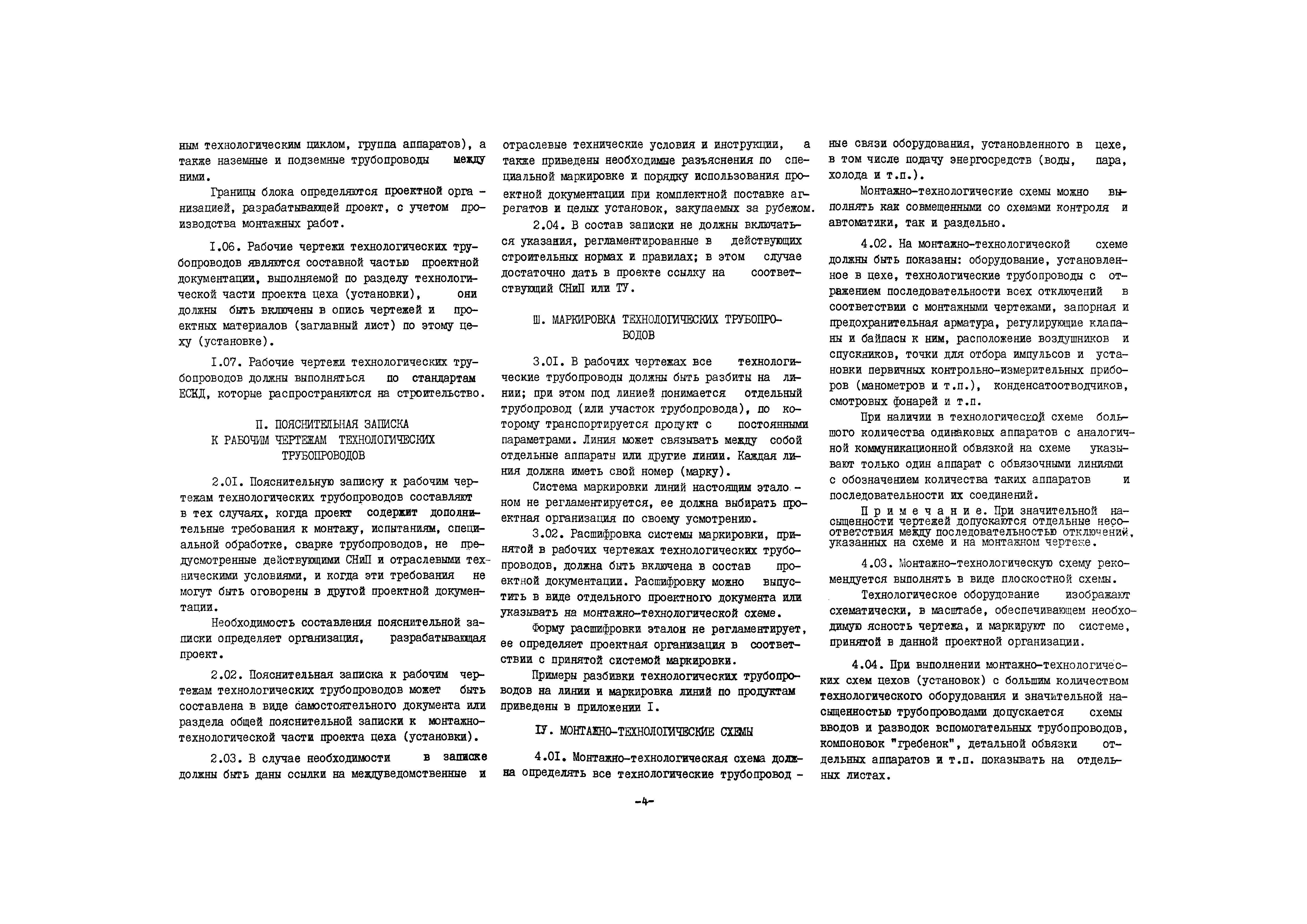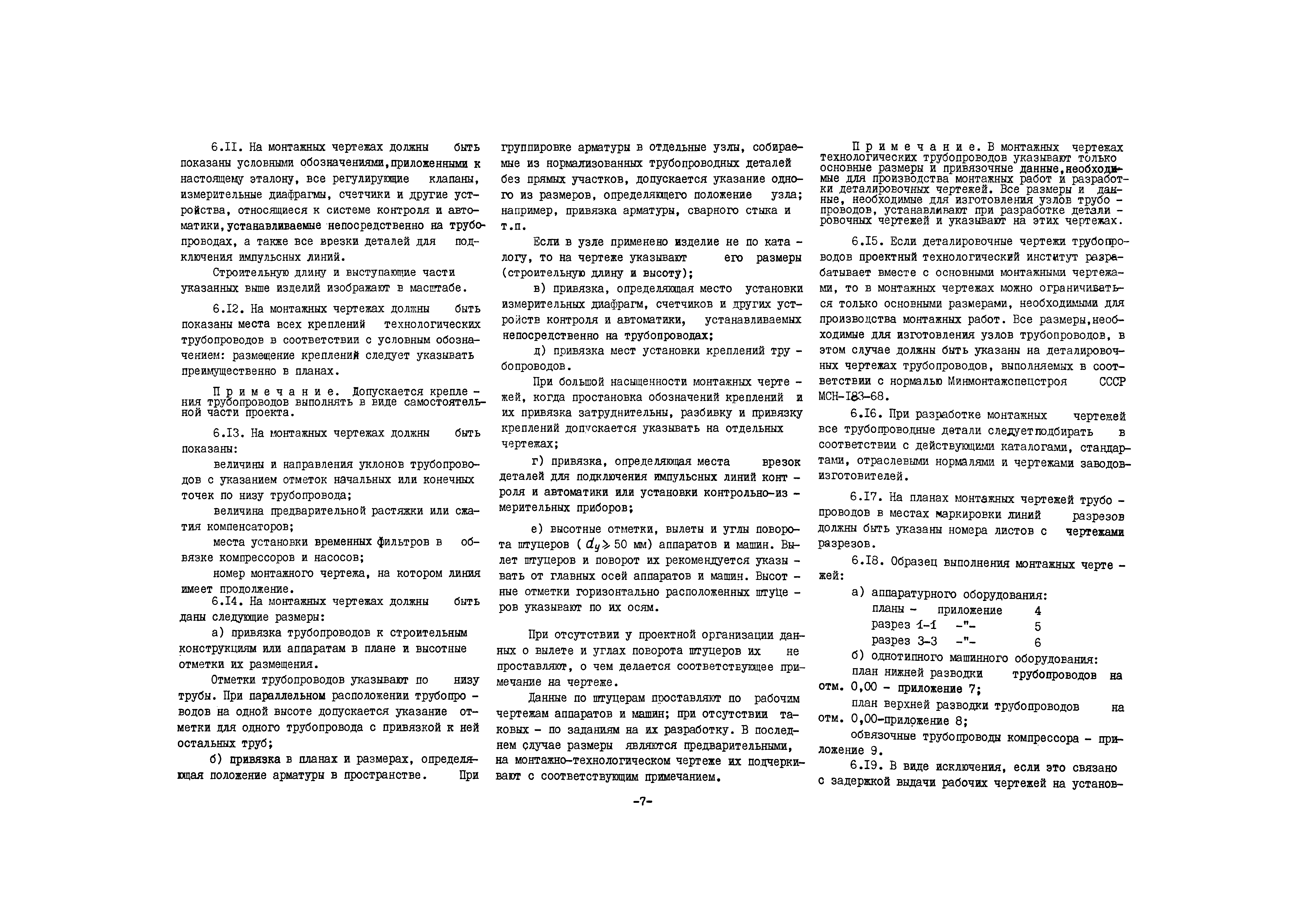 Эталон выполнения рабочих (монтажных) чертежей технологических трубопроводов отдельных цехов (установок)| Статус: | действует | | Название рус.: | Эталон выполнения рабочих (монтажных) чертежей технологических трубопроводов отдельных цехов (установок) | | Дата добавления в базу: | 01.10.2014 | | Дата актуализации: | 01.01.2021 | | Дата введения: | 01.07.1970 | | Область применения: | Эталон устанавливает состав, содержание и объем рабочих (монтажных) чертежей технологических трубопроводов при графическом методе проектирования, обеспечивающих возможность выполнения всех строительно-монтажных работ на площадке строительства и разработку деталировочных чертежей технологических трубопроводов, необходимых для изготовления и монтажа их индустриальными методами; единую систему выполнения рабочих (монтажных) чертежей технологических трубопроводов и единые условные обозначения деталей трубопроводов и арматуры | | Оглавление: | I Общие положения II Пояснительная записка к рабочим чертежам технологических трубопроводов III Маркировка технологических трубопроводов IV Монтажно-технологические схемы V План сооружений и вводы трубопроводов VI Монтажные чертежи трубопроводов VII Чертежи креплений трубопроводов VIII Ведомость трубопроводов по линиям IX Рекомендуемые условные обозначения трубопроводов и арматуры Приложение 1. Образец разбивки трубопроводов на линиях Приложение 2. Образец выполнения монтажно-технологической схемы Приложение 3. Образец выполнения плана сооружений (с разбивкой на блоки) и вводы трубопроводов Приложение 4. Образец выполнения монтажного чертежа трубопроводов, планы Приложение 5. Образец выполнения монтажных чертежей, разрез I-I Приложение 6. Образец выполнения монтажного чертежей на трубопроводов, разрез 3—3 Приложение 7. Образец выполнения монтажного чертежа трубопроводов, план на отм. 0,00-нижняя разводка трубопроводов Приложение 8. Образец выполнения монтажного чертежа трубопроводов, план на отм. 0,00-верхняя разводка трубопроводов Приложение 9. Образец выполнения монтажного чертежа трубопроводов, обвязочные трубопроводы компрессора Приложение 10. Образец выполнения креплений трубопроводов Приложение 11. Образец заполнения ведомости трубопроводов по линиям | | Разработан: | ВНИИмонтажспецстрой Главхиммонтаж Минмонтажспецстроя СССР
