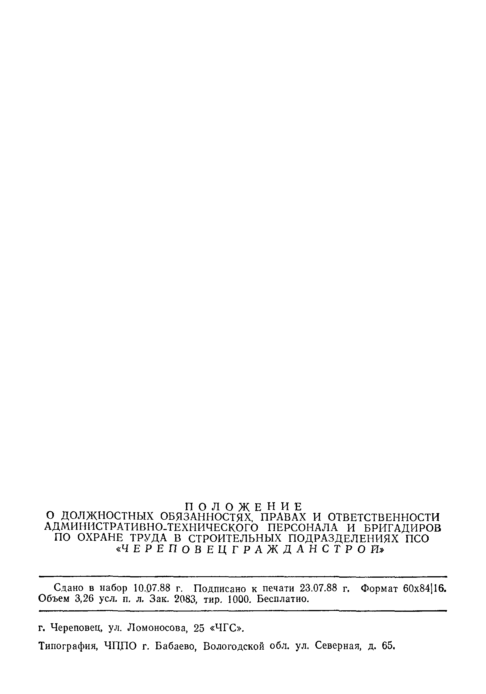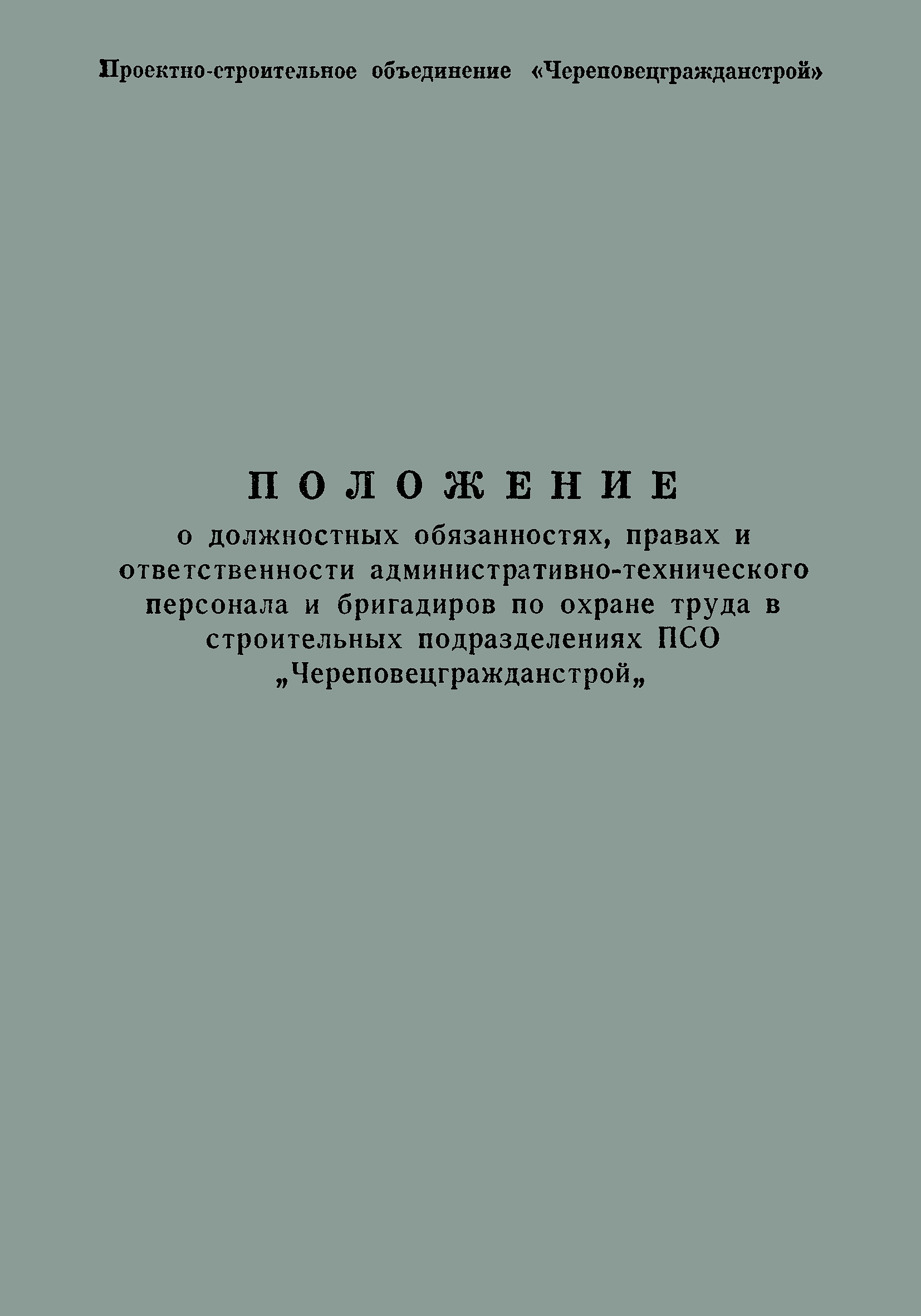 | Название рус.: | Положение о должностных обязанностях, правах и ответственности административно-технического персонала и бригадиров по охране труда в строительных подразделениях ПСО "Череповецгражданстрой" |