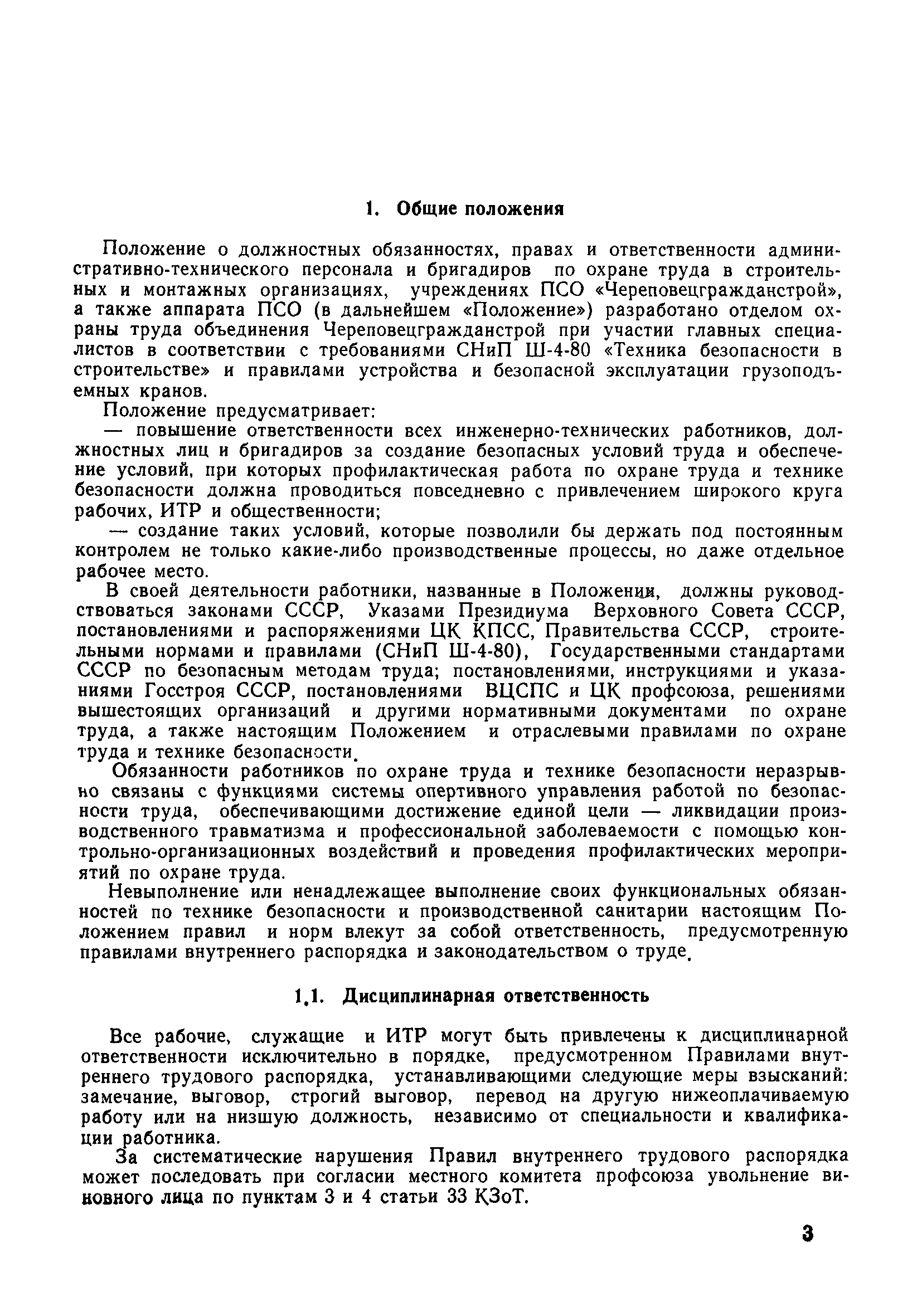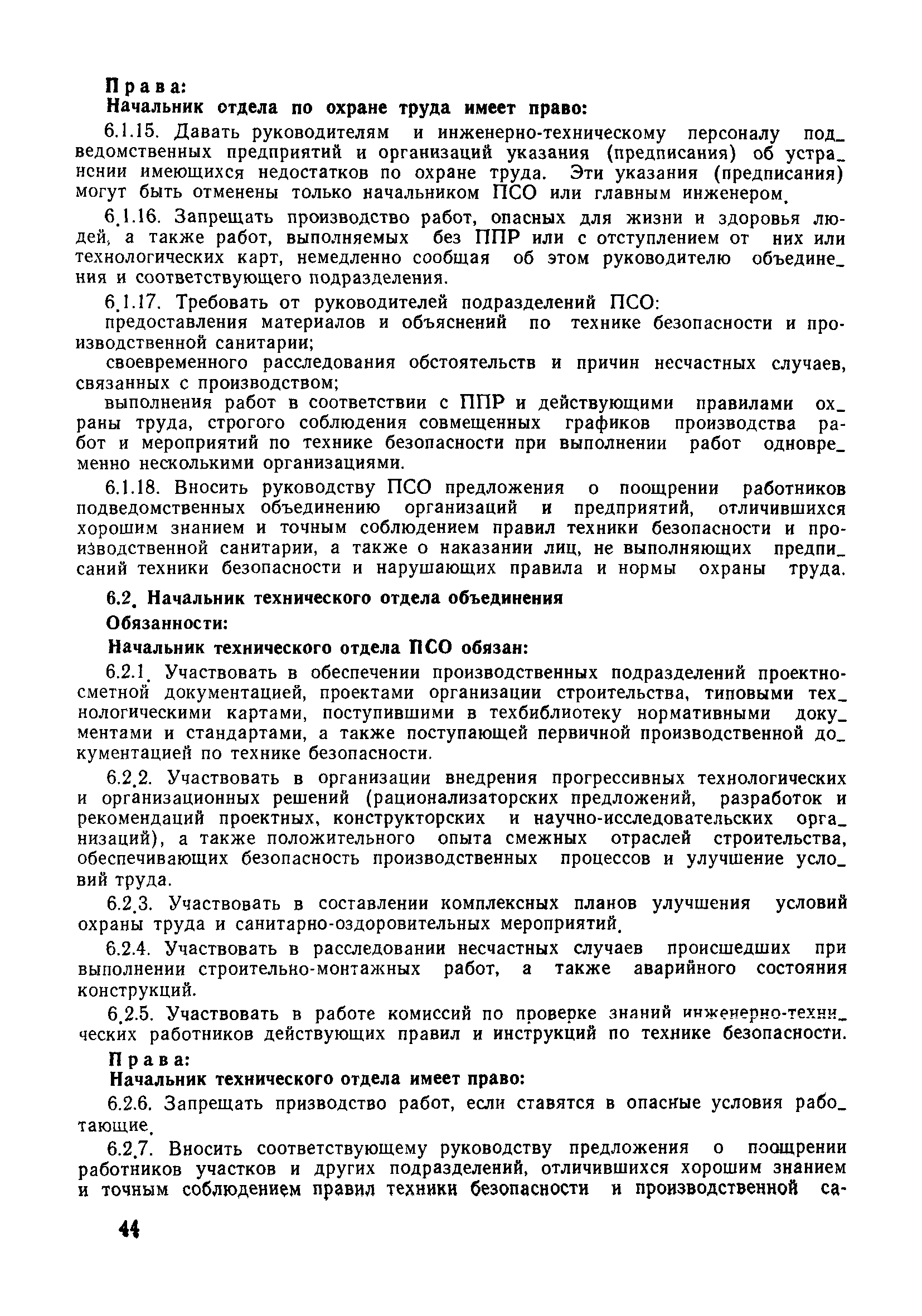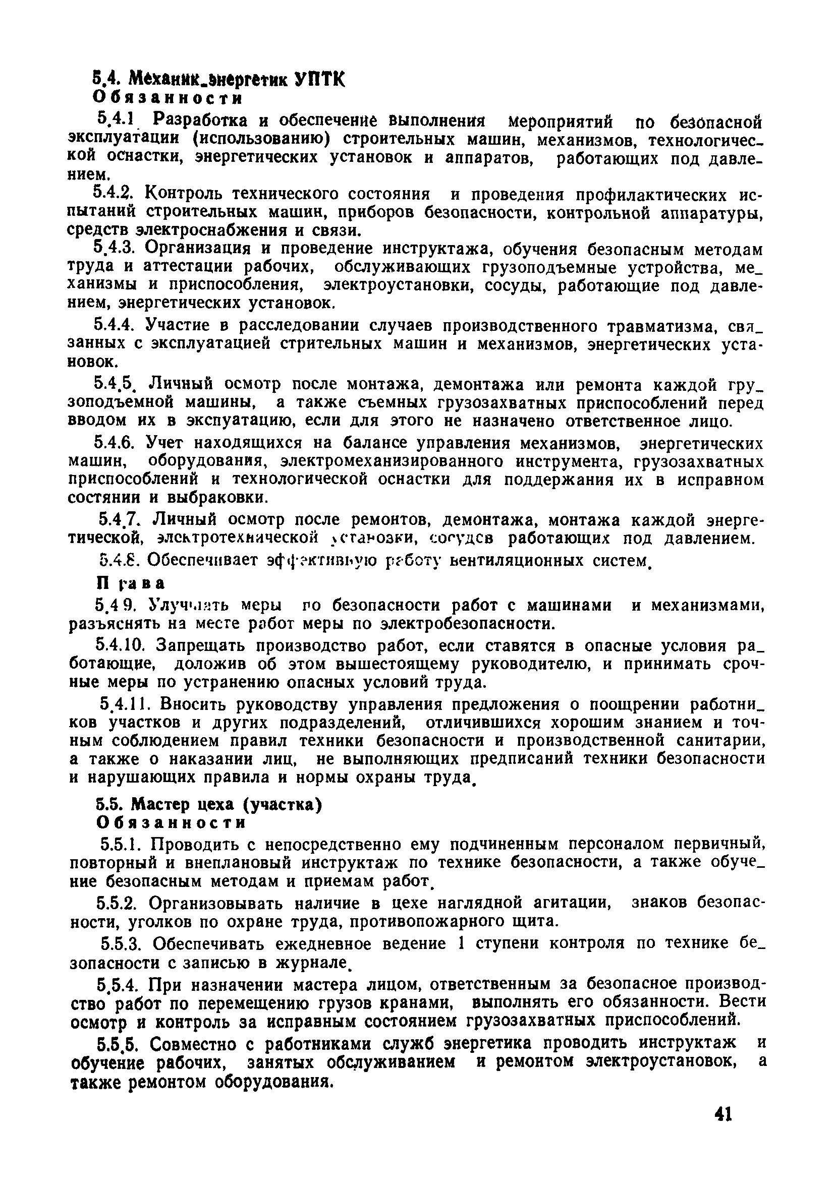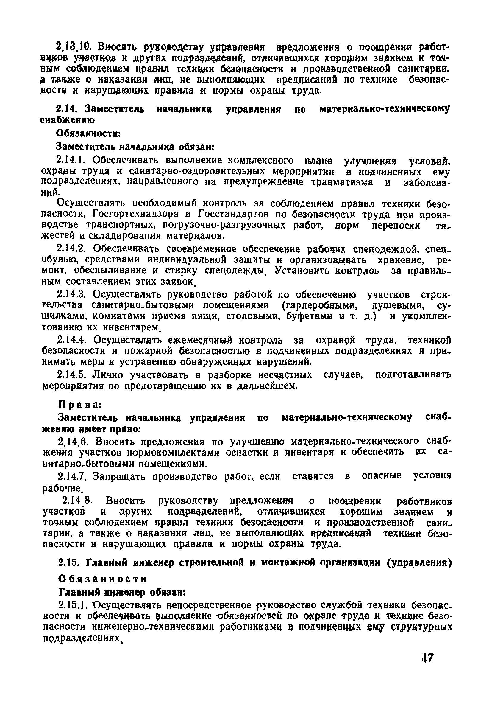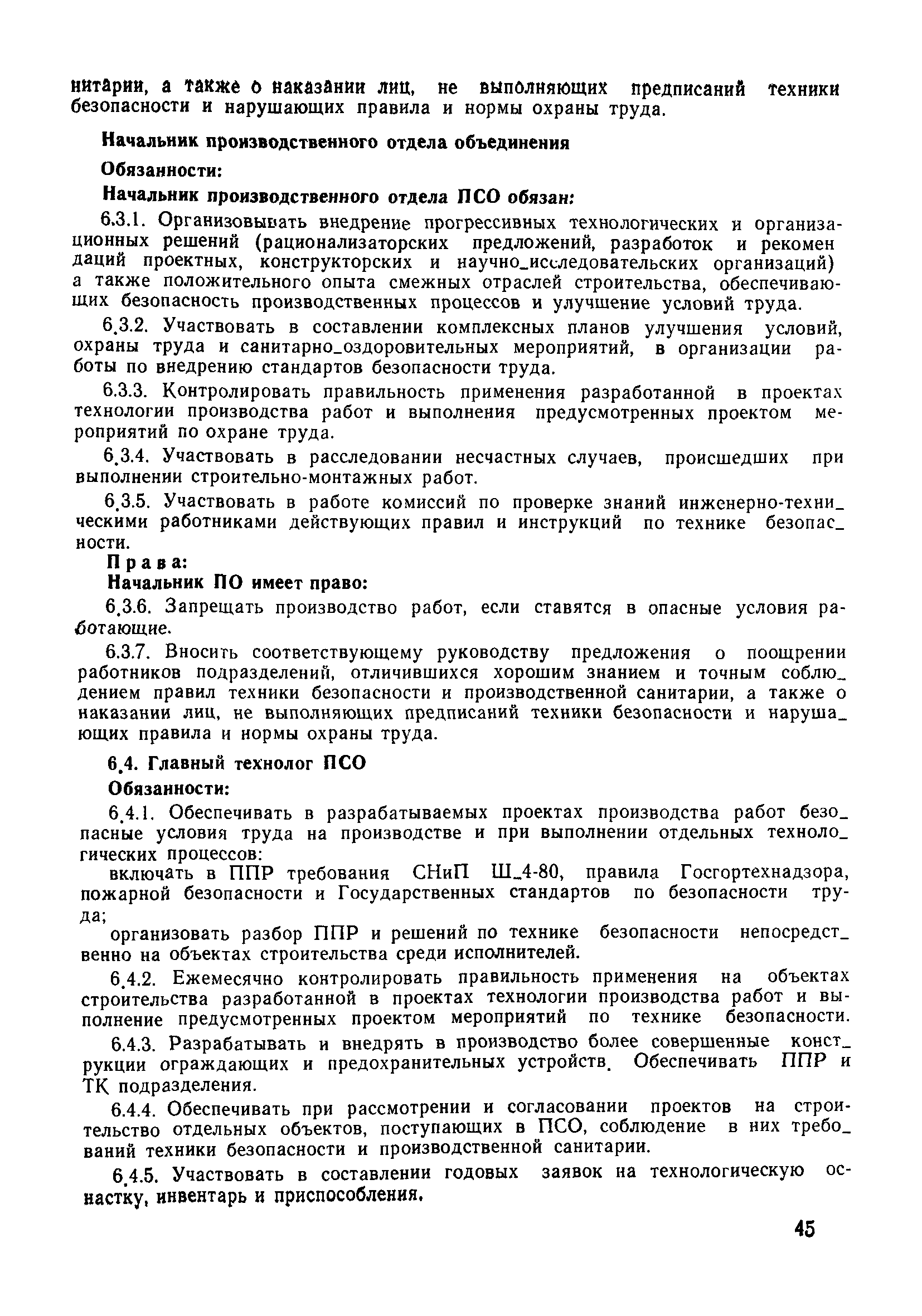 | Оглавление: | 1 Общие положения 1.1 Дисциплинарная ответственность 1.2 Материальная и уголовная ответственность 2 Строительные и монтажные организации 2.1 Бригадир (сменный бригадир) 2.2 Мастер (прораб) 2.3 Старший прораб (начальник участка) 2.4 Линейный механик 2.5 Инженер по охране труда управления 2.6 Главный механик управления 2.7 Энергетик управления (лицо ответственное за энергохозяйство) 2.8 Начальник производственно-технического отдела управления 2.9 Начальник отдела кадров 2.10 Главный бухгалтер 2.11 Начальник отдела организации труда и заработной платы 2.12 Заместитель начальника управления по производству 2.13. Заместитель начальника строительной и монтажной организации (управления) по кадрам м быту 2.14. Заместитель начальника управления по материально-техническому снабжению 2.15. Главный инженер строительной и монтажной организации (управления) 2.16. Начальник строительной и монтажной организации (управления) 3 Домостроительный комбинат 3.1. Начальник отдела техники безопасности ДСI( (старший инженер) 3.2. Начальник производственного отдела ДСК 3.3. Главный технолог ДСК 3.4. Главный энергетик ДСК 3.5. Главный механик ДСК 3.6. Главный строитель ДСК 3.7. Начальник отдела кадров ДСК 3.8. Главный бухгалтер ДСК 3.9. Начальник отдела организации труда и заработной платы 3.10. Начальник отдела снабжения ДСК 3.11. Заместитель начальника ДСК по кадрам и быту 3.12. Заместитель начальника по производству 3.13. Главный инженер ДСК 3.14. Начальник ДСК 3.15. Бригадир (сменный бригадир) 3.16. Мастер (прораб) строительного участка ДСК 3.17. Механик 3.18. Старший прораб (начальник участка) 3.19. Начальник строительно-монтажного потока 3.20 Мастер цеха ДСК 3.21. Начальник цеха 3.22. Начальник ОТК предприятия 4 Управление проектных работ (УПР) 4.1. Начальник управления 4.2. Главный инженер УПР 5 Управление производственно-технологической комплектации 5.1. Начальник УПТК 5.2. Главный инженер УПТК 5.3. Заместитель начальник УПТК 5.4. Механик. энергетик УПТК 5.5. Мастер цеха (участка) 6 Проектно-строительное объединение 6.1. Начальник отдела по охране труда объединения 6.2. Начальник технического отдела объединения 6.3. Начальник производственного отдела объединения 6.4. Главный технолог ПСО 6.5. Главный энергетик ПСО 6.6. Главный механик ПСО 6.7. Главный бухгалтер объединения 6.8. Начальник отдела организации труда и заработной платы объединения 6.9. Заместитель начальника по кадрам и быту объединения 6.10. Заместитель начальника ПСО по материально-техническому снабжению 6.11. Заместитель начальника ПСО по производству, строительству, специальным работам 6.12. Заместитель главного инженера ПСО 6.13 Начальник планового отдела 6.14. Начальник отдела кадров ПСО 6.15. Главный инженер объединения 6.16. Начальник объединения 7 Дополнительные обязанности по созданию безопасных условий труда при эксплуатации грузоподъемных кранов (Лицо, ответственное по надзору за безопасной эксплуатацией грузоподъемных машин) 7.1. Общие положения 7.2. Обязанности инженерно-технического работника по надзору за грузоподъемными машинами 7.3. Права инженерно-технического работника по надзору за грузоподъемными механизмами |