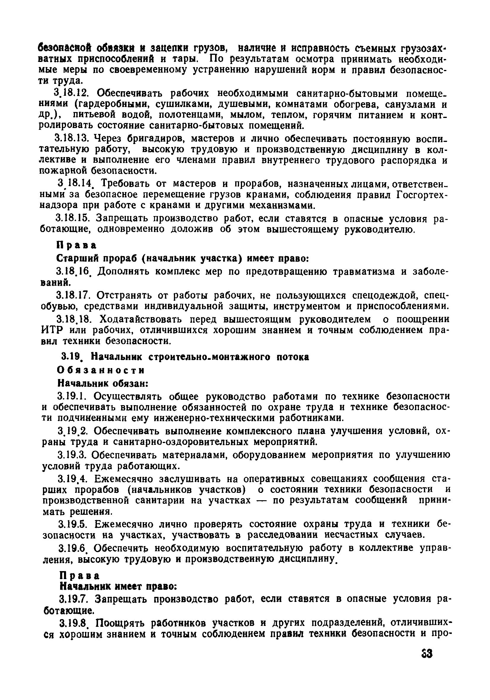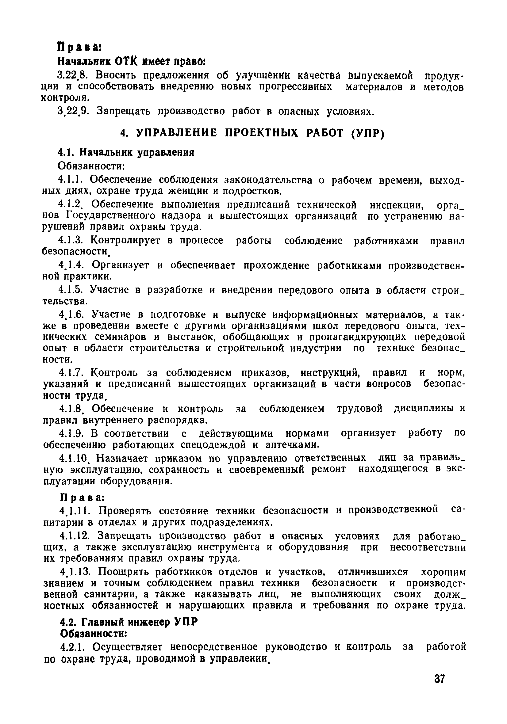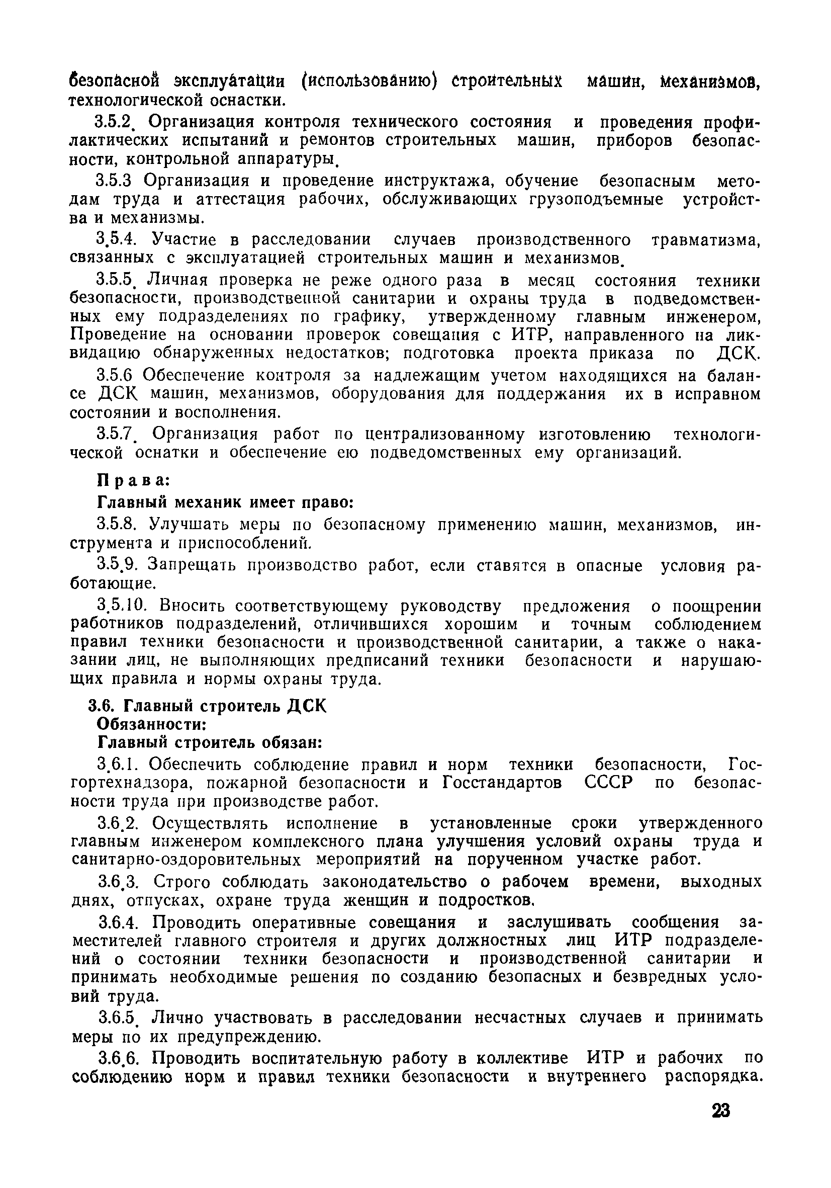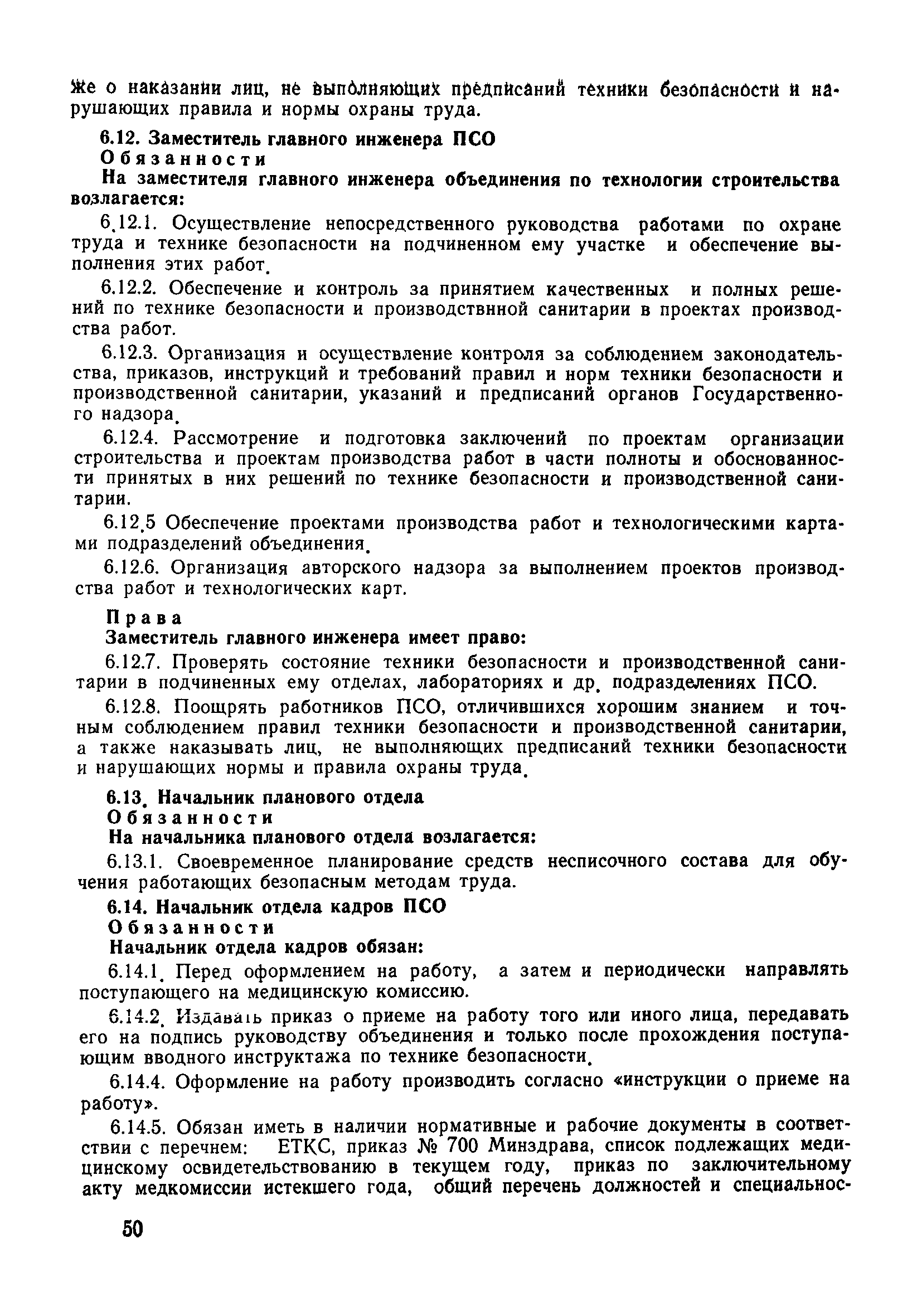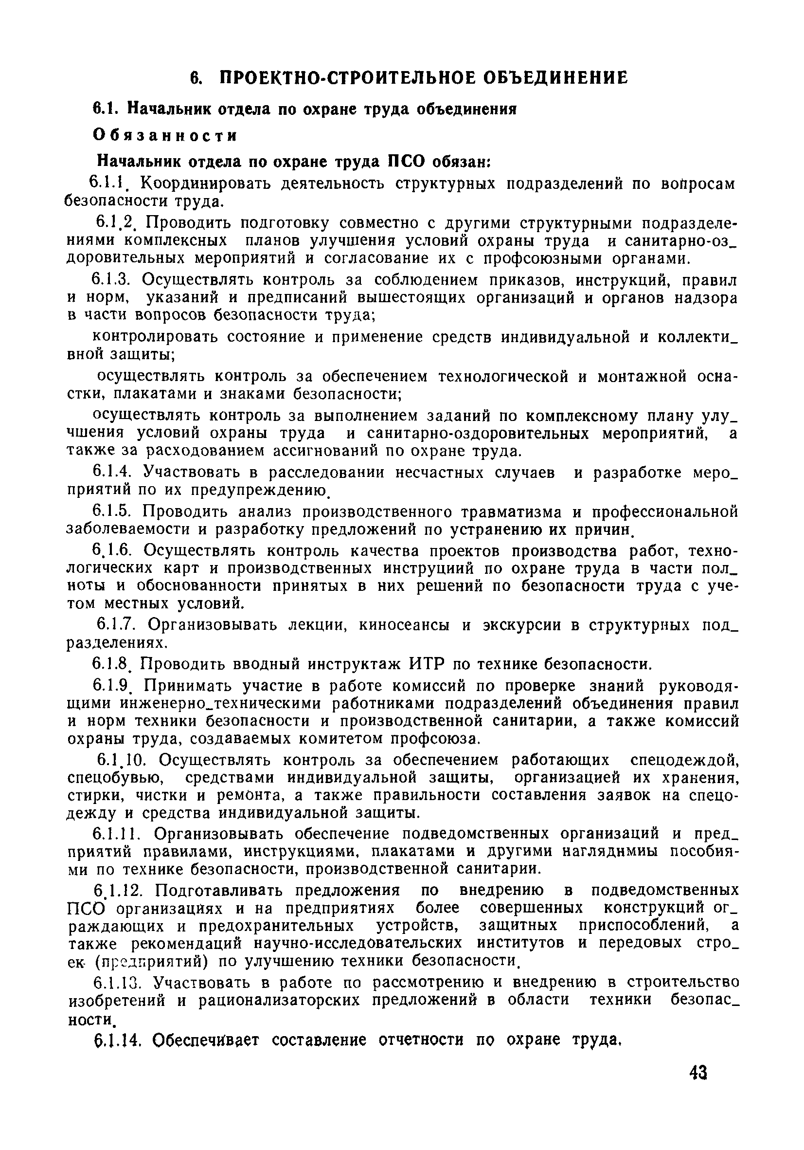| Оглавление: | 1 Общие положения 1.1 Дисциплинарная ответственность 1.2 Материальная и уголовная ответственность 2 Строительные и монтажные организации 2.1 Бригадир (сменный бригадир) 2.2 Мастер (прораб) 2.3 Старший прораб (начальник участка) 2.4 Линейный механик 2.5 Инженер по охране труда управления 2.6 Главный механик управления 2.7 Энергетик управления (лицо ответственное за энергохозяйство) 2.8 Начальник производственно-технического отдела управления 2.9 Начальник отдела кадров 2.10 Главный бухгалтер 2.11 Начальник отдела организации труда и заработной платы 2.12 Заместитель начальника управления по производству 2.13. Заместитель начальника строительной и монтажной организации (управления) по кадрам м быту 2.14. Заместитель начальника управления по материально-техническому снабжению 2.15. Главный инженер строительной и монтажной организации (управления) 2.16. Начальник строительной и монтажной организации (управления) 3 Домостроительный комбинат 3.1. Начальник отдела техники безопасности ДСI( (старший инженер) 3.2. Начальник производственного отдела ДСК 3.3. Главный технолог ДСК 3.4. Главный энергетик ДСК 3.5. Главный механик ДСК 3.6. Главный строитель ДСК 3.7. Начальник отдела кадров ДСК 3.8. Главный бухгалтер ДСК 3.9. Начальник отдела организации труда и заработной платы 3.10. Начальник отдела снабжения ДСК 3.11. Заместитель начальника ДСК по кадрам и быту 3.12. Заместитель начальника по производству 3.13. Главный инженер ДСК 3.14. Начальник ДСК 3.15. Бригадир (сменный бригадир) 3.16. Мастер (прораб) строительного участка ДСК 3.17. Механик 3.18. Старший прораб (начальник участка) 3.19. Начальник строительно-монтажного потока 3.20 Мастер цеха ДСК 3.21. Начальник цеха 3.22. Начальник ОТК предприятия 4 Управление проектных работ (УПР) 4.1. Начальник управления 4.2. Главный инженер УПР 5 Управление производственно-технологической комплектации 5.1. Начальник УПТК 5.2. Главный инженер УПТК 5.3. Заместитель начальник УПТК 5.4. Механик. энергетик УПТК 5.5. Мастер цеха (участка) 6 Проектно-строительное объединение 6.1. Начальник отдела по охране труда объединения 6.2. Начальник технического отдела объединения 6.3. Начальник производственного отдела объединения 6.4. Главный технолог ПСО 6.5. Главный энергетик ПСО 6.6. Главный механик ПСО 6.7. Главный бухгалтер объединения 6.8. Начальник отдела организации труда и заработной платы объединения 6.9. Заместитель начальника по кадрам и быту объединения 6.10. Заместитель начальника ПСО по материально-техническому снабжению 6.11. Заместитель начальника ПСО по производству, строительству, специальным работам 6.12. Заместитель главного инженера ПСО 6.13 Начальник планового отдела 6.14. Начальник отдела кадров ПСО 6.15. Главный инженер объединения 6.16. Начальник объединения 7 Дополнительные обязанности по созданию безопасных условий труда при эксплуатации грузоподъемных кранов (Лицо, ответственное по надзору за безопасной эксплуатацией грузоподъемных машин) 7.1. Общие положения 7.2. Обязанности инженерно-технического работника по надзору за грузоподъемными машинами 7.3. Права инженерно-технического работника по надзору за грузоподъемными механизмами |