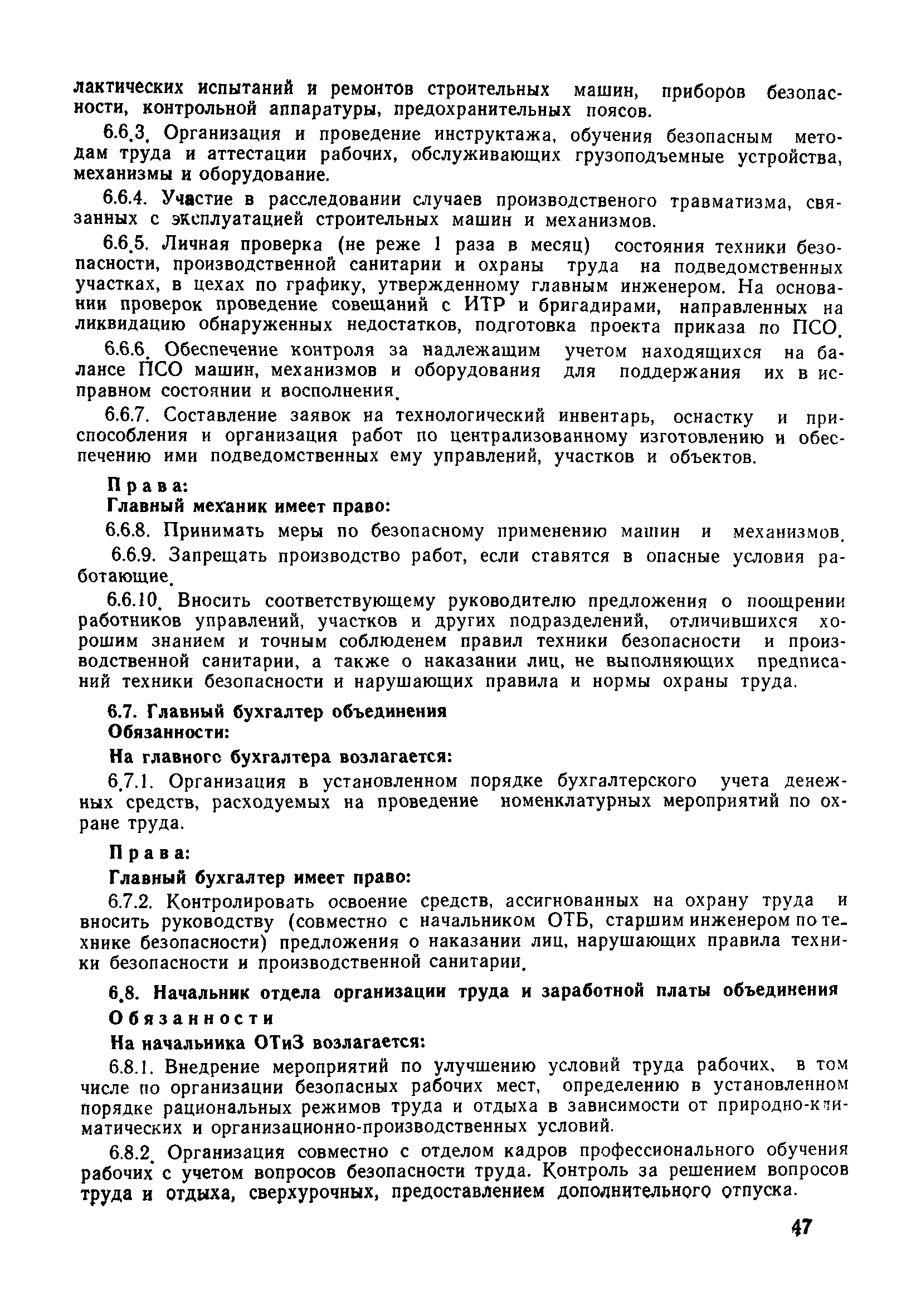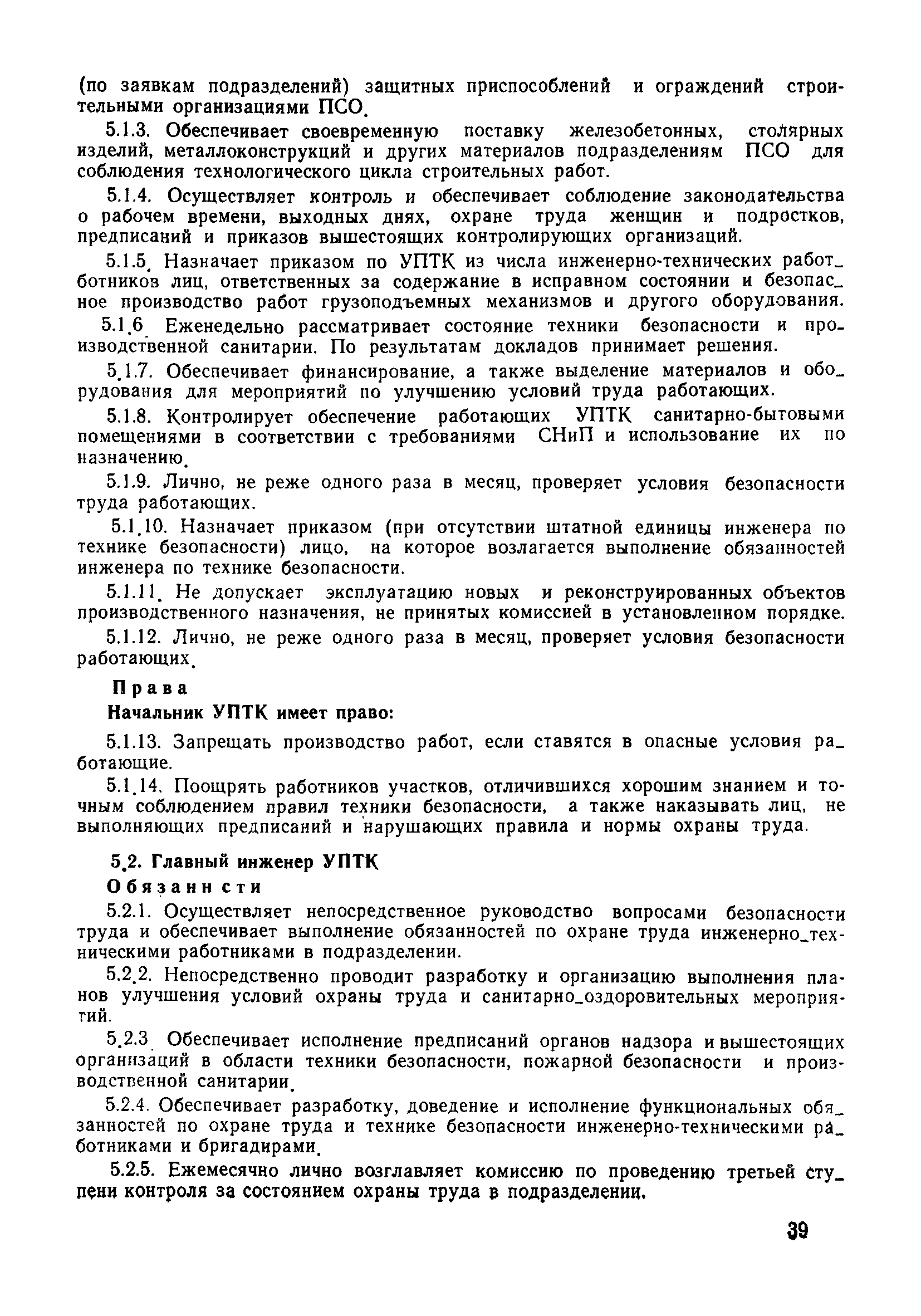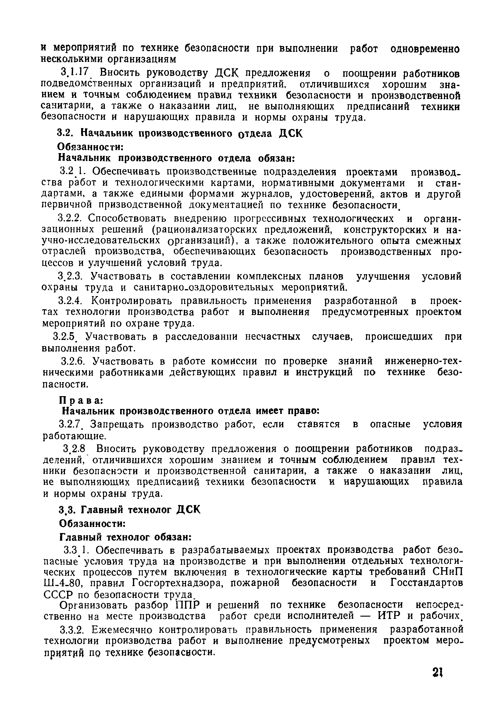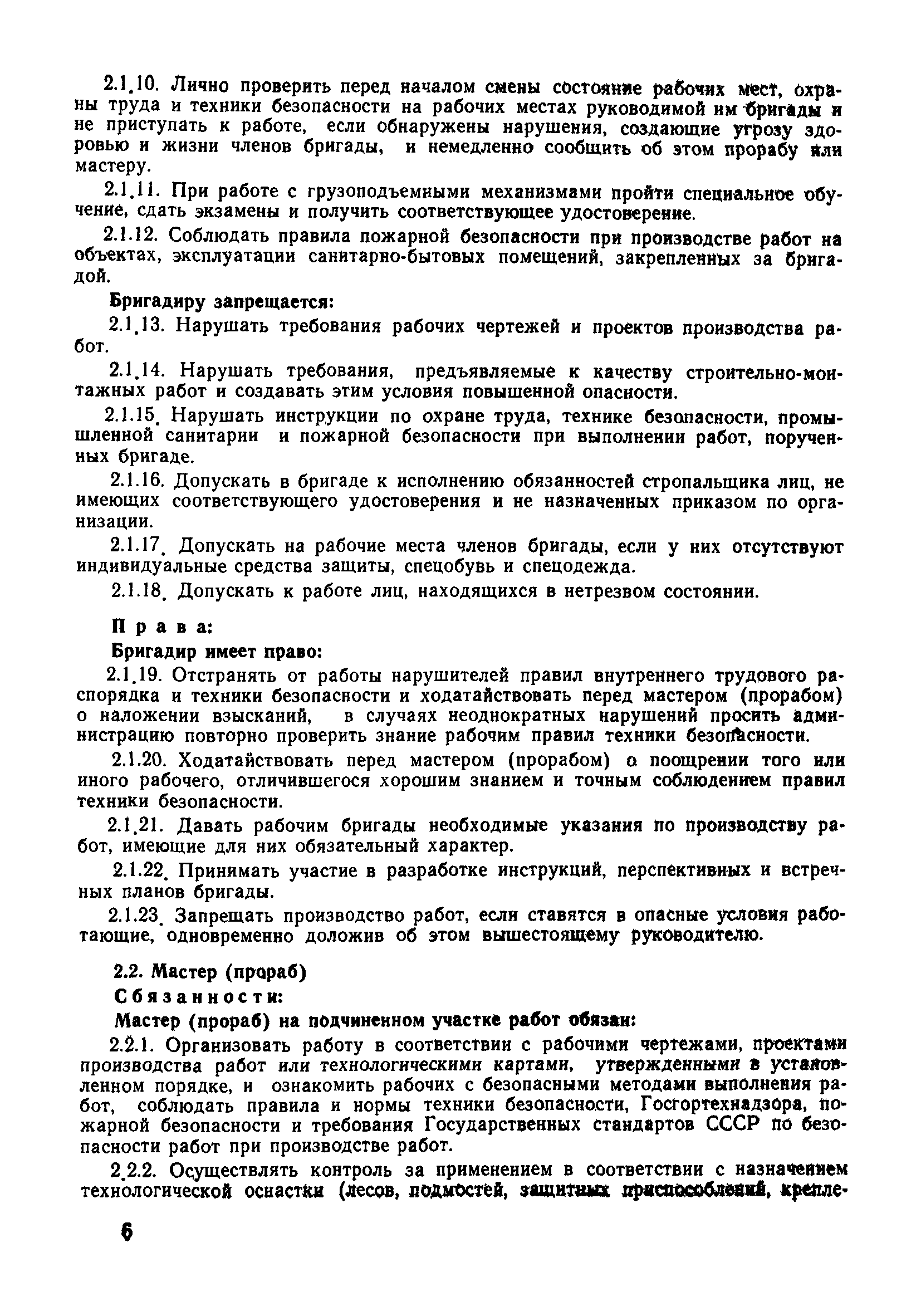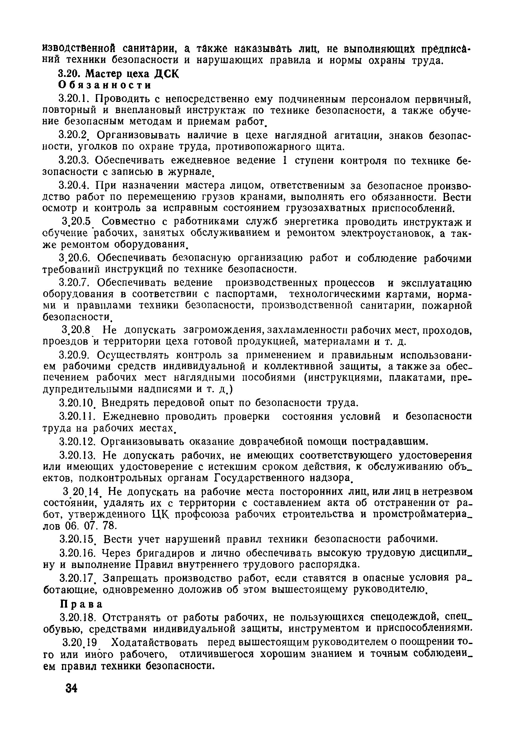 | Оглавление: | 1 Общие положения 1.1 Дисциплинарная ответственность 1.2 Материальная и уголовная ответственность 2 Строительные и монтажные организации 2.1 Бригадир (сменный бригадир) 2.2 Мастер (прораб) 2.3 Старший прораб (начальник участка) 2.4 Линейный механик 2.5 Инженер по охране труда управления 2.6 Главный механик управления 2.7 Энергетик управления (лицо ответственное за энергохозяйство) 2.8 Начальник производственно-технического отдела управления 2.9 Начальник отдела кадров 2.10 Главный бухгалтер 2.11 Начальник отдела организации труда и заработной платы 2.12 Заместитель начальника управления по производству 2.13. Заместитель начальника строительной и монтажной организации (управления) по кадрам м быту 2.14. Заместитель начальника управления по материально-техническому снабжению 2.15. Главный инженер строительной и монтажной организации (управления) 2.16. Начальник строительной и монтажной организации (управления) 3 Домостроительный комбинат 3.1. Начальник отдела техники безопасности ДСI( (старший инженер) 3.2. Начальник производственного отдела ДСК 3.3. Главный технолог ДСК 3.4. Главный энергетик ДСК 3.5. Главный механик ДСК 3.6. Главный строитель ДСК 3.7. Начальник отдела кадров ДСК 3.8. Главный бухгалтер ДСК 3.9. Начальник отдела организации труда и заработной платы 3.10. Начальник отдела снабжения ДСК 3.11. Заместитель начальника ДСК по кадрам и быту 3.12. Заместитель начальника по производству 3.13. Главный инженер ДСК 3.14. Начальник ДСК 3.15. Бригадир (сменный бригадир) 3.16. Мастер (прораб) строительного участка ДСК 3.17. Механик 3.18. Старший прораб (начальник участка) 3.19. Начальник строительно-монтажного потока 3.20 Мастер цеха ДСК 3.21. Начальник цеха 3.22. Начальник ОТК предприятия 4 Управление проектных работ (УПР) 4.1. Начальник управления 4.2. Главный инженер УПР 5 Управление производственно-технологической комплектации 5.1. Начальник УПТК 5.2. Главный инженер УПТК 5.3. Заместитель начальник УПТК 5.4. Механик. энергетик УПТК 5.5. Мастер цеха (участка) 6 Проектно-строительное объединение 6.1. Начальник отдела по охране труда объединения 6.2. Начальник технического отдела объединения 6.3. Начальник производственного отдела объединения 6.4. Главный технолог ПСО 6.5. Главный энергетик ПСО 6.6. Главный механик ПСО 6.7. Главный бухгалтер объединения 6.8. Начальник отдела организации труда и заработной платы объединения 6.9. Заместитель начальника по кадрам и быту объединения 6.10. Заместитель начальника ПСО по материально-техническому снабжению 6.11. Заместитель начальника ПСО по производству, строительству, специальным работам 6.12. Заместитель главного инженера ПСО 6.13 Начальник планового отдела 6.14. Начальник отдела кадров ПСО 6.15. Главный инженер объединения 6.16. Начальник объединения 7 Дополнительные обязанности по созданию безопасных условий труда при эксплуатации грузоподъемных кранов (Лицо, ответственное по надзору за безопасной эксплуатацией грузоподъемных машин) 7.1. Общие положения 7.2. Обязанности инженерно-технического работника по надзору за грузоподъемными машинами 7.3. Права инженерно-технического работника по надзору за грузоподъемными механизмами |