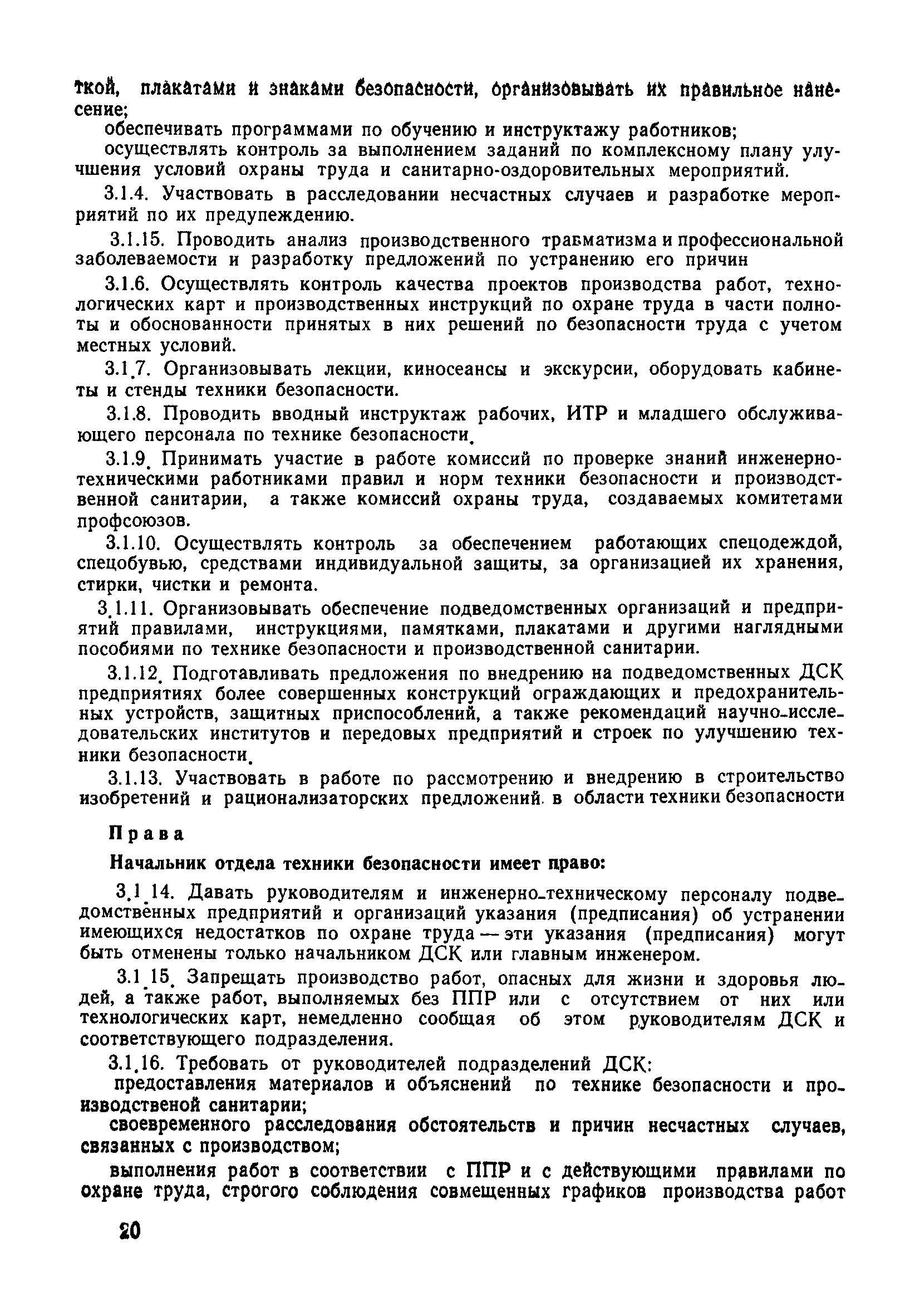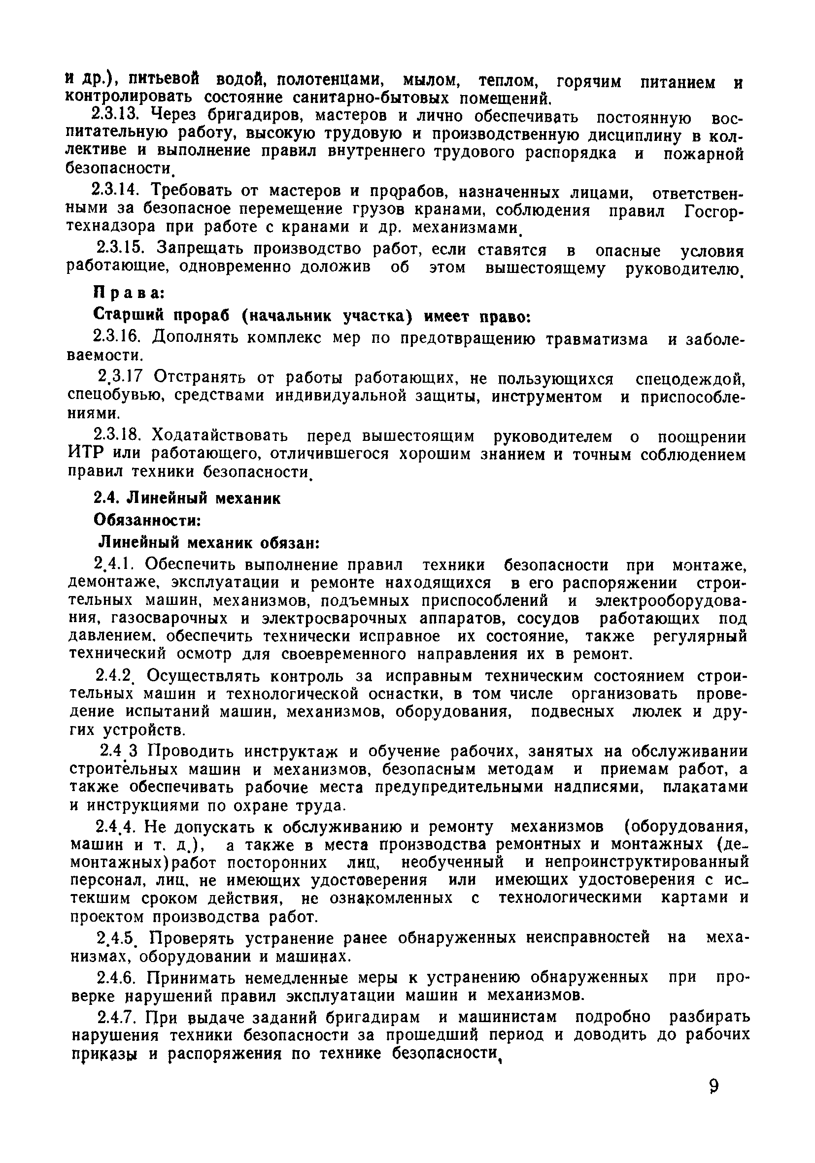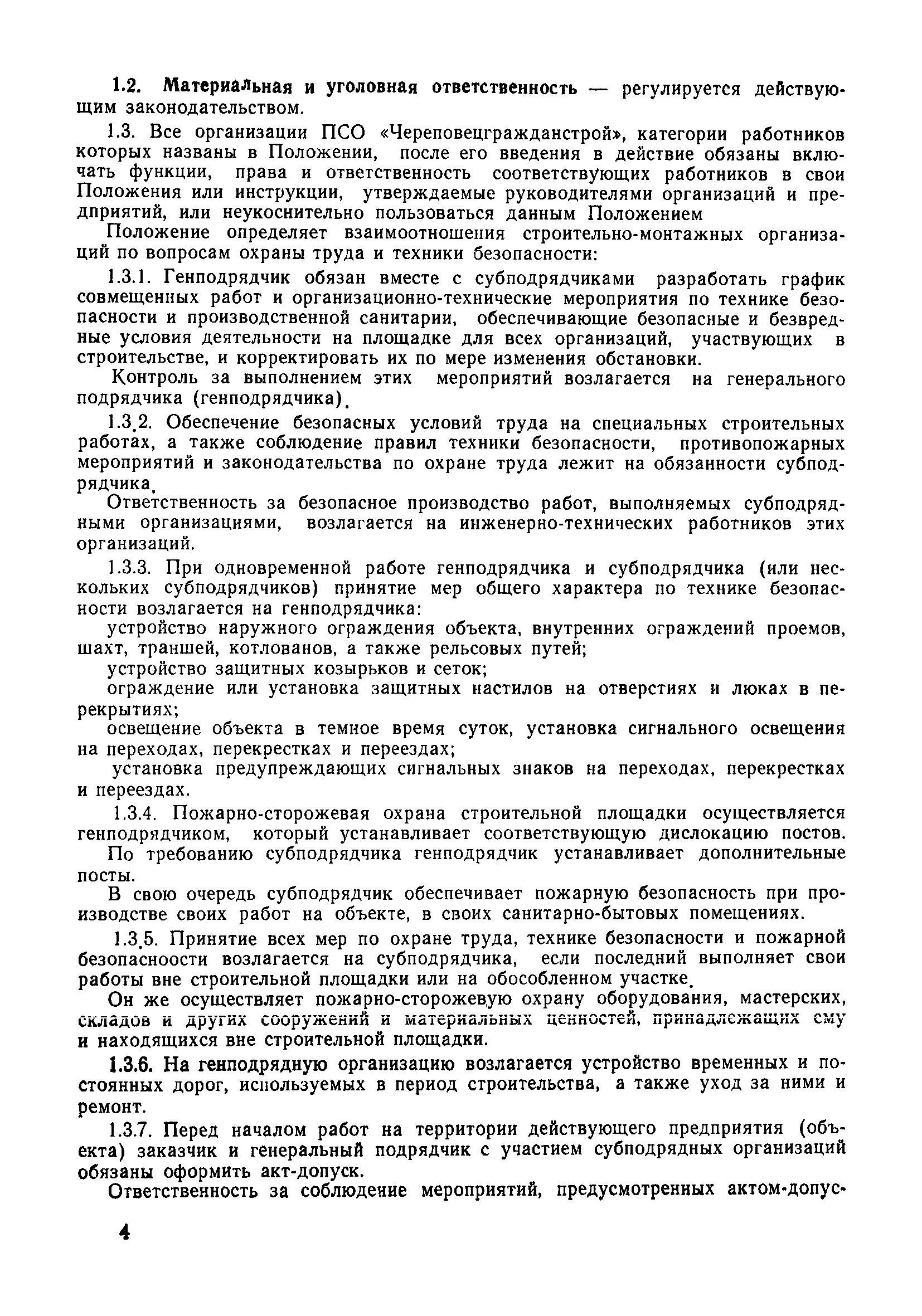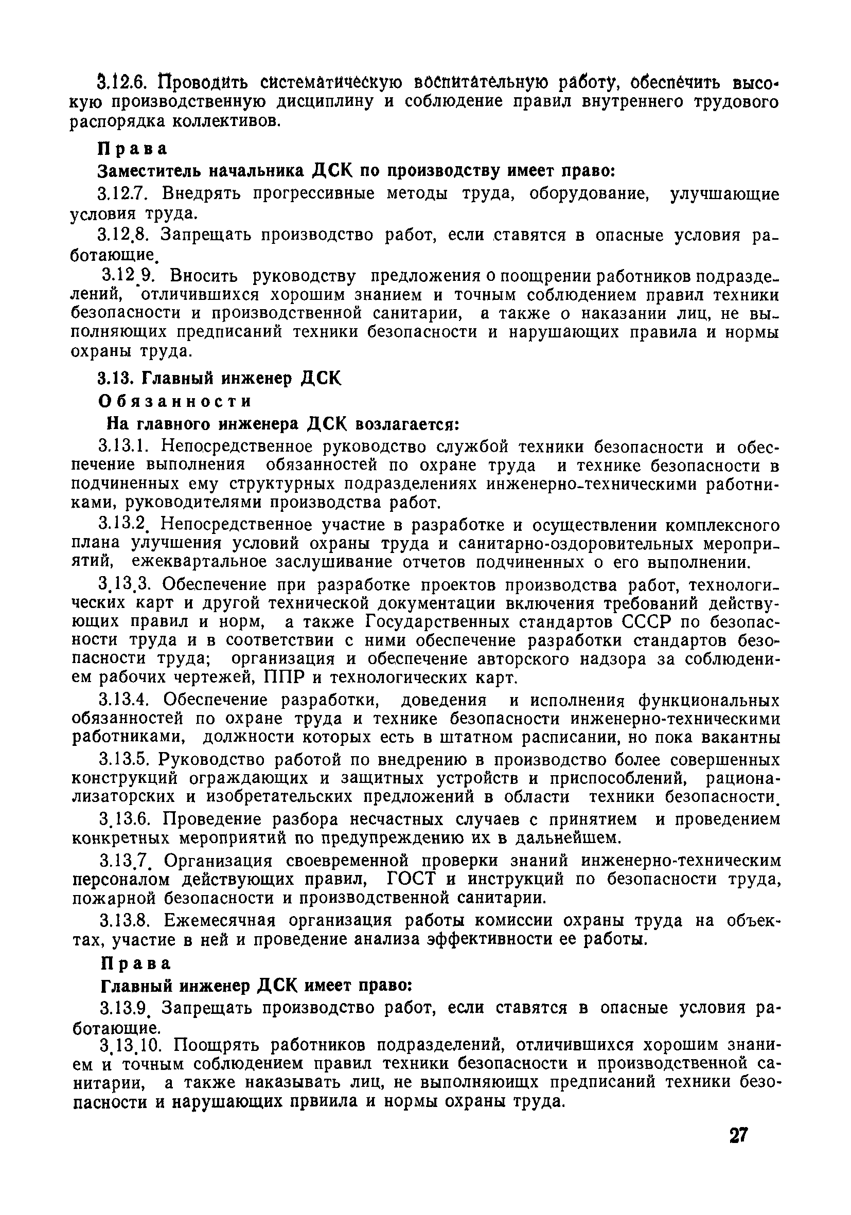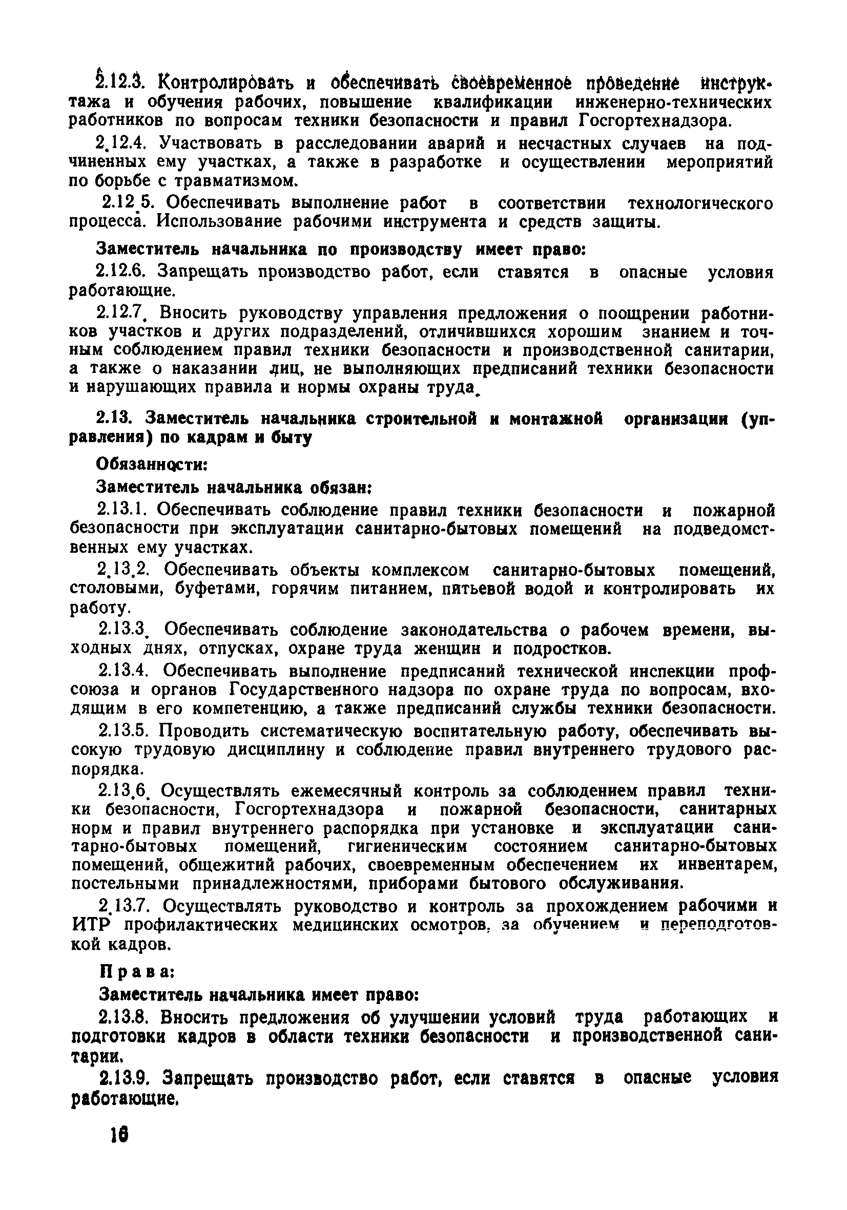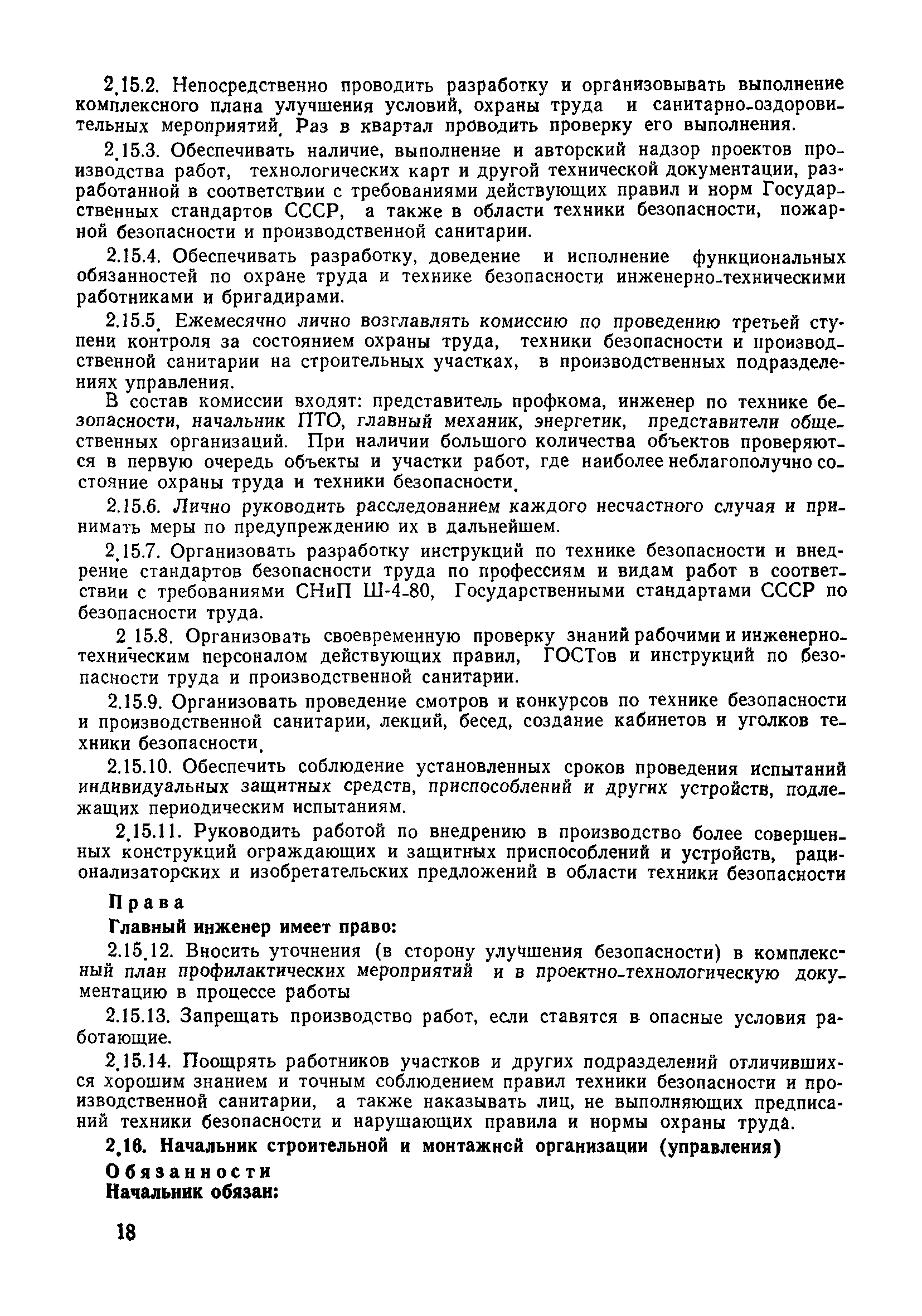 | Оглавление: | 1 Общие положения 1.1 Дисциплинарная ответственность 1.2 Материальная и уголовная ответственность 2 Строительные и монтажные организации 2.1 Бригадир (сменный бригадир) 2.2 Мастер (прораб) 2.3 Старший прораб (начальник участка) 2.4 Линейный механик 2.5 Инженер по охране труда управления 2.6 Главный механик управления 2.7 Энергетик управления (лицо ответственное за энергохозяйство) 2.8 Начальник производственно-технического отдела управления 2.9 Начальник отдела кадров 2.10 Главный бухгалтер 2.11 Начальник отдела организации труда и заработной платы 2.12 Заместитель начальника управления по производству 2.13. Заместитель начальника строительной и монтажной организации (управления) по кадрам м быту 2.14. Заместитель начальника управления по материально-техническому снабжению 2.15. Главный инженер строительной и монтажной организации (управления) 2.16. Начальник строительной и монтажной организации (управления) 3 Домостроительный комбинат 3.1. Начальник отдела техники безопасности ДСI( (старший инженер) 3.2. Начальник производственного отдела ДСК 3.3. Главный технолог ДСК 3.4. Главный энергетик ДСК 3.5. Главный механик ДСК 3.6. Главный строитель ДСК 3.7. Начальник отдела кадров ДСК 3.8. Главный бухгалтер ДСК 3.9. Начальник отдела организации труда и заработной платы 3.10. Начальник отдела снабжения ДСК 3.11. Заместитель начальника ДСК по кадрам и быту 3.12. Заместитель начальника по производству 3.13. Главный инженер ДСК 3.14. Начальник ДСК 3.15. Бригадир (сменный бригадир) 3.16. Мастер (прораб) строительного участка ДСК 3.17. Механик 3.18. Старший прораб (начальник участка) 3.19. Начальник строительно-монтажного потока 3.20 Мастер цеха ДСК 3.21. Начальник цеха 3.22. Начальник ОТК предприятия 4 Управление проектных работ (УПР) 4.1. Начальник управления 4.2. Главный инженер УПР 5 Управление производственно-технологической комплектации 5.1. Начальник УПТК 5.2. Главный инженер УПТК 5.3. Заместитель начальник УПТК 5.4. Механик. энергетик УПТК 5.5. Мастер цеха (участка) 6 Проектно-строительное объединение 6.1. Начальник отдела по охране труда объединения 6.2. Начальник технического отдела объединения 6.3. Начальник производственного отдела объединения 6.4. Главный технолог ПСО 6.5. Главный энергетик ПСО 6.6. Главный механик ПСО 6.7. Главный бухгалтер объединения 6.8. Начальник отдела организации труда и заработной платы объединения 6.9. Заместитель начальника по кадрам и быту объединения 6.10. Заместитель начальника ПСО по материально-техническому снабжению 6.11. Заместитель начальника ПСО по производству, строительству, специальным работам 6.12. Заместитель главного инженера ПСО 6.13 Начальник планового отдела 6.14. Начальник отдела кадров ПСО 6.15. Главный инженер объединения 6.16. Начальник объединения 7 Дополнительные обязанности по созданию безопасных условий труда при эксплуатации грузоподъемных кранов (Лицо, ответственное по надзору за безопасной эксплуатацией грузоподъемных машин) 7.1. Общие положения 7.2. Обязанности инженерно-технического работника по надзору за грузоподъемными машинами 7.3. Права инженерно-технического работника по надзору за грузоподъемными механизмами |