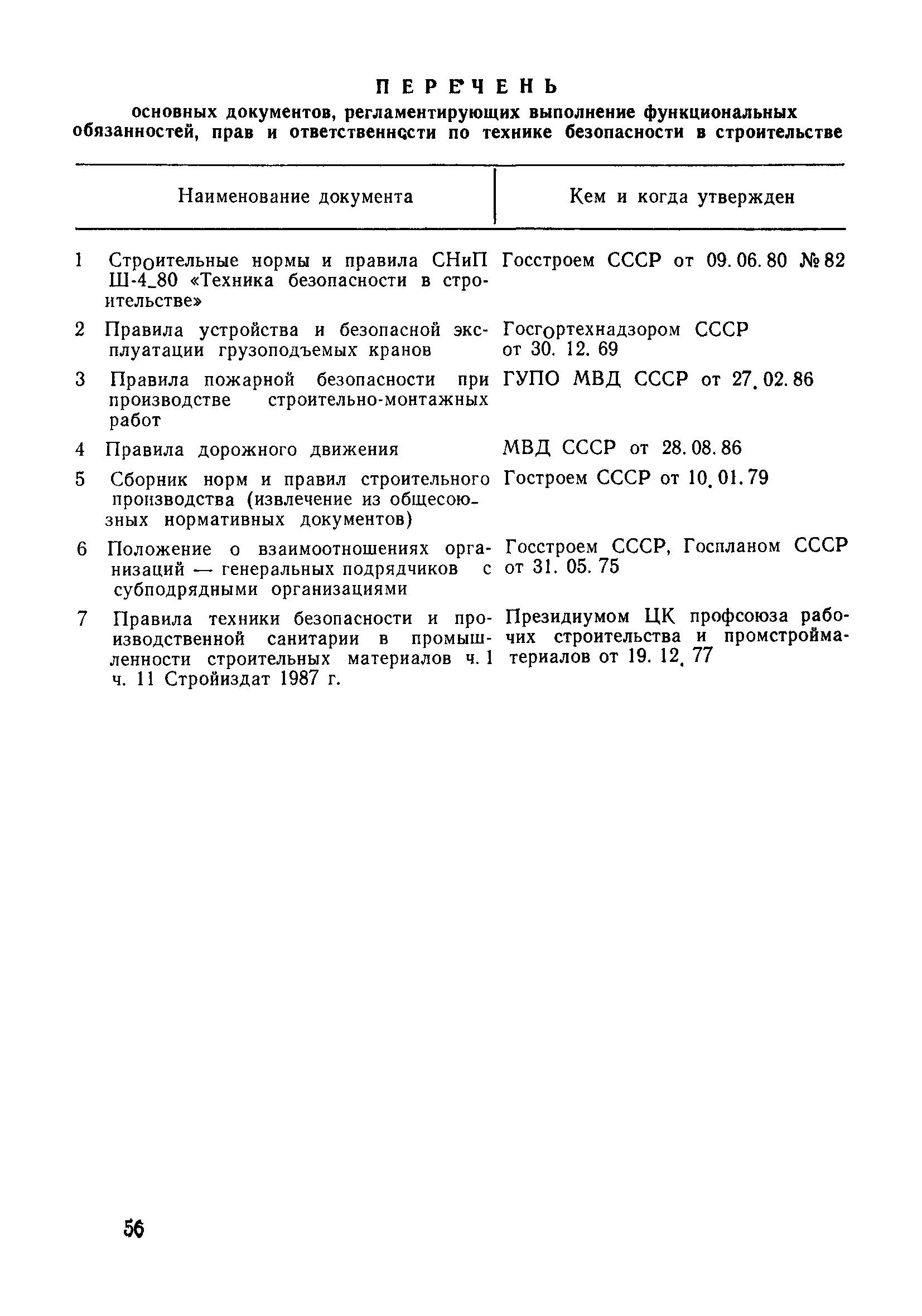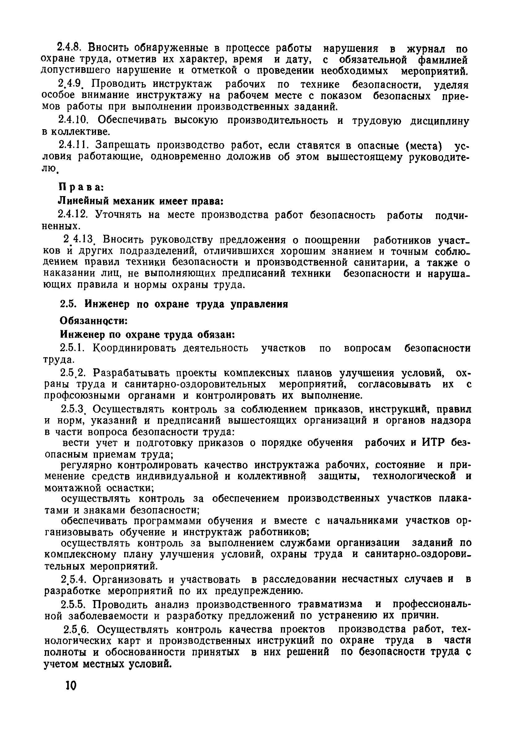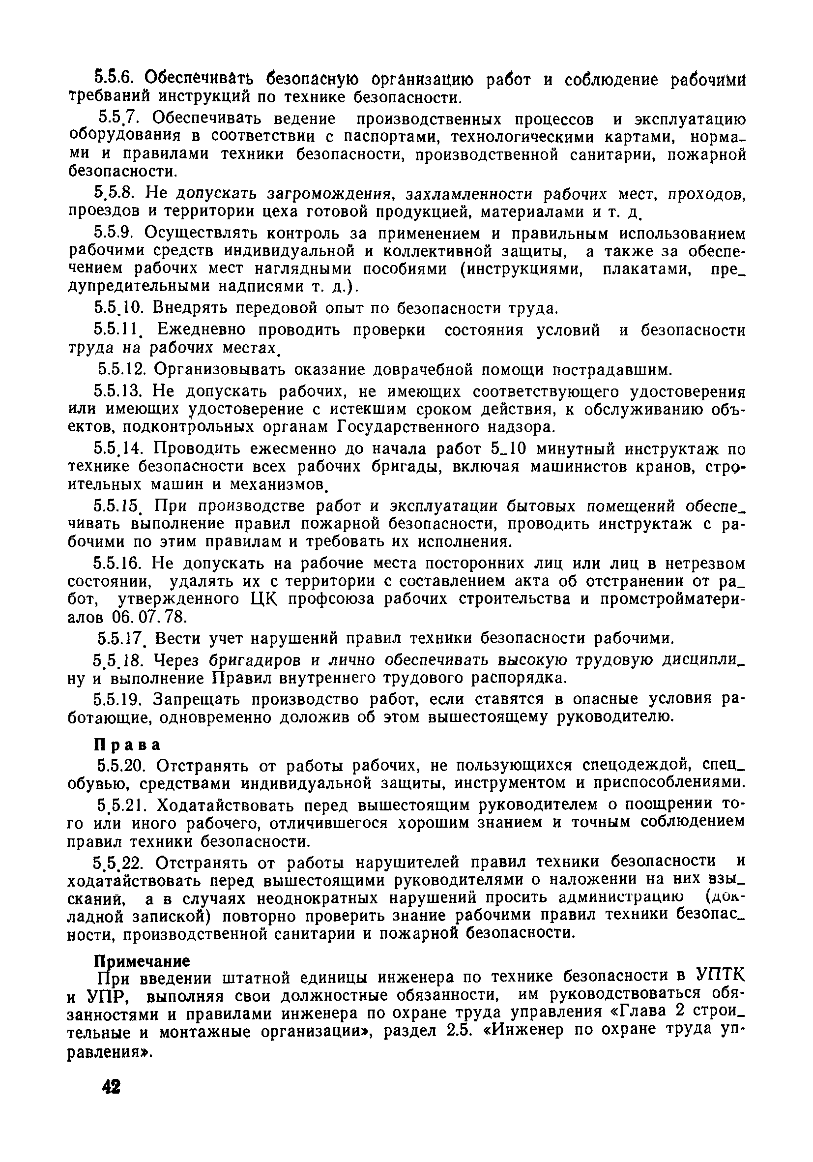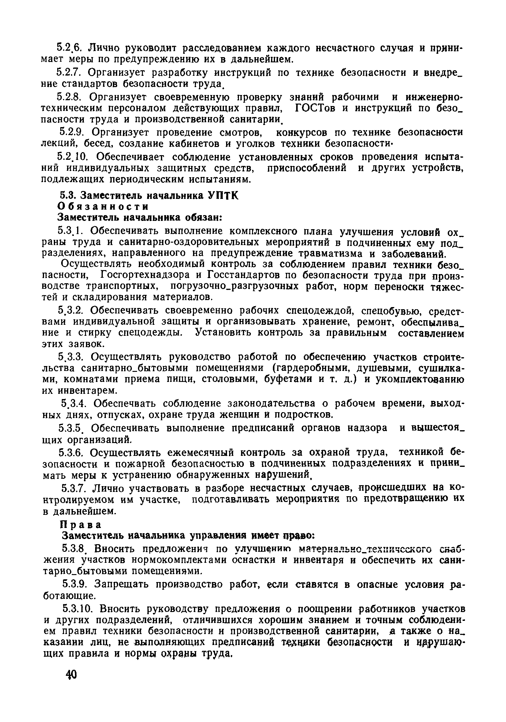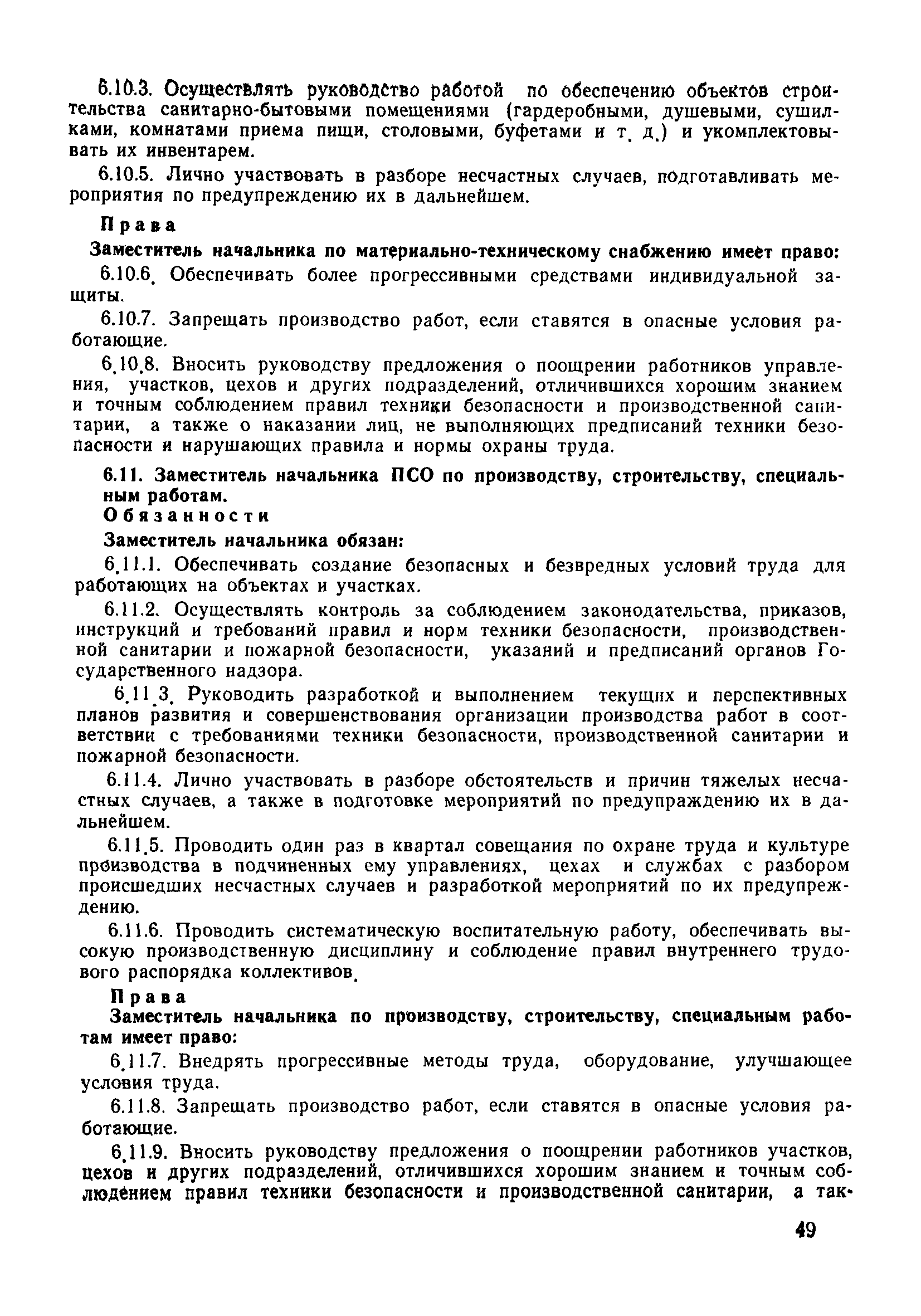 | Оглавление: | 1 Общие положения 1.1 Дисциплинарная ответственность 1.2 Материальная и уголовная ответственность 2 Строительные и монтажные организации 2.1 Бригадир (сменный бригадир) 2.2 Мастер (прораб) 2.3 Старший прораб (начальник участка) 2.4 Линейный механик 2.5 Инженер по охране труда управления 2.6 Главный механик управления 2.7 Энергетик управления (лицо ответственное за энергохозяйство) 2.8 Начальник производственно-технического отдела управления 2.9 Начальник отдела кадров 2.10 Главный бухгалтер 2.11 Начальник отдела организации труда и заработной платы 2.12 Заместитель начальника управления по производству 2.13. Заместитель начальника строительной и монтажной организации (управления) по кадрам м быту 2.14. Заместитель начальника управления по материально-техническому снабжению 2.15. Главный инженер строительной и монтажной организации (управления) 2.16. Начальник строительной и монтажной организации (управления) 3 Домостроительный комбинат 3.1. Начальник отдела техники безопасности ДСI( (старший инженер) 3.2. Начальник производственного отдела ДСК 3.3. Главный технолог ДСК 3.4. Главный энергетик ДСК 3.5. Главный механик ДСК 3.6. Главный строитель ДСК 3.7. Начальник отдела кадров ДСК 3.8. Главный бухгалтер ДСК 3.9. Начальник отдела организации труда и заработной платы 3.10. Начальник отдела снабжения ДСК 3.11. Заместитель начальника ДСК по кадрам и быту 3.12. Заместитель начальника по производству 3.13. Главный инженер ДСК 3.14. Начальник ДСК 3.15. Бригадир (сменный бригадир) 3.16. Мастер (прораб) строительного участка ДСК 3.17. Механик 3.18. Старший прораб (начальник участка) 3.19. Начальник строительно-монтажного потока 3.20 Мастер цеха ДСК 3.21. Начальник цеха 3.22. Начальник ОТК предприятия 4 Управление проектных работ (УПР) 4.1. Начальник управления 4.2. Главный инженер УПР 5 Управление производственно-технологической комплектации 5.1. Начальник УПТК 5.2. Главный инженер УПТК 5.3. Заместитель начальник УПТК 5.4. Механик. энергетик УПТК 5.5. Мастер цеха (участка) 6 Проектно-строительное объединение 6.1. Начальник отдела по охране труда объединения 6.2. Начальник технического отдела объединения 6.3. Начальник производственного отдела объединения 6.4. Главный технолог ПСО 6.5. Главный энергетик ПСО 6.6. Главный механик ПСО 6.7. Главный бухгалтер объединения 6.8. Начальник отдела организации труда и заработной платы объединения 6.9. Заместитель начальника по кадрам и быту объединения 6.10. Заместитель начальника ПСО по материально-техническому снабжению 6.11. Заместитель начальника ПСО по производству, строительству, специальным работам 6.12. Заместитель главного инженера ПСО 6.13 Начальник планового отдела 6.14. Начальник отдела кадров ПСО 6.15. Главный инженер объединения 6.16. Начальник объединения 7 Дополнительные обязанности по созданию безопасных условий труда при эксплуатации грузоподъемных кранов (Лицо, ответственное по надзору за безопасной эксплуатацией грузоподъемных машин) 7.1. Общие положения 7.2. Обязанности инженерно-технического работника по надзору за грузоподъемными машинами 7.3. Права инженерно-технического работника по надзору за грузоподъемными механизмами |