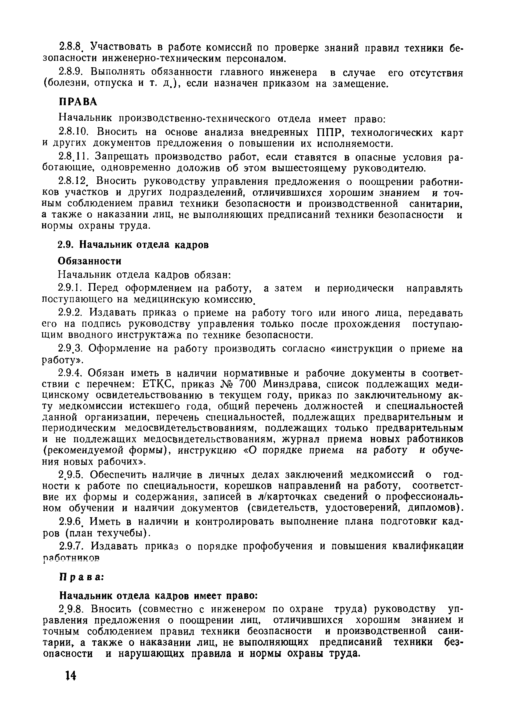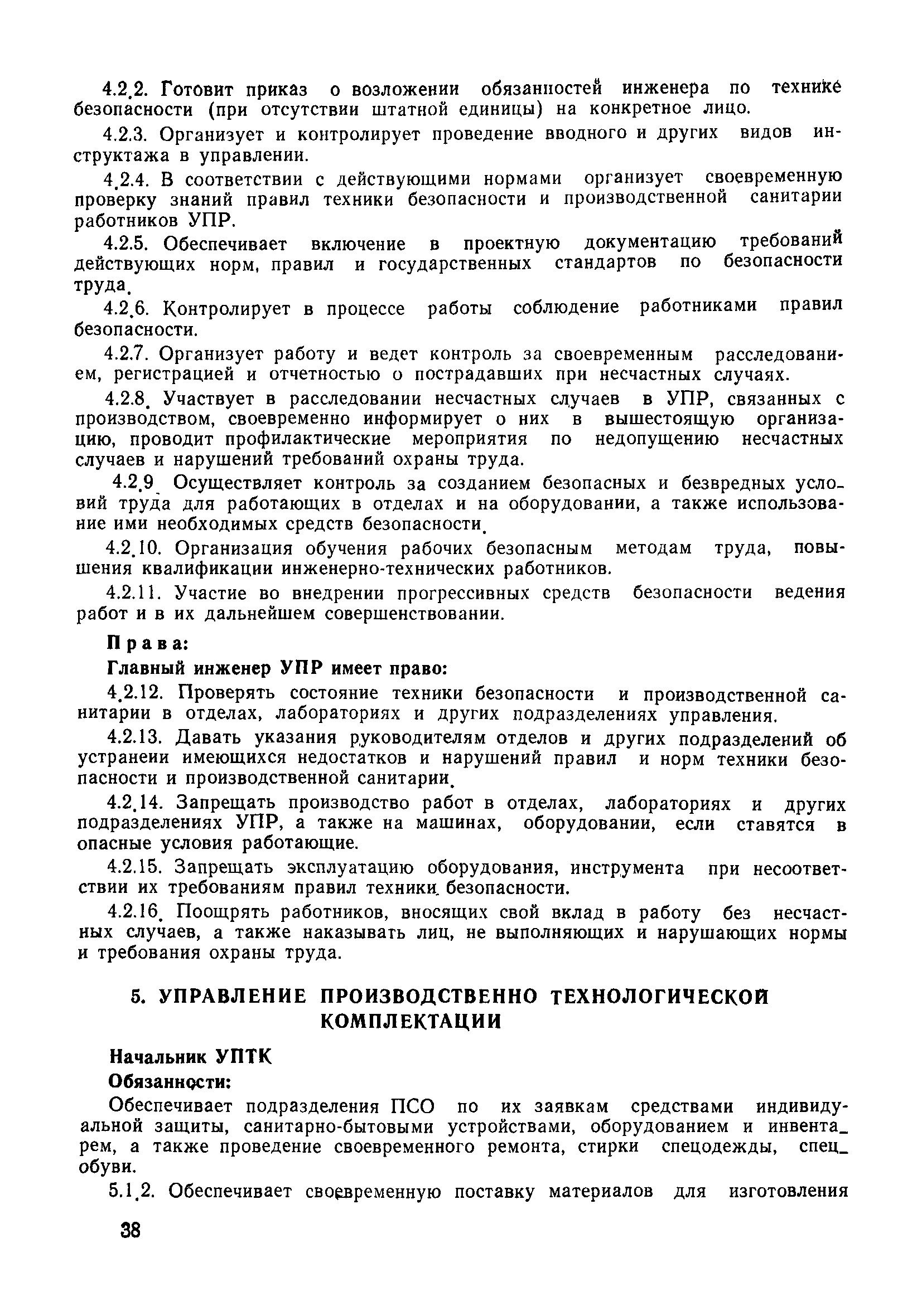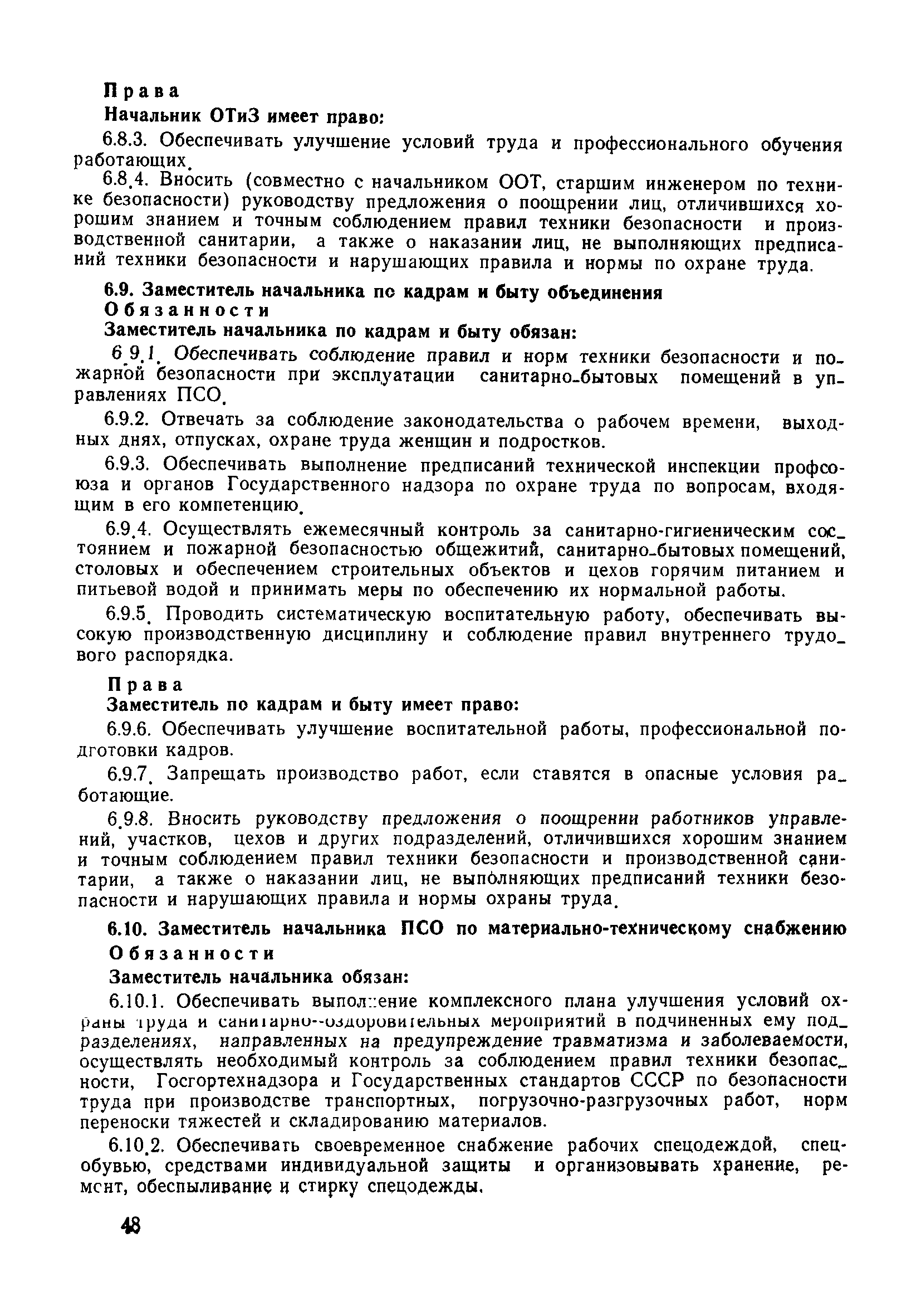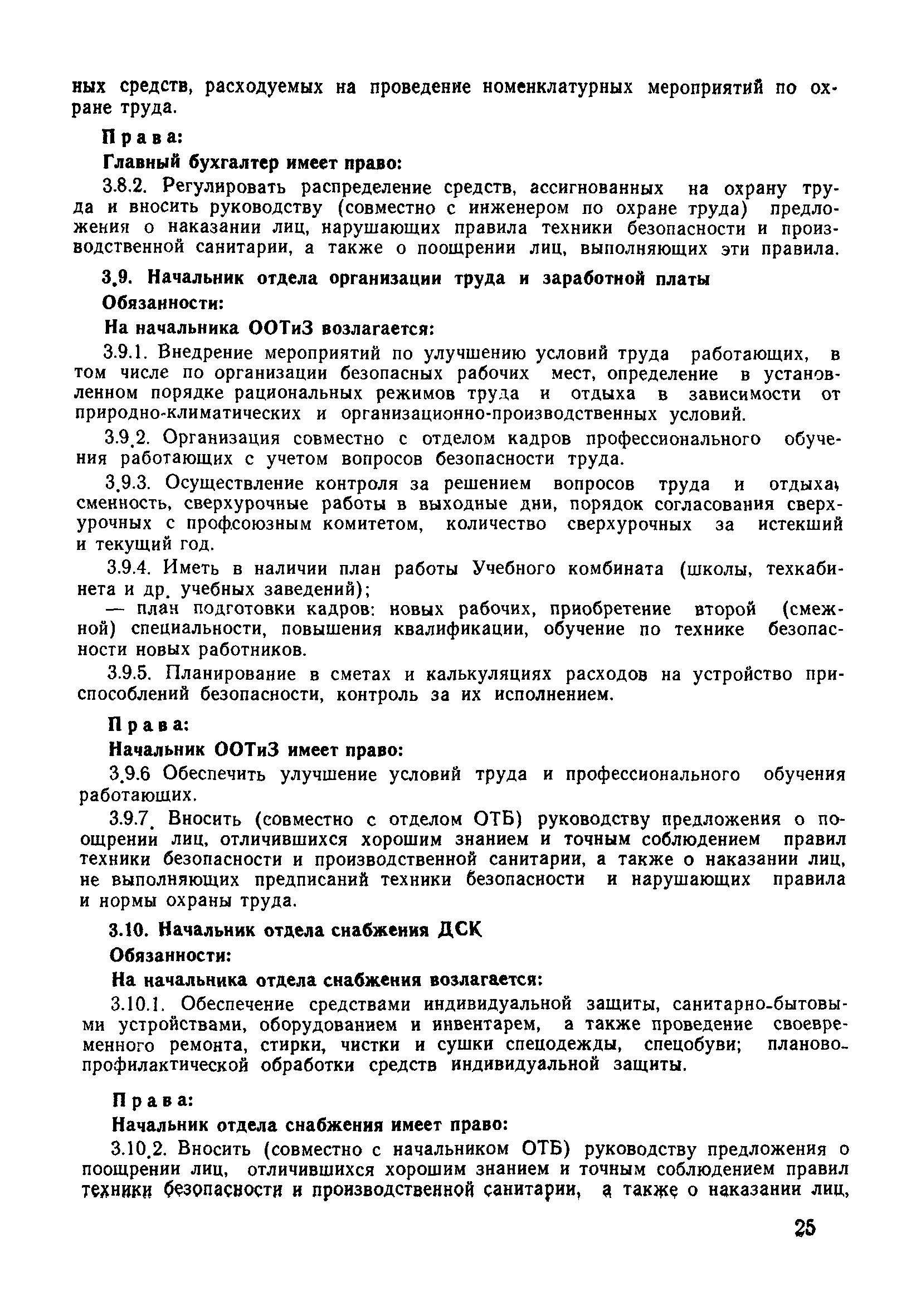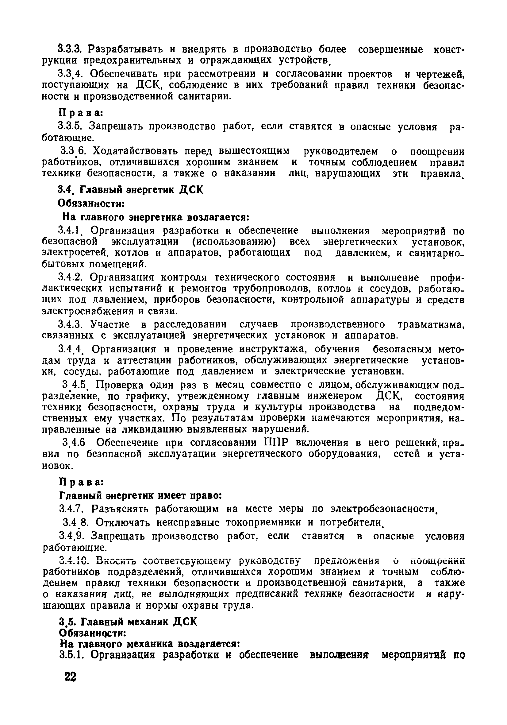 | Оглавление: | 1 Общие положения 1.1 Дисциплинарная ответственность 1.2 Материальная и уголовная ответственность 2 Строительные и монтажные организации 2.1 Бригадир (сменный бригадир) 2.2 Мастер (прораб) 2.3 Старший прораб (начальник участка) 2.4 Линейный механик 2.5 Инженер по охране труда управления 2.6 Главный механик управления 2.7 Энергетик управления (лицо ответственное за энергохозяйство) 2.8 Начальник производственно-технического отдела управления 2.9 Начальник отдела кадров 2.10 Главный бухгалтер 2.11 Начальник отдела организации труда и заработной платы 2.12 Заместитель начальника управления по производству 2.13. Заместитель начальника строительной и монтажной организации (управления) по кадрам м быту 2.14. Заместитель начальника управления по материально-техническому снабжению 2.15. Главный инженер строительной и монтажной организации (управления) 2.16. Начальник строительной и монтажной организации (управления) 3 Домостроительный комбинат 3.1. Начальник отдела техники безопасности ДСI( (старший инженер) 3.2. Начальник производственного отдела ДСК 3.3. Главный технолог ДСК 3.4. Главный энергетик ДСК 3.5. Главный механик ДСК 3.6. Главный строитель ДСК 3.7. Начальник отдела кадров ДСК 3.8. Главный бухгалтер ДСК 3.9. Начальник отдела организации труда и заработной платы 3.10. Начальник отдела снабжения ДСК 3.11. Заместитель начальника ДСК по кадрам и быту 3.12. Заместитель начальника по производству 3.13. Главный инженер ДСК 3.14. Начальник ДСК 3.15. Бригадир (сменный бригадир) 3.16. Мастер (прораб) строительного участка ДСК 3.17. Механик 3.18. Старший прораб (начальник участка) 3.19. Начальник строительно-монтажного потока 3.20 Мастер цеха ДСК 3.21. Начальник цеха 3.22. Начальник ОТК предприятия 4 Управление проектных работ (УПР) 4.1. Начальник управления 4.2. Главный инженер УПР 5 Управление производственно-технологической комплектации 5.1. Начальник УПТК 5.2. Главный инженер УПТК 5.3. Заместитель начальник УПТК 5.4. Механик. энергетик УПТК 5.5. Мастер цеха (участка) 6 Проектно-строительное объединение 6.1. Начальник отдела по охране труда объединения 6.2. Начальник технического отдела объединения 6.3. Начальник производственного отдела объединения 6.4. Главный технолог ПСО 6.5. Главный энергетик ПСО 6.6. Главный механик ПСО 6.7. Главный бухгалтер объединения 6.8. Начальник отдела организации труда и заработной платы объединения 6.9. Заместитель начальника по кадрам и быту объединения 6.10. Заместитель начальника ПСО по материально-техническому снабжению 6.11. Заместитель начальника ПСО по производству, строительству, специальным работам 6.12. Заместитель главного инженера ПСО 6.13 Начальник планового отдела 6.14. Начальник отдела кадров ПСО 6.15. Главный инженер объединения 6.16. Начальник объединения 7 Дополнительные обязанности по созданию безопасных условий труда при эксплуатации грузоподъемных кранов (Лицо, ответственное по надзору за безопасной эксплуатацией грузоподъемных машин) 7.1. Общие положения 7.2. Обязанности инженерно-технического работника по надзору за грузоподъемными машинами 7.3. Права инженерно-технического работника по надзору за грузоподъемными механизмами |