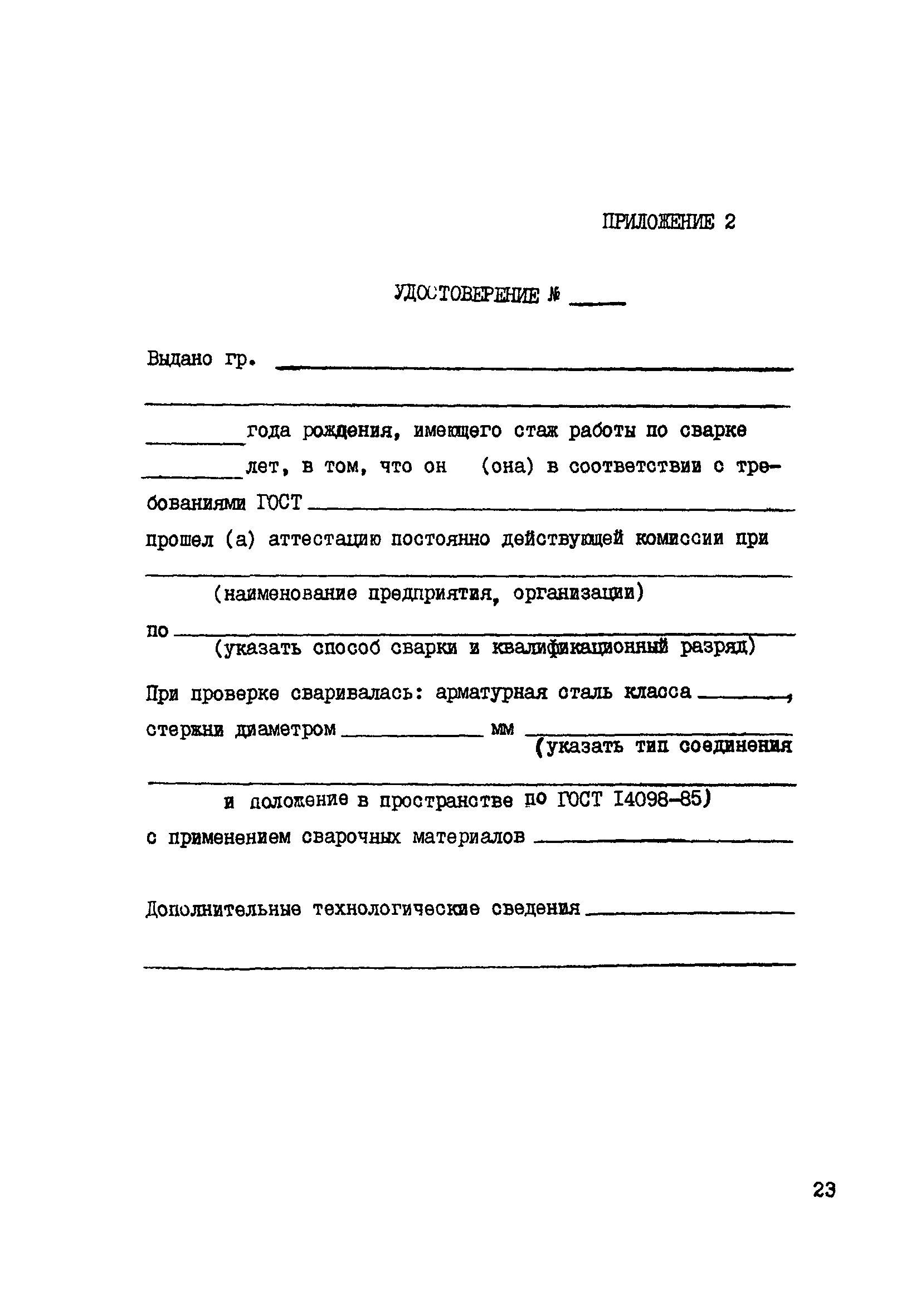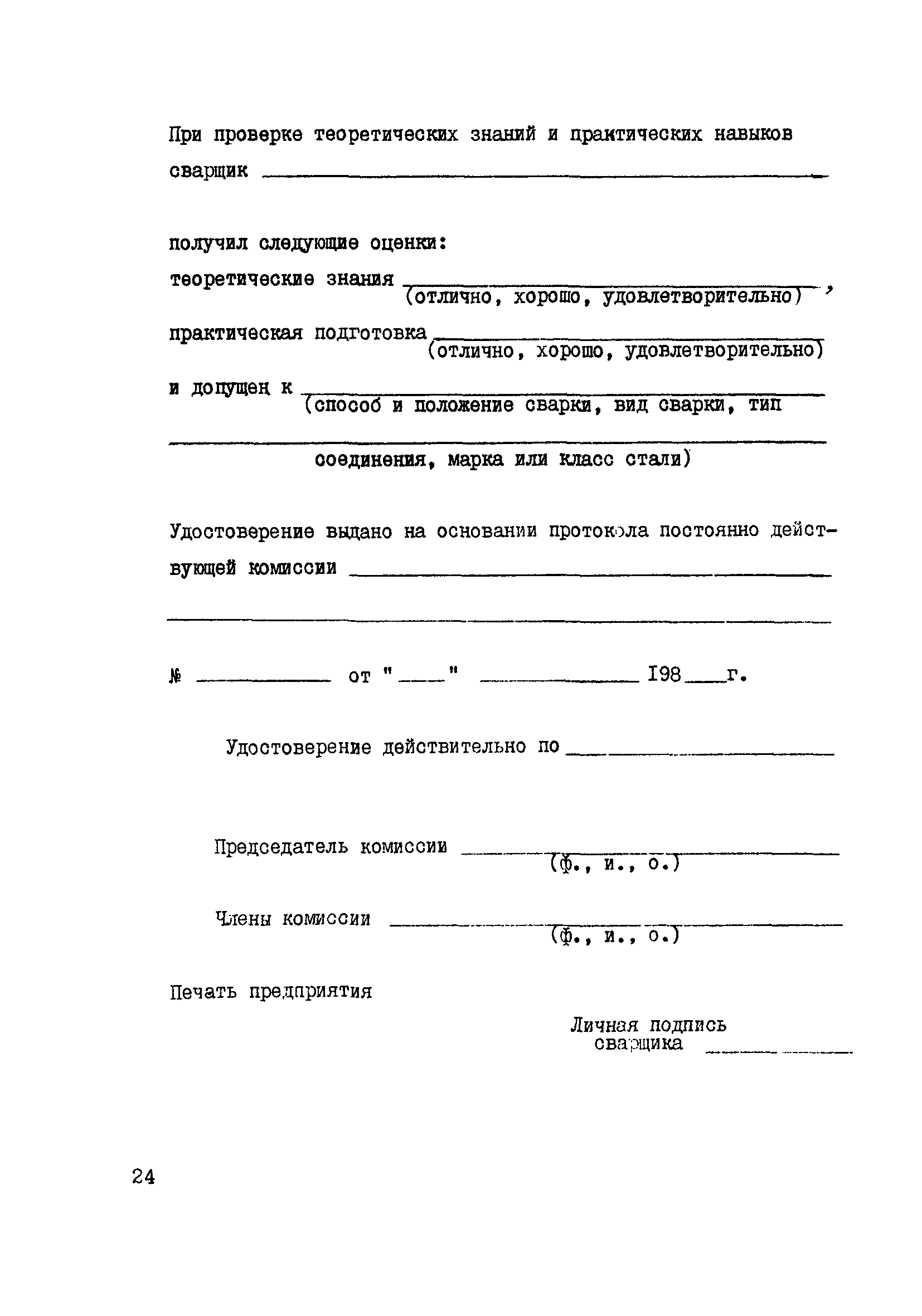 | Оглавление: | 1 Общие положения 2 Порядок аттестации 3 Контроль и оценка качества образцов сварных соединений 4 Отбор образцов 5 Испытание сварного соединения на статическое растяжение 6 Испытание сварного соединения на статический изгиб Приложение 1. Форма протокола заседания постоянно действующей комиссии Приложение 2. Образец удостоверения Литература |
