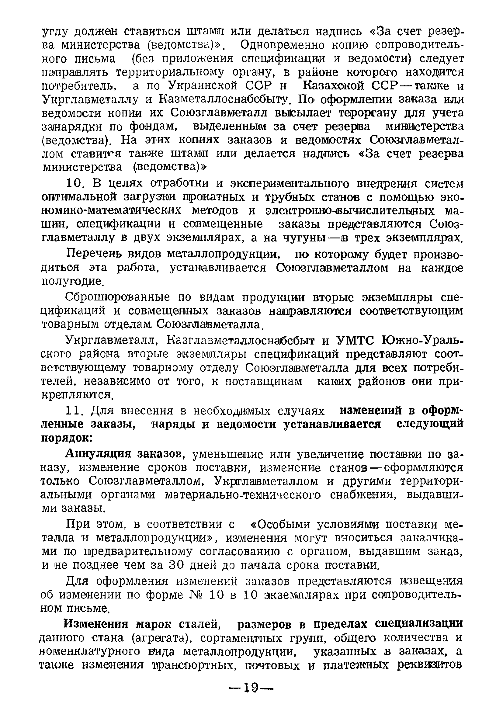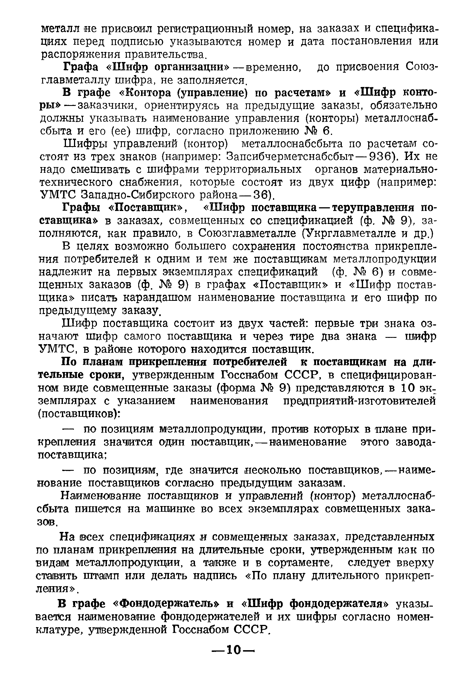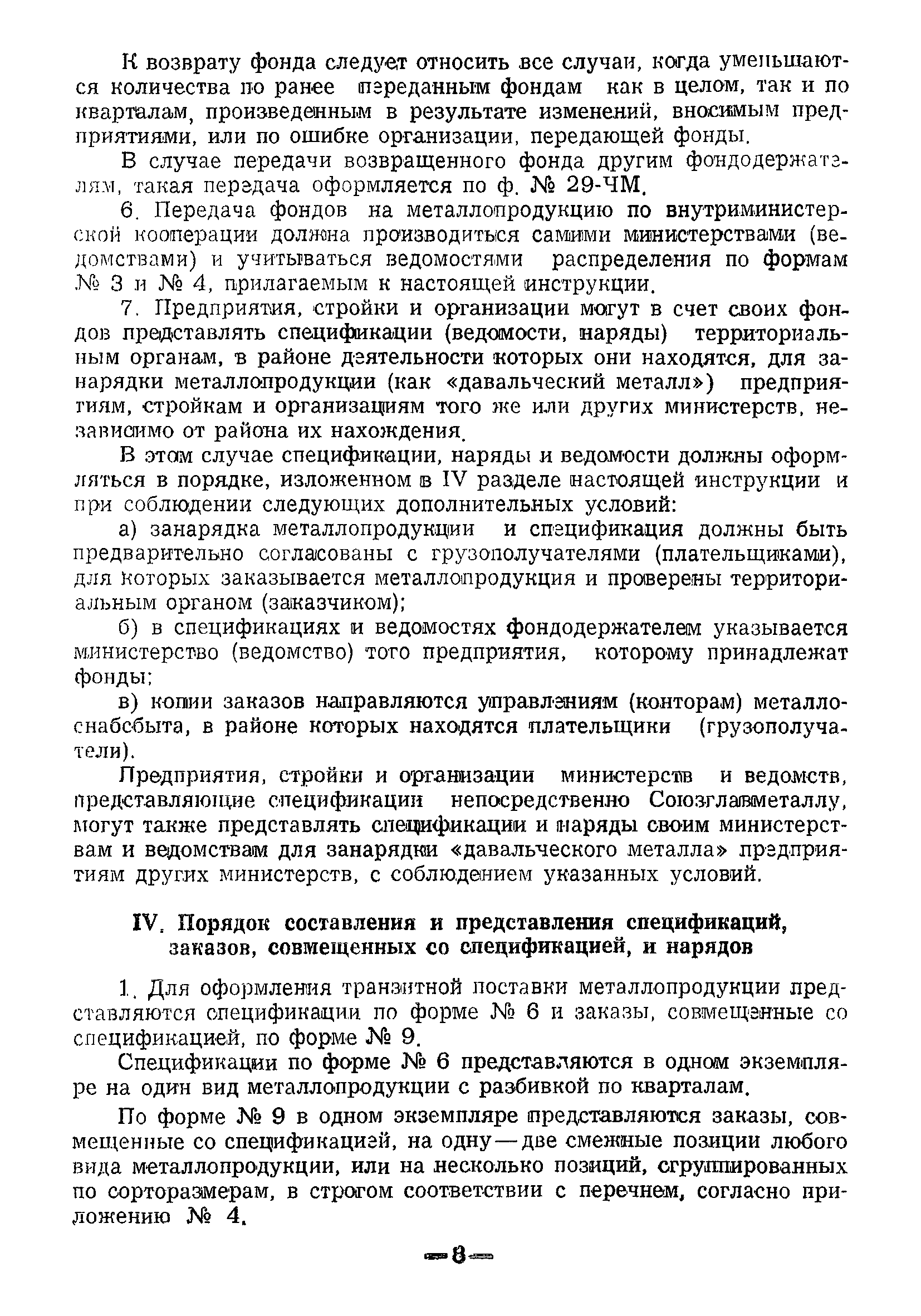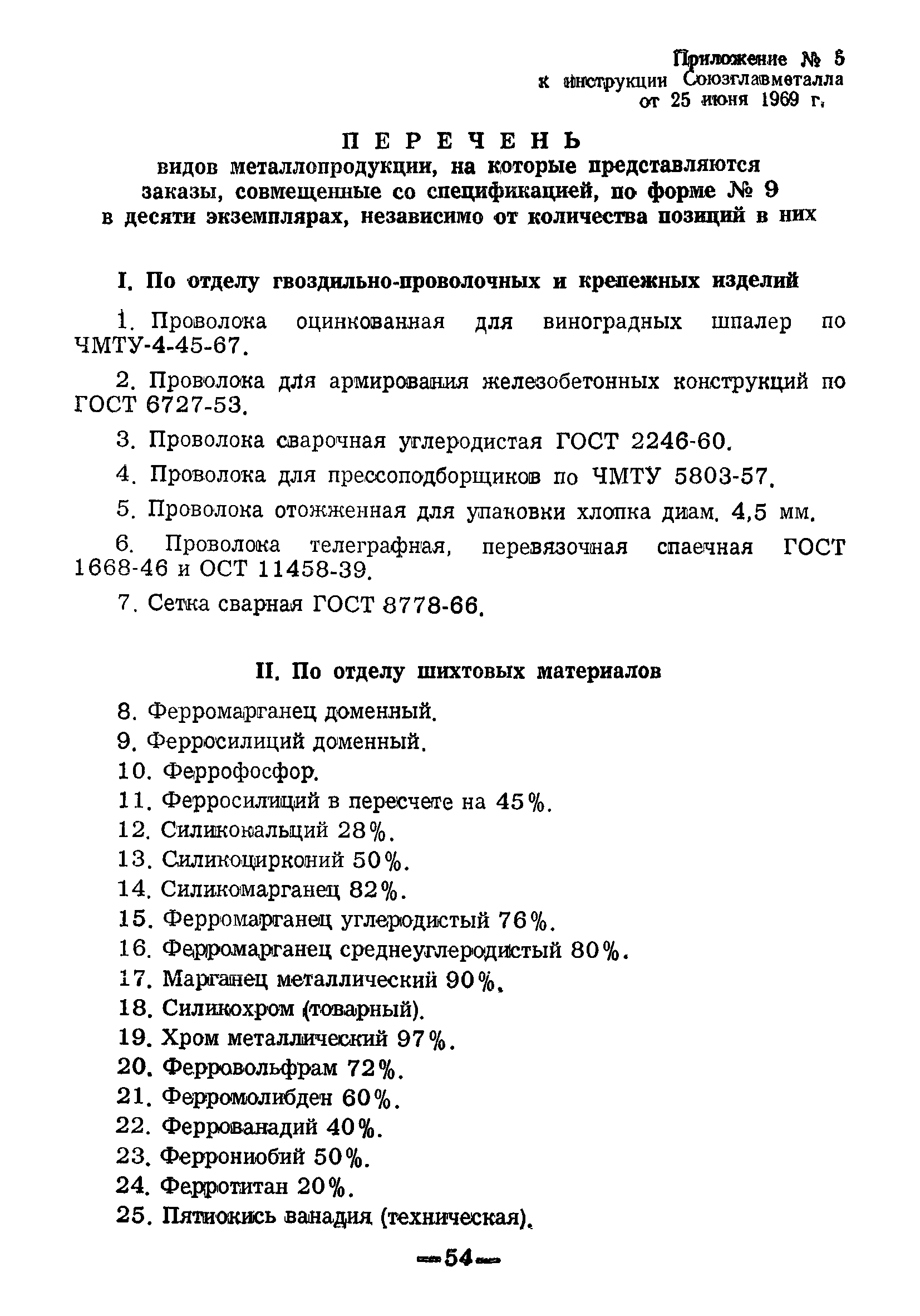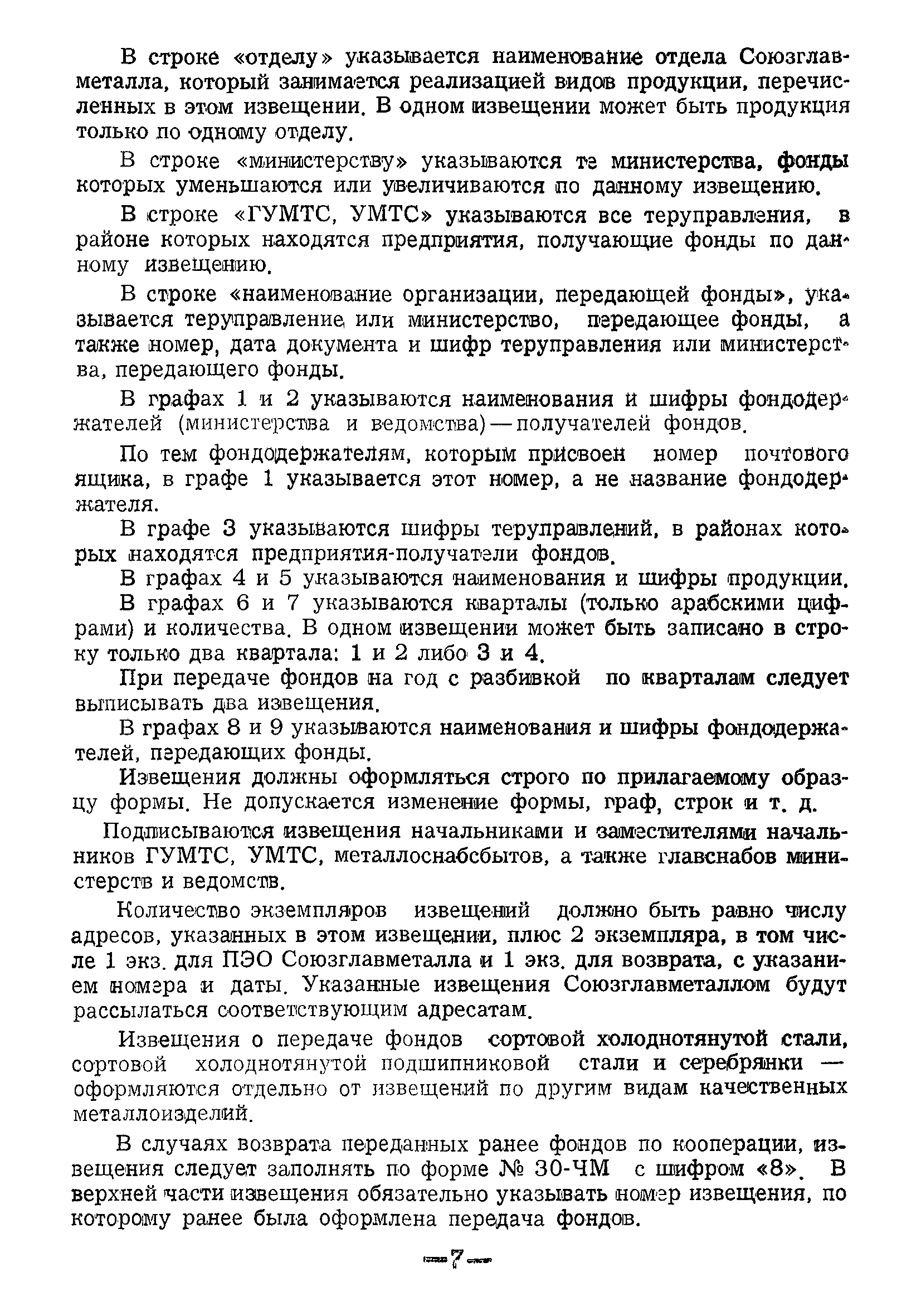 | Оглавление: | 1 Общие положения 2 Распределение фондов и доведение их до Союзглавметала и территориальных органов 3 Порядок передачи фондов на металлопродукцию по межминистерской кооперации 4 Порядок составления и представления спецификаций, заказов, совмещенных со спецификацией, и нарядов 5 По отделу сортового проката 6 По отделу рельсобалочной продукции 7 По отделу листового проката 8 По отделу качественного сортового проката 9 По отделу чугунов и ферросплавов 10 По отделу стальных и чугунных труб 11 По отделу качественных металлоизделий 12 По отделу гвоздильно-проволочных и крепежных изделий 13 По отделу металлотходов, некондиционной металлопродукции и МВР Приложения |
