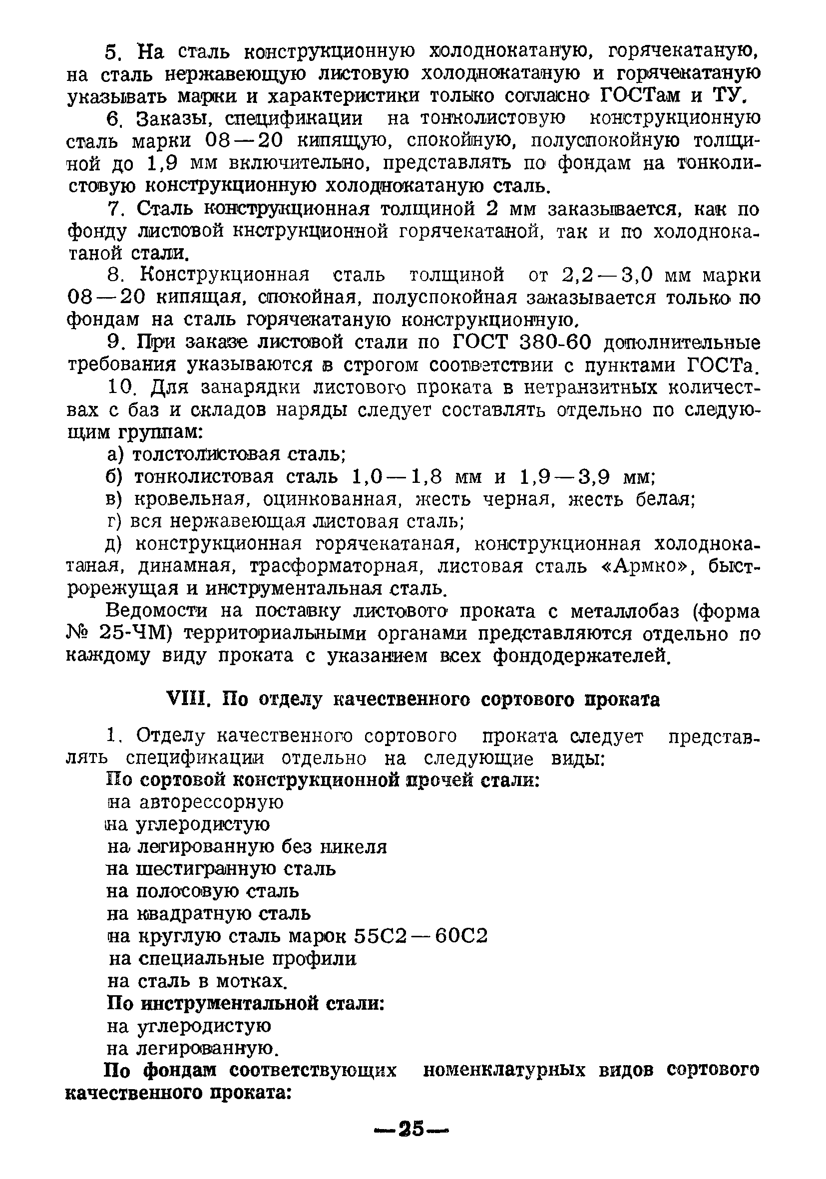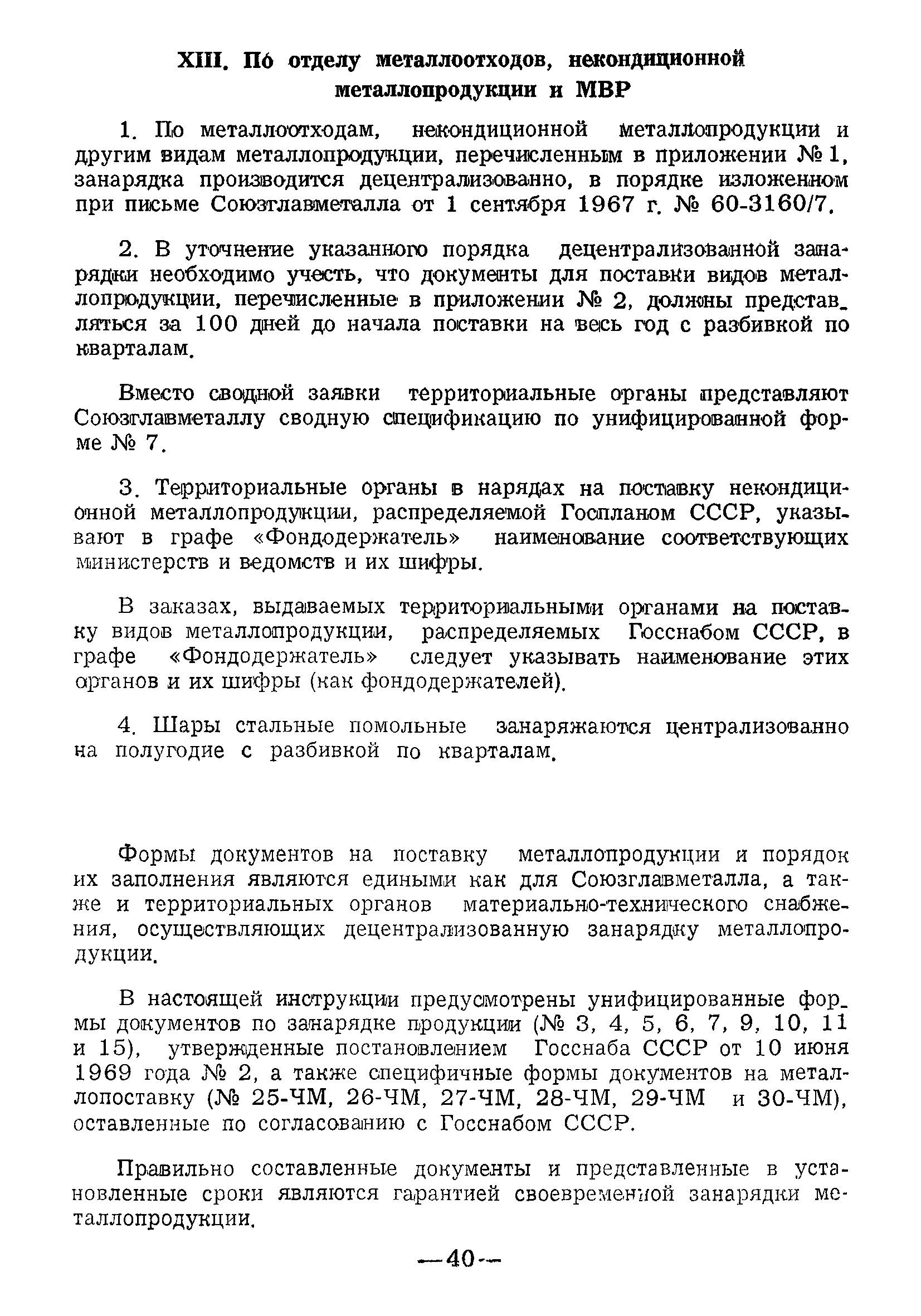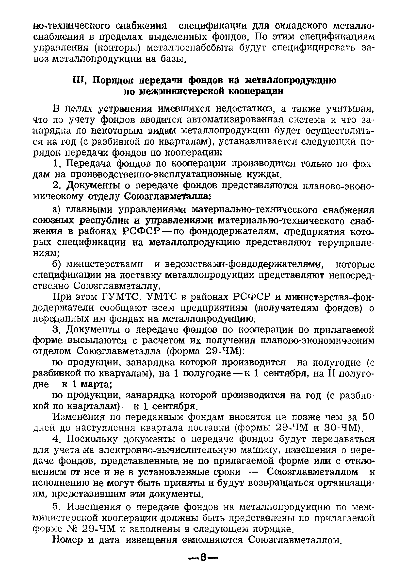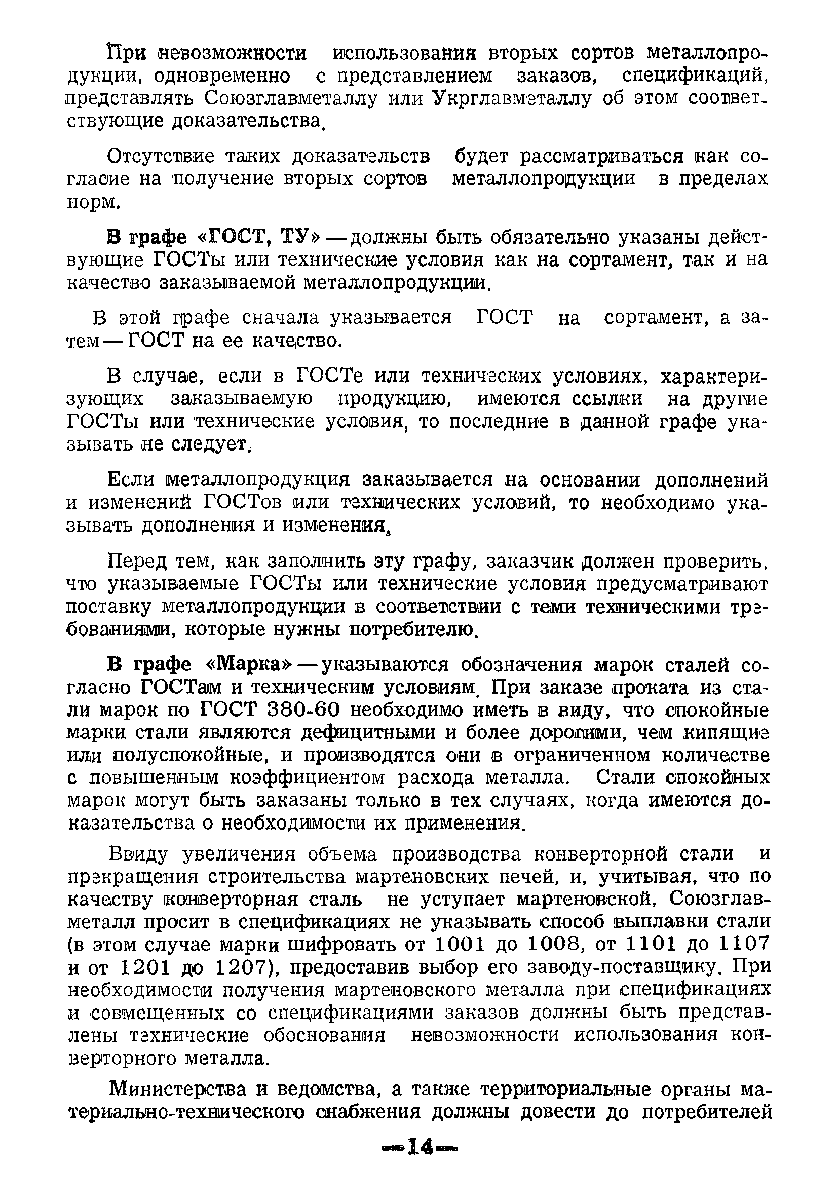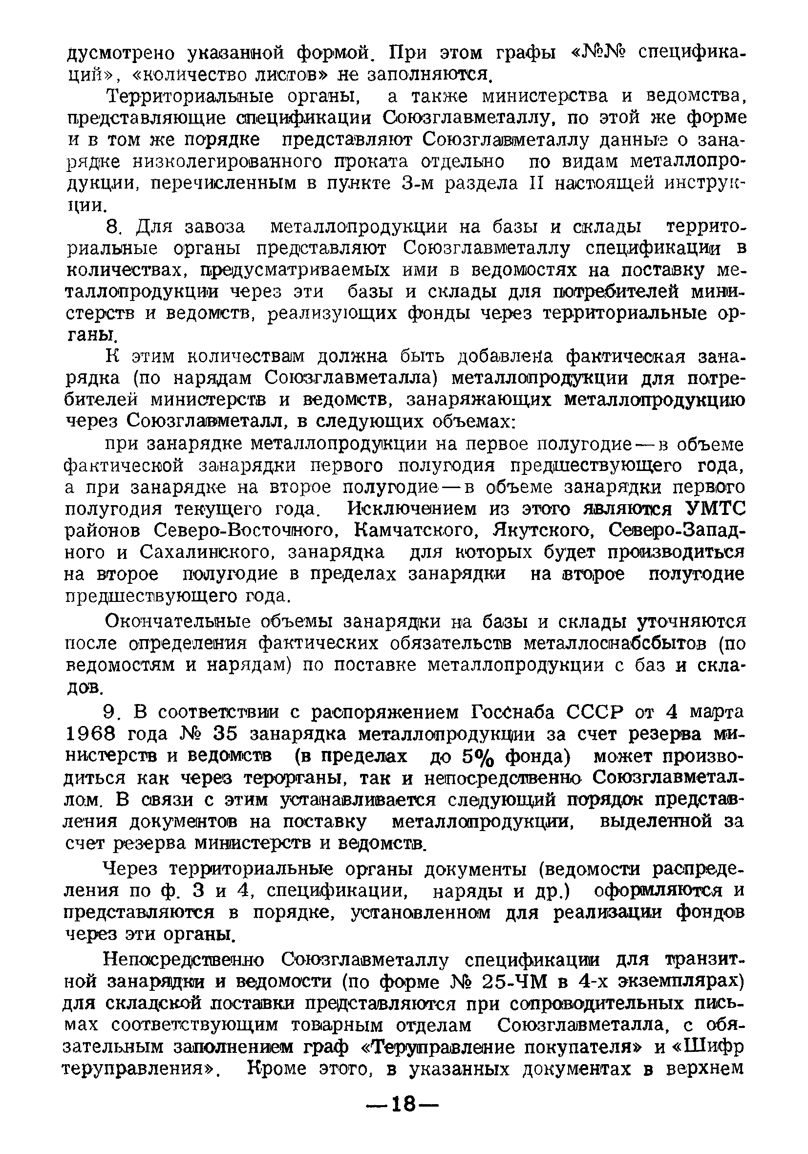 | Оглавление: | 1 Общие положения 2 Распределение фондов и доведение их до Союзглавметала и территориальных органов 3 Порядок передачи фондов на металлопродукцию по межминистерской кооперации 4 Порядок составления и представления спецификаций, заказов, совмещенных со спецификацией, и нарядов 5 По отделу сортового проката 6 По отделу рельсобалочной продукции 7 По отделу листового проката 8 По отделу качественного сортового проката 9 По отделу чугунов и ферросплавов 10 По отделу стальных и чугунных труб 11 По отделу качественных металлоизделий 12 По отделу гвоздильно-проволочных и крепежных изделий 13 По отделу металлотходов, некондиционной металлопродукции и МВР Приложения |