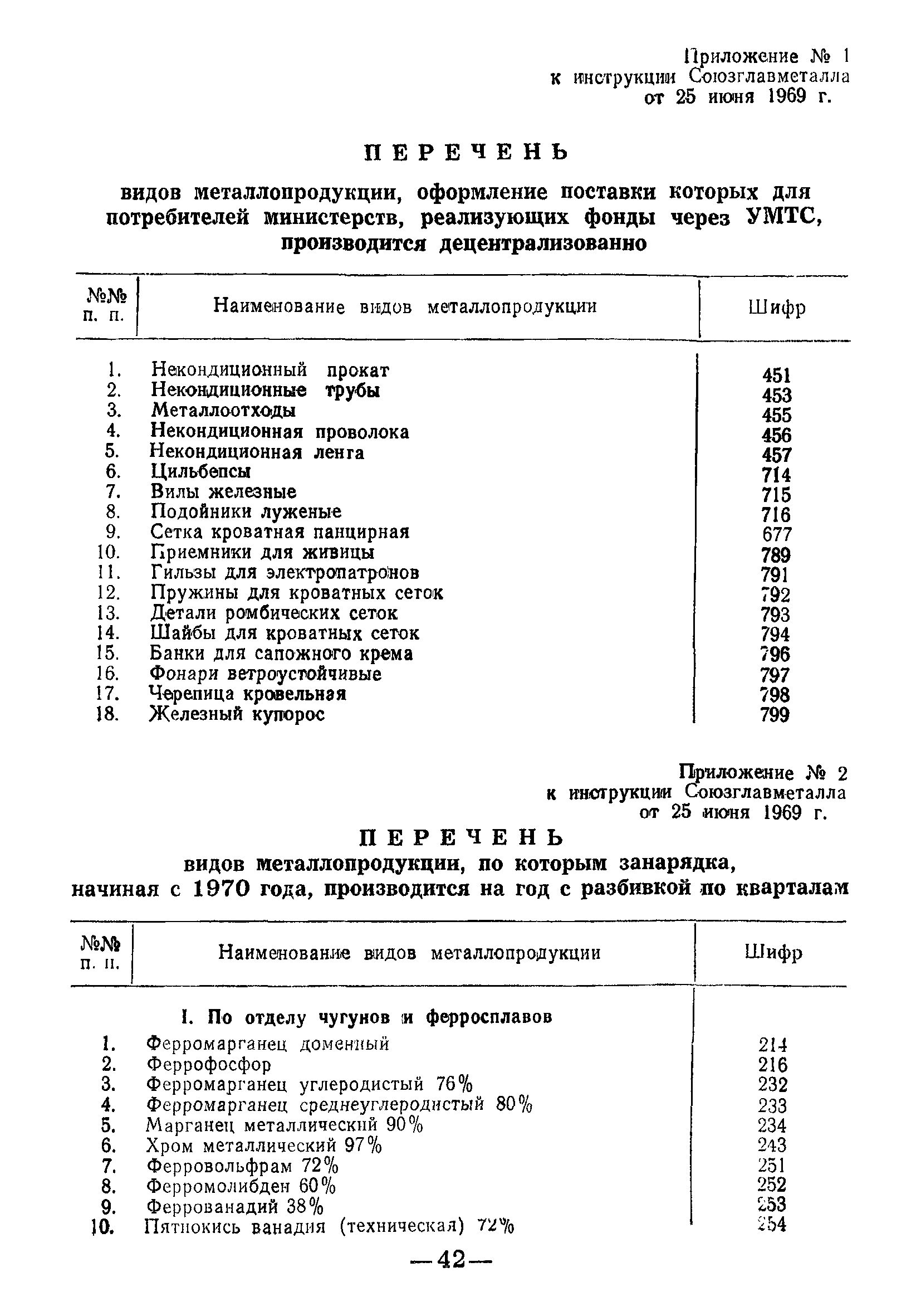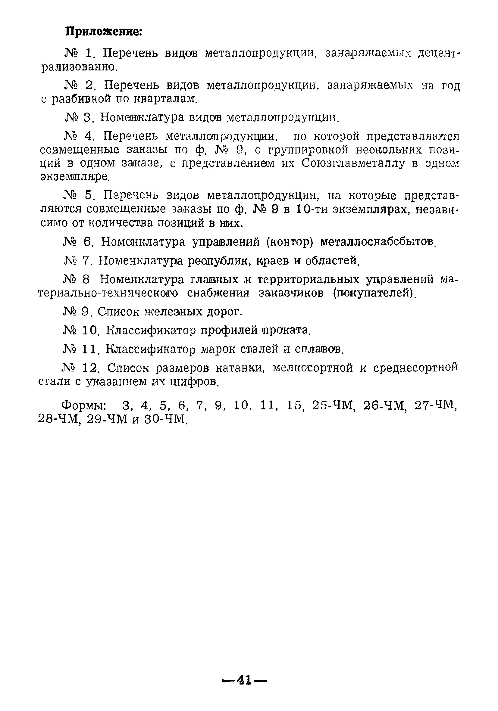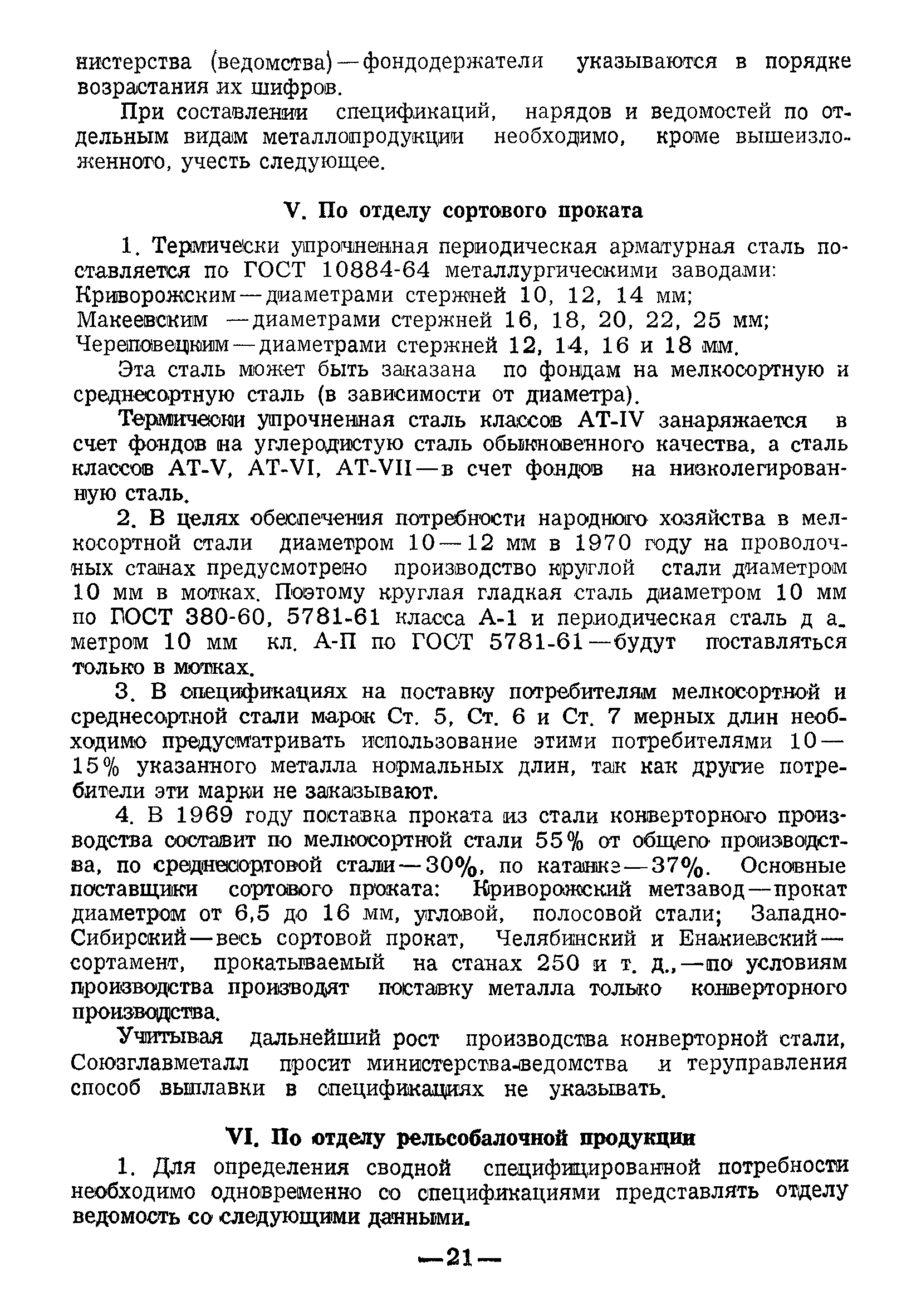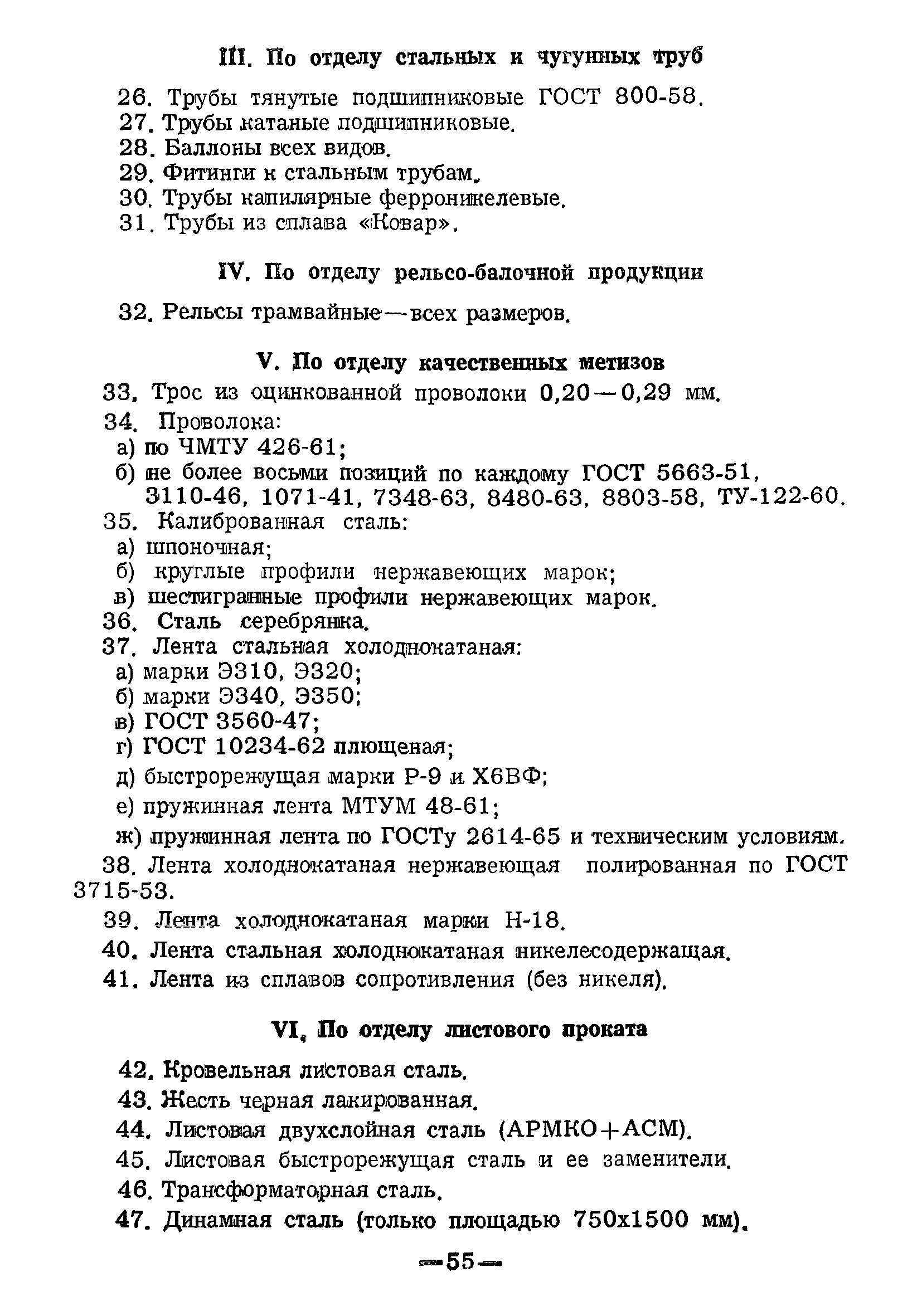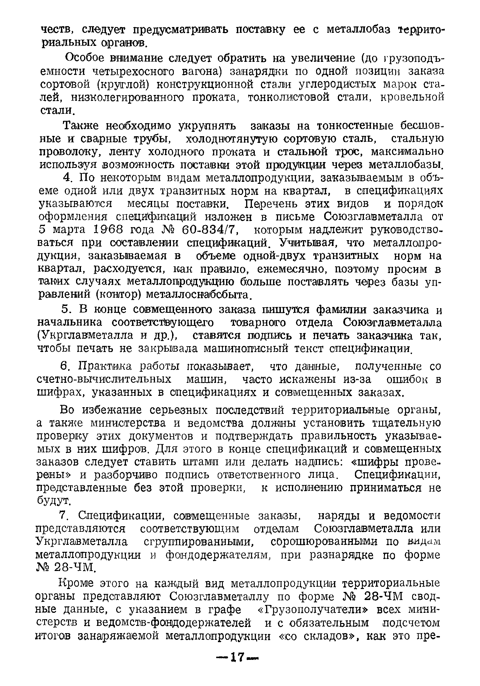 | Оглавление: | 1 Общие положения 2 Распределение фондов и доведение их до Союзглавметала и территориальных органов 3 Порядок передачи фондов на металлопродукцию по межминистерской кооперации 4 Порядок составления и представления спецификаций, заказов, совмещенных со спецификацией, и нарядов 5 По отделу сортового проката 6 По отделу рельсобалочной продукции 7 По отделу листового проката 8 По отделу качественного сортового проката 9 По отделу чугунов и ферросплавов 10 По отделу стальных и чугунных труб 11 По отделу качественных металлоизделий 12 По отделу гвоздильно-проволочных и крепежных изделий 13 По отделу металлотходов, некондиционной металлопродукции и МВР Приложения |