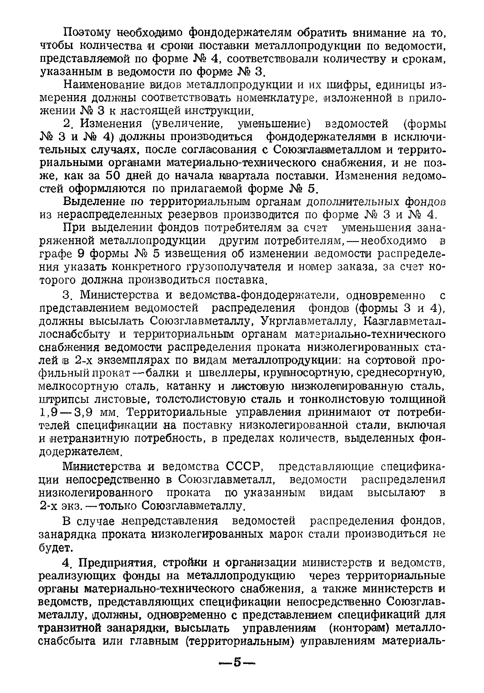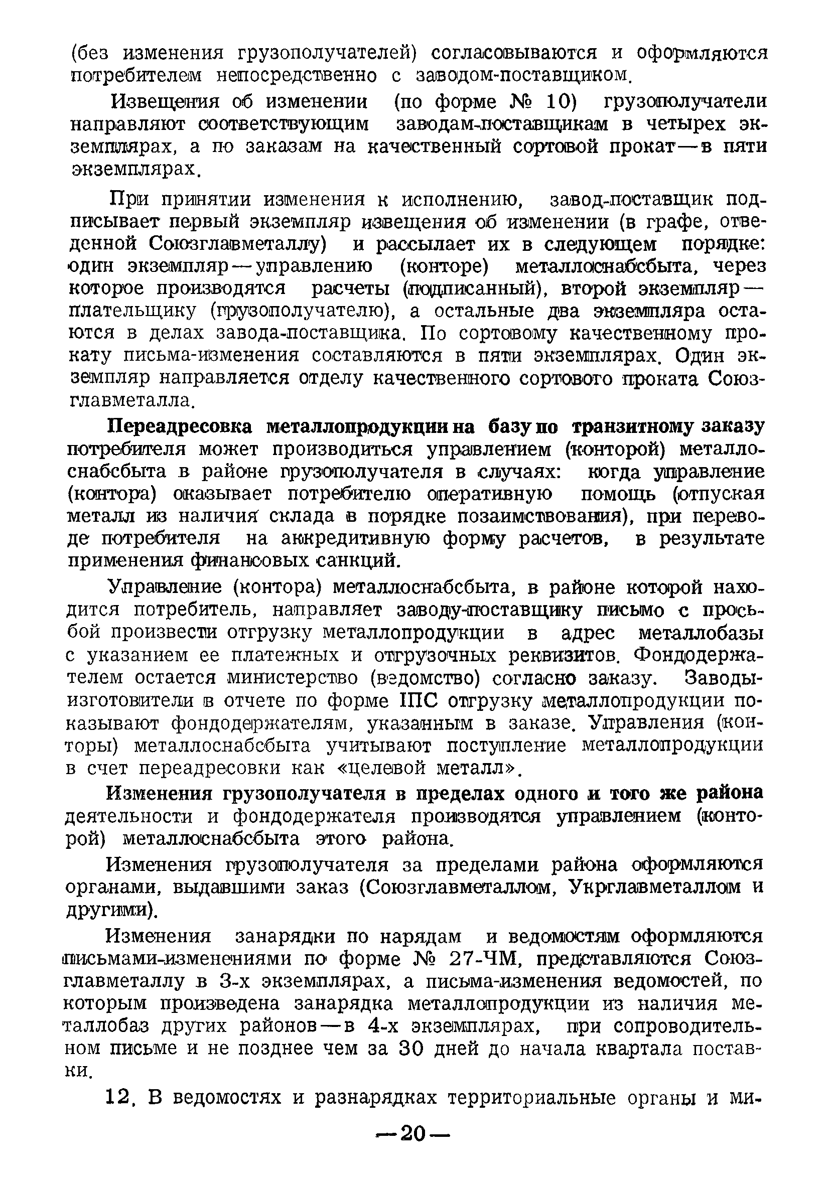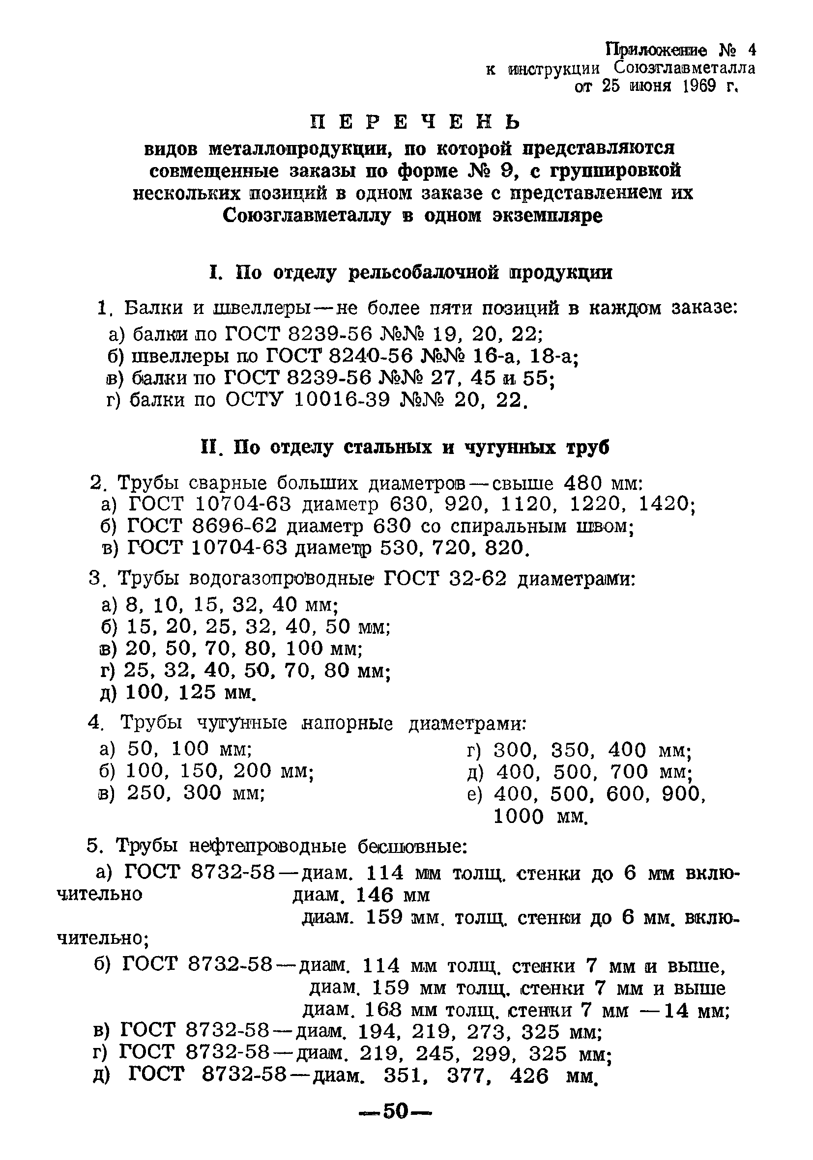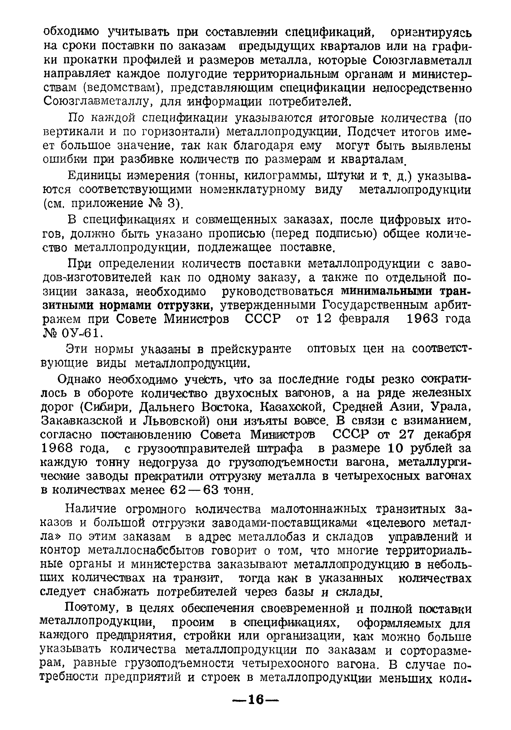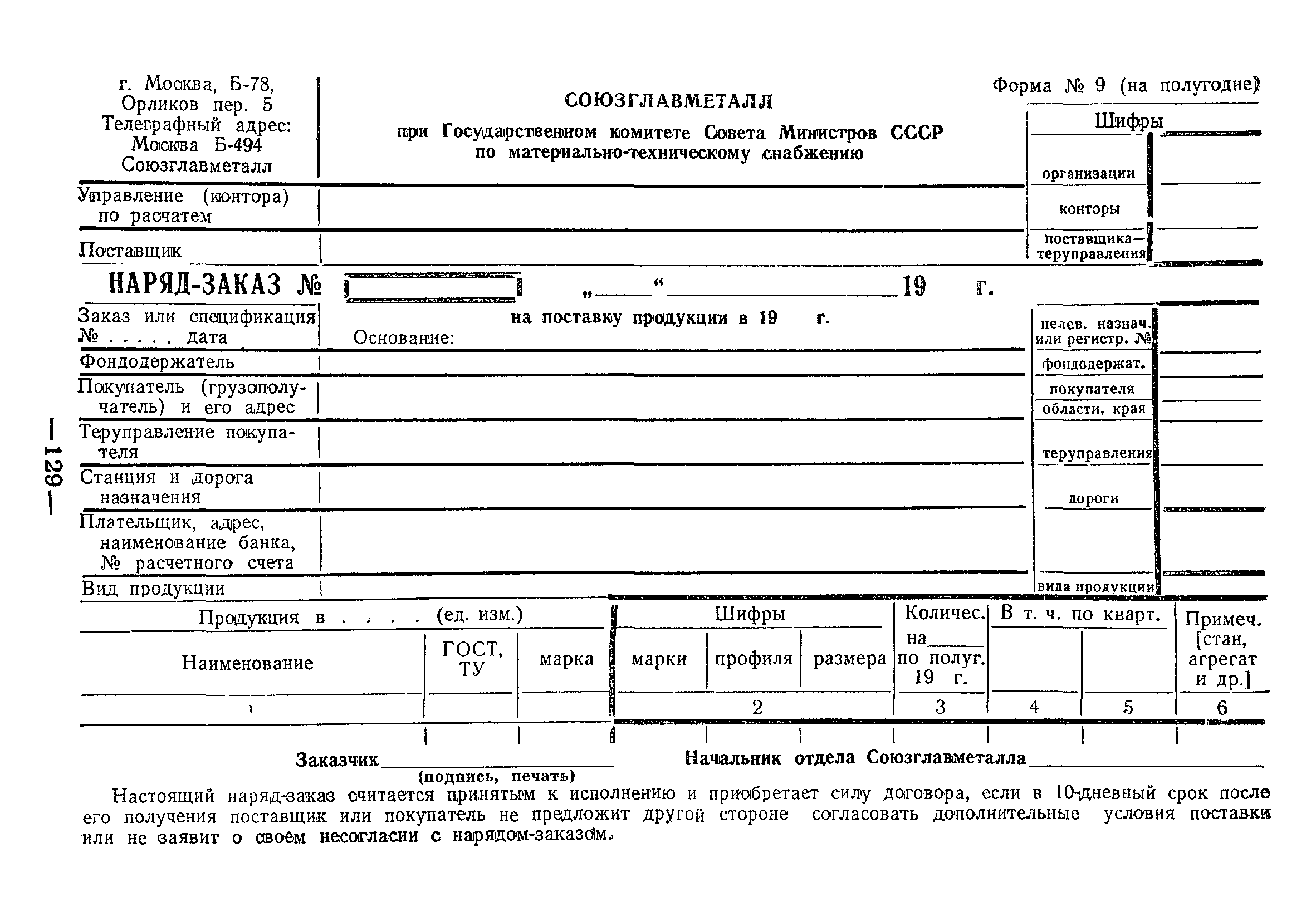 | Оглавление: | 1 Общие положения 2 Распределение фондов и доведение их до Союзглавметала и территориальных органов 3 Порядок передачи фондов на металлопродукцию по межминистерской кооперации 4 Порядок составления и представления спецификаций, заказов, совмещенных со спецификацией, и нарядов 5 По отделу сортового проката 6 По отделу рельсобалочной продукции 7 По отделу листового проката 8 По отделу качественного сортового проката 9 По отделу чугунов и ферросплавов 10 По отделу стальных и чугунных труб 11 По отделу качественных металлоизделий 12 По отделу гвоздильно-проволочных и крепежных изделий 13 По отделу металлотходов, некондиционной металлопродукции и МВР Приложения |