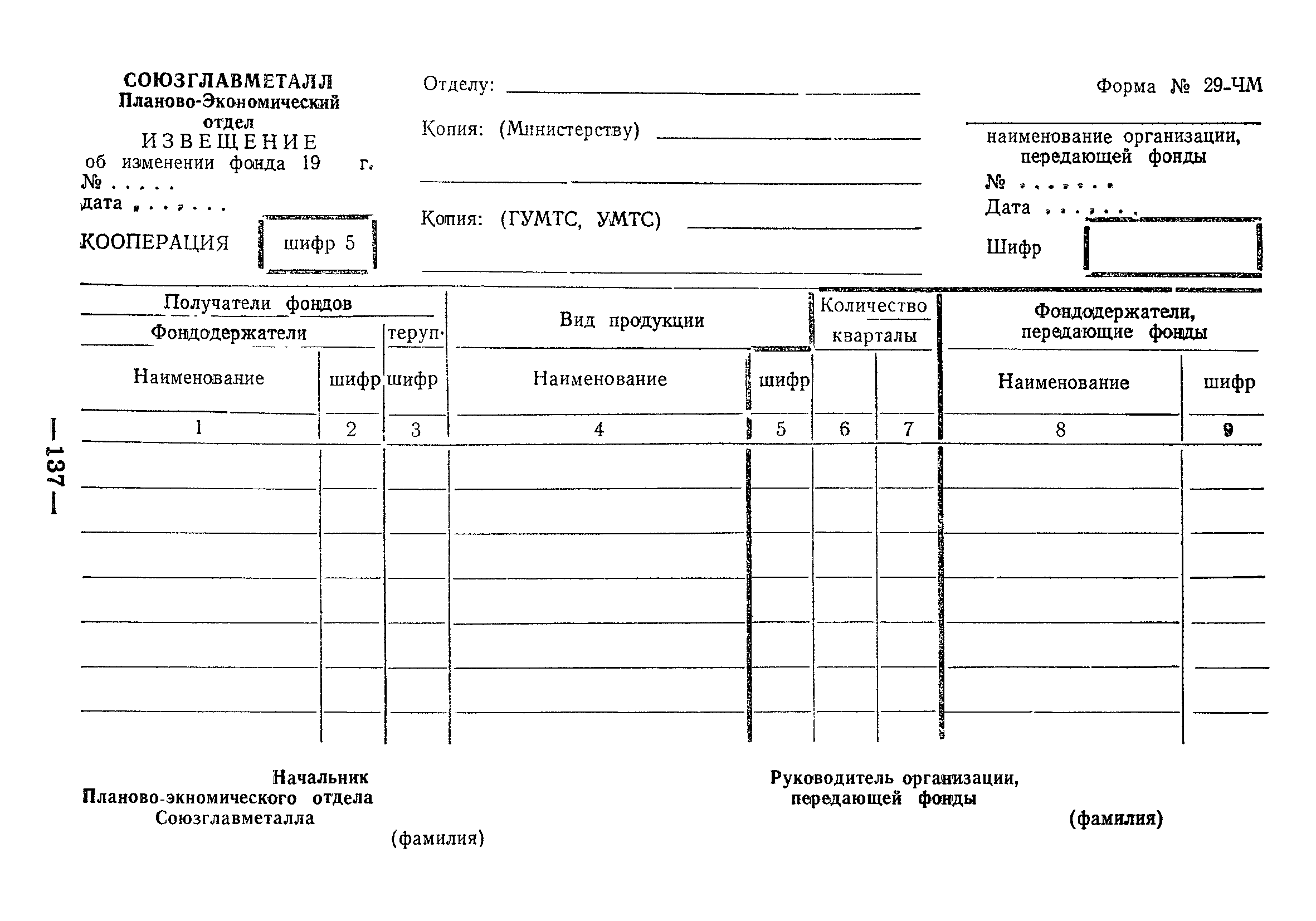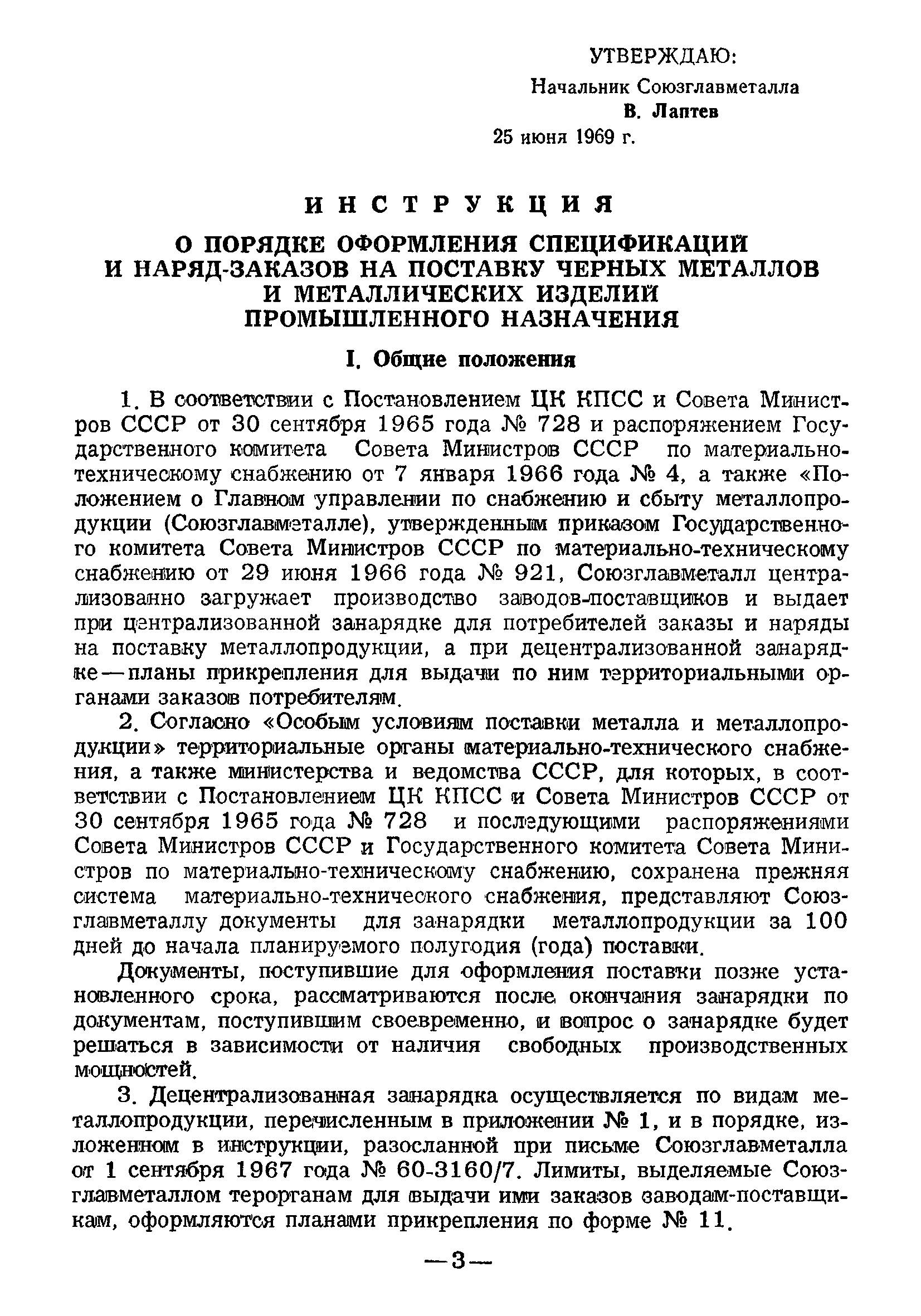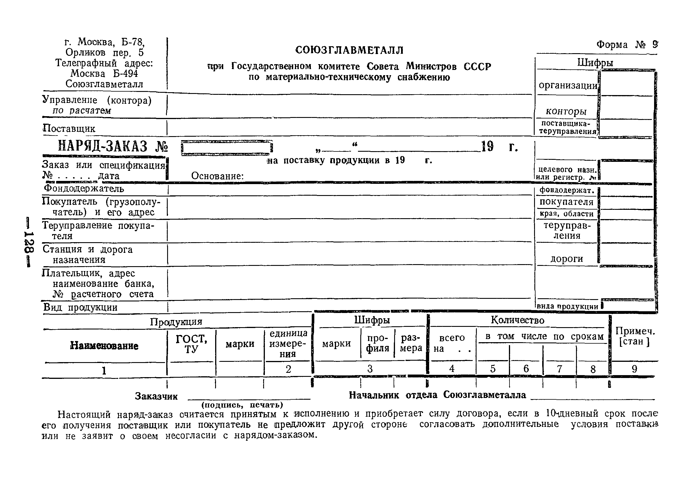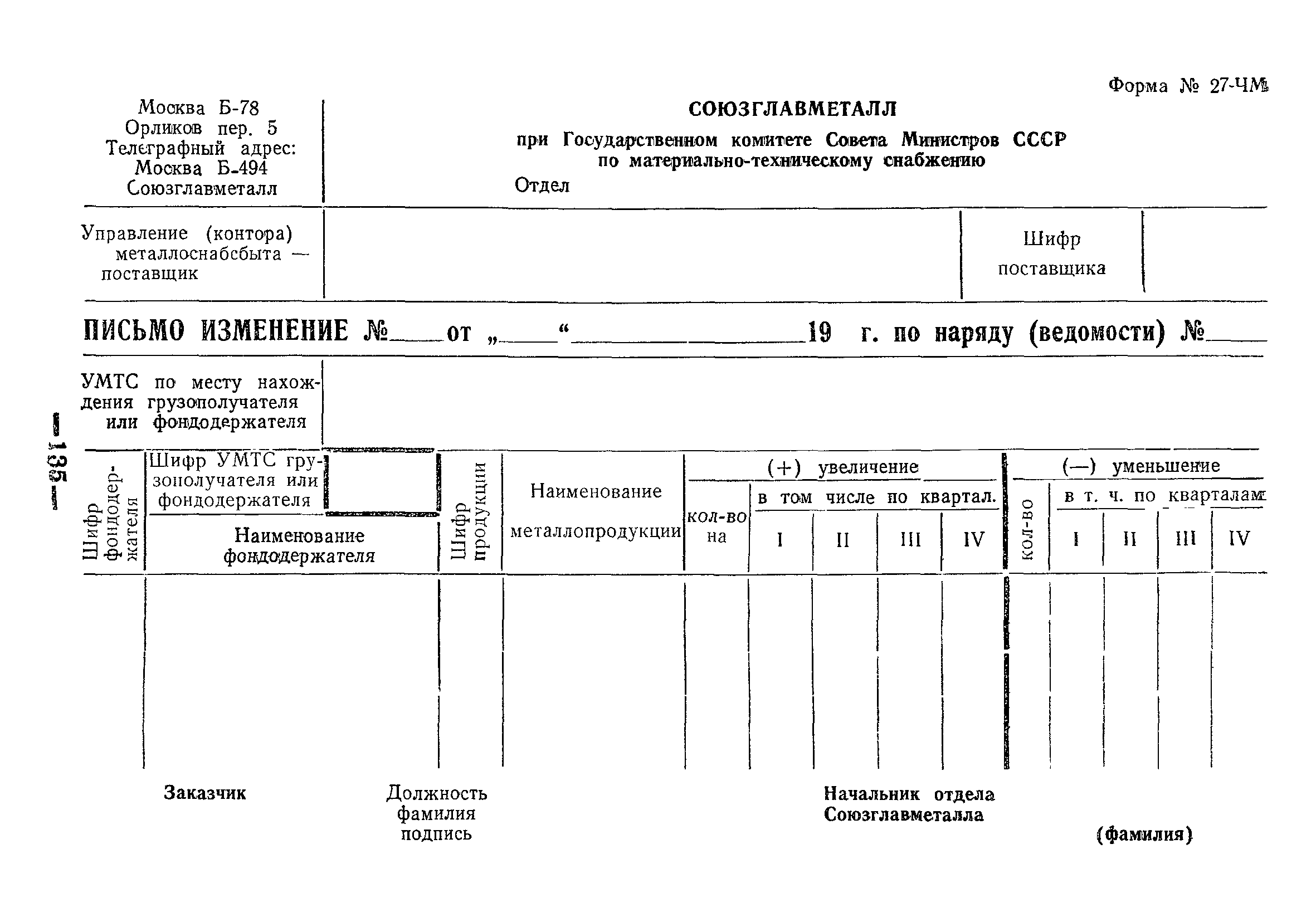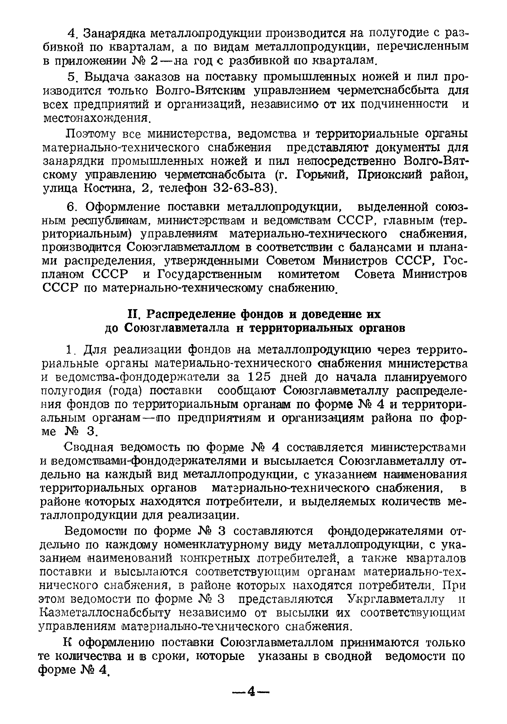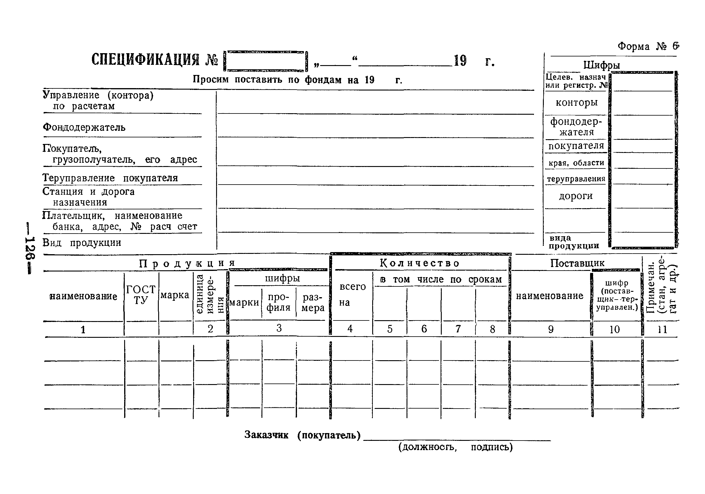 | Оглавление: | 1 Общие положения 2 Распределение фондов и доведение их до Союзглавметала и территориальных органов 3 Порядок передачи фондов на металлопродукцию по межминистерской кооперации 4 Порядок составления и представления спецификаций, заказов, совмещенных со спецификацией, и нарядов 5 По отделу сортового проката 6 По отделу рельсобалочной продукции 7 По отделу листового проката 8 По отделу качественного сортового проката 9 По отделу чугунов и ферросплавов 10 По отделу стальных и чугунных труб 11 По отделу качественных металлоизделий 12 По отделу гвоздильно-проволочных и крепежных изделий 13 По отделу металлотходов, некондиционной металлопродукции и МВР Приложения |