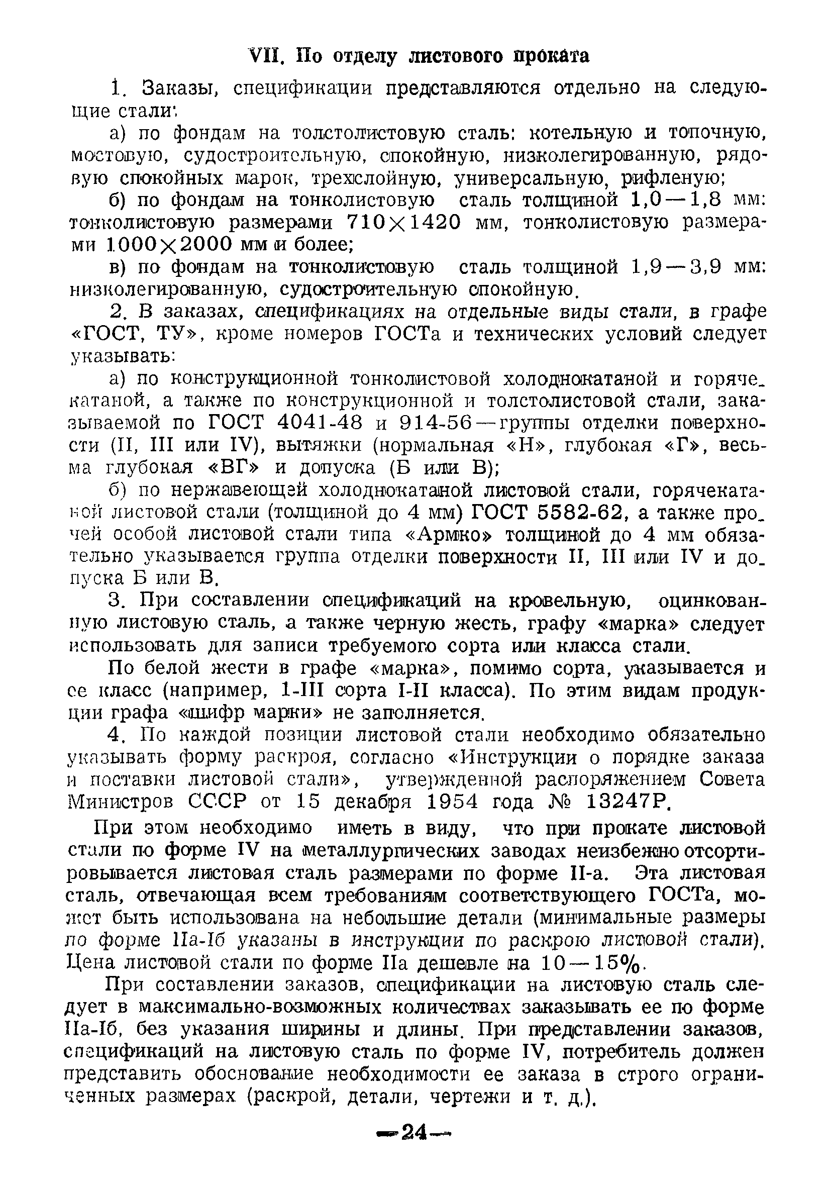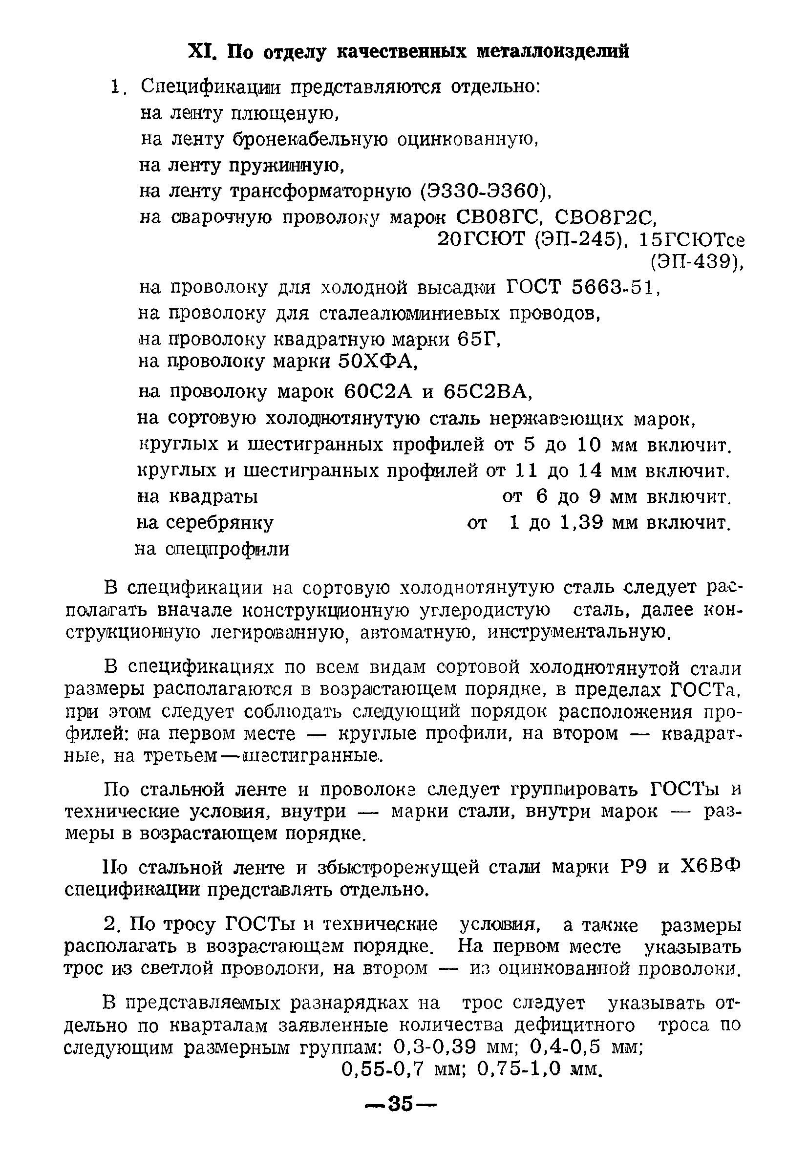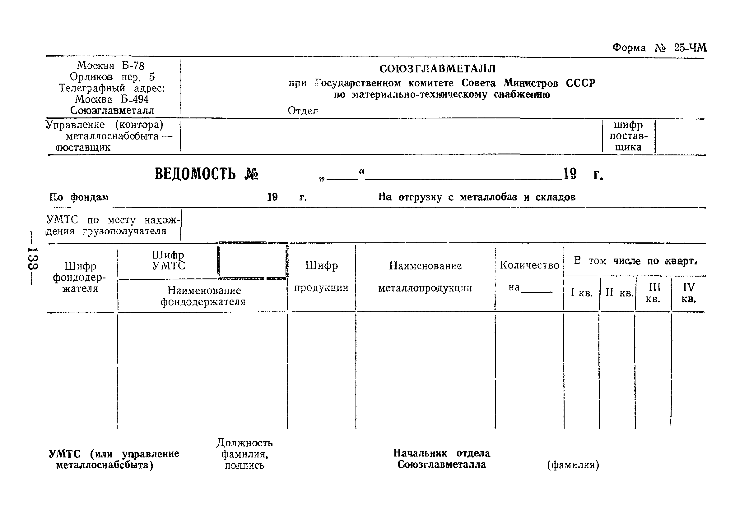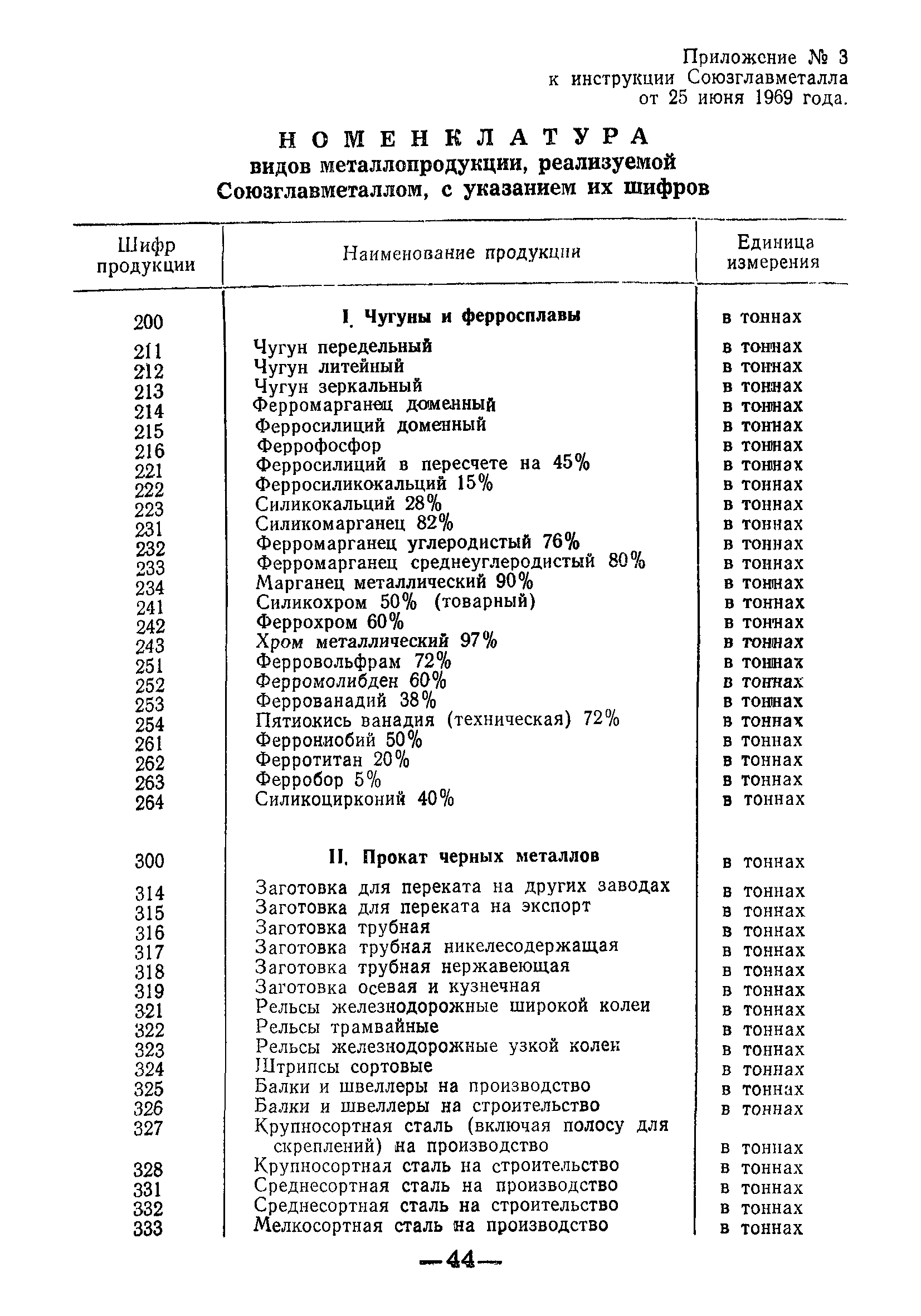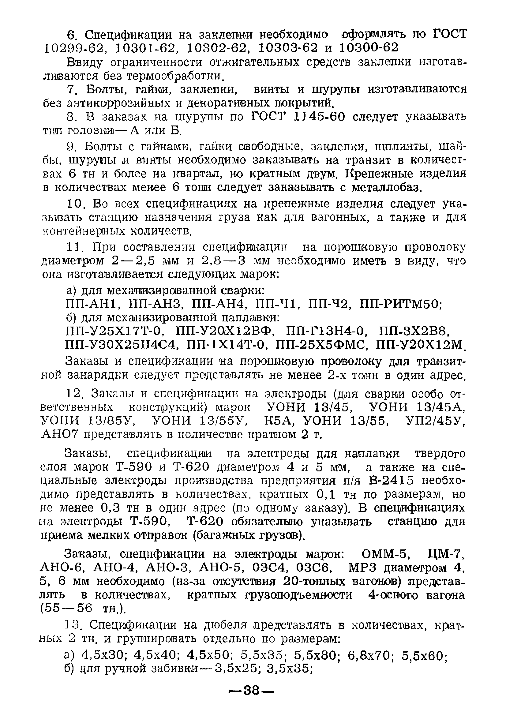 | Оглавление: | 1 Общие положения 2 Распределение фондов и доведение их до Союзглавметала и территориальных органов 3 Порядок передачи фондов на металлопродукцию по межминистерской кооперации 4 Порядок составления и представления спецификаций, заказов, совмещенных со спецификацией, и нарядов 5 По отделу сортового проката 6 По отделу рельсобалочной продукции 7 По отделу листового проката 8 По отделу качественного сортового проката 9 По отделу чугунов и ферросплавов 10 По отделу стальных и чугунных труб 11 По отделу качественных металлоизделий 12 По отделу гвоздильно-проволочных и крепежных изделий 13 По отделу металлотходов, некондиционной металлопродукции и МВР Приложения |