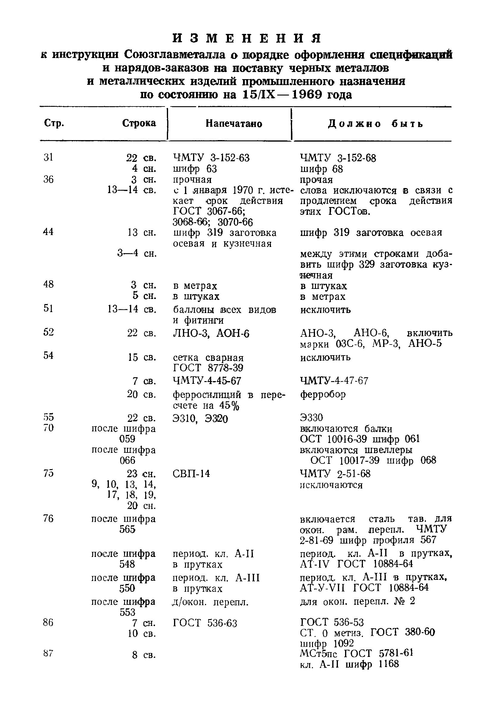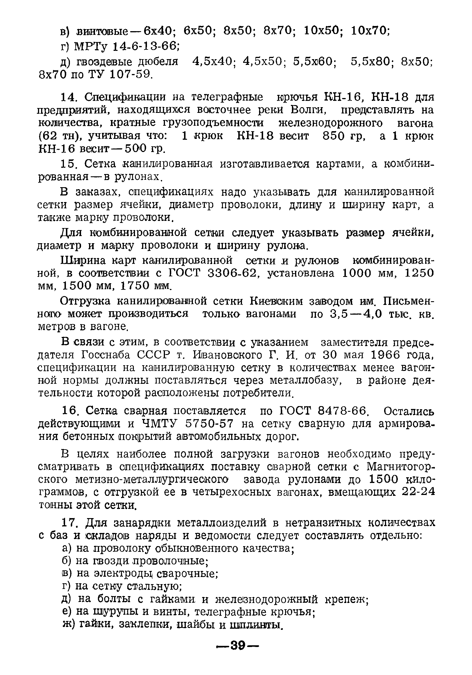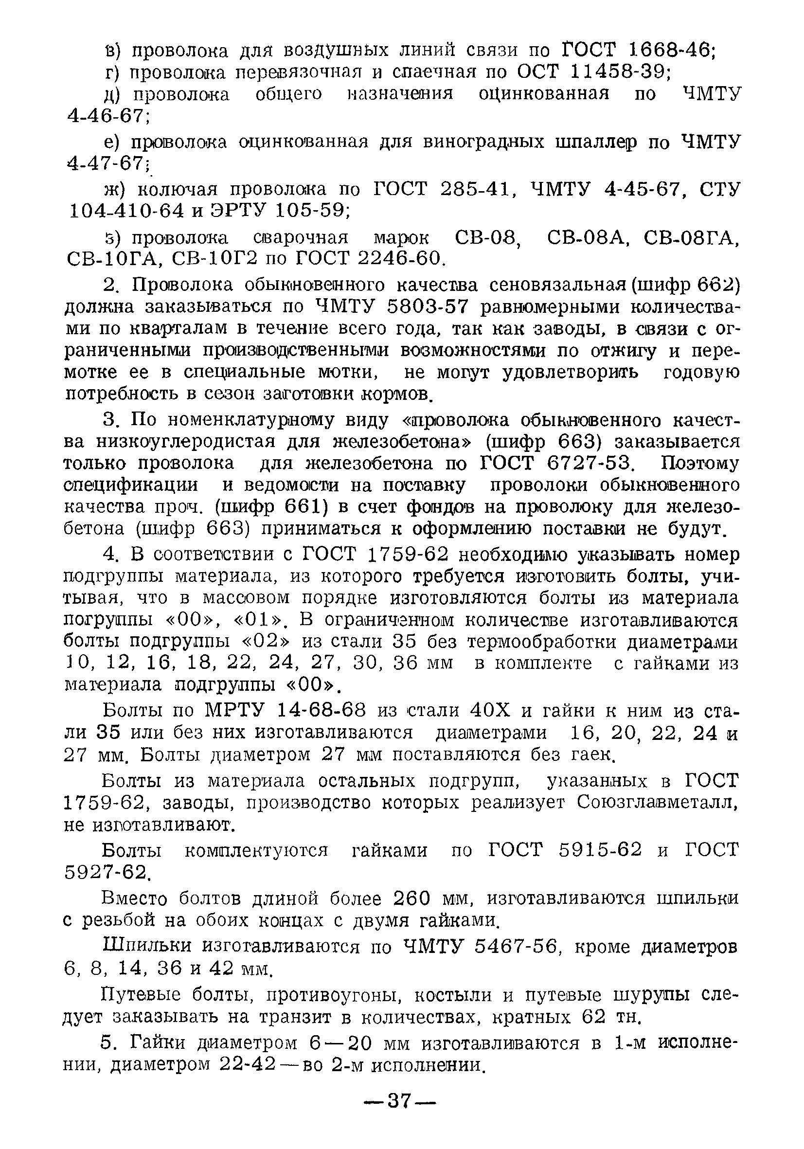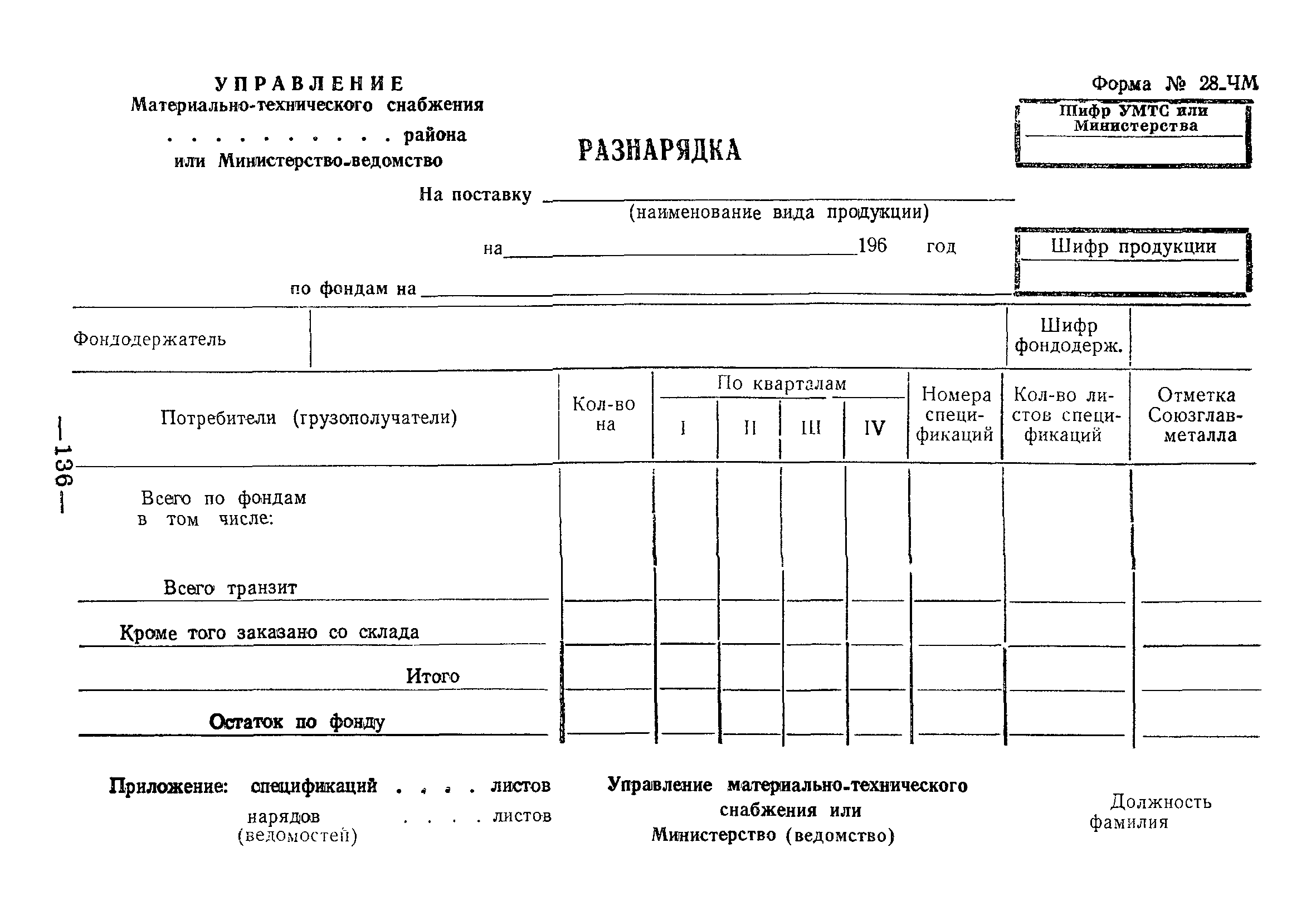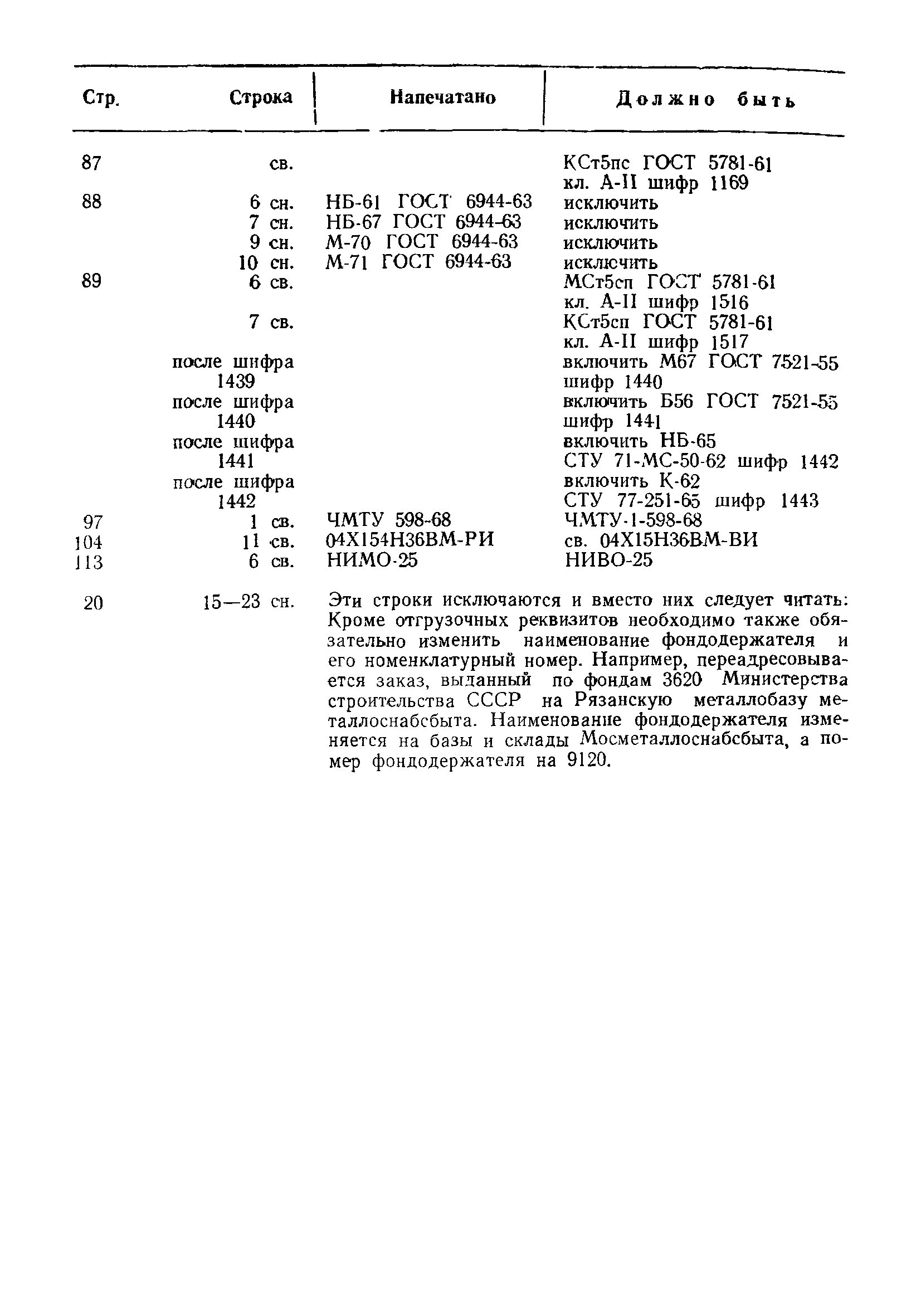 | Оглавление: | 1 Общие положения 2 Распределение фондов и доведение их до Союзглавметала и территориальных органов 3 Порядок передачи фондов на металлопродукцию по межминистерской кооперации 4 Порядок составления и представления спецификаций, заказов, совмещенных со спецификацией, и нарядов 5 По отделу сортового проката 6 По отделу рельсобалочной продукции 7 По отделу листового проката 8 По отделу качественного сортового проката 9 По отделу чугунов и ферросплавов 10 По отделу стальных и чугунных труб 11 По отделу качественных металлоизделий 12 По отделу гвоздильно-проволочных и крепежных изделий 13 По отделу металлотходов, некондиционной металлопродукции и МВР Приложения |