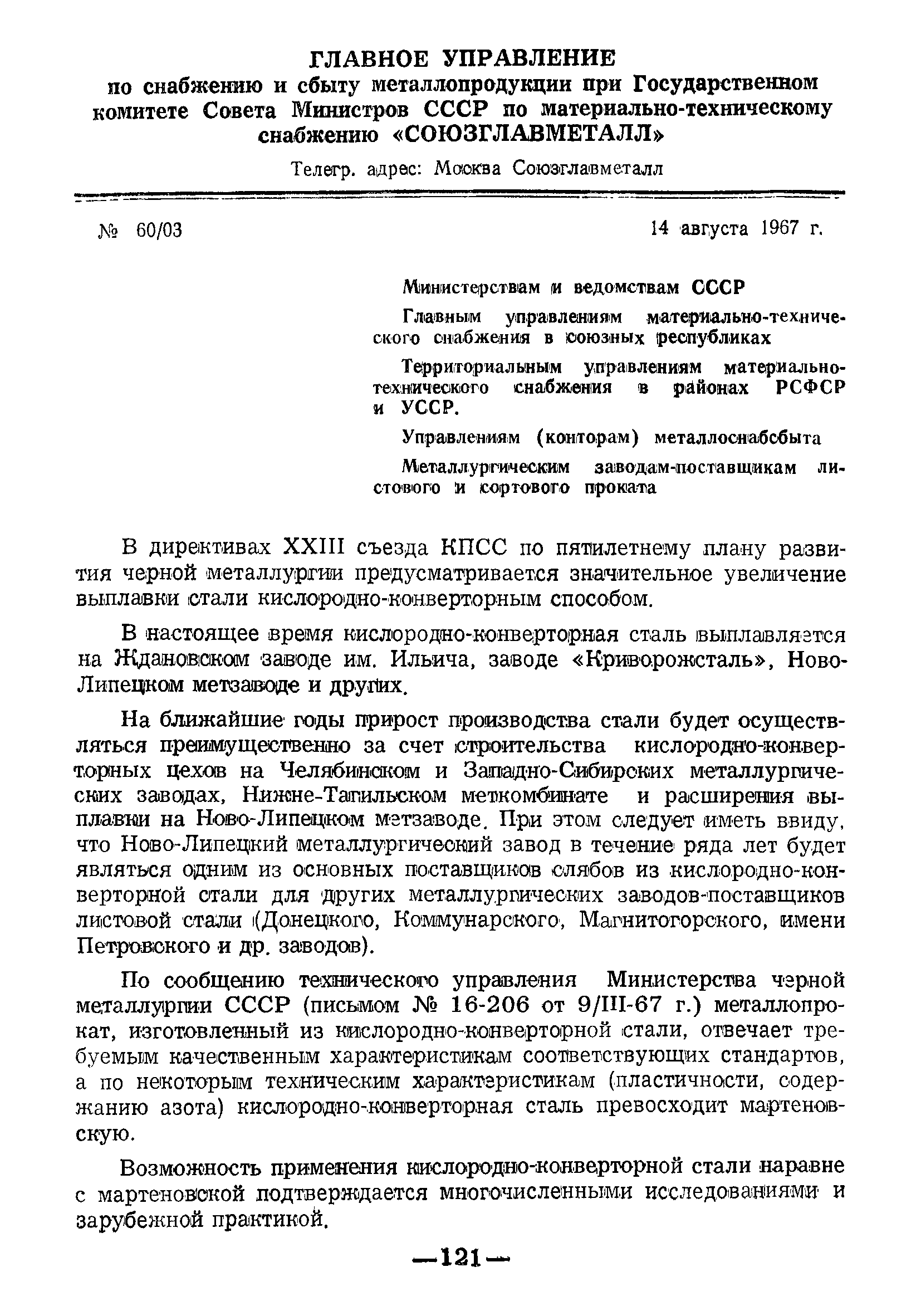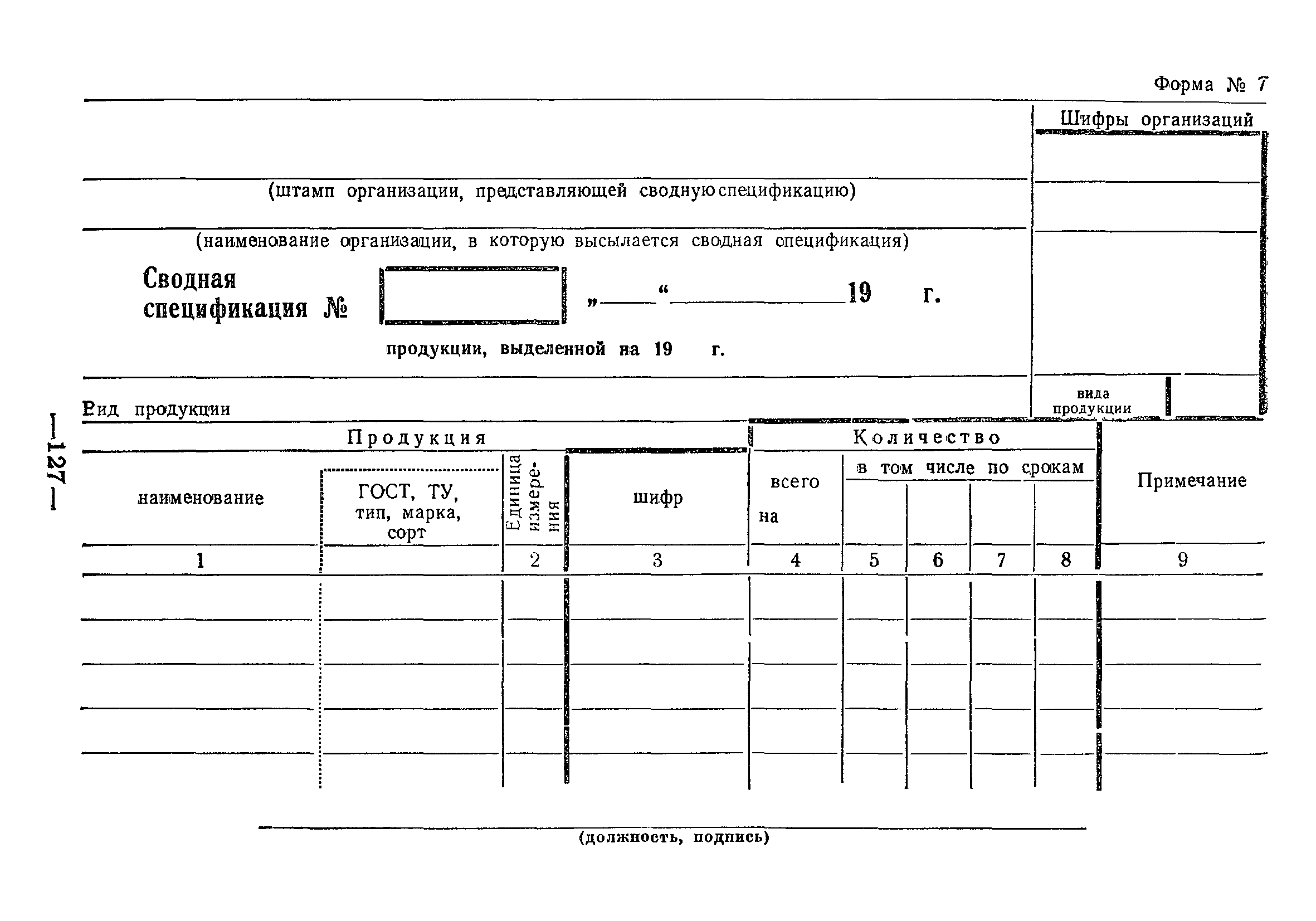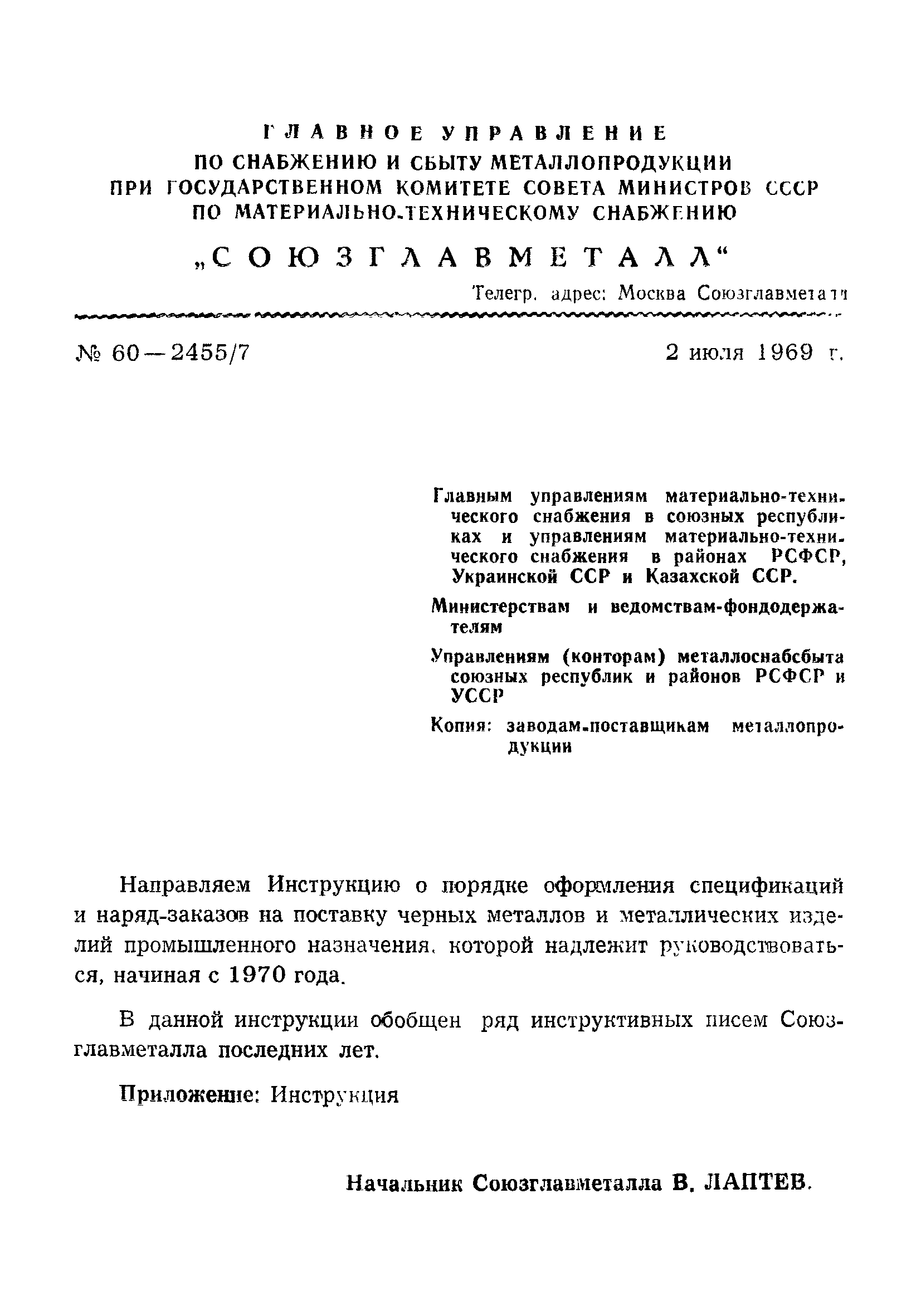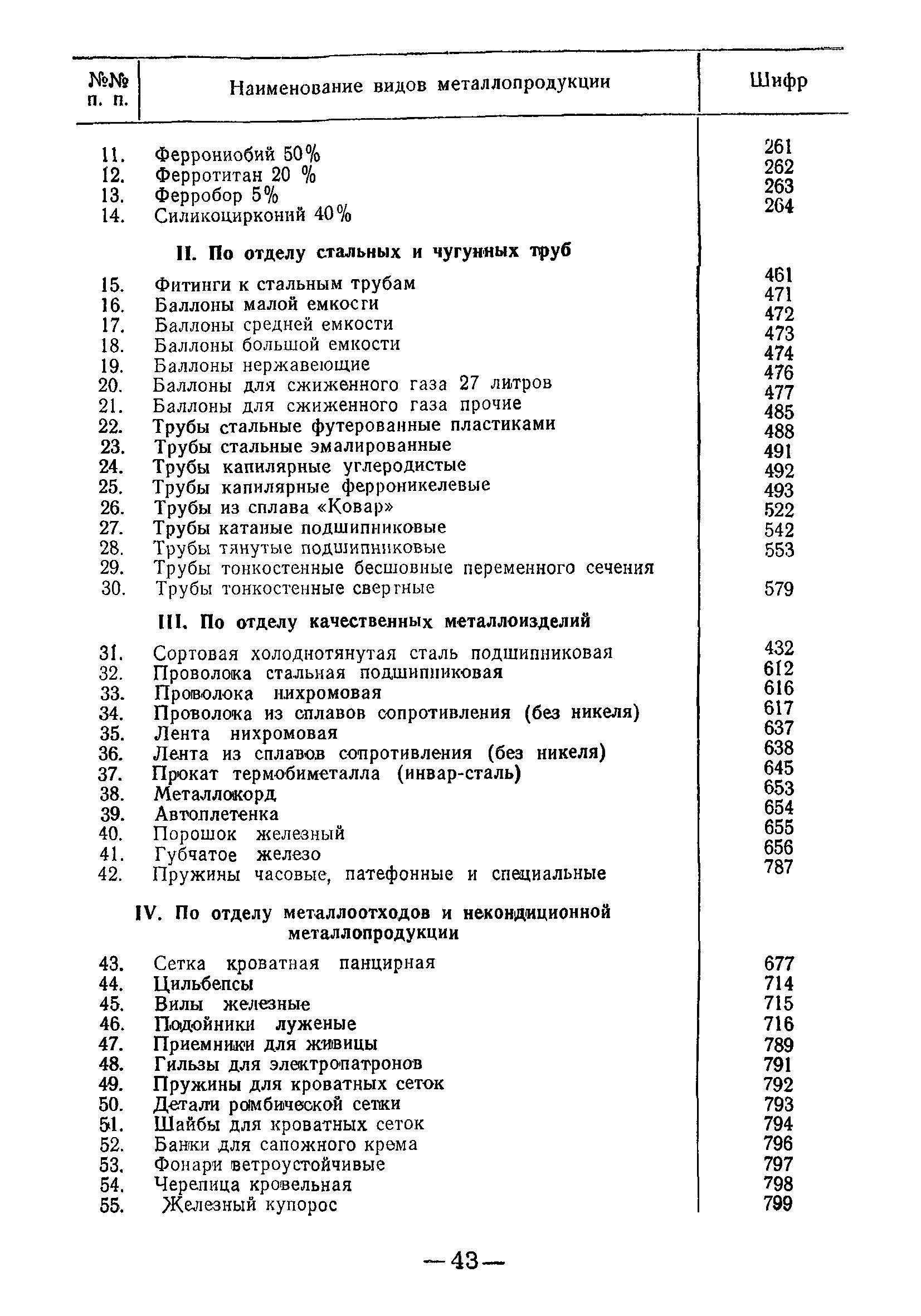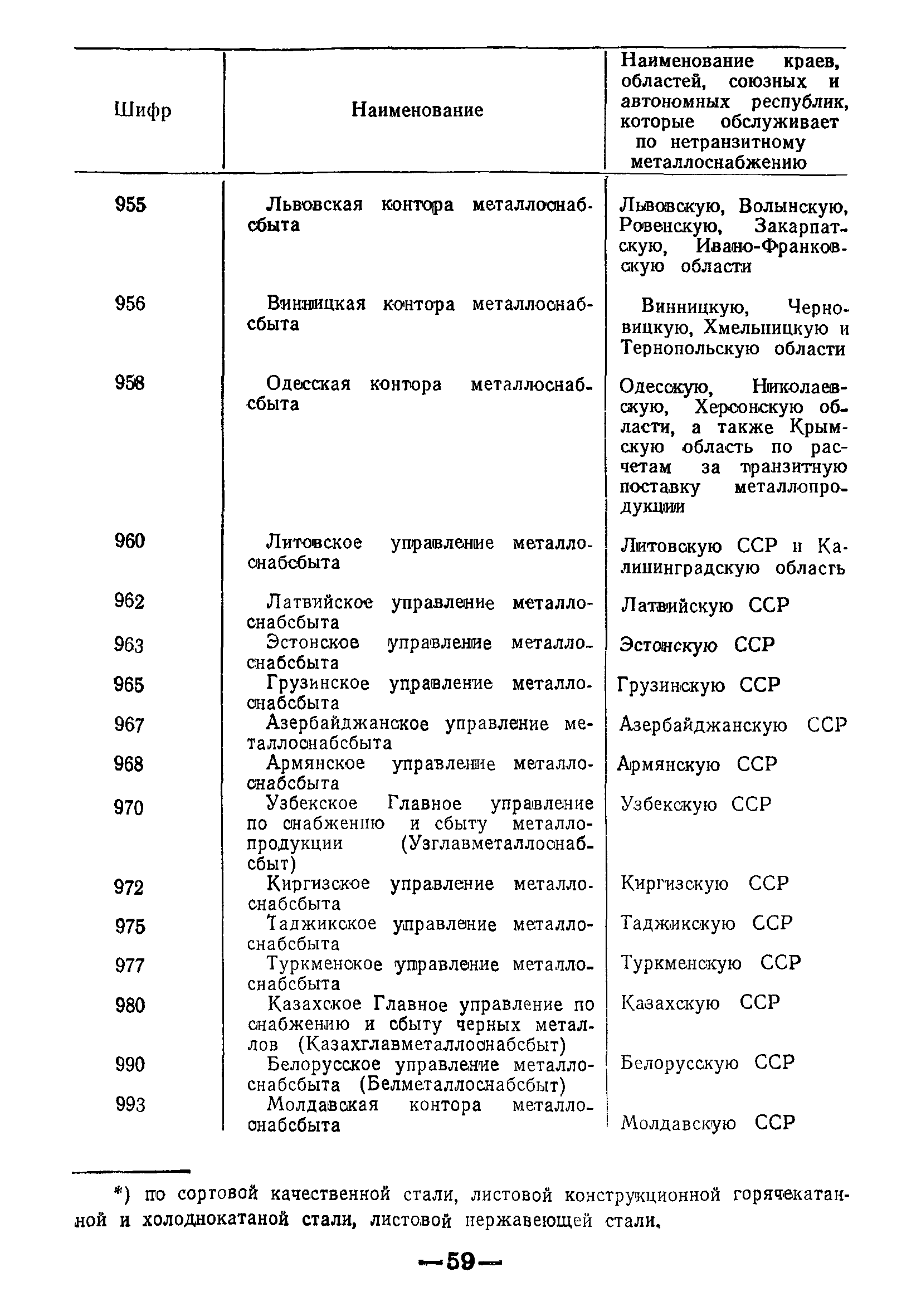 | Оглавление: | 1 Общие положения 2 Распределение фондов и доведение их до Союзглавметала и территориальных органов 3 Порядок передачи фондов на металлопродукцию по межминистерской кооперации 4 Порядок составления и представления спецификаций, заказов, совмещенных со спецификацией, и нарядов 5 По отделу сортового проката 6 По отделу рельсобалочной продукции 7 По отделу листового проката 8 По отделу качественного сортового проката 9 По отделу чугунов и ферросплавов 10 По отделу стальных и чугунных труб 11 По отделу качественных металлоизделий 12 По отделу гвоздильно-проволочных и крепежных изделий 13 По отделу металлотходов, некондиционной металлопродукции и МВР Приложения |