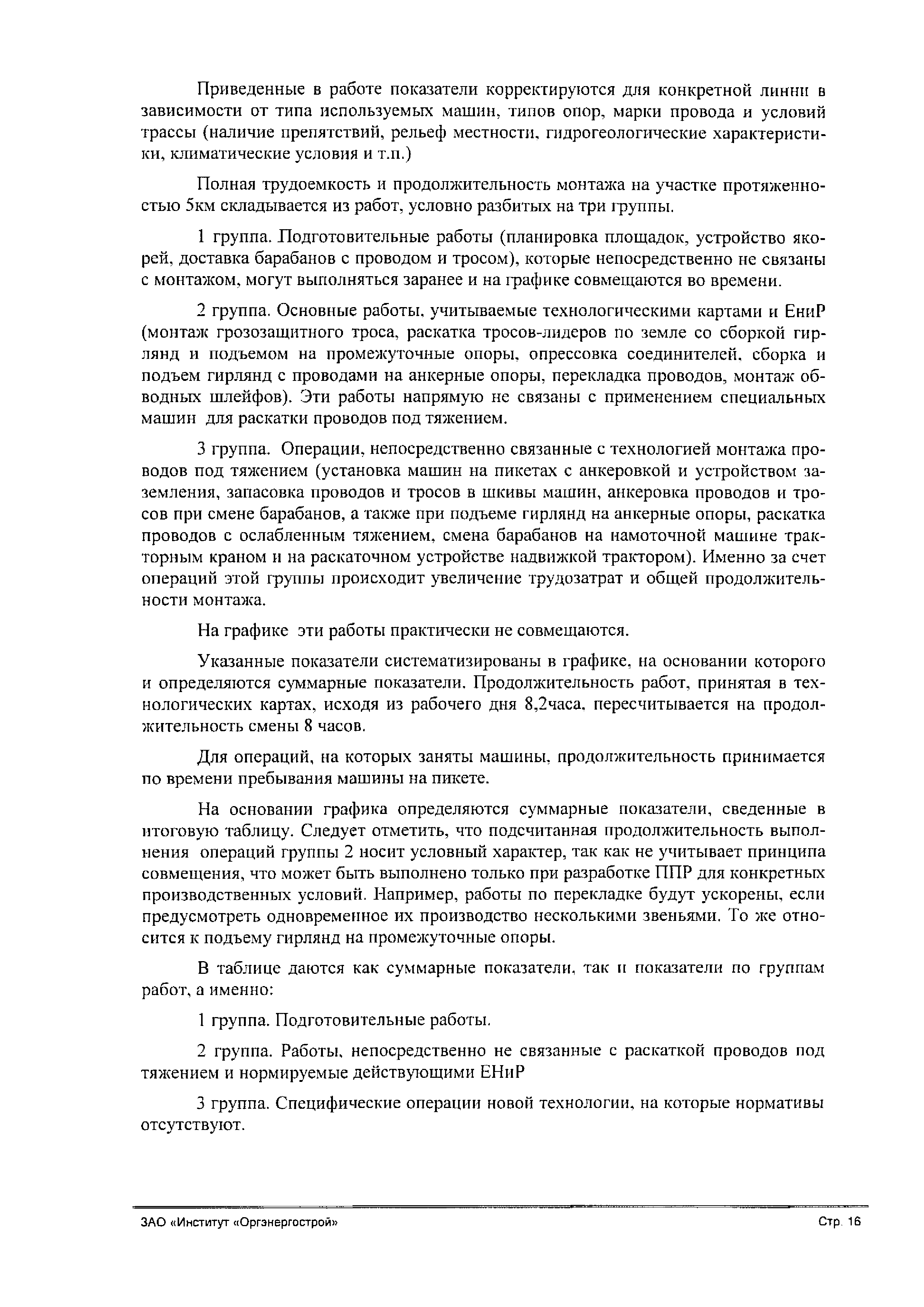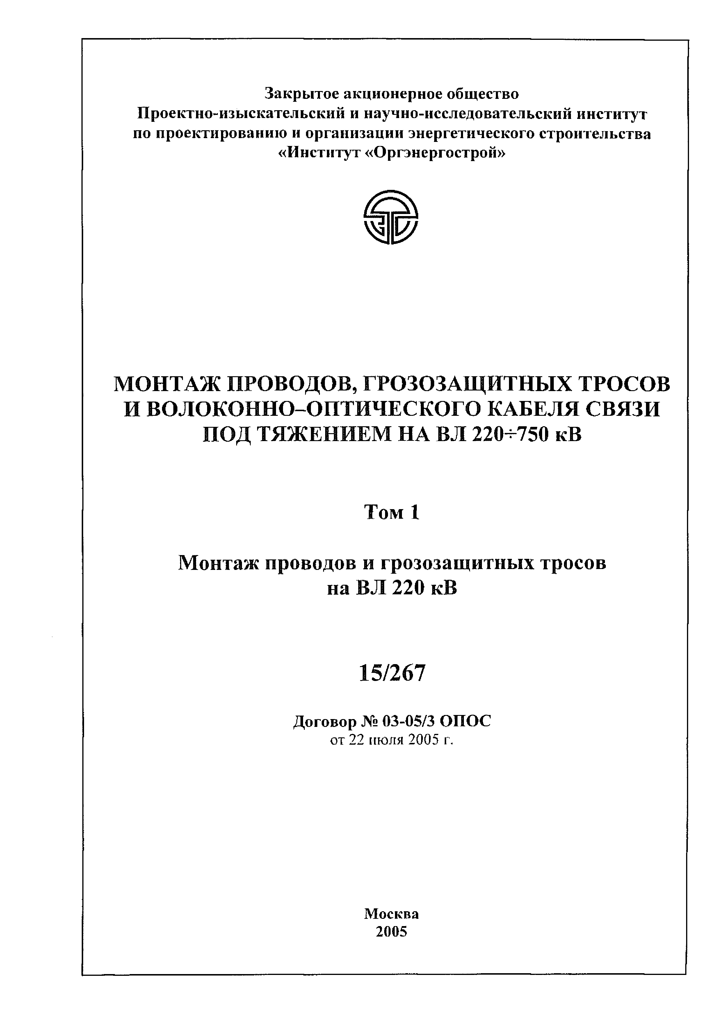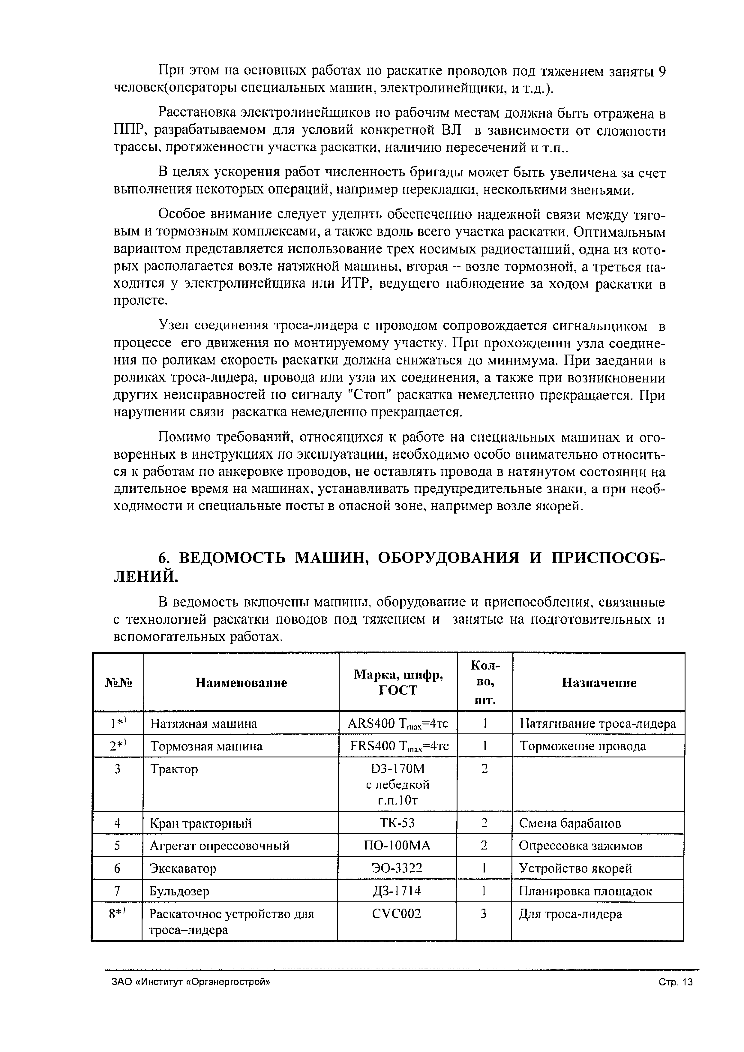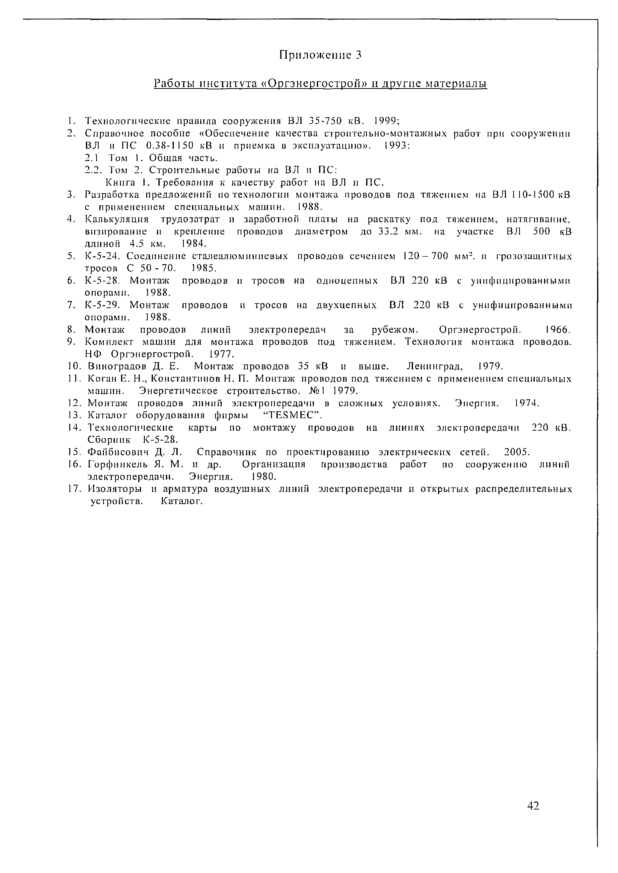 | Оглавление: | 1. Общая часть 2. Исходные данные 3. Принципиальная технологическая схема 4. Особенности производства работ 5. Организация работ 6. Ведомость машин, оборудования и приспособлений 7. Технико-экономические показатели Чертежи и схемы Рисунок 1 — Одноцепные опоры ВЛ 220 кВ Рисунок 2 — Раскатка тросов трактором с подъемом на опоры Рисунок 3 — Расстановка монтажного оборудования Рисунок 4 — Последовательность монтажа проводов под тяжением Рисунок 5 — Узлы Рисунок 6— Узлы Рисунок 7— Якорь Q=5тс Приложение 1. Технические характеристики изделий фирмы "TESMEC S.p.А", указанные в работе Приложение 2. Перечень нормативных документов Приложение 3. Перечень работ института "Оргэнергострой", ссылочные материалы |
