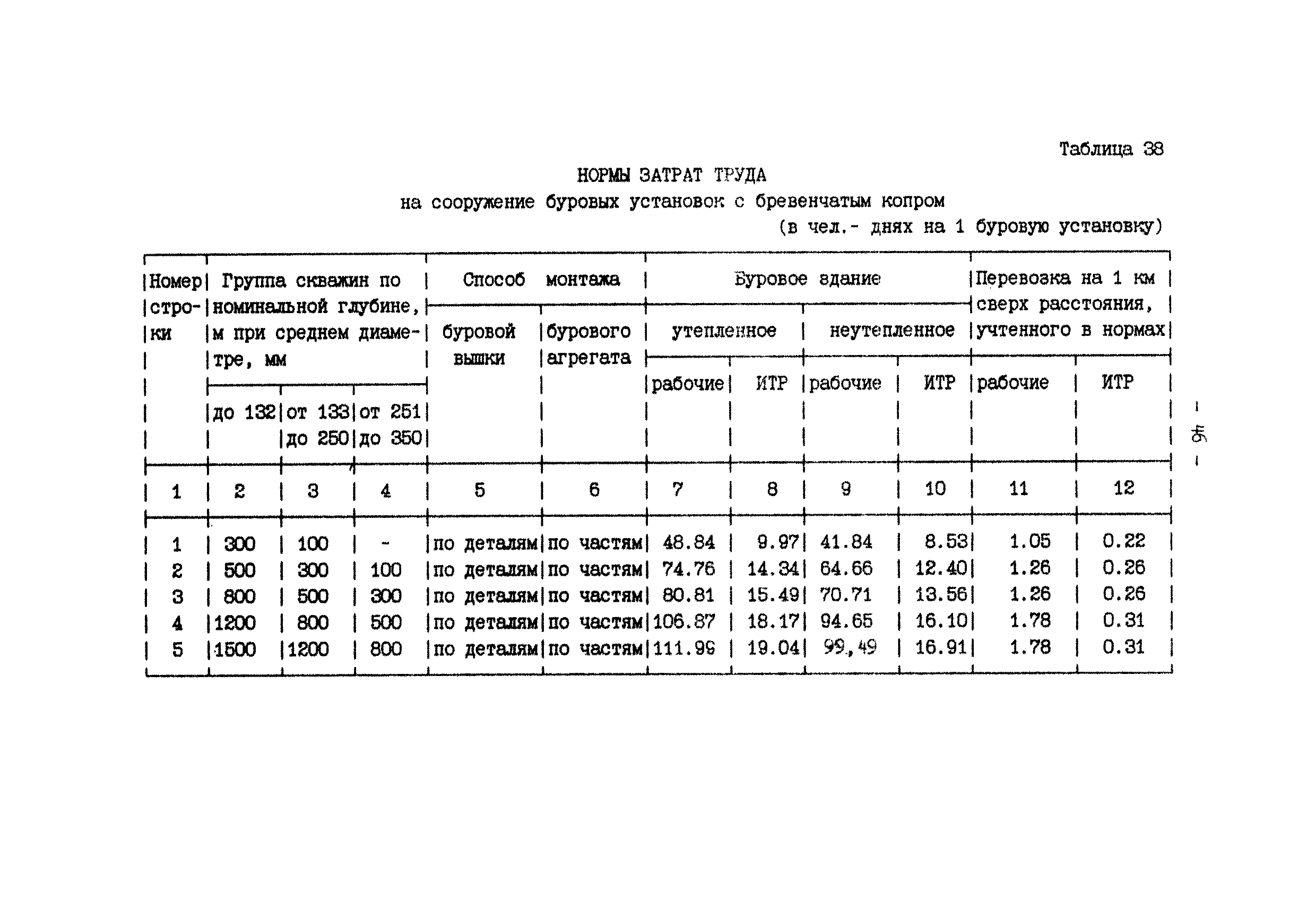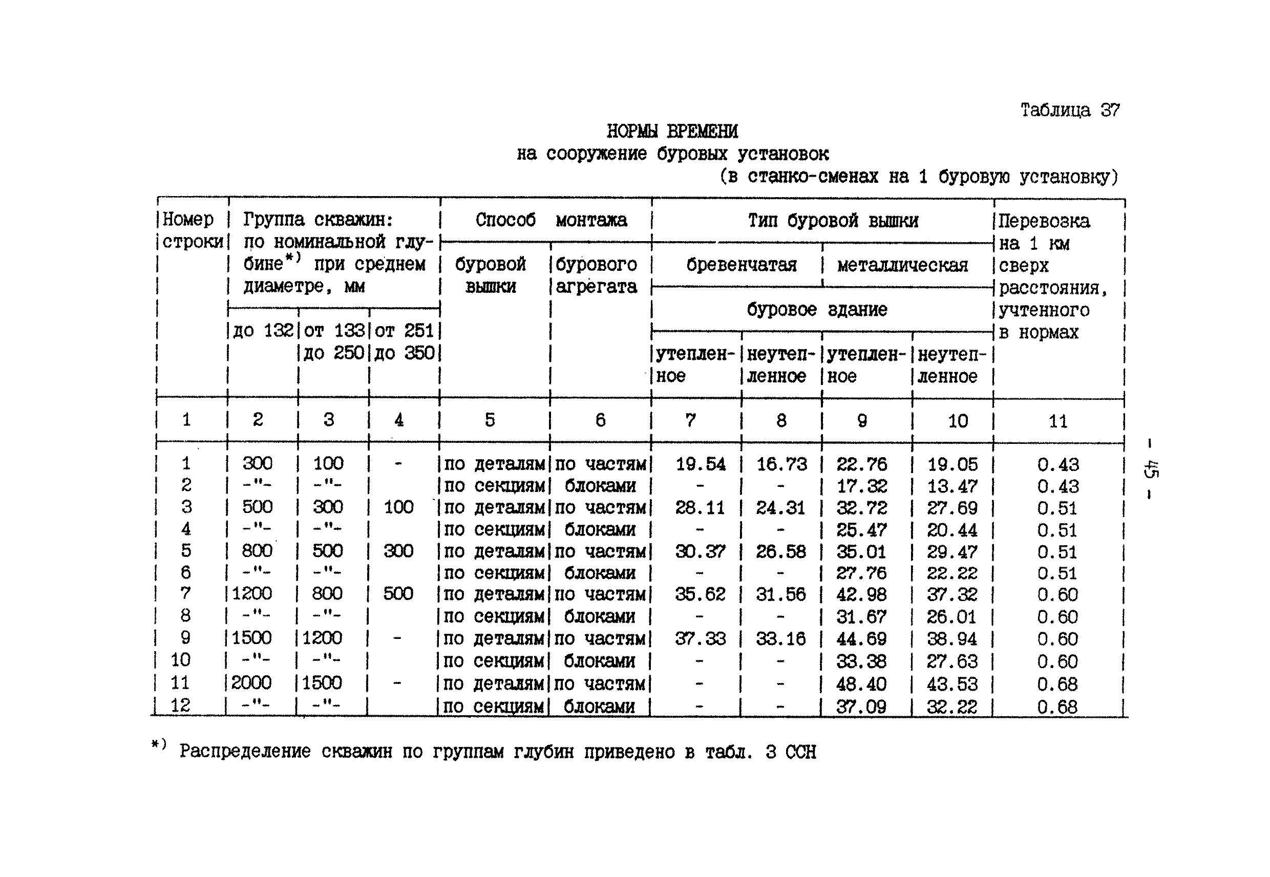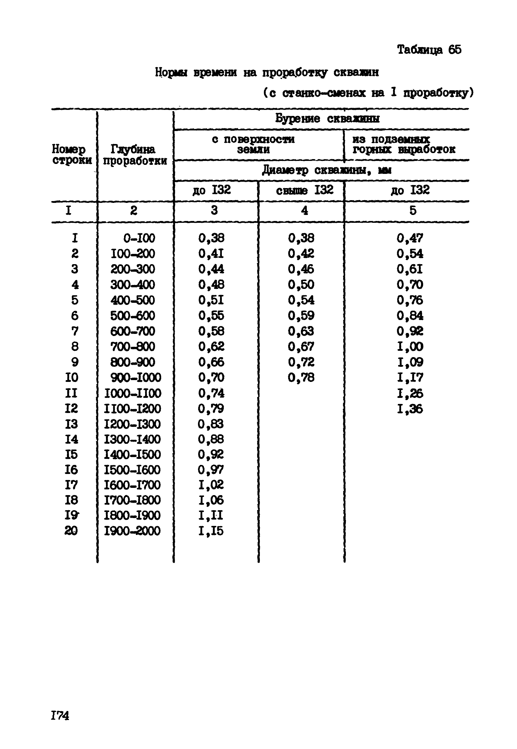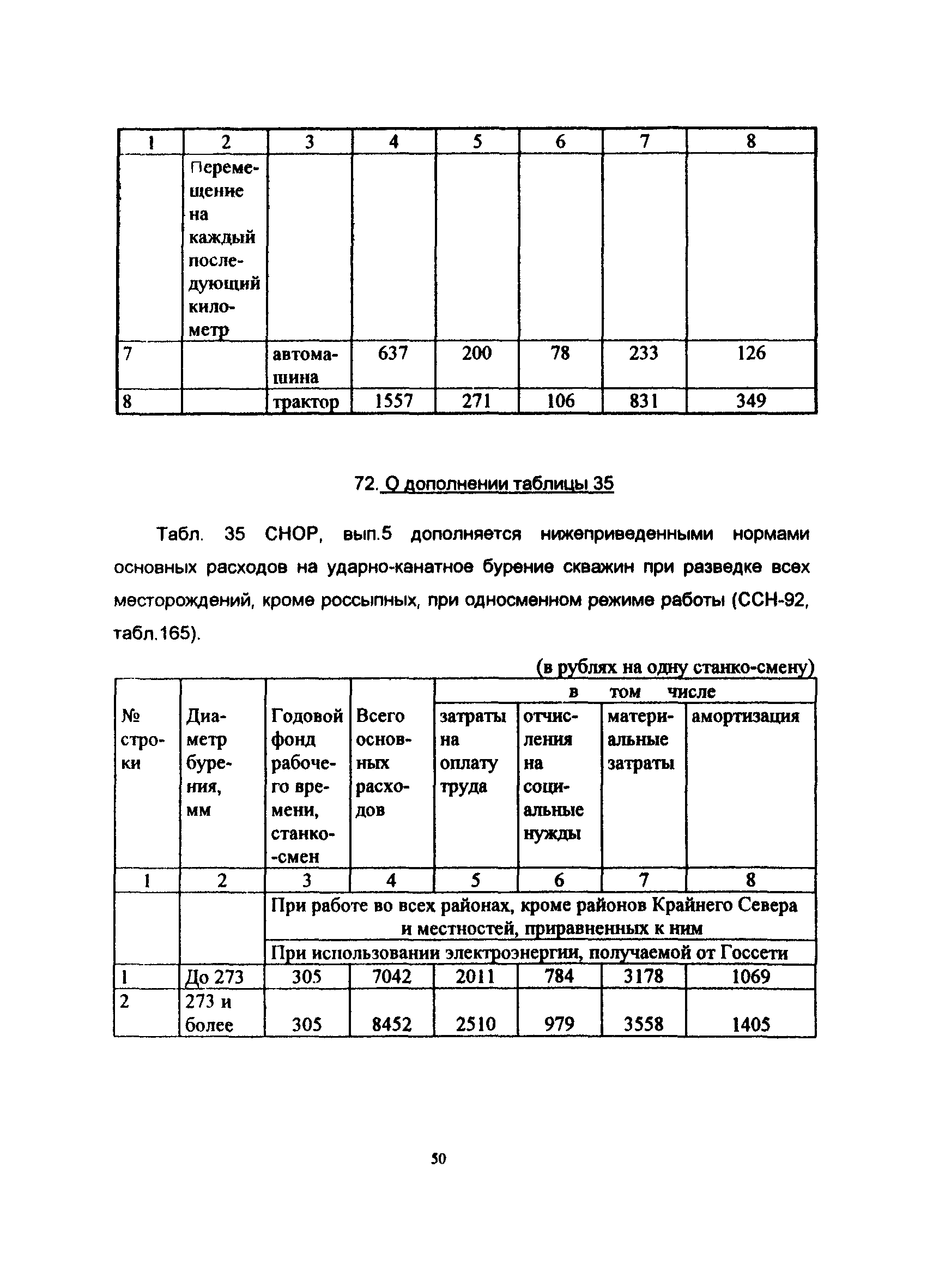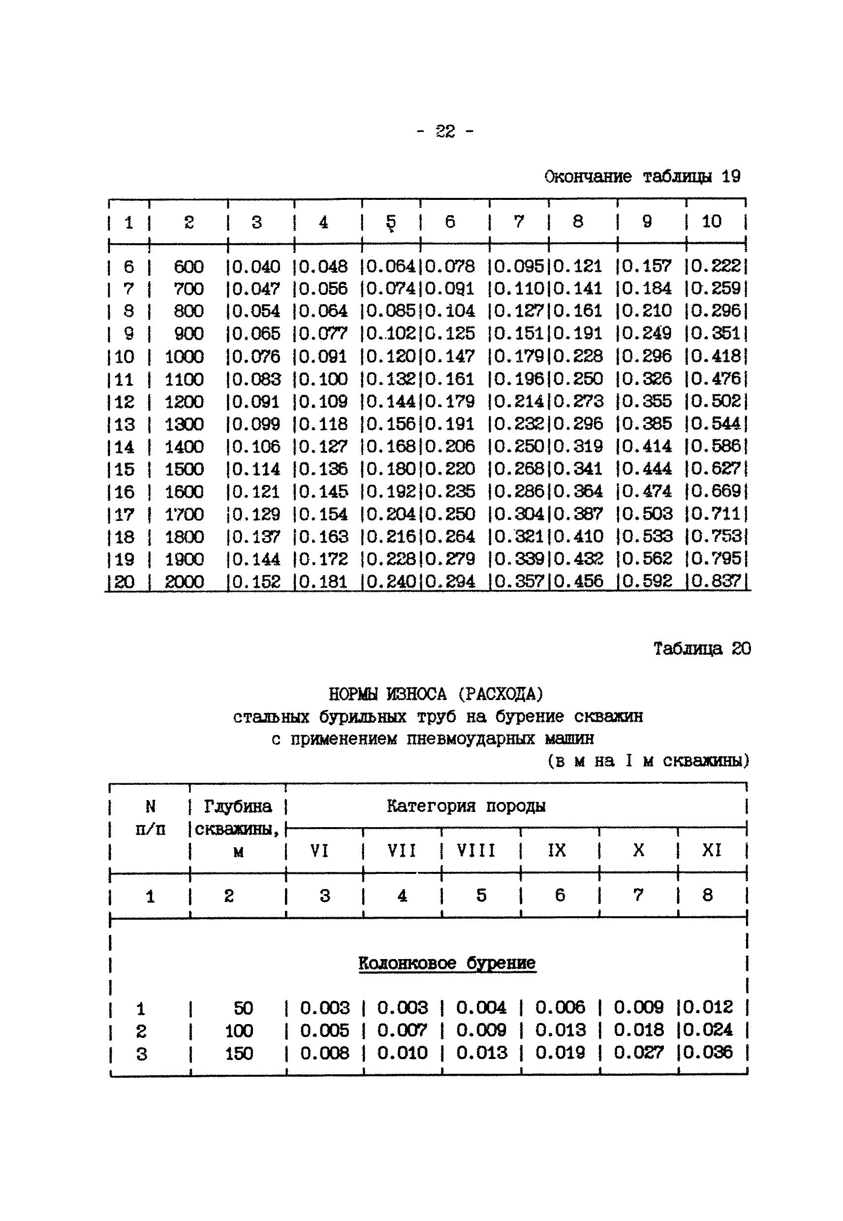 | Оглавление: | Введение Общие положения. Нормы амортизационных отчислений (табл. 1) Коэффициенты на резерв бурового оборудования (табл. 2) Сметные нормы Глава I. Вращательное механическое бурение Показатели, определяющие группу скважин по номинальной глубине (табл. 3) Поправочные коэффициенты к нормам времени на вращательное механическое бурение (табл. 4) Нормы времени на колонковое бурение скважин стационарными, передвижными и самоходными буровыми установками с вращателем шпиндельного типа с поверхности земли (табл. 5) Техническая характеристика по типам снарядов (табл. 6) Классификация горных пород по трещиноватости (табл. 7) Нормы времени на бурение скважин комплексами технических средств со съемными керноприемниками: ССК (табл. 8) КССК (табл. 9) Нормы времени на колонковое бурение самоходными буровыми установками с вращателем роторного типа (табл. 10) Нормы времени на бескерновое бурение скважин стационарными, передвижными и самоходными буровыми установками с поверхности земли (табл. 11) Нормы времени на колонковое бурение из подземных горных выработок (табл. 12) Нормы времени на бескерновое бурение из подземных горных выработок (табл. 13) Нормы затрат труда инженерно—технических работников на бурение вращательным механическим способом передвижения, стационарными и самоходными буровыми установками (табл. 14) Нормы затрат труда рабочих на бурение вращательным механическим способом передвижными, стационарными и самоходными буровыми установками (табл. 15) Нормы затрат труда рабочих на бурение самоходными буровыми установками (табл. 16) Нормы затрат труда рабочих на бурение из подземных горных выработок (табл. 17) Нормы затрат транспорта на бурение передвижными, стационарными и самоходными буровыми установками ( табл. 18) Нормы расхода материалов на вращательное механическое бурение с поверхности земли и из подземных горных выработок Нормы расхода природных алмазов на бурение одинарными колонковыми снарядами (табл. 19) Нормы расхода синтетических алмазов на бурение одинарными колонковыми снарядами (табл. 20) Поправочные коэффициенты к нормам расхода алмазов (табл. 21) Нормы расхода природных алмазов на бурение скважин снарядами со съемными керноприемниками (табл. 22) Нормы расхода твердосплавных коронок (табл. 23) Нормы расхода долот (табл. 24) Нормы расхода керновых ящиков (табл. 25) Нормы расхода промывочной жидкости (табл. 26) Нормы расхода стального каната (табл. 27) Нормы расхода горюче-смазочных материалов (табл. 28) Нормы расхода электроэнергии на бурение скважин с поверхности земли (табл. 29) Нормы расхода электроэнергии на бурение скважин из подземных горных выработок (табл. 30) Нормы расхода колонковых труб (табл. 31) Нормы расхода ниппелей для колонковых труб (табл. 32) Нормы расхода двойных переходников (табл. 33) Нормы расхода колонковых труб на бурение ССК—59 и КССК—76 (табл. 34) Нормы расхода прочих материалов на бурение с поверхности земли (табл. 35) Нормы расхода прочих материалов на бурение из подземных горных выработок (табл. 36) Перечень бурового оборудования на бурение стационарными и передвижными буровыми установками с вращателем шпиндельного типа (табл. 37) Перечень бурового оборудования при бурение самоходными буровыми установками о вращателем роторного типа (табл. 38) Перечень бурового оборудования на бурение самоходными буров