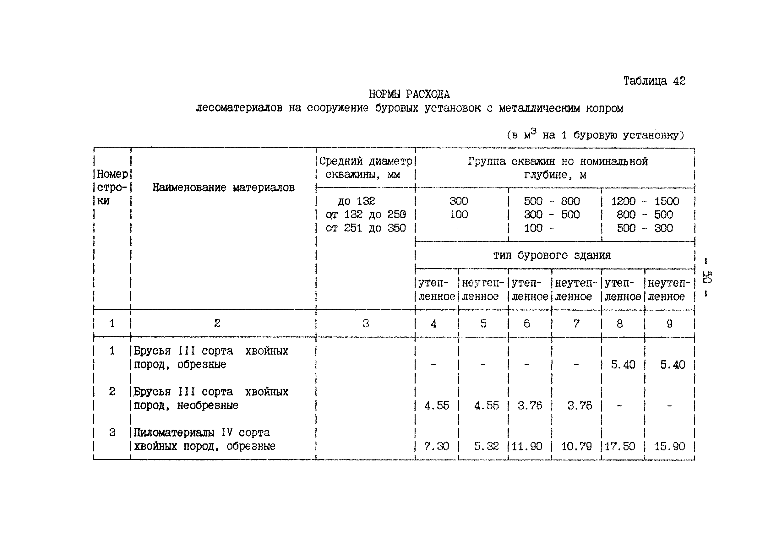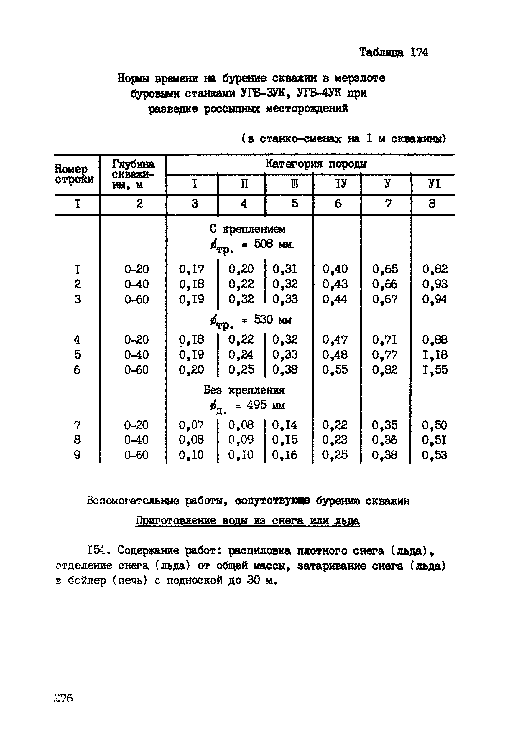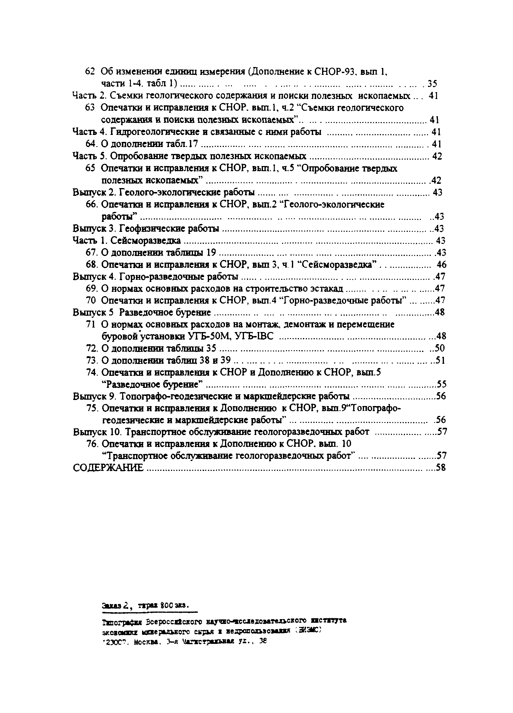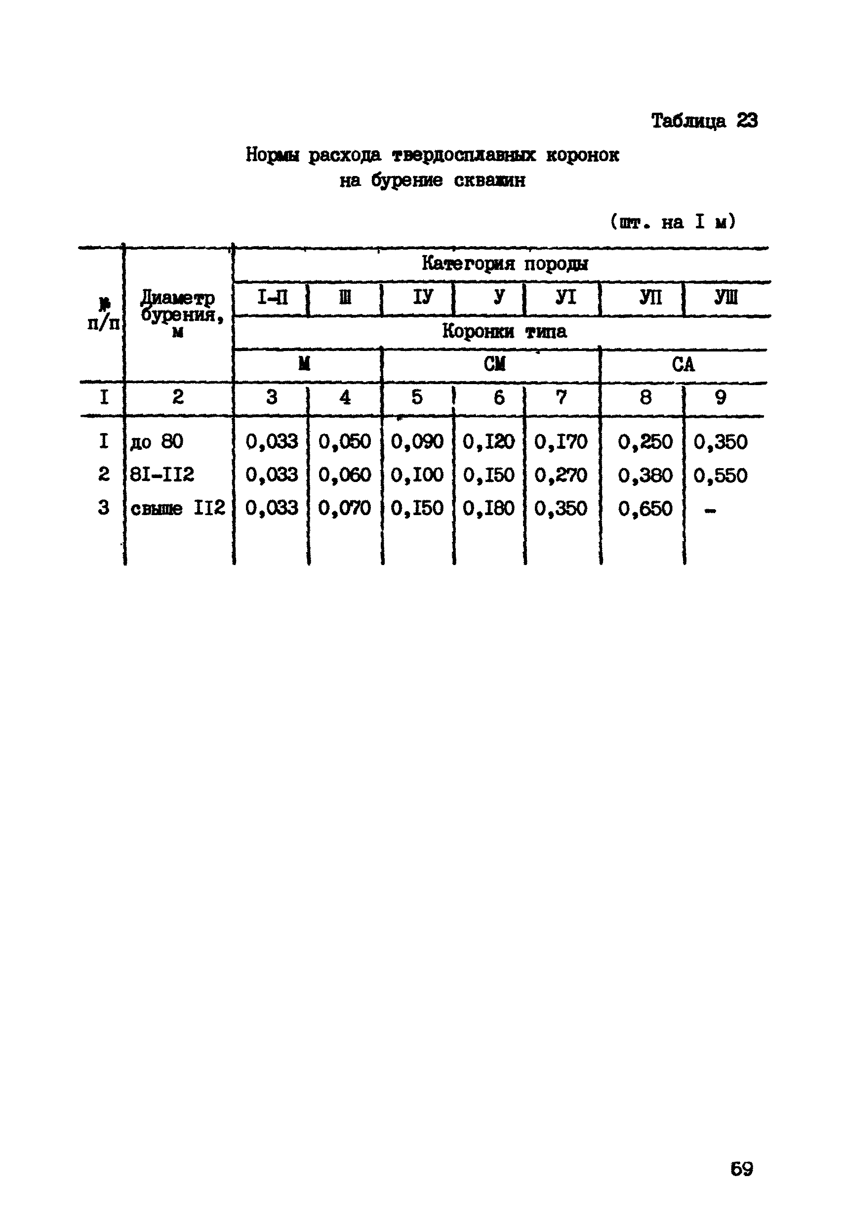 | Оглавление: | Введение Общие положения. Нормы амортизационных отчислений (табл. 1) Коэффициенты на резерв бурового оборудования (табл. 2) Сметные нормы Глава I. Вращательное механическое бурение Показатели, определяющие группу скважин по номинальной глубине (табл. 3) Поправочные коэффициенты к нормам времени на вращательное механическое бурение (табл. 4) Нормы времени на колонковое бурение скважин стационарными, передвижными и самоходными буровыми установками с вращателем шпиндельного типа с поверхности земли (табл. 5) Техническая характеристика по типам снарядов (табл. 6) Классификация горных пород по трещиноватости (табл. 7) Нормы времени на бурение скважин комплексами технических средств со съемными керноприемниками: ССК (табл. 8) КССК (табл. 9) Нормы времени на колонковое бурение самоходными буровыми установками с вращателем роторного типа (табл. 10) Нормы времени на бескерновое бурение скважин стационарными, передвижными и самоходными буровыми установками с поверхности земли (табл. 11) Нормы времени на колонковое бурение из подземных горных выработок (табл. 12) Нормы времени на бескерновое бурение из подземных горных выработок (табл. 13) Нормы затрат труда инженерно—технических работников на бурение вращательным механическим способом передвижения, стационарными и самоходными буровыми установками (табл. 14) Нормы затрат труда рабочих на бурение вращательным механическим способом передвижными, стационарными и самоходными буровыми установками (табл. 15) Нормы затрат труда рабочих на бурение самоходными буровыми установками (табл. 16) Нормы затрат труда рабочих на бурение из подземных горных выработок (табл. 17) Нормы затрат транспорта на бурение передвижными, стационарными и самоходными буровыми установками ( табл. 18) Нормы расхода материалов на вращательное механическое бурение с поверхности земли и из подземных горных выработок Нормы расхода природных алмазов на бурение одинарными колонковыми снарядами (табл. 19) Нормы расхода синтетических алмазов на бурение одинарными колонковыми снарядами (табл. 20) Поправочные коэффициенты к нормам расхода алмазов (табл. 21) Нормы расхода природных алмазов на бурение скважин снарядами со съемными керноприемниками (табл. 22) Нормы расхода твердосплавных коронок (табл. 23) Нормы расхода долот (табл. 24) Нормы расхода керновых ящиков (табл. 25) Нормы расхода промывочной жидкости (табл. 26) Нормы расхода стального каната (табл. 27) Нормы расхода горюче-смазочных материалов (табл. 28) Нормы расхода электроэнергии на бурение скважин с поверхности земли (табл. 29) Нормы расхода электроэнергии на бурение скважин из подземных горных выработок (табл. 30) Нормы расхода колонковых труб (табл. 31) Нормы расхода ниппелей для колонковых труб (табл. 32) Нормы расхода двойных переходников (табл. 33) Нормы расхода колонковых труб на бурение ССК—59 и КССК—76 (табл. 34) Нормы расхода прочих материалов на бурение с поверхности земли (табл. 35) Нормы расхода прочих материалов на бурение из подземных горных выработок (табл. 36) Перечень бурового оборудования на бурение стационарными и передвижными буровыми установками с вращателем шпиндельного типа (табл. 37) Перечень бурового оборудования при бурение самоходными буровыми установками о вращателем роторного типа (табл. 38) Перечень бурового оборудования на бурение самоходными буров