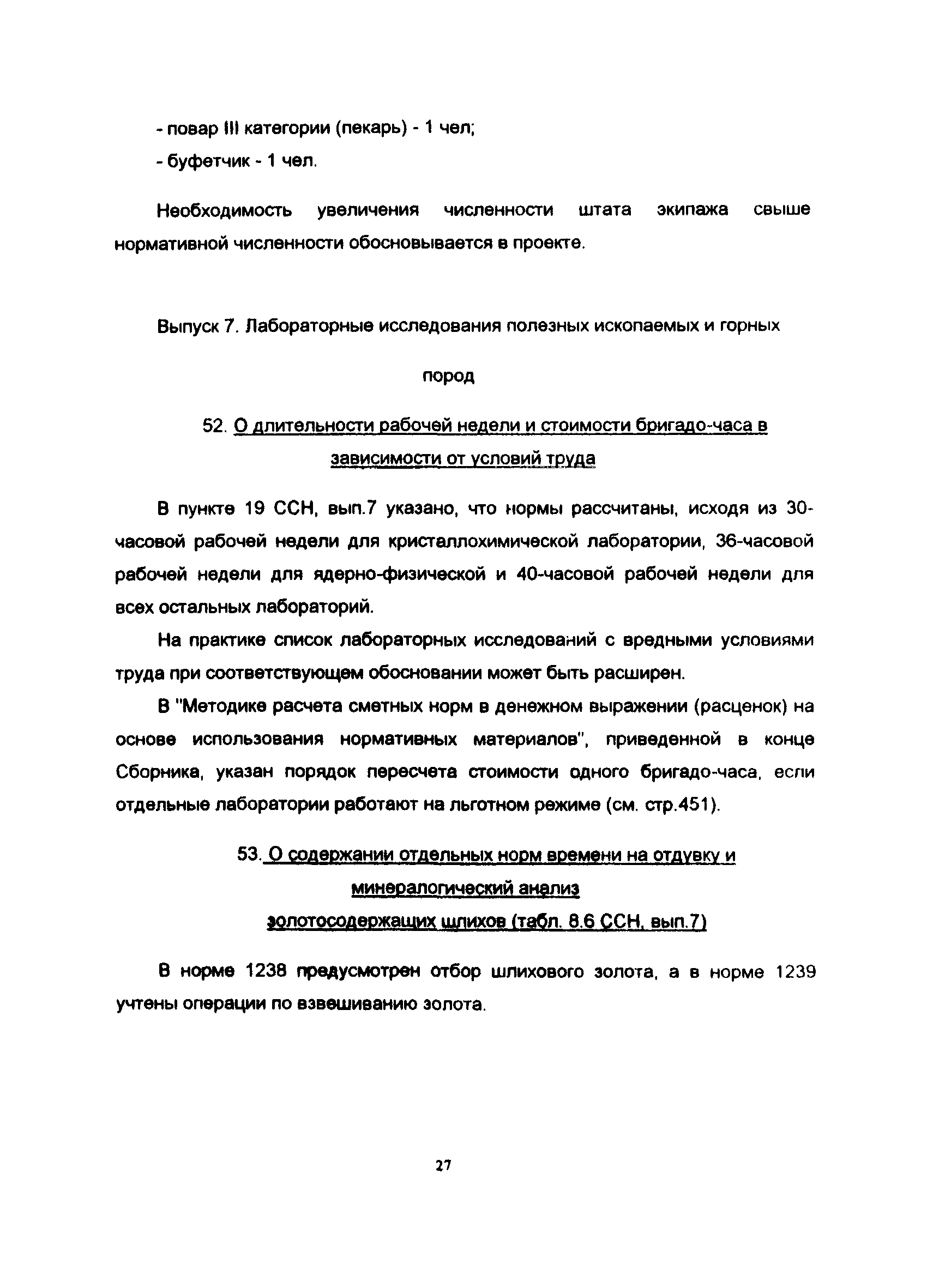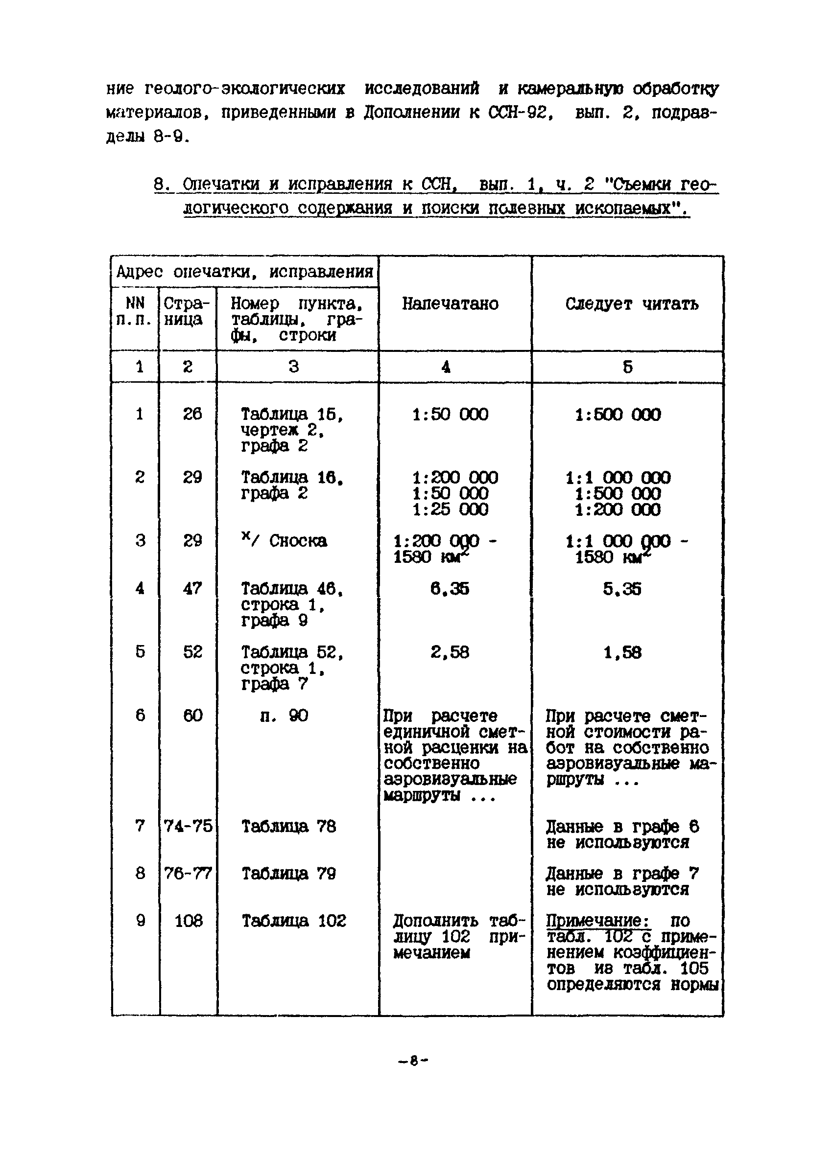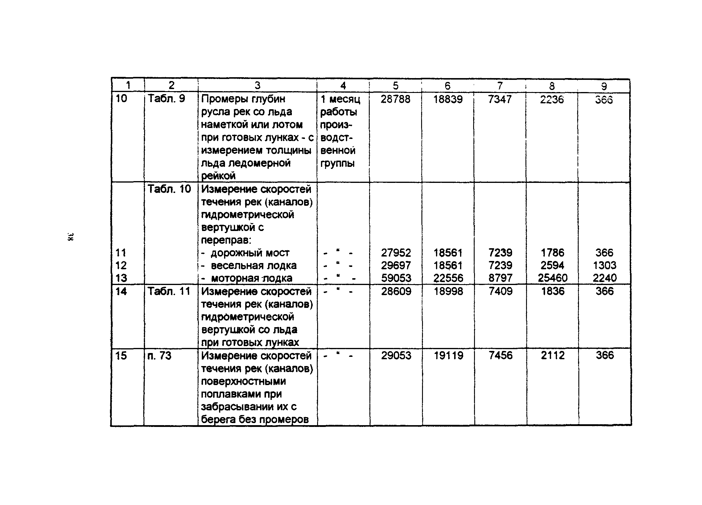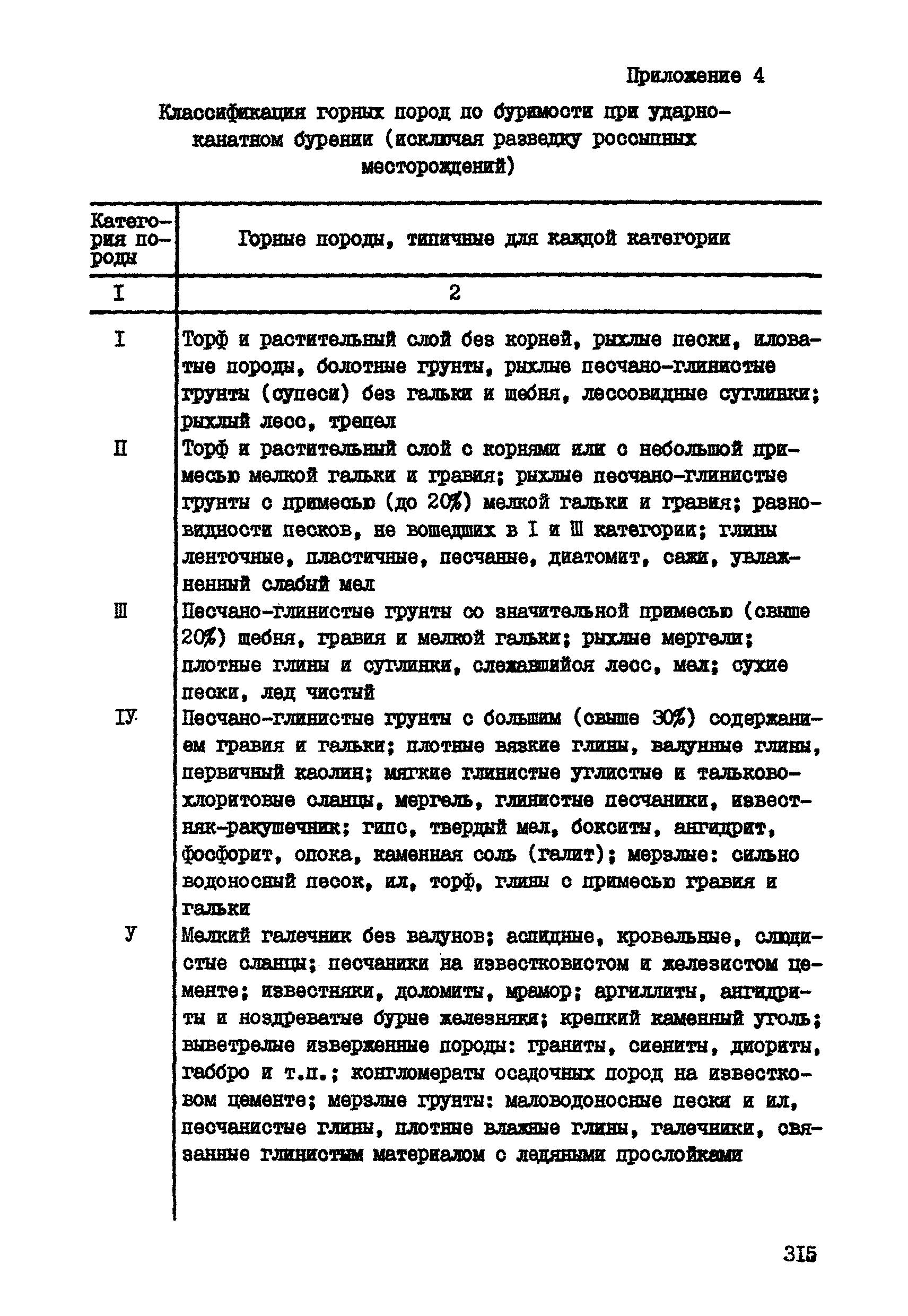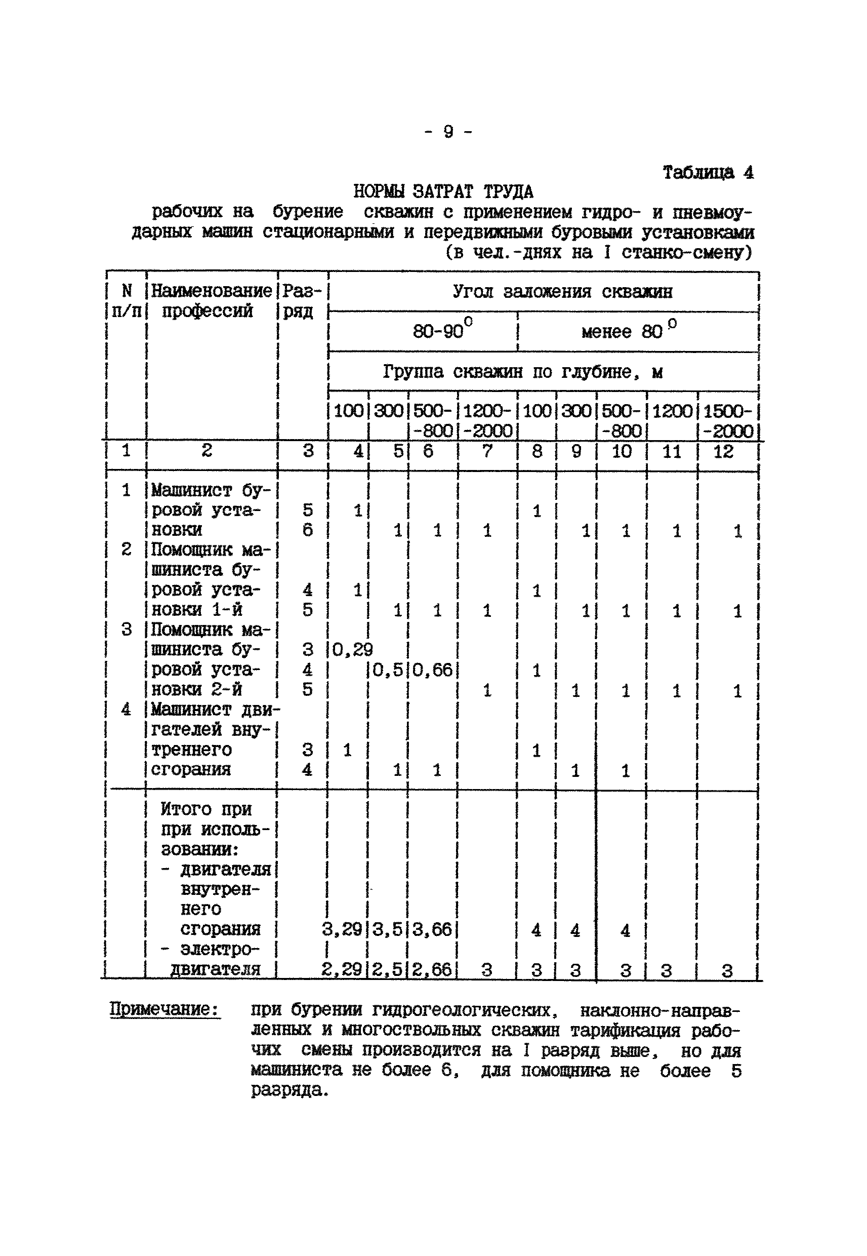 | Оглавление: | Введение Общие положения. Нормы амортизационных отчислений (табл. 1) Коэффициенты на резерв бурового оборудования (табл. 2) Сметные нормы Глава I. Вращательное механическое бурение Показатели, определяющие группу скважин по номинальной глубине (табл. 3) Поправочные коэффициенты к нормам времени на вращательное механическое бурение (табл. 4) Нормы времени на колонковое бурение скважин стационарными, передвижными и самоходными буровыми установками с вращателем шпиндельного типа с поверхности земли (табл. 5) Техническая характеристика по типам снарядов (табл. 6) Классификация горных пород по трещиноватости (табл. 7) Нормы времени на бурение скважин комплексами технических средств со съемными керноприемниками: ССК (табл. 8) КССК (табл. 9) Нормы времени на колонковое бурение самоходными буровыми установками с вращателем роторного типа (табл. 10) Нормы времени на бескерновое бурение скважин стационарными, передвижными и самоходными буровыми установками с поверхности земли (табл. 11) Нормы времени на колонковое бурение из подземных горных выработок (табл. 12) Нормы времени на бескерновое бурение из подземных горных выработок (табл. 13) Нормы затрат труда инженерно—технических работников на бурение вращательным механическим способом передвижения, стационарными и самоходными буровыми установками (табл. 14) Нормы затрат труда рабочих на бурение вращательным механическим способом передвижными, стационарными и самоходными буровыми установками (табл. 15) Нормы затрат труда рабочих на бурение самоходными буровыми установками (табл. 16) Нормы затрат труда рабочих на бурение из подземных горных выработок (табл. 17) Нормы затрат транспорта на бурение передвижными, стационарными и самоходными буровыми установками ( табл. 18) Нормы расхода материалов на вращательное механическое бурение с поверхности земли и из подземных горных выработок Нормы расхода природных алмазов на бурение одинарными колонковыми снарядами (табл. 19) Нормы расхода синтетических алмазов на бурение одинарными колонковыми снарядами (табл. 20) Поправочные коэффициенты к нормам расхода алмазов (табл. 21) Нормы расхода природных алмазов на бурение скважин снарядами со съемными керноприемниками (табл. 22) Нормы расхода твердосплавных коронок (табл. 23) Нормы расхода долот (табл. 24) Нормы расхода керновых ящиков (табл. 25) Нормы расхода промывочной жидкости (табл. 26) Нормы расхода стального каната (табл. 27) Нормы расхода горюче-смазочных материалов (табл. 28) Нормы расхода электроэнергии на бурение скважин с поверхности земли (табл. 29) Нормы расхода электроэнергии на бурение скважин из подземных горных выработок (табл. 30) Нормы расхода колонковых труб (табл. 31) Нормы расхода ниппелей для колонковых труб (табл. 32) Нормы расхода двойных переходников (табл. 33) Нормы расхода колонковых труб на бурение ССК—59 и КССК—76 (табл. 34) Нормы расхода прочих материалов на бурение с поверхности земли (табл. 35) Нормы расхода прочих материалов на бурение из подземных горных выработок (табл. 36) Перечень бурового оборудования на бурение стационарными и передвижными буровыми установками с вращателем шпиндельного типа (табл. 37) Перечень бурового оборудования при бурение самоходными буровыми установками о вращателем роторного типа (табл. 38) Перечень бурового оборудования на бурение самоходными буров