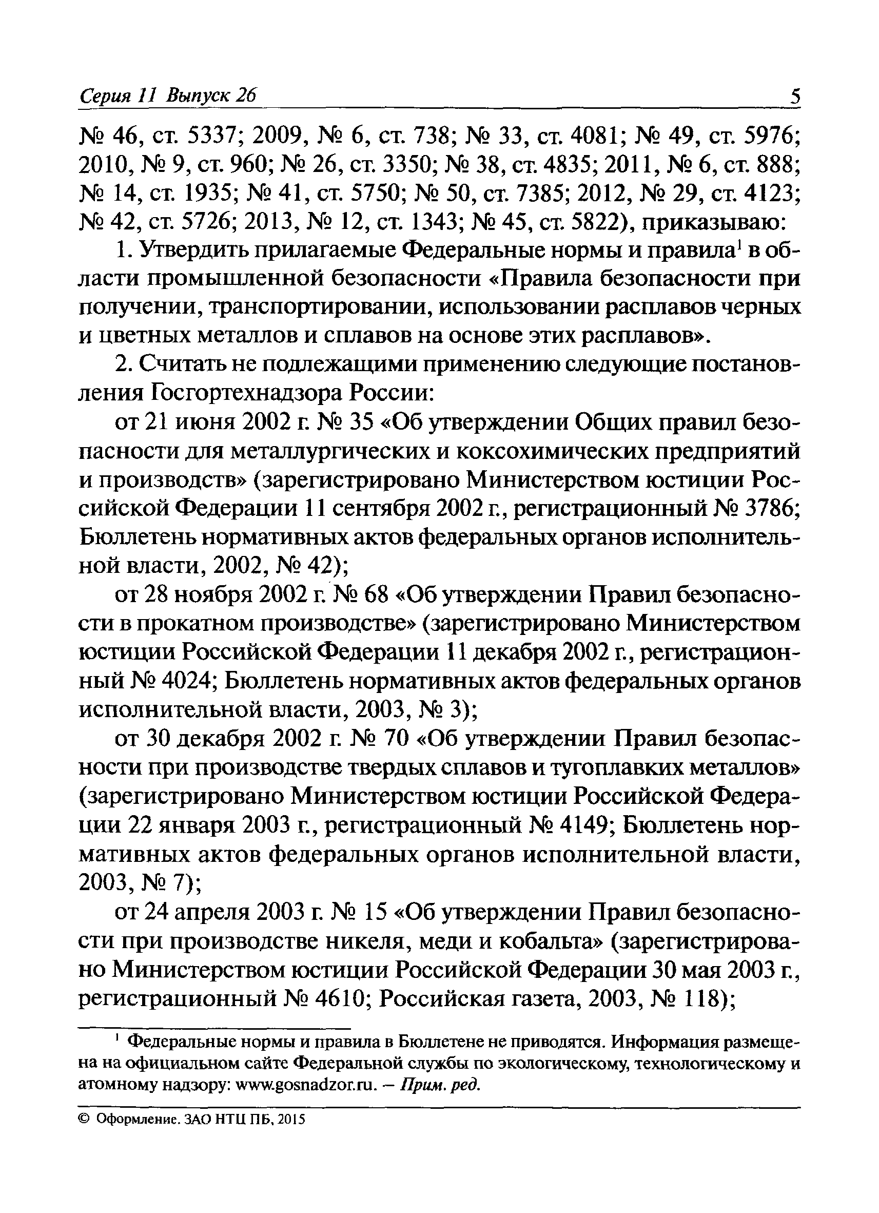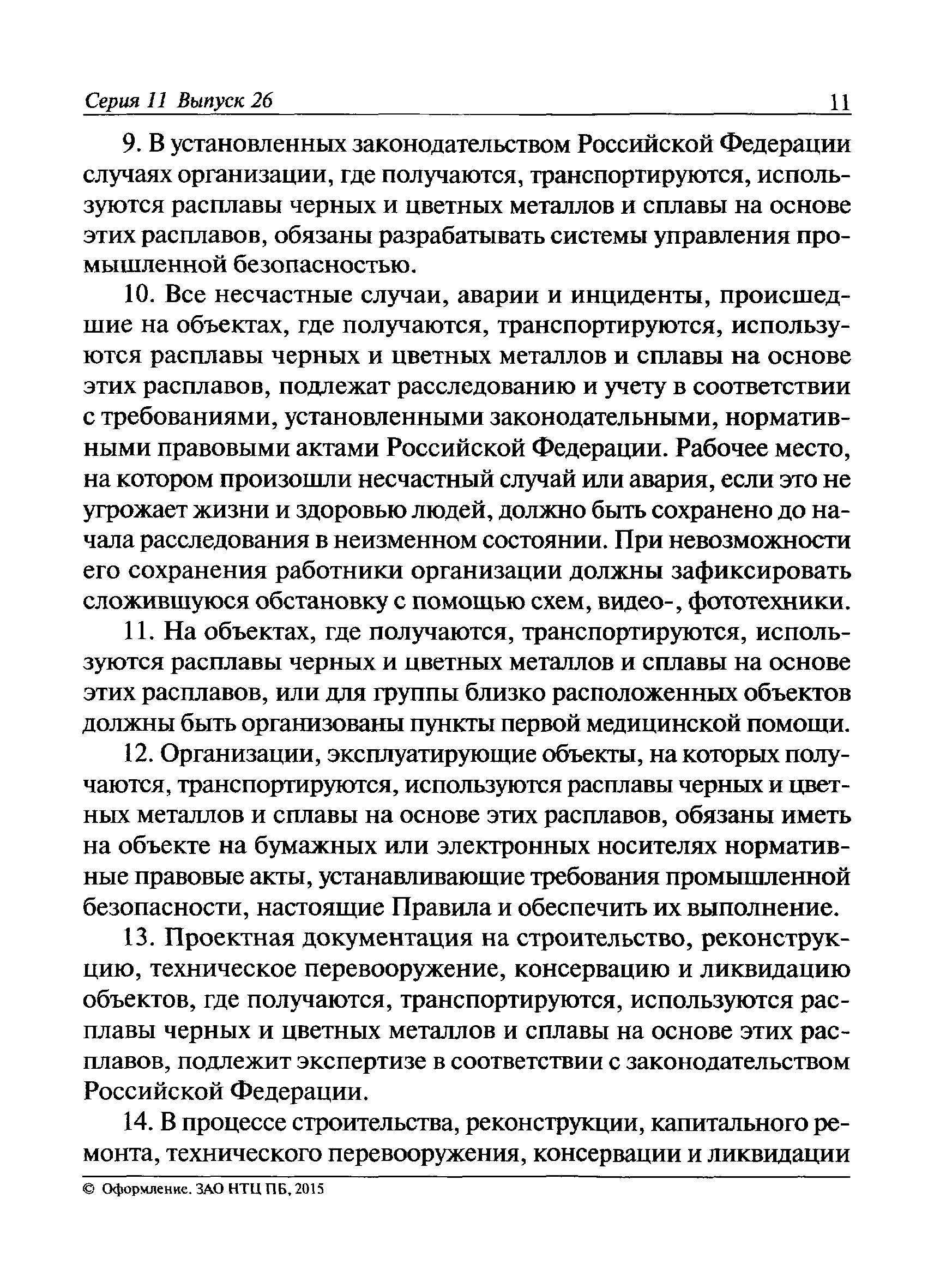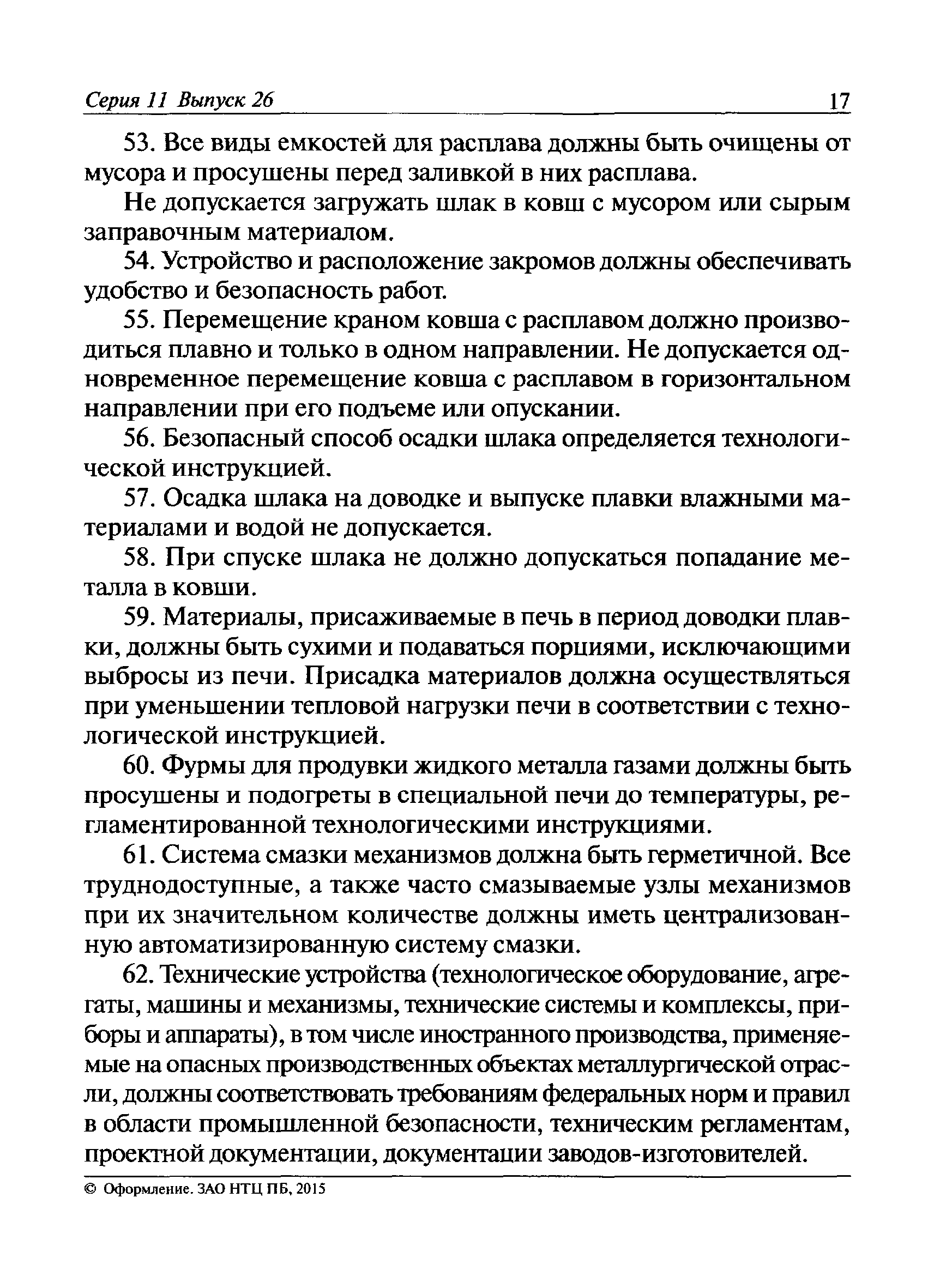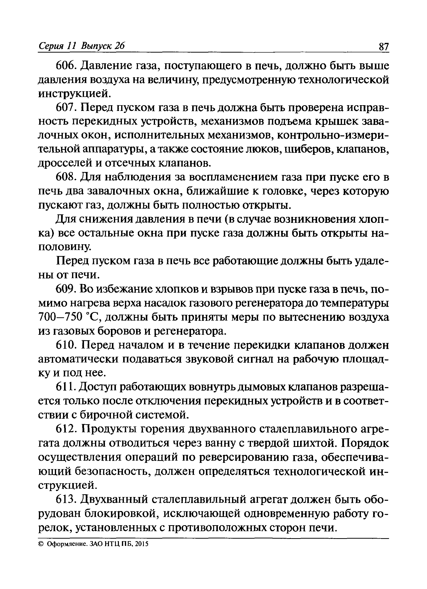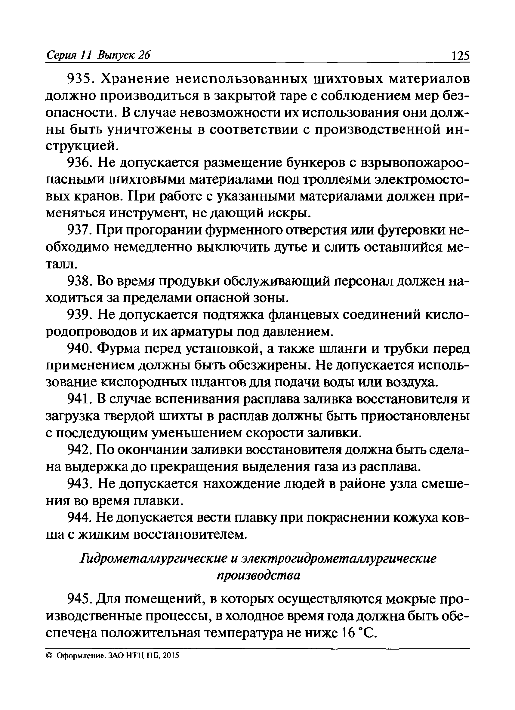 | | Заменяет собой: | | | Нормативные ссылки: |   Федеральный закон 116-ФЗ «О промышленной безопасности опасных производственных объектов»  ПБ 11-493-02 «Общие правила безопасности для металлургических и коксохимических предприятий и производств»  ПБ 11-552-03 «Правила безопасности в сталеплавильном производстве»  ПБ 11-541-03 «Правила безопасности при производстве глинозема, алюминия, магния, кристаллического кремния и электротермического силумина»  ПБ 11-543-03 «Правила безопасности в коксохимическом производстве»  ПБ 11-542-03 «Правила безопасности в доменном производстве»  ПБ 11-551-03 «Правила безопасности в литейном производстве»  ПБ 11-544-03 «Правила безопасности при производстве и потреблении продуктов разделения воздуха»  ПБ 11-523-03 «Правила безопасности при производстве твердых сплавов и тугоплавких металлов»  ПБ 11-545-03 «Правила безопасности при производстве свинца и цинка»  ПБ 11-546-03 «Правила безопасности при подготовке лома и отходов черных и цветных металлов для переплава»  ПБ 11-547-03 «Правила безопасности в ферросплавном производстве»  ПБ 11-548-03 «Правила безопасности при производстве циркония, гафния и их соединений»  ПБ 11-549-03 «Правила безопасности в производстве благородных металлов, сплавов и их полуфабрикатов» ПБ 11-550-03 «Правила безопасности при производстве ртути»  ПБ 11-554-03 «Правила безопасности при производстве никеля, меди и кобальта»  ПБ 11-555-03 «Правила безопасности при производстве порошков и пудр из алюминия, магния и сплавов на их основе»  ПБ 11-556-03 «Правила безопасности при производстве сурьмы и ее соединений»  РД 11-561-03 «Инструкция по составлению планов ликвидации (локализации) аварий в металлургических и коксохимических производствах»  ПБ 11-562-03 «Правила безопасности в трубном производстве»  ПБ 11-588-03 «Правила безопасности при производстве губчатого титана и титановых порошков»  ПБ 11-519-02 «Правила безопасности в прокатном производстве» «Положение о Федеральной службе по экологическому, технологическому и атомному надзору» ПБ 11-149-97 «Правила безопасности при производстве глинозема, алюминия, магния, кристаллического кремния и электротермического силумина»  ПБ 11-401-01 «Правила безопасности в газовом хозяйстве металлургических и коксохимических предприятий и производств»  Технический регламент «Технический регламент о безопасности сетей газораспределения и газопотребления»