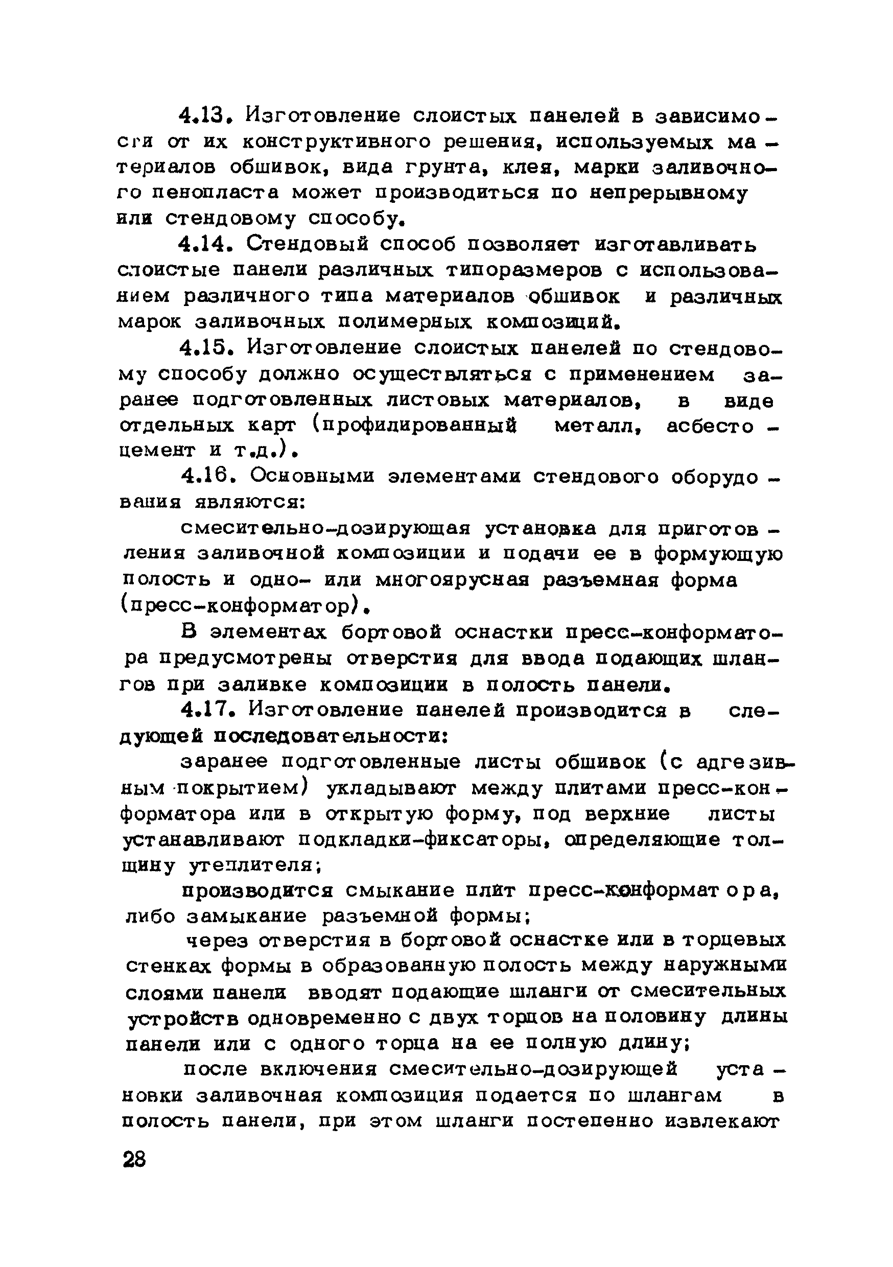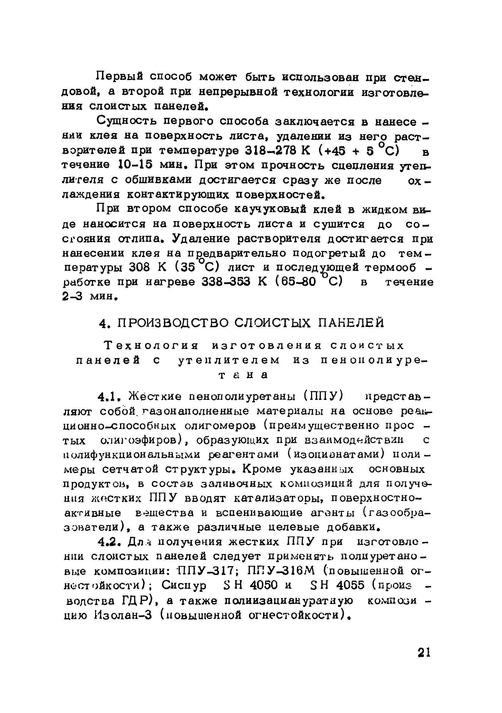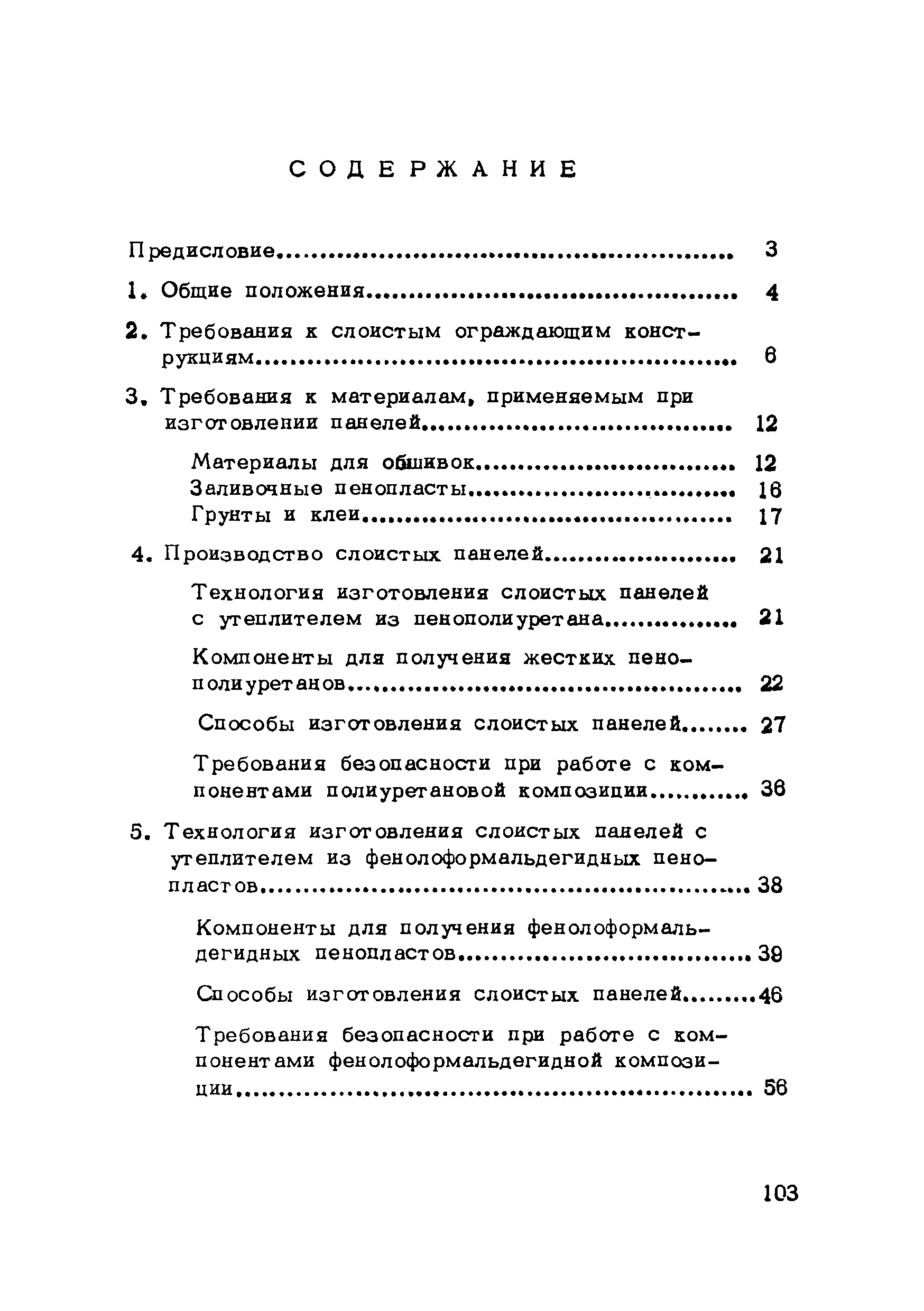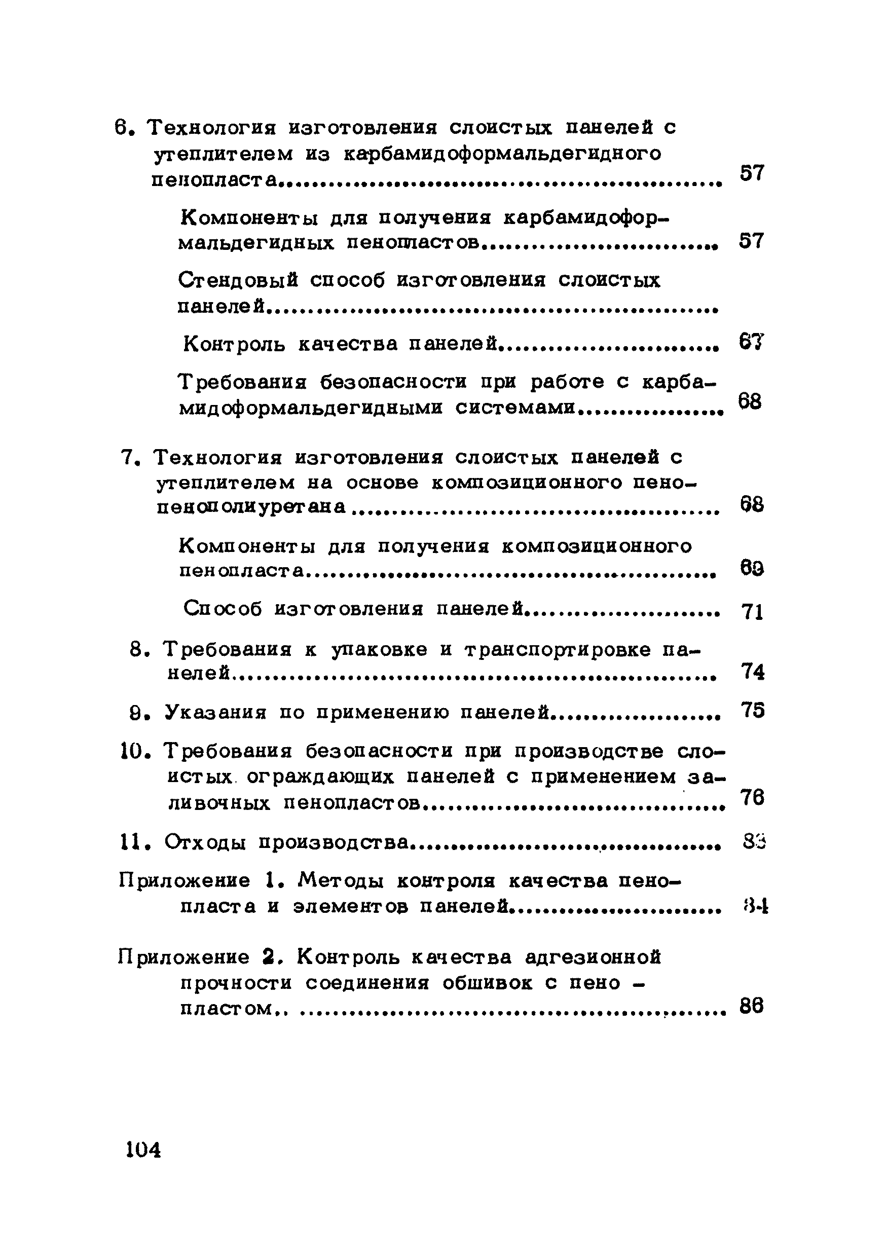 | Оглавление: | Предисловие 1. Общие положения 2. Требования к слоистым ограждающим конструкциям 3. Требования к материалам, применяемым при изготовлении панелей Материалы для обшивок Заливочные пенопласты Грунты и клеи 4. Производство слоистых панелей . Технология изготовления слоистых панелей с утеплителем из пенополиуретана Компоненты для получения жестких пенополиуретановая Способы изготовления слоистых панелей Требования безопасности при работе с компонентами полиуретановой композиции 5. Технология изготовления слоистых панелей с утеплителем из фенолоформальдегидных пенопластов Компоненты для получения фенолоформальдегидных пенопластов Способы изготовления слоистых панелей Требования безопасности при работе с компонентами фенолоформальдегидной композиции 6. Технология изготовления слоистых панелей с утеплителем из карбамидоформальдегидного пенопласта Компоненты для получения карбамидоформальдегидных пенопластов Стендовый способ изготовления слоистых панелей Контроль качества панелей Требования безопасности при работе с карбамидоформальдегидными системами 7. Технология изготовления слоистых панелей с утеплителем на основе композиционного пенололиуретана Компоненты для получения композиционного пенопласта Способ изготовления панелей 8. Требования к упаковке и транспортировке панелей 9. Указания по применению панелей 10. Требования безопасности при производстве слоистых, ограждающих панелей с применением заливочных пенопластов 11. Отходы производства Приложение 1. Методы контроля качества пенопласта и элементов панелей Приложение 2. Контроль качества адгезионной прочности соединения обшивок с пенопластом Приложение 3. Подготовка заливочной машины к работе и проверка дозировки насосов Приложение 4. Методика определения технологических параметров пенополиуретановых и фенолоформальдегидных заливочных композиций Приложение 5. Методика определения технологических параметров исходного сырья и карбамидоформальдегидных композиций |