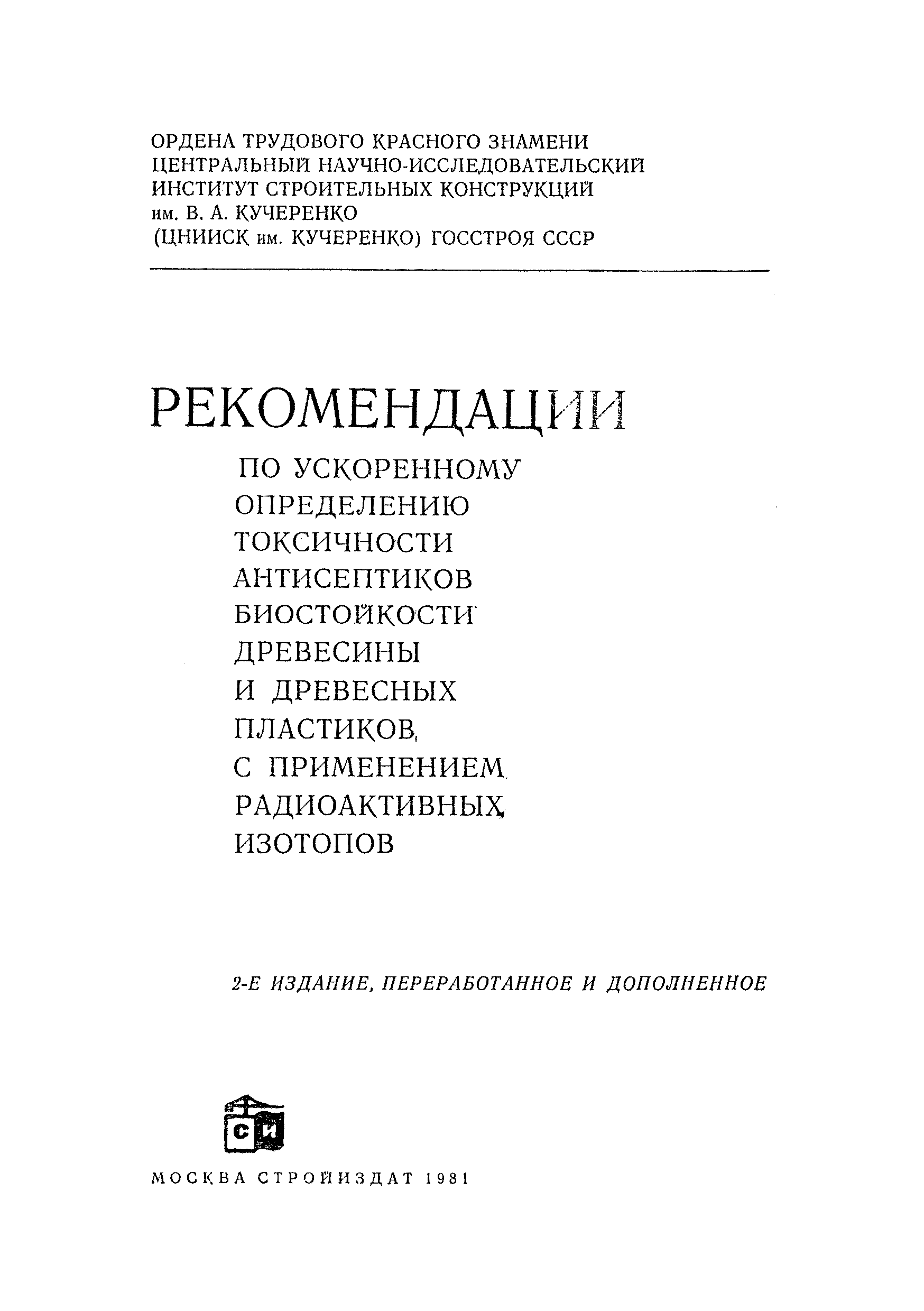 | Название рус.: | Рекомендации по ускоренному определению токсичности антисептиков биостойкости древесины и древесных пластиков с применением радиоактивных изотопов |