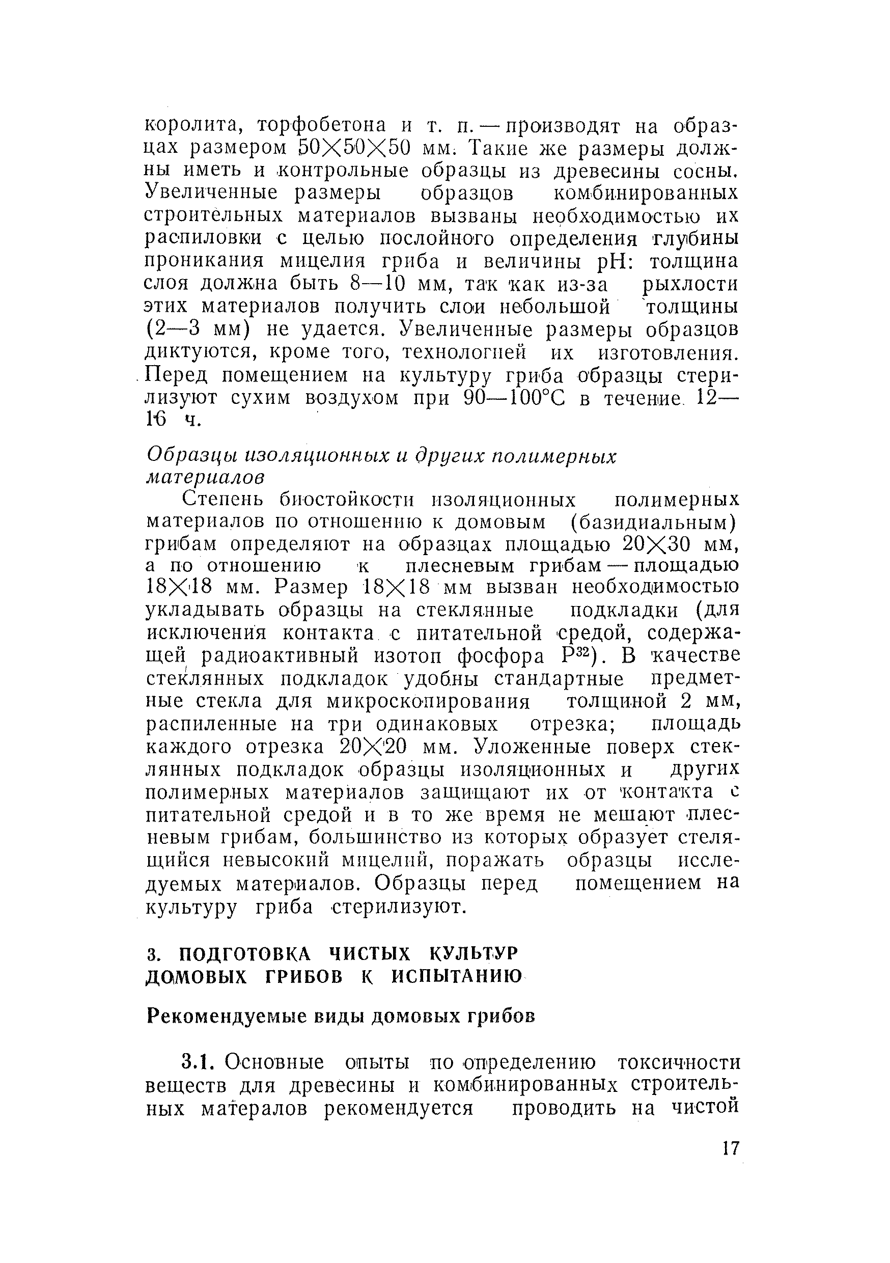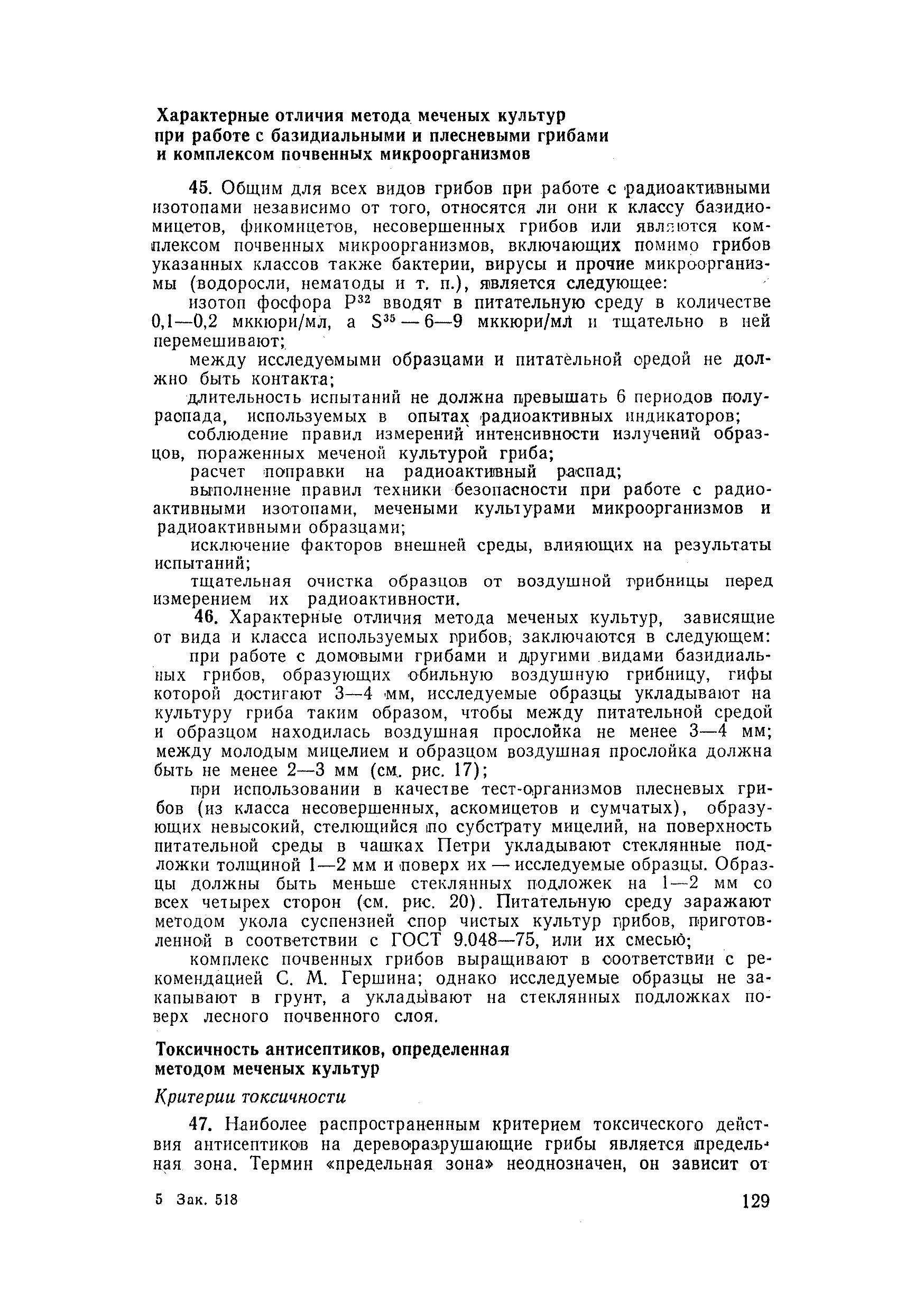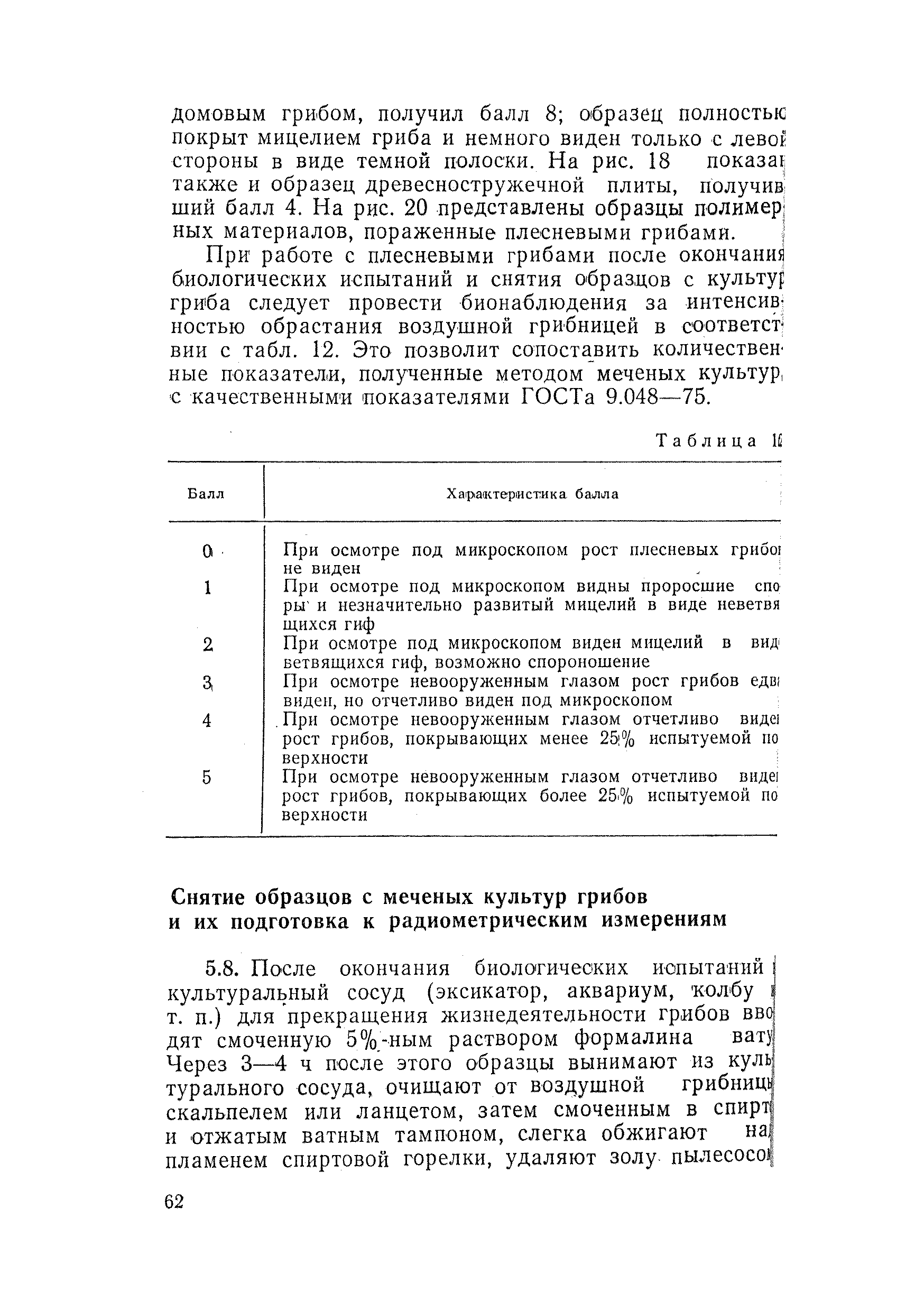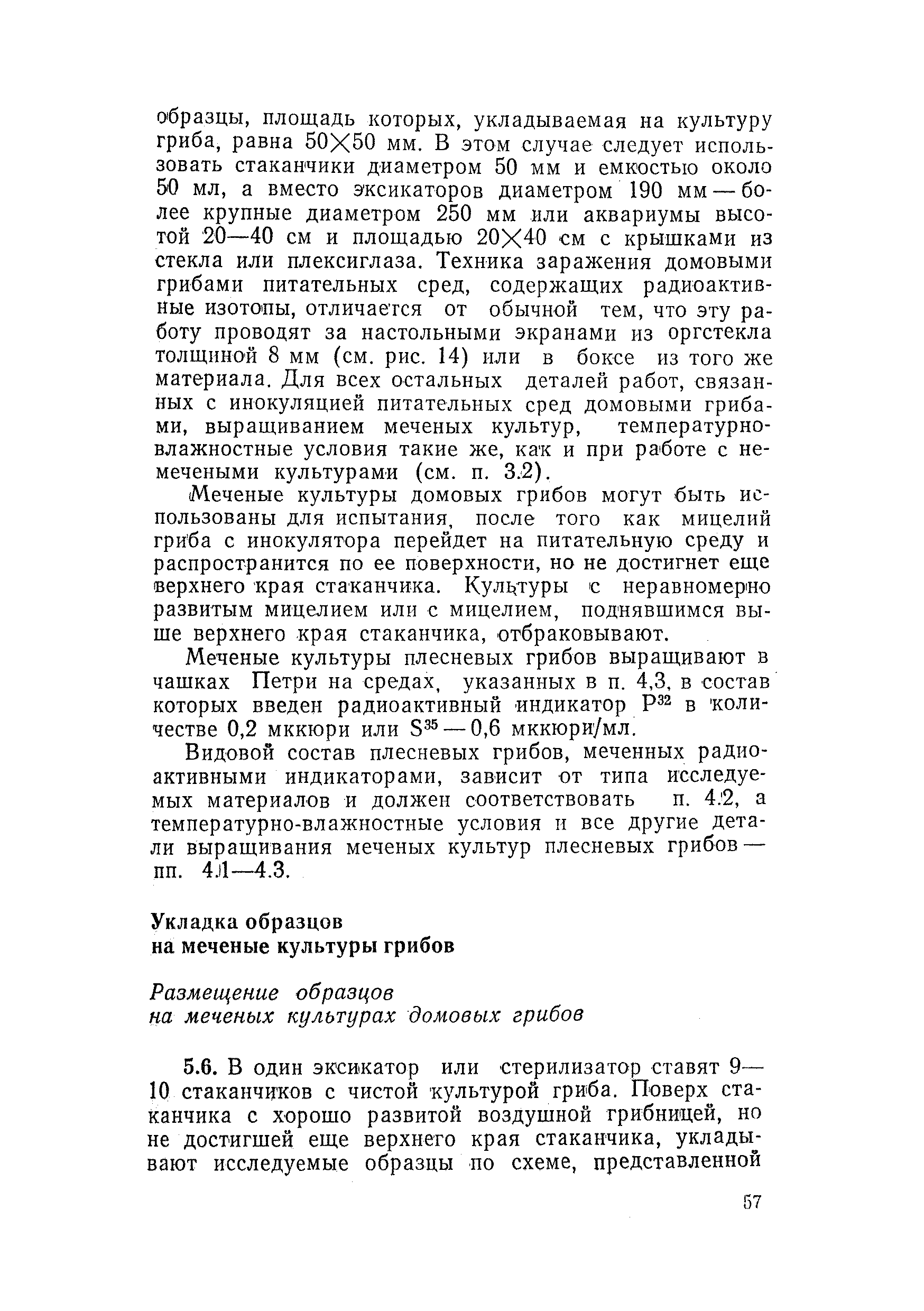 | Оглавление: | 1 Общая часть 2 Подготовка образцов к испытанию 3 Подготовка чистых культур домовых грибов к испытанию 4 Подготовка чистых культур плесневых грибов и их смеси к испытанию 5 Получение меченых культур грибов и проведение испытаний на них 6 Определение поражения образцов материалов по интенсивности радиоактивных излучений 7 Оценка результатов испытаний методом меченных культур грибов Приложение 1. Терминология Приложение 2. Особенности метода меченых культур и условий его применения для биологических испытаний Приложение 3. Техника безопасности при работе с мечеными культурами грибов Приложение 4. Условия заказа и получения радиоактивных изотопов |