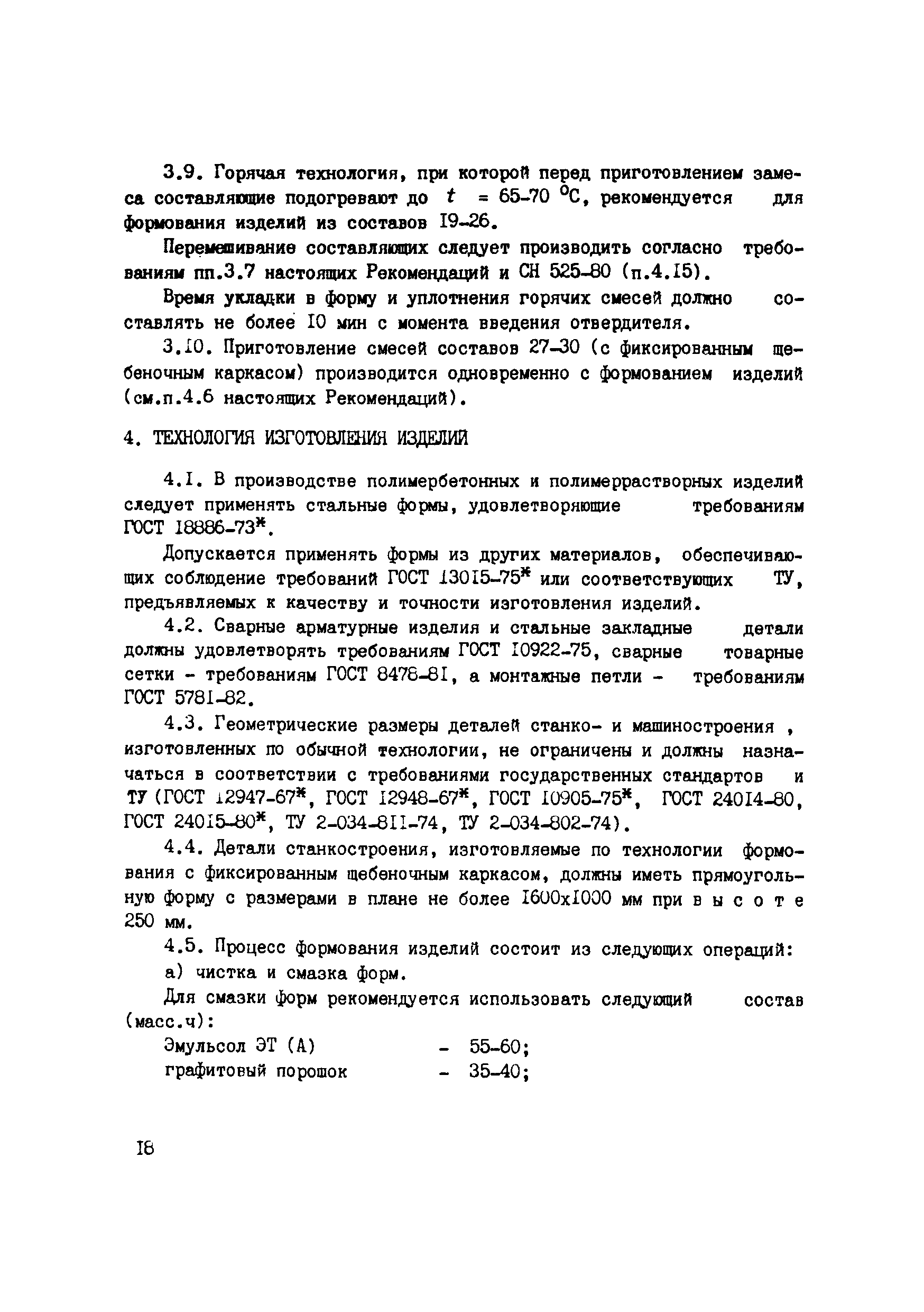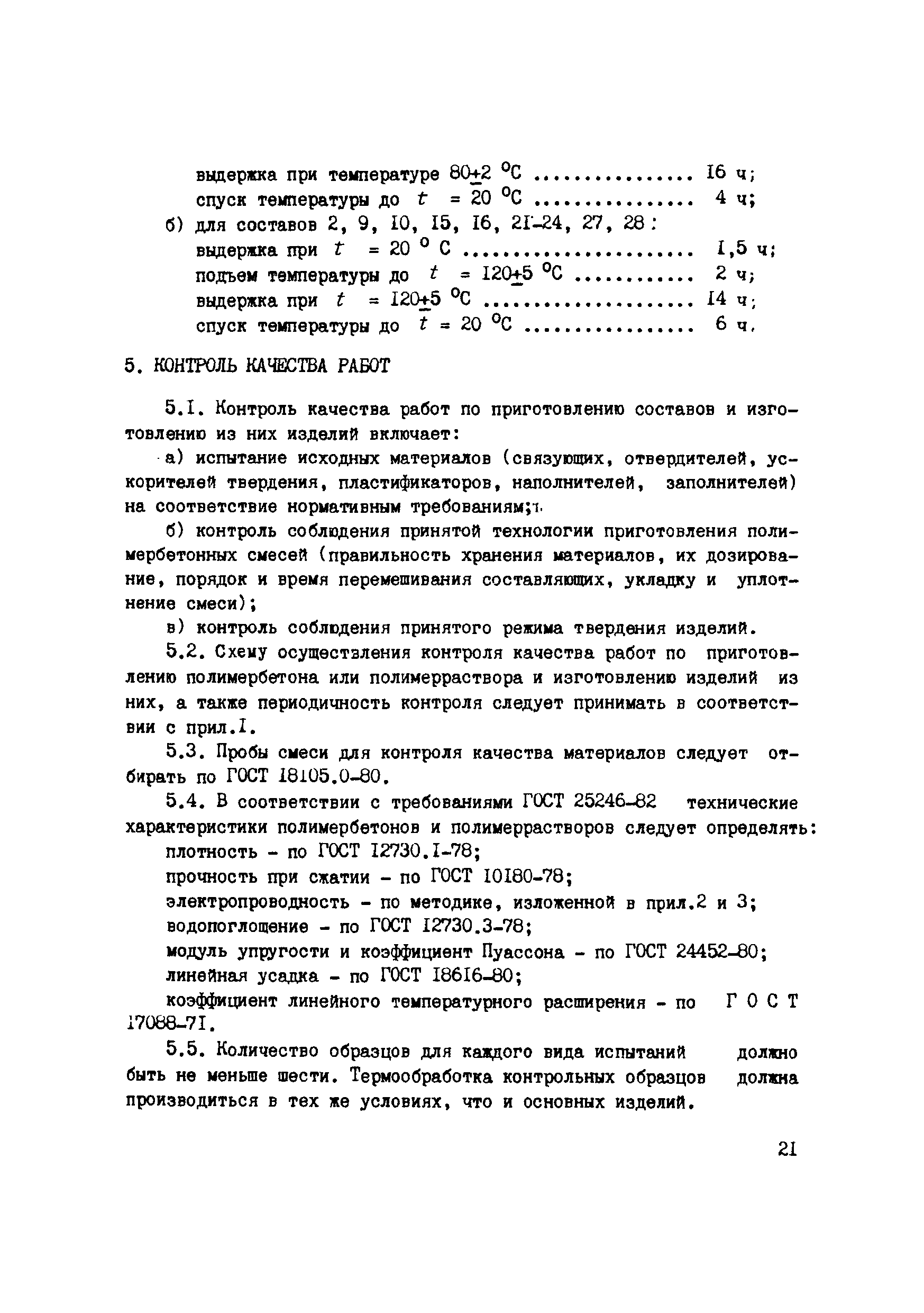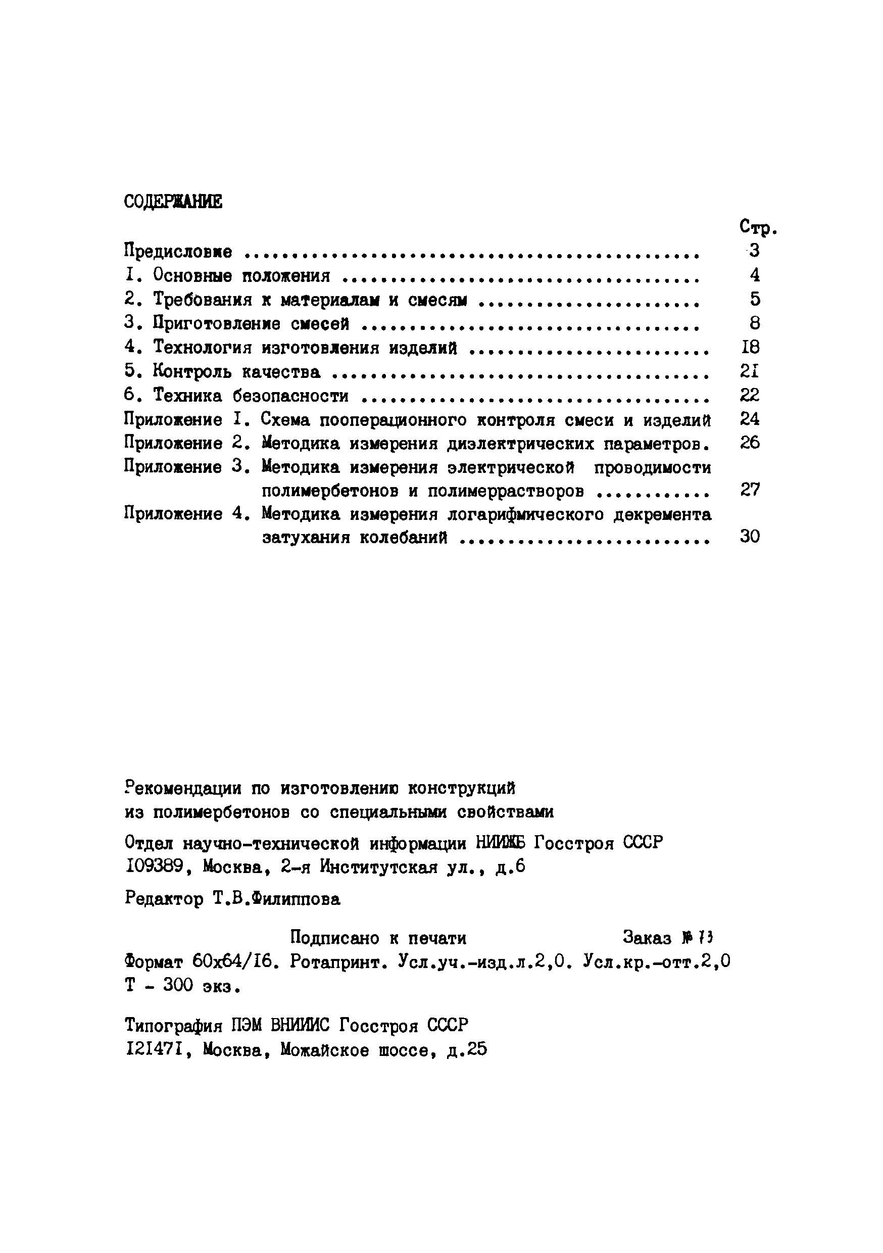 | Оглавление: | Предисловие 1. Основные положения 2. Требования к материалам и смесям 3. Приготовление смесей 4. Технология изготовления изделий 5. Контроль качества 6. Техника безопасности Приложение 1. Схема пооперационного контроля смеси и изделий Приложение 2. Методика измерения диэлектрических параметров. Приложение 3. Методика измерения электрической проводимости полимербетонов и полимеррастворов Приложение 4. Методика измерения логарифмического декремента затухания колебаний |
