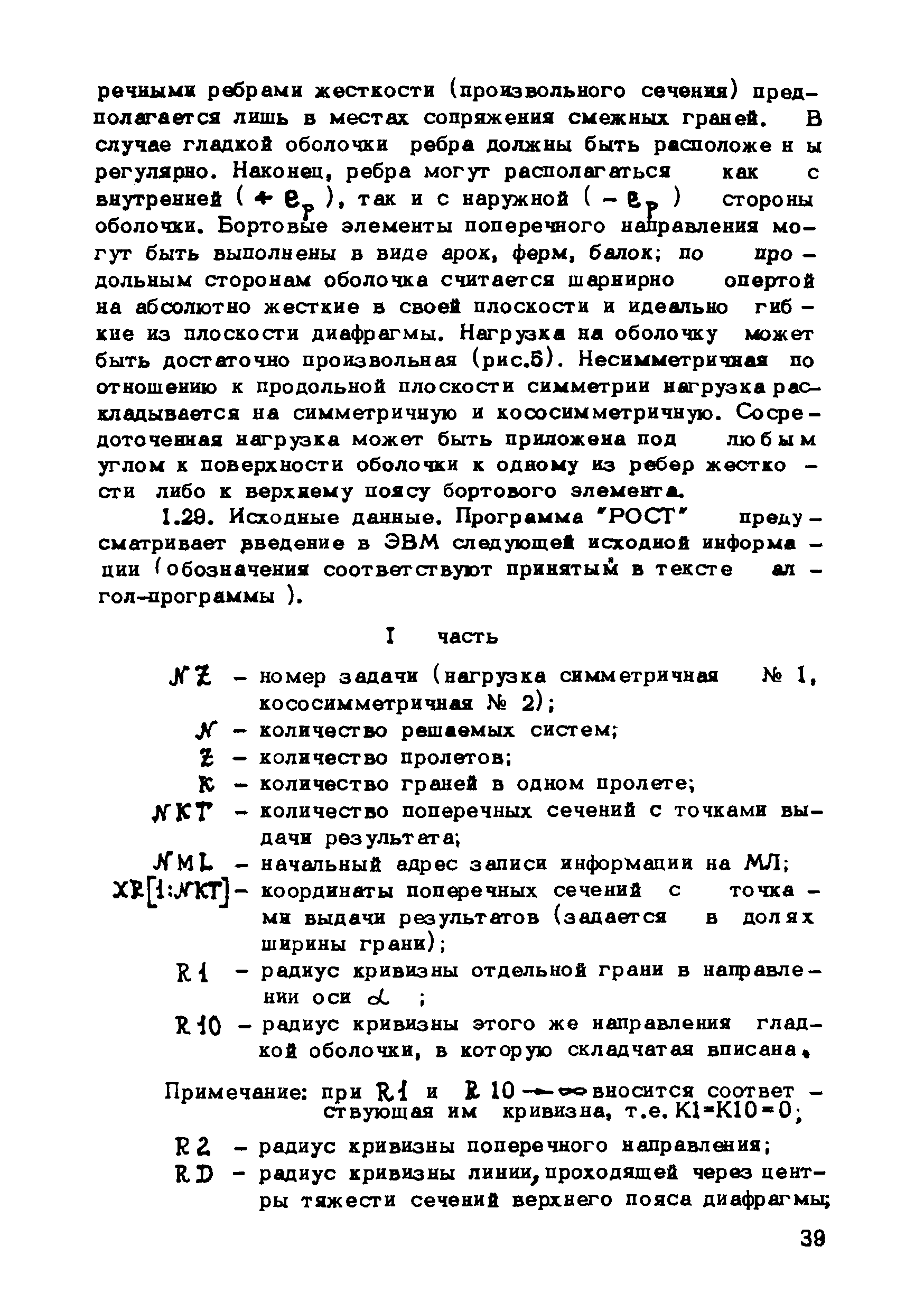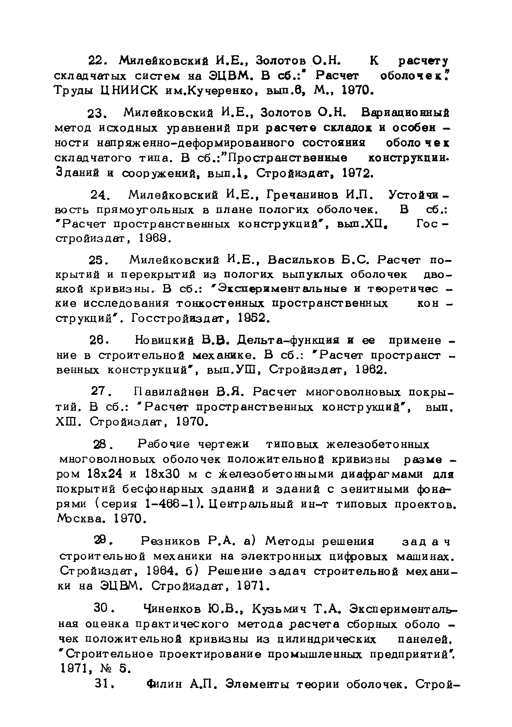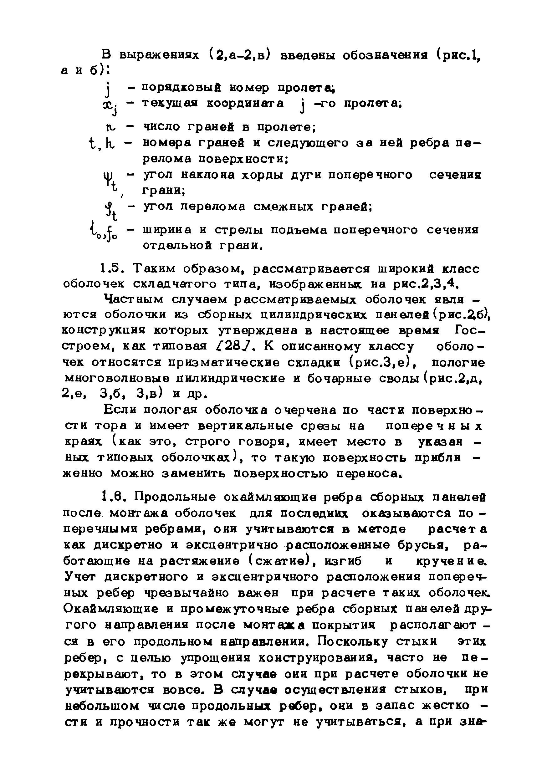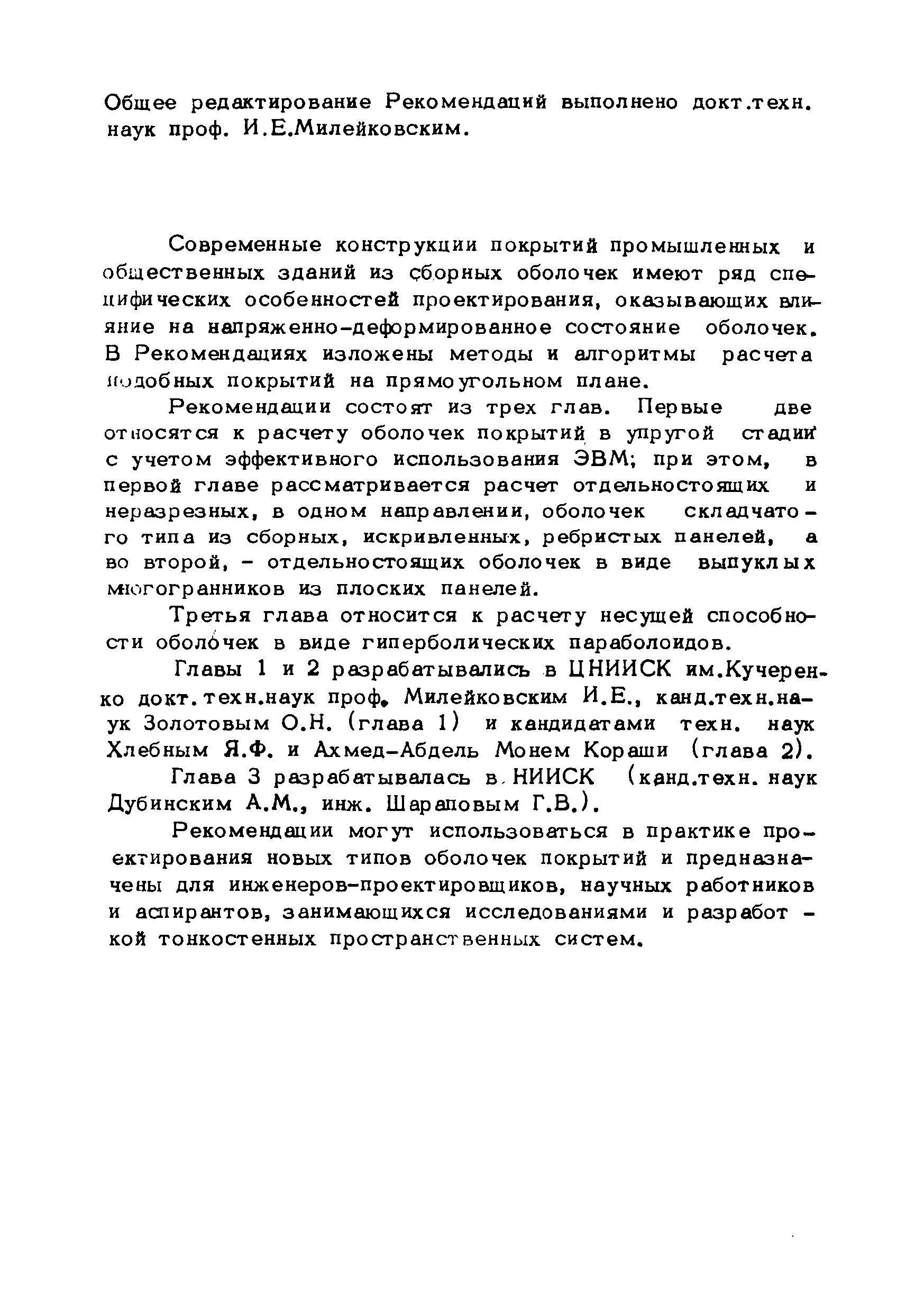 Рекомендации по методам расчета оболочек складчатого типа| Статус: | справочные материалы, мп, тпр | | Название рус.: | Рекомендации по методам расчета оболочек складчатого типа | | Дата добавления в базу: | 01.10.2014 | | Дата актуализации: | 01.01.2021 | | Область применения: | Рекомендации могут использоваться в практике проектирования новых типов оболочек покрытий и предназначены для инженеров-проектировщиков, научных работников и аспирантов, занимающихся исследованиями и разработкой тонкостенных пространственных систем. | | Оглавление: | Введение Глава 1. Метод и алгоритм расчета оболочек складчатого типа на прямоугольном плане из криволинейных ребристых панелей Геометрия поверхности и исходные положения Метод решения исходных уравнений оболочек с использованием тригонометрических рядов Построение решения контактной задачи сопряжения граней складчатой оболочки между собой, с поперечными диафрагмами и ребрами жесткости Алгоритм расчета Расчет оболочки на ЭВМ "Минск-22" Приложение 1. Учет продольных ребер Приложение 2. Примеры расчета и особенности напряженного состояния оболочек складчатого типа на прямоугольном плане из криволинейных ребристых панелей 1. Особенности напряженного состояния типовой оболочки покрытия при действии равномерно распределенной нагрузки 2. Особенности напряженного состояния типовой оболочки покрытия при действии сосредоточенной нагрузки 3. Учет влияния постепенности монтажа на окончательное распределение усилий в сборных типовых оболочках 4. Особенности напряженного состояния оболочек складчатого типа в зависимости от различной формы искривления граней и от величины углов перелома поверхности 5. Некоторые выводы и рекомендации по расчету и проектированию Глава 2. Оболочки вида выпуклых многогранников Общие положения Геометрия пологой граненой поверхности Основные уравнения и их решение Определение перемещений Расчет граненых оболочек, подкрепленных ребрами Расчет граненых оболочек на сосредоточенные нагрузки Приложение 3. Примеры и анализ результатов решений Пример 1 Пример 2 Пример 3 Пример 4 Программа Примечания к программе Глава 3. Расчет несущей способности покрытий из оболочек типа гиперболического параболоида с прямолинейными краями Общие положения Отдельно стоящие оболочки в виде равностороннего гиперболического параболоида с прямолинейными краями Покрытия в виде системы из четырех оболочек Приложение 4. Таблицы для расчета Таблица для расчета оболочек, опирающихся на нижние углы, закрепленные от горизонтальных смещений Таблица для расчета оболочек, опирающихся на нижние углы, соединенные затяжкой Таблица для расчета шарнирно-подвижно опертых по контуру оболочек Таблица для расчета свободно опертых по контуру оболочек Приложение 5. Примеры расчета Оболочка, опертая на нижние несмещаемые углы Пример 1 Пример 2 Оболочка, опертая на нижние смещающиеся углы Пример 3 Пример 4 Оболочка, радиально-шарнирно опертая по контуру Пример 5 Пример 6 Оболочка, свободно опертая по контуру Пример 7 Пример 8 Покрытие с горизонтальными коньками Пример 9 Покрытие с плоским контуром Пример 10 Литература | | Разработан: | ЦНИИОМТП Госстроя СССР
