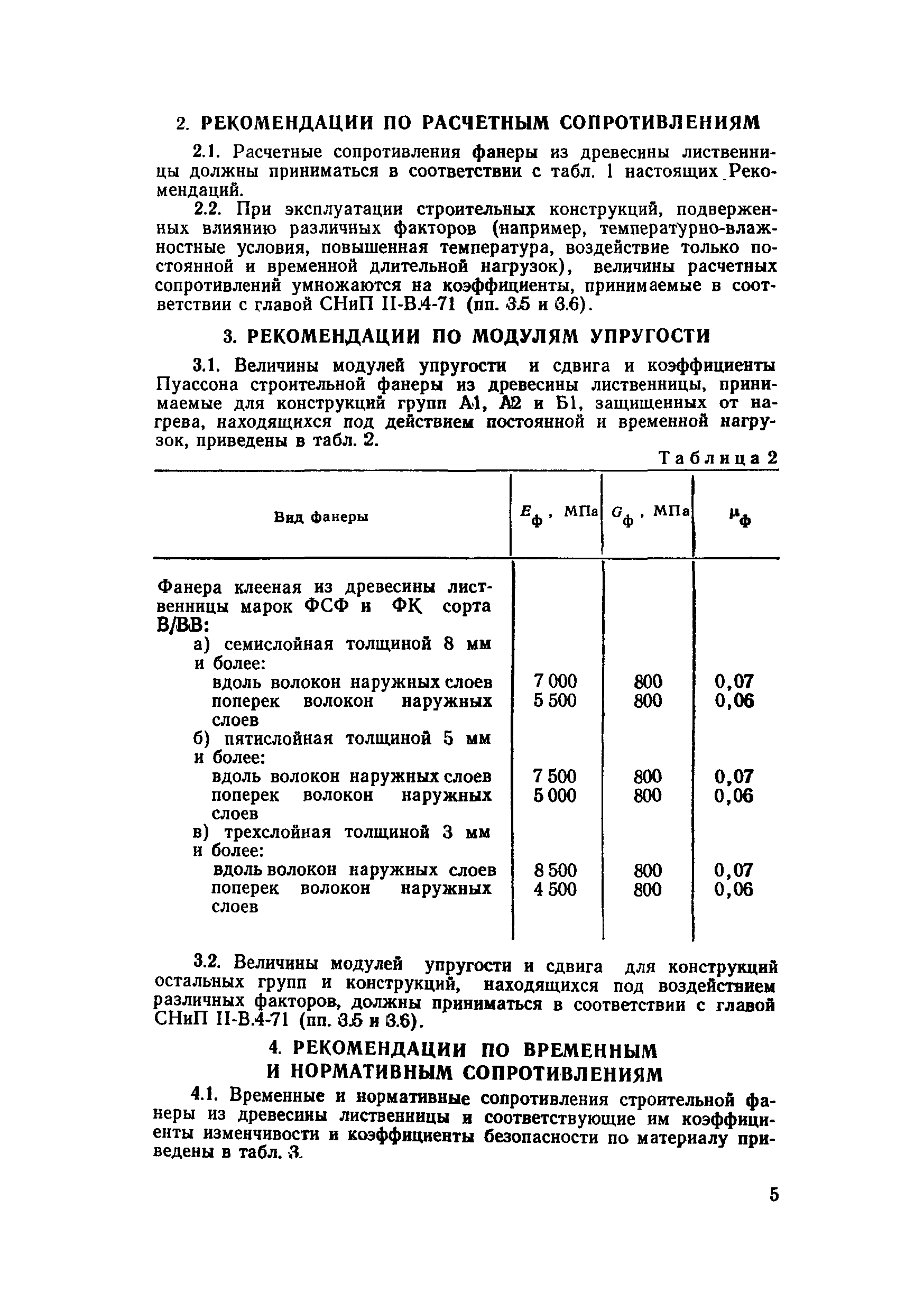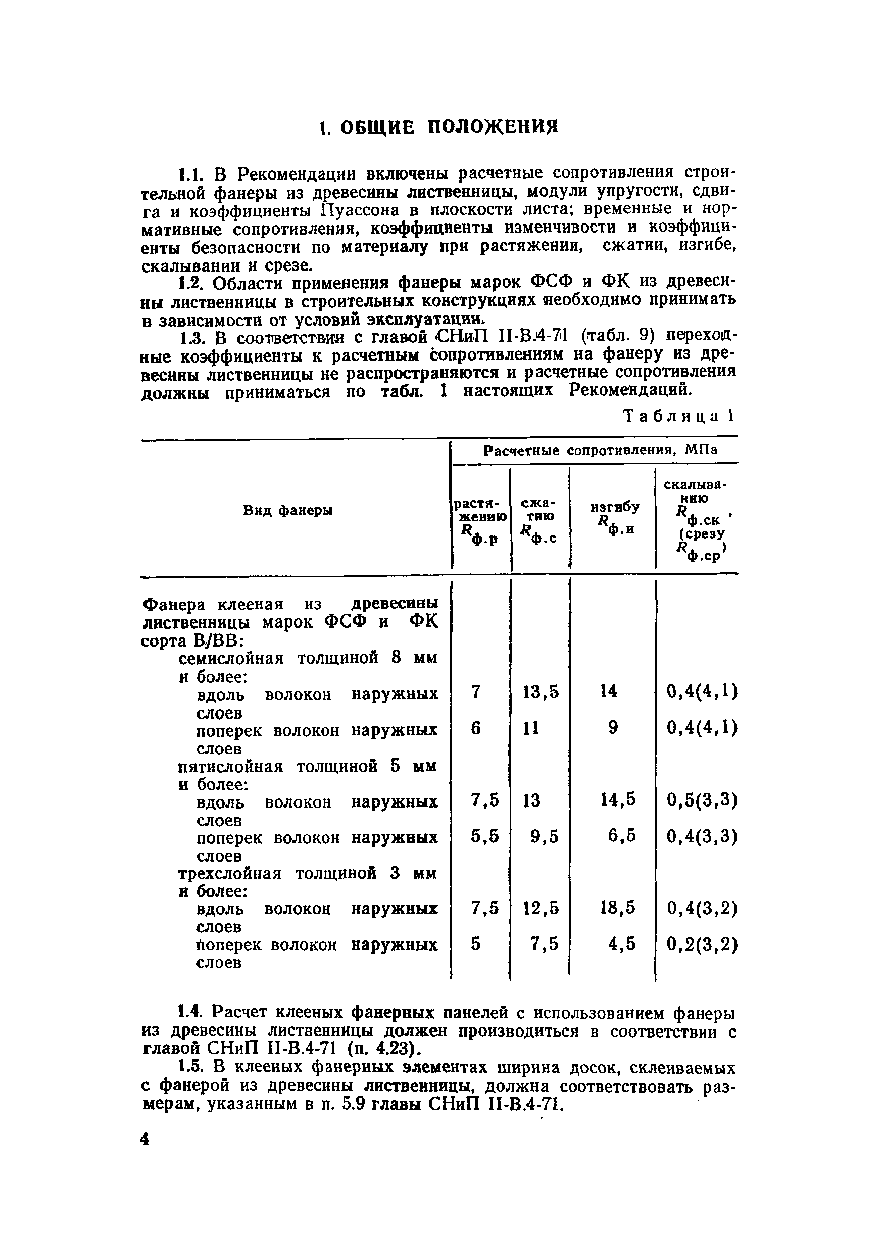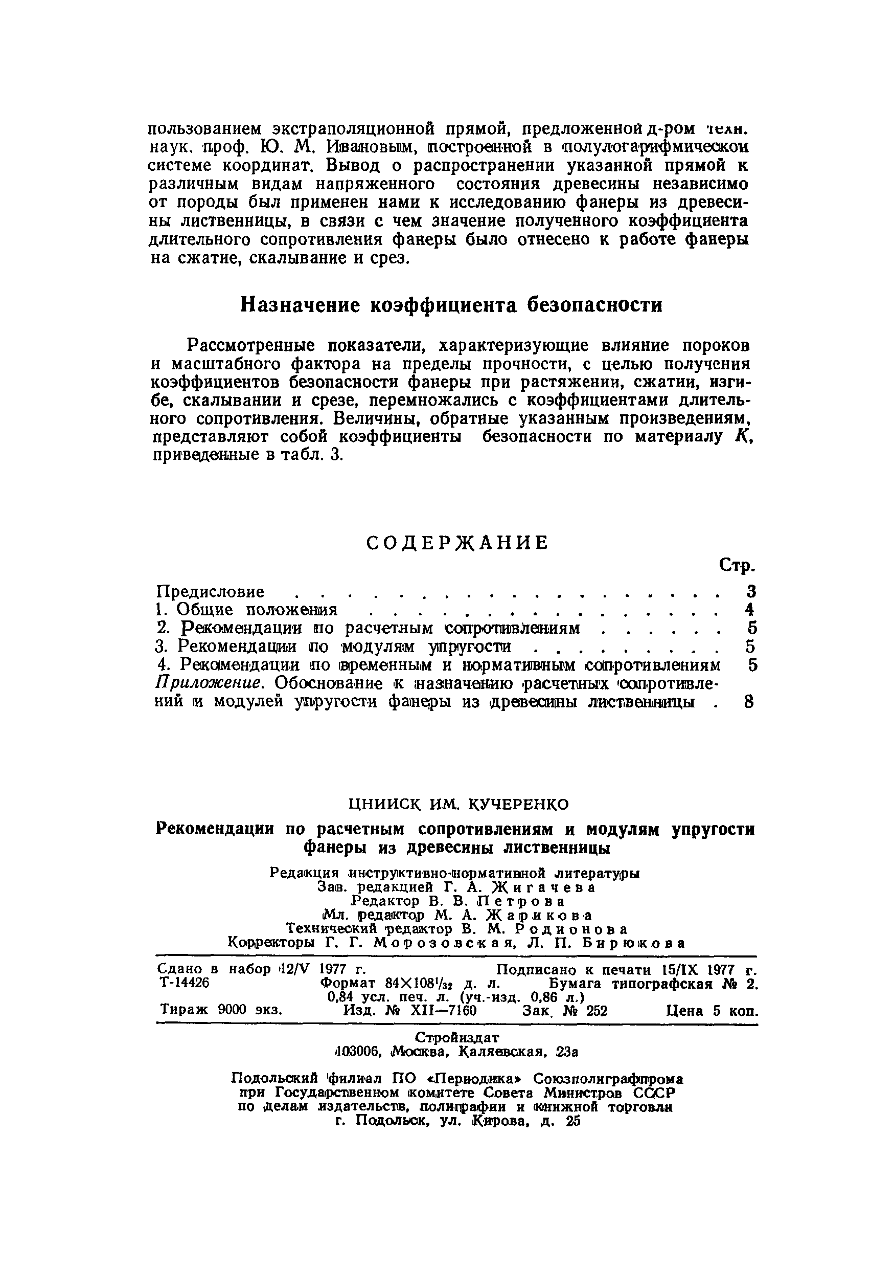 | Оглавление: | Предисловие 1. Общие положения 2. Рекомендации по расчетным сопротивлениям 3. Рекомендации по модулям упругости 4. Рекомендации по временным и нормативным сопротивлениям Приложение. Обоснование к назначению расчетных сопротивлений и модулей упругости фанеры из древесины лиственницы |