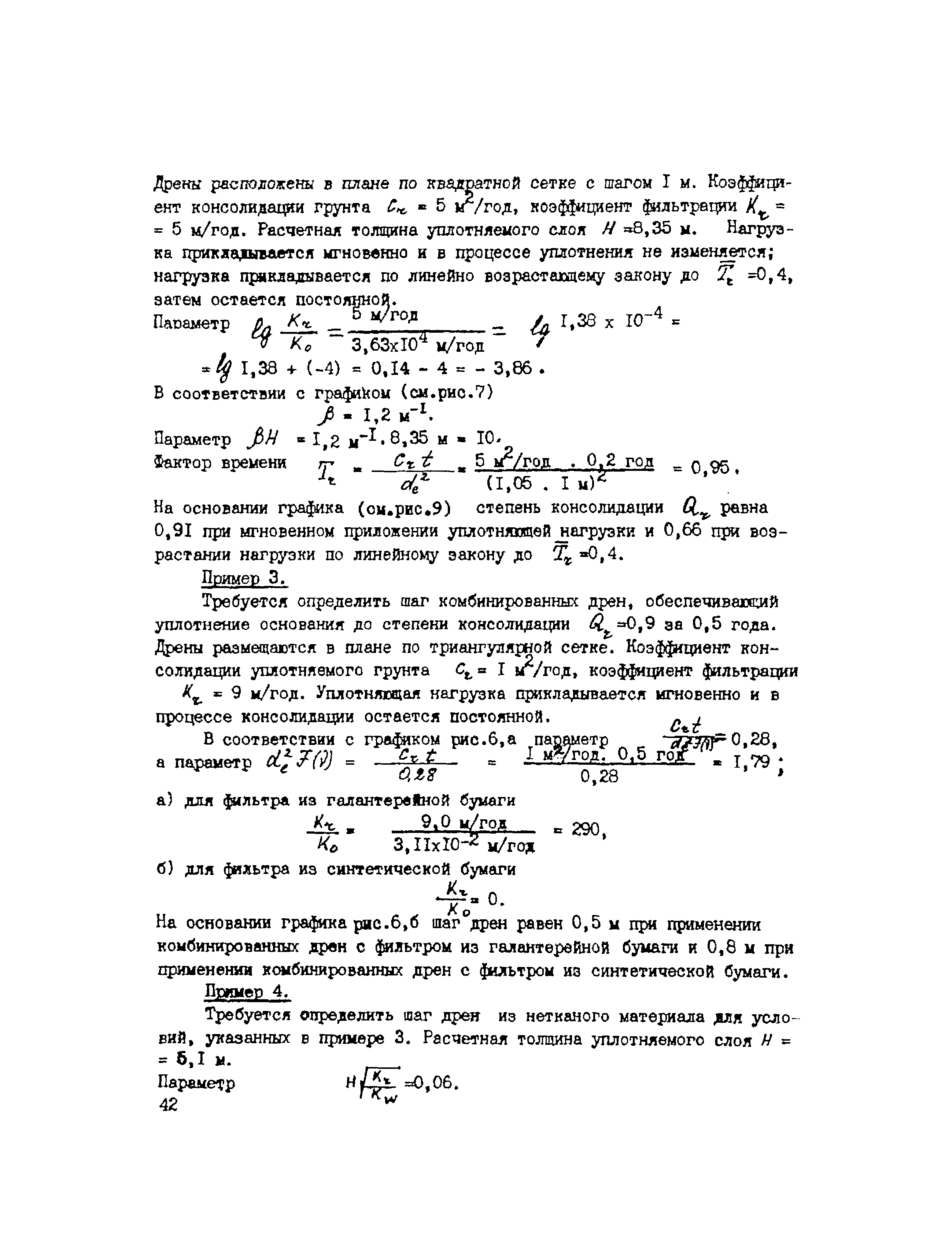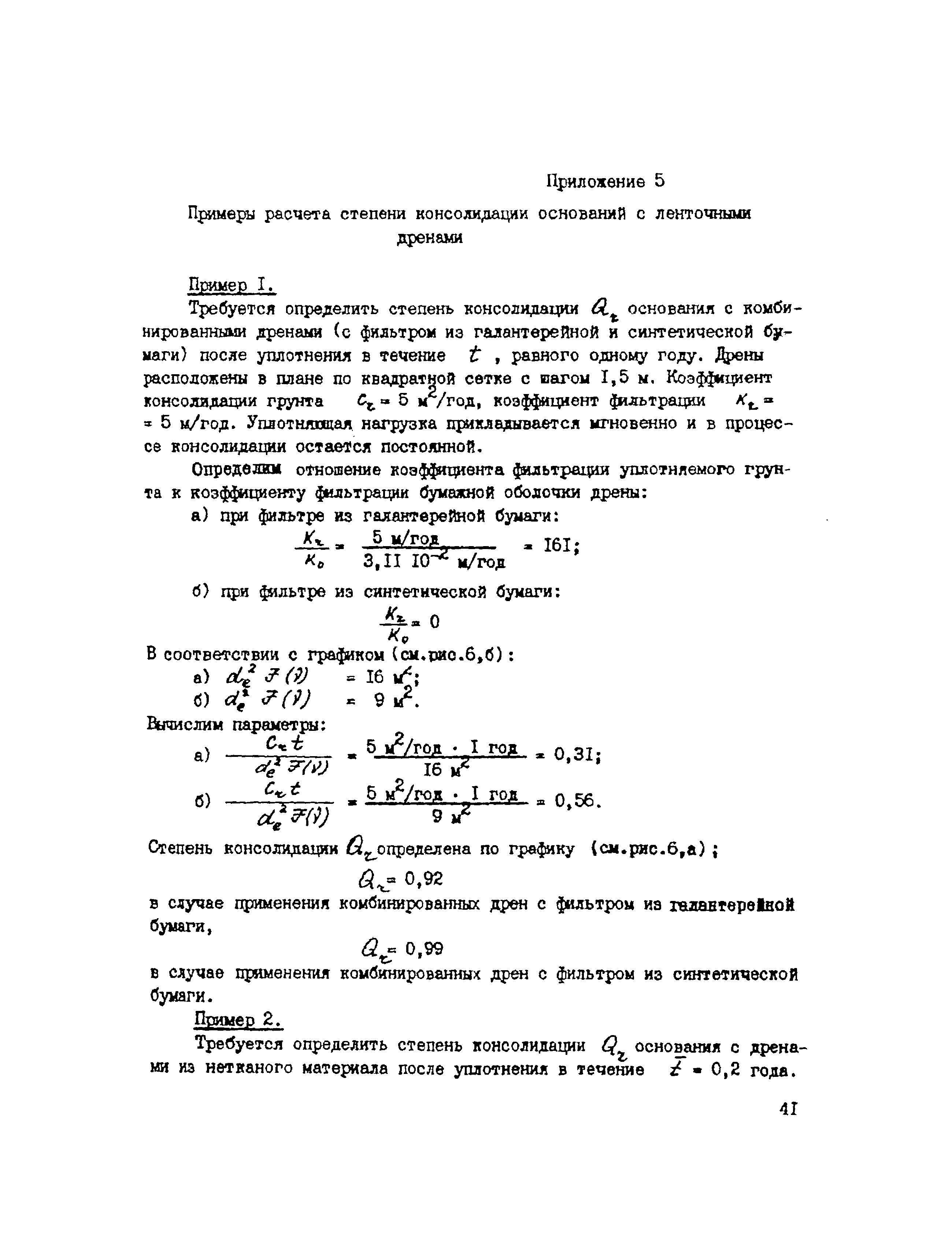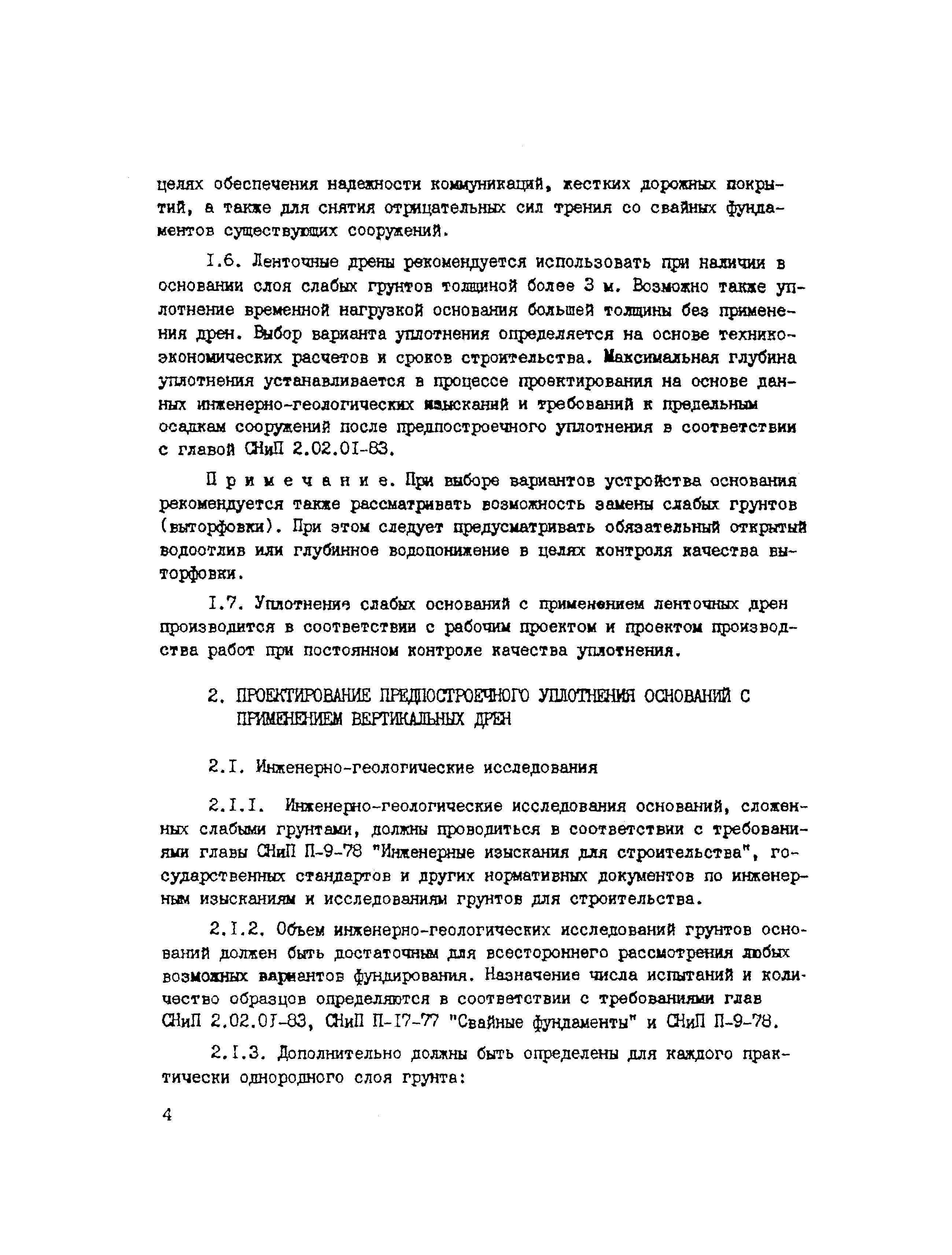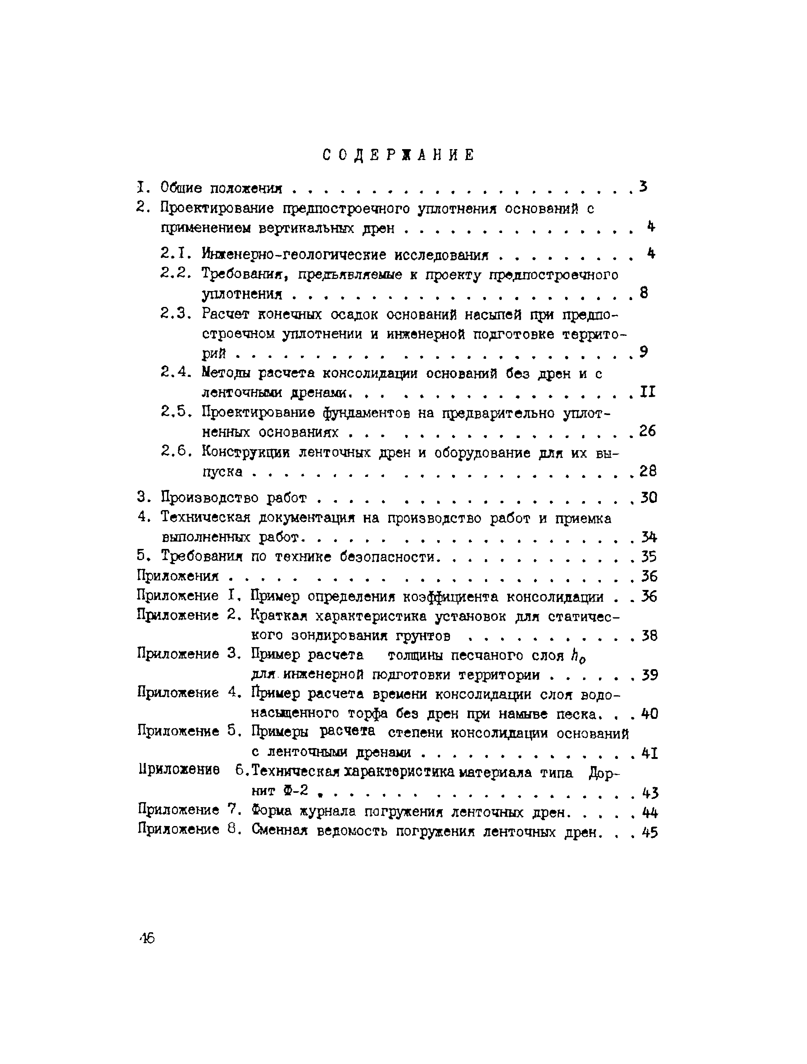 | Оглавление: | 1. Общие положения 2. Проектирование предпостроечного уплотнения оснований с применением вертикальных дрен 2.1 Инженерно-геологические исследования 2.2 Требования, предъявляемые к проекту предпостроечного уплотнения 2.3 Расчет конечных осадок оснований насыпей при предпостроечном уплотнении и инженерной подготовке территорий 2.4 Методы расчета консолидации оснований без дрен и с ленточными дренами 2.5 Проектирование фундаментов на предварительно уплотненных основаниях 2.6 Конструкции ленточных дрен и оборудование для их выпуска 3. Производство работ 4. Техническая документация на производство работ и приемка выполненных работ 5. Требования по технике безопасности Приложение 1. Пример определения коэффициента консолидации Приложение 2. Краткая характеристика установок для статического зондирования грунтов Приложение 3. Пример расчета толщины песчаного слоя для инженерной подготовки территории Приложение 4. Пример расчета времени консолидации слоя водонасыщенного торфа без дрен при намыве песка Приложение 5. Примеры расчета степени консолидации оснований с ленточными дренами Приложение 6. Техническая характеристика материала типа Дорнит Ф-2 Приложение 7. Форма журнала погружения ленточных дрен Приложение 8. Сметная ведомость погружения ленточных дрен |