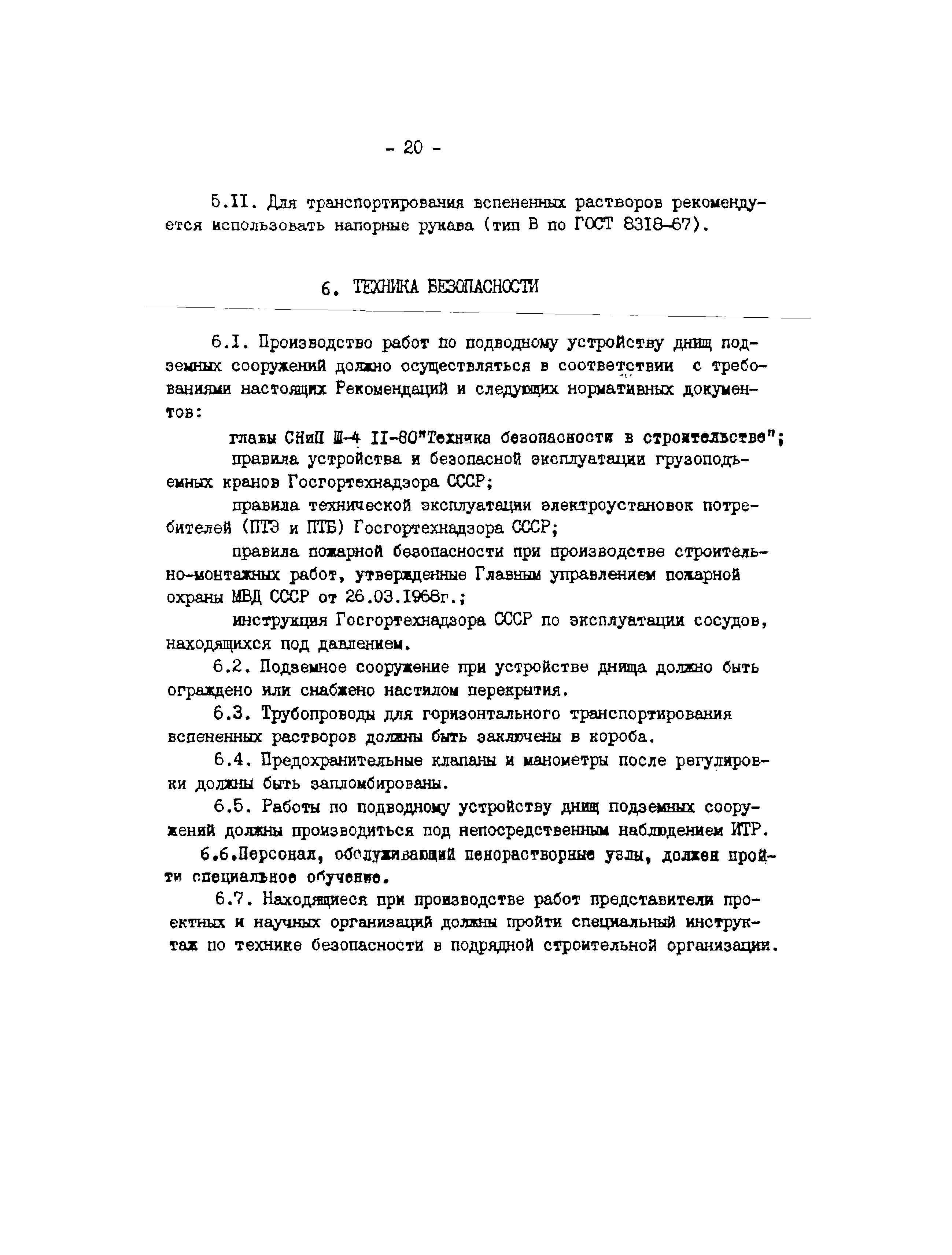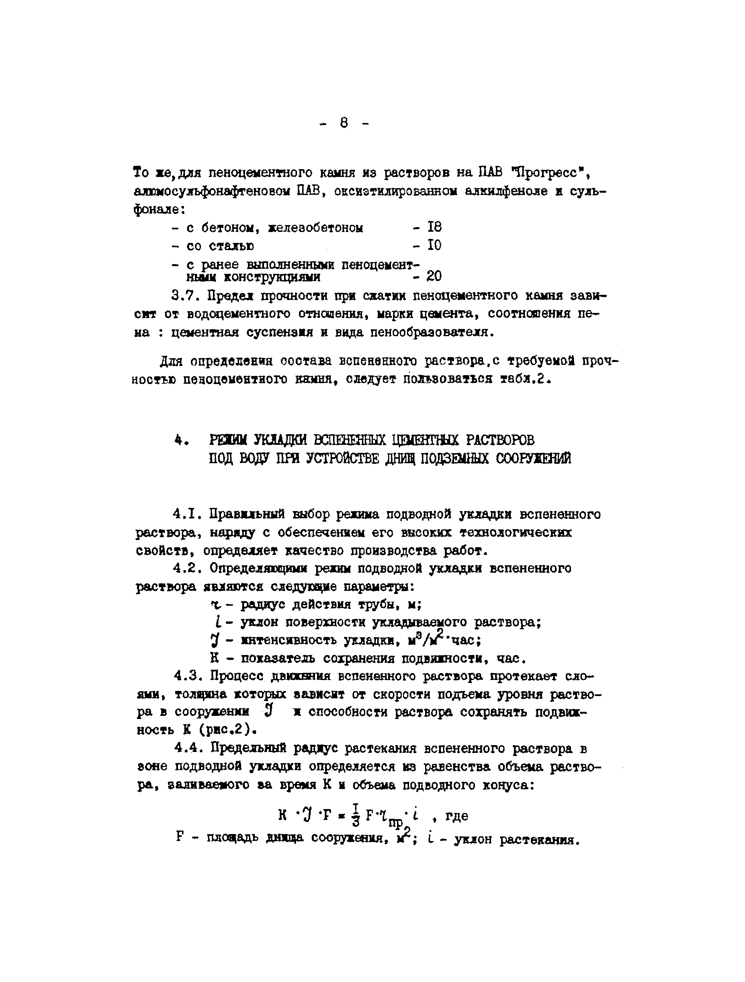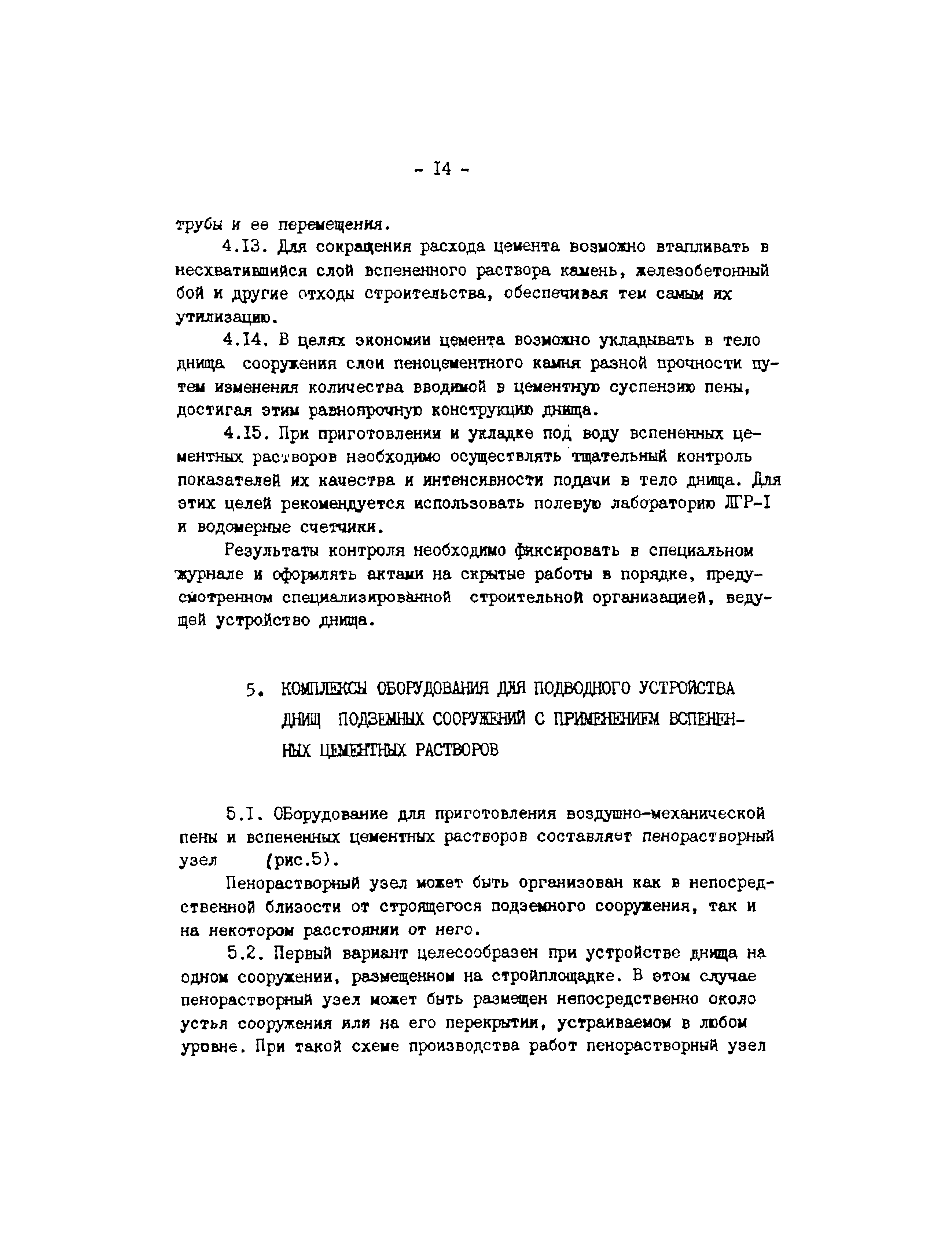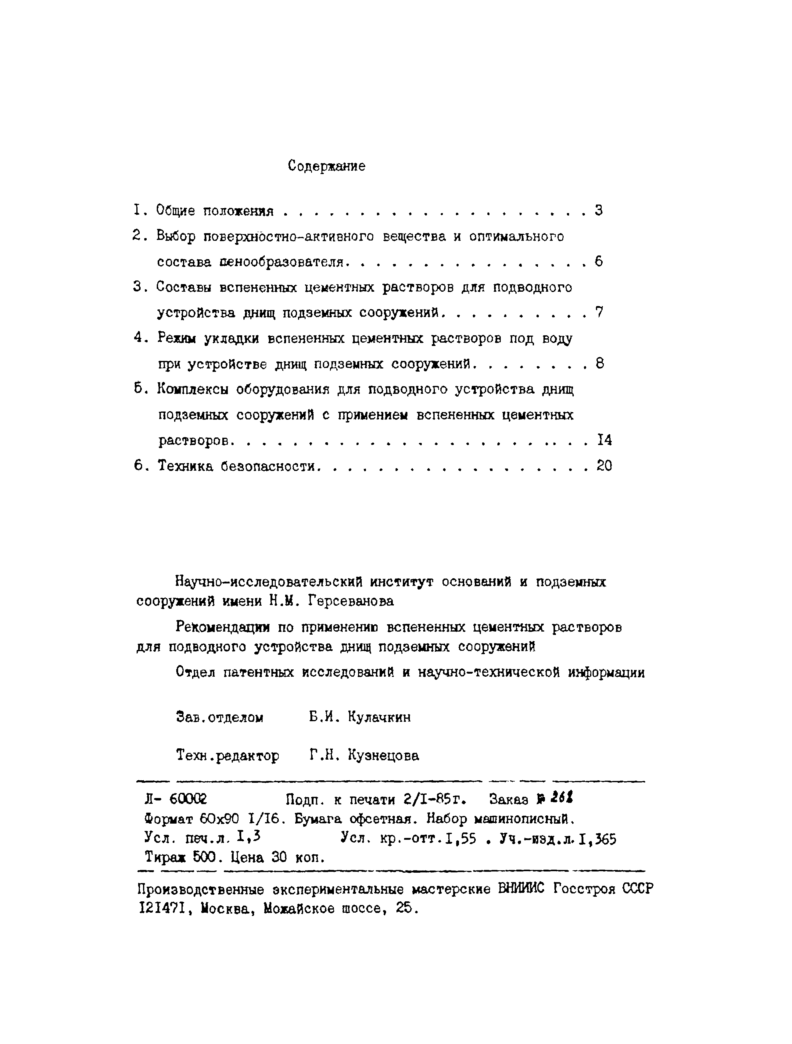 | Оглавление: | 1. Общие положения 2. Выбор поверхностно-активного вещества и оптимального состава пенообразователя 3. Составы вспененных цементных растворов для подводного устройства днищ подземных сооружений 4. Режим укладки вспененных цементных растворов под воду при устройстве днищ подземных сооружений 5. Комплексы оборудования для подводного устройства днищ подземных сооружений с применением вспененных цементных растворов 6. Техника безопасности |