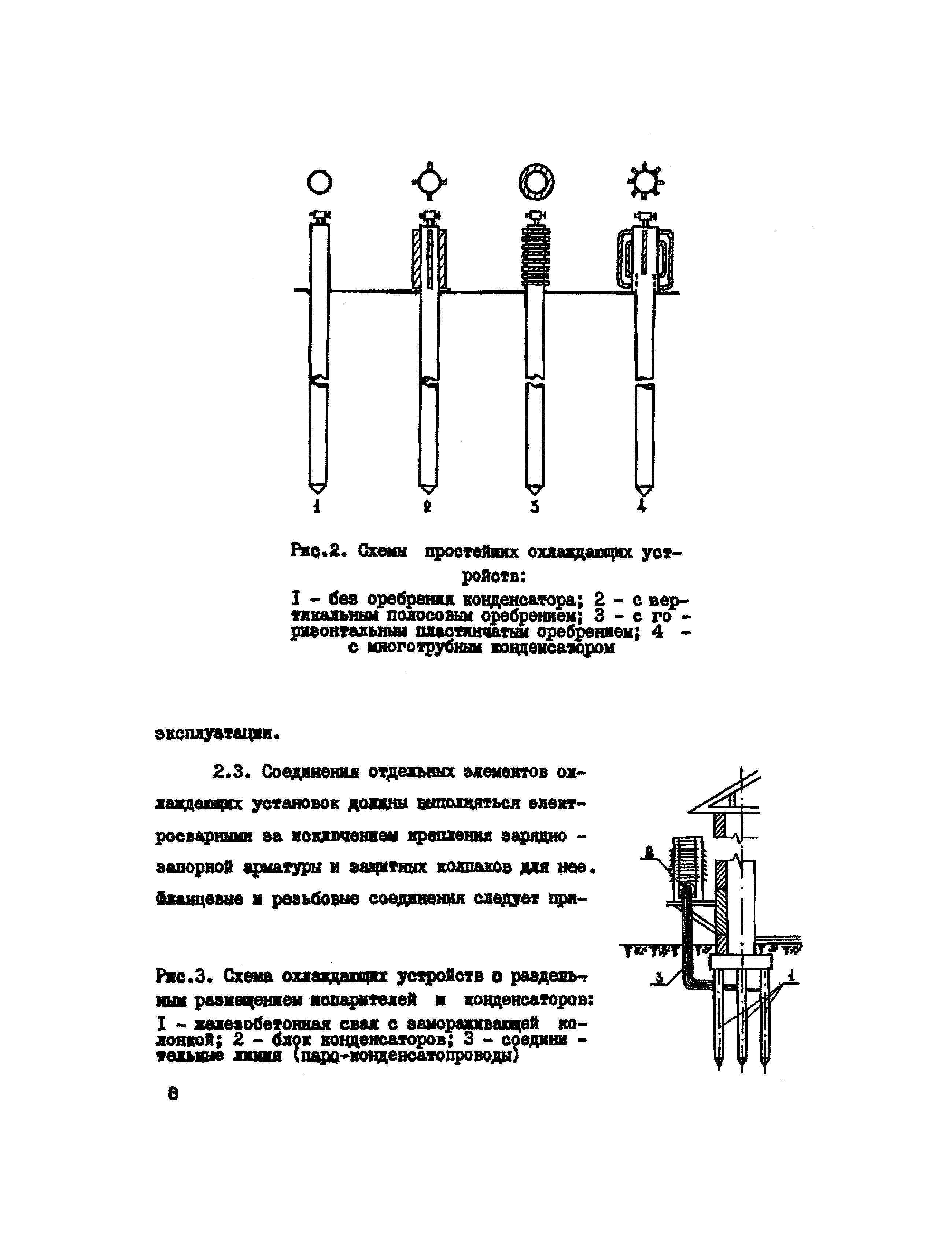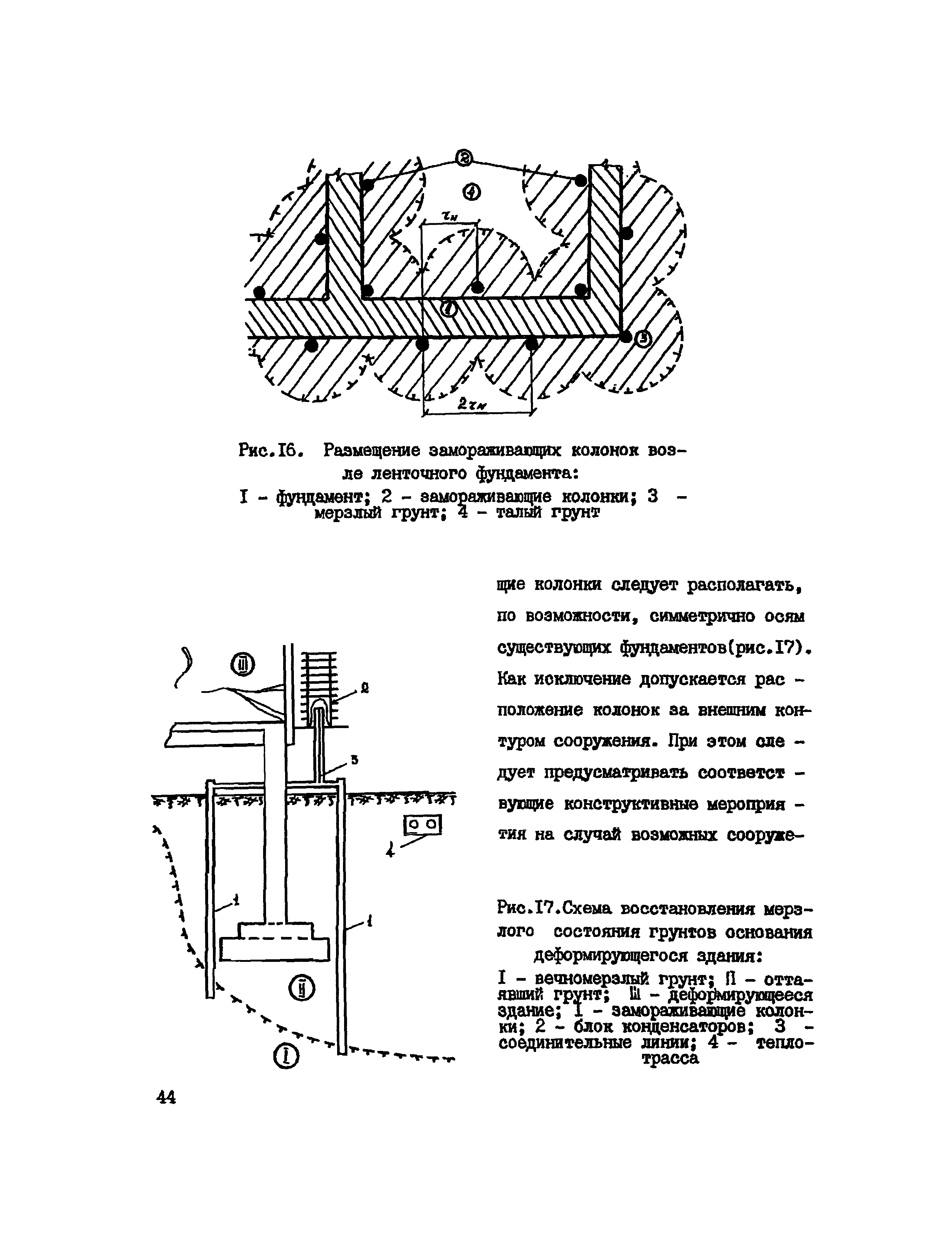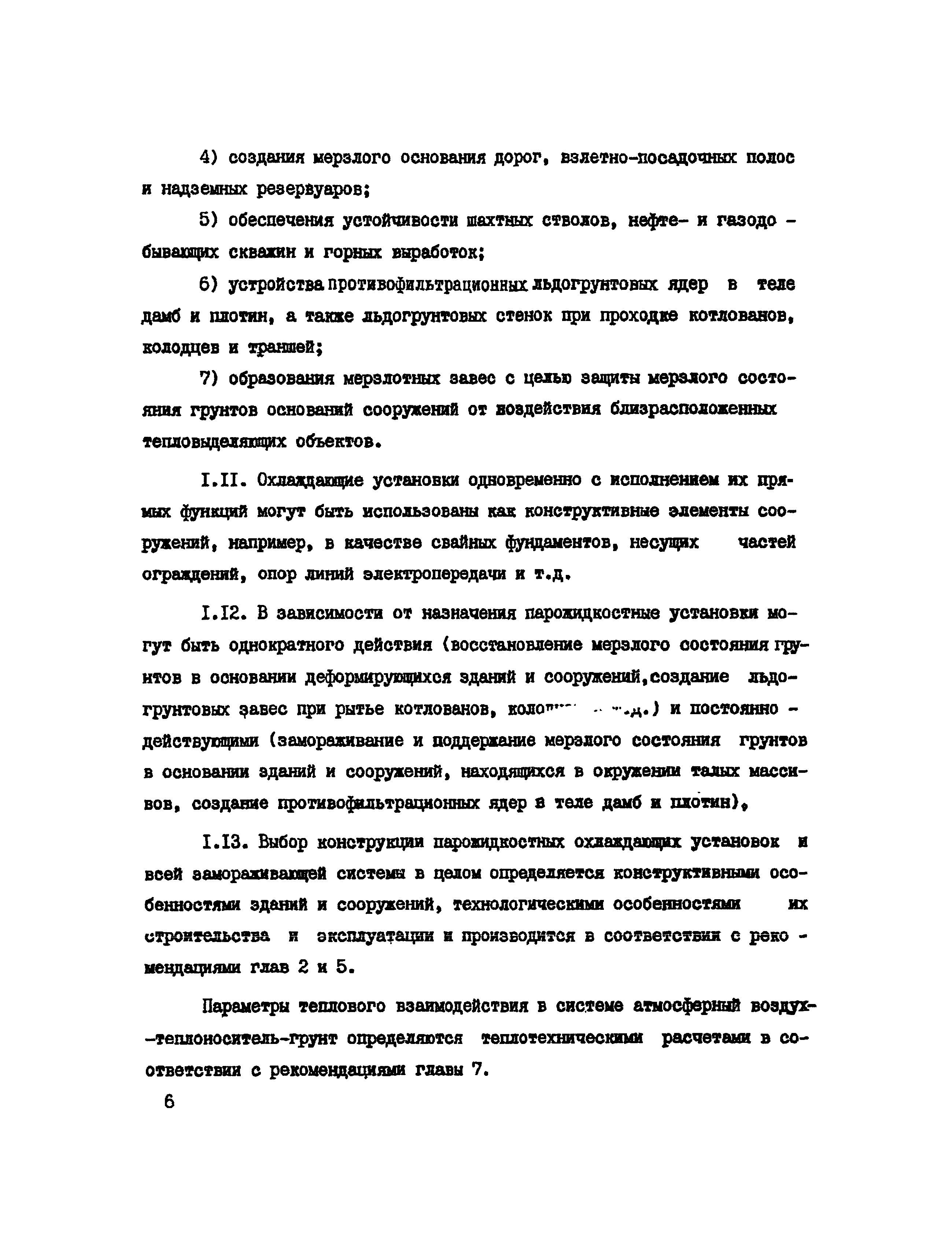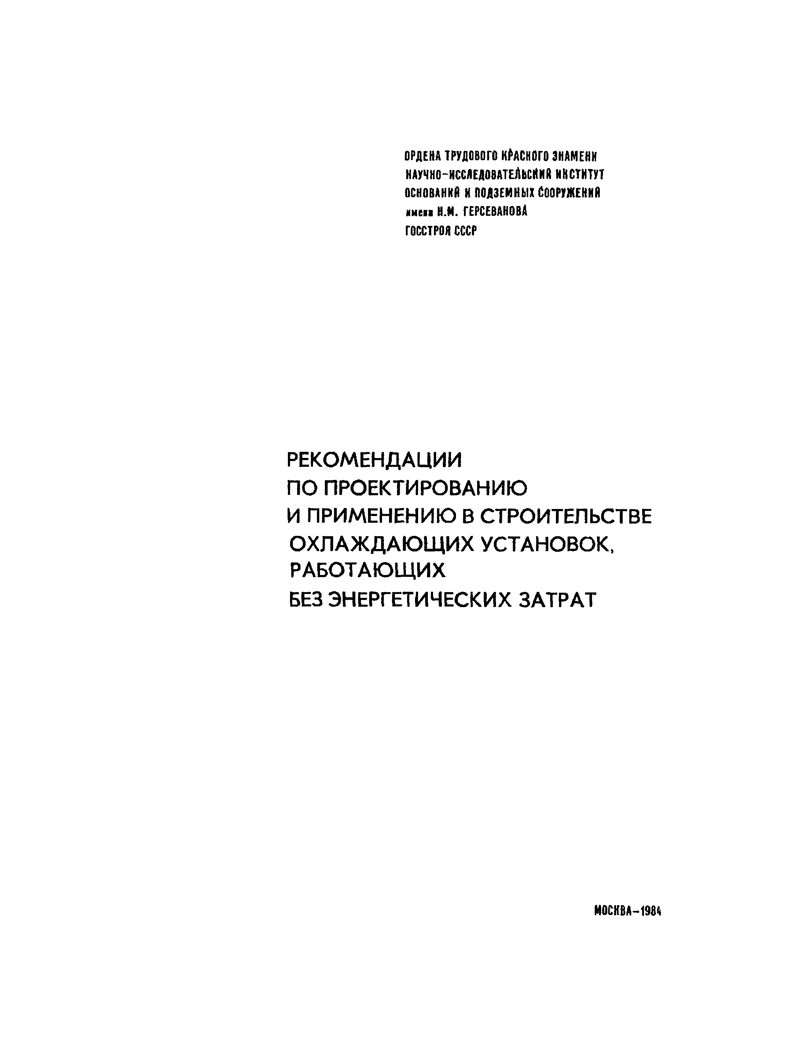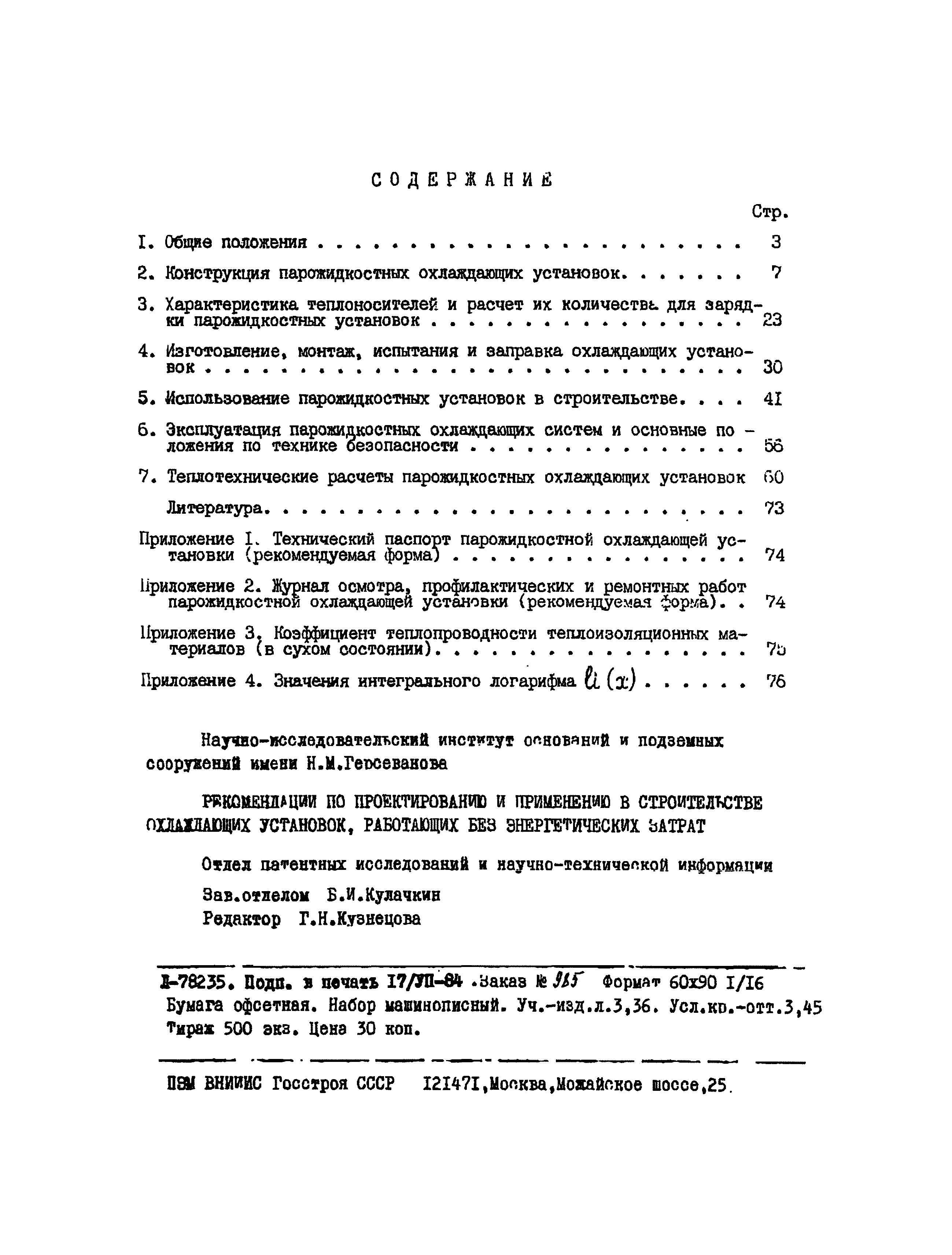 Рекомендации по проектированию и применению в строительстве охлаждающих установок, работающих без энергетических затрат| Статус: | справочные материалы, мп, тпр | | Название рус.: | Рекомендации по проектированию и применению в строительстве охлаждающих установок, работающих без энергетических затрат | | Дата добавления в базу: | 01.10.2014 | | Дата актуализации: | 01.01.2021 | | Область применения: | Рекомендации содержат положения по назначению, области применения, конструированию, устройству и эксплуатации автономных холодильных установок с легкокипящим теплоносителем, работающих за счет низких температур воздуха в зимний период. Приводятся рекомендации по предпостроечному замораживанию грунтов в основании сооружений, но их замораживанию в процессе строительства, по восстановлению мерзлого состояния грунтов, по созданию противофильтрационных экранов и мерзлотных завес. Дана методика теплотехнических расчетов замораживания грунта. Рекомендации предназначены для проектных и строительных организаций, занимающихся вопросами строительства в суровых климатических условиях | | Оглавление: | 1 Общие положения 2 Конструкция парожидкостных охлаждающих установок 3 Характеристика теплоносителей и расчет их количества для зарядки парожидкостных установок. 4 Изготовление, монтаж, испытания и заправка охлаждающих установок 5 Использование парожидкостных установок в строительстве 6 Эксплуатация парожидкостных охлаждающих систем и основные положения по технике безопасности 7 Теплотехнические расчеты парожидкостных охлаждающих установок Литература Приложение 1. Технический паспорт парожидкостной охлаждающей установки (рекомендуемая форма) Приложение 2. Журнал осмотра, профилактических и ремонтных работ парожидкостной охлаждающей установок (рекомендуемая форма) Приложение 3. Коэффициент теплопроводности теплоизоляционных материалов (в сухом состоянии) Приложение 4. Значения интегрального логарифма | | Разработан: | НИИОСП им. Герсеванова Госстроя России
