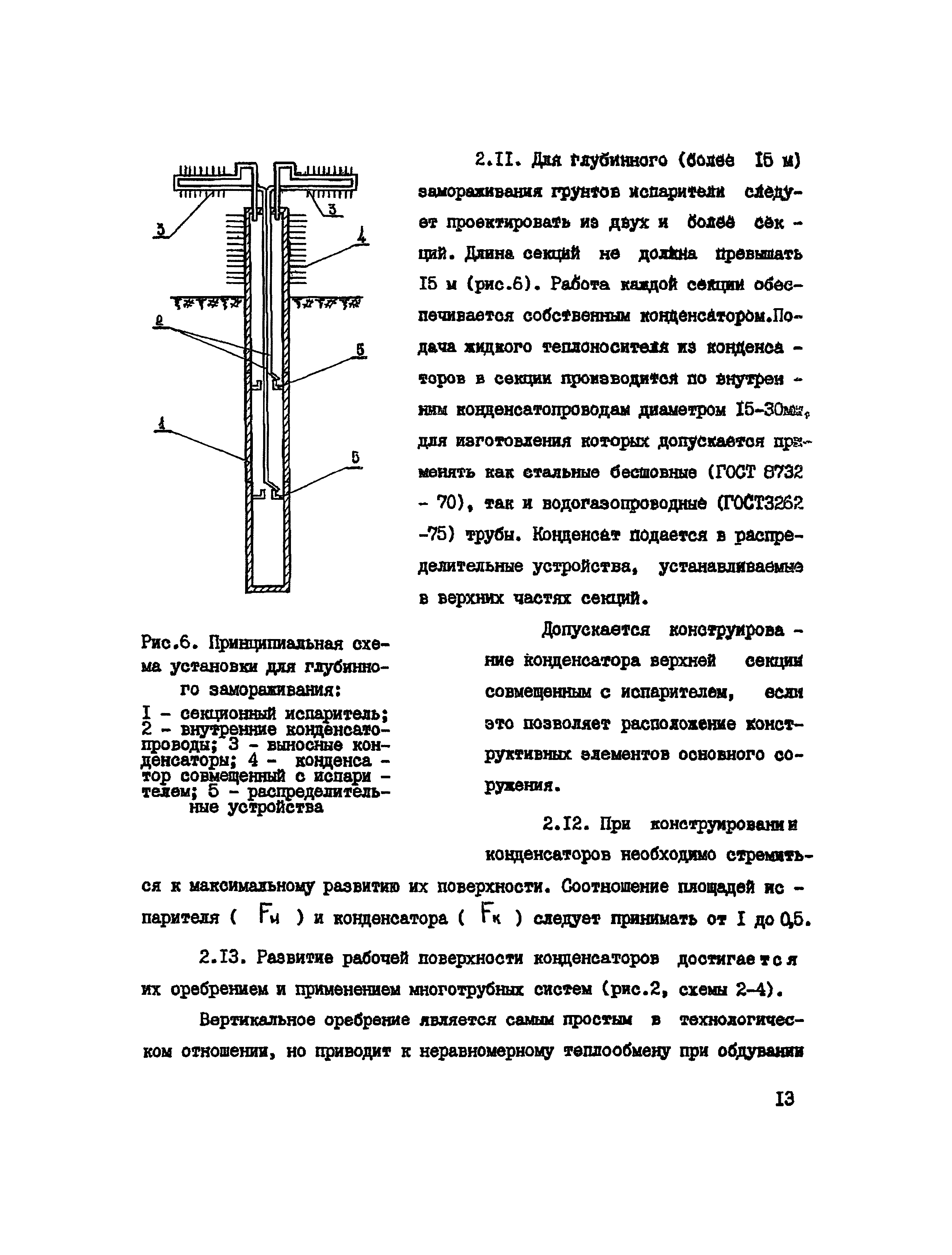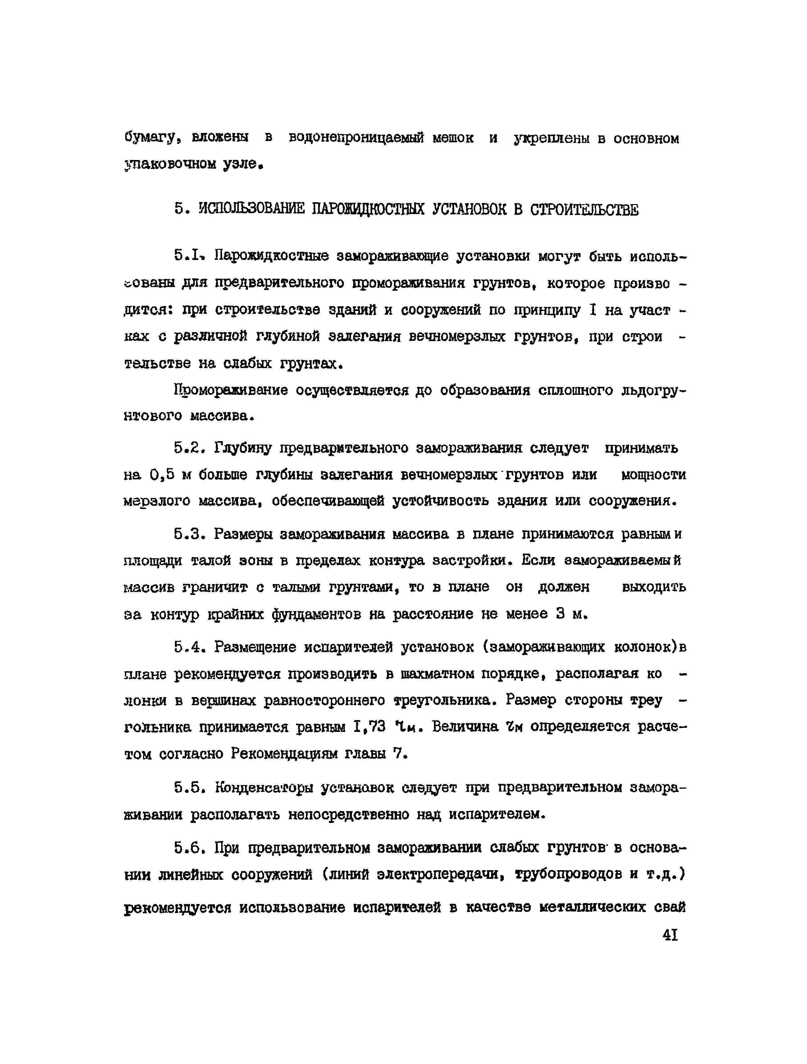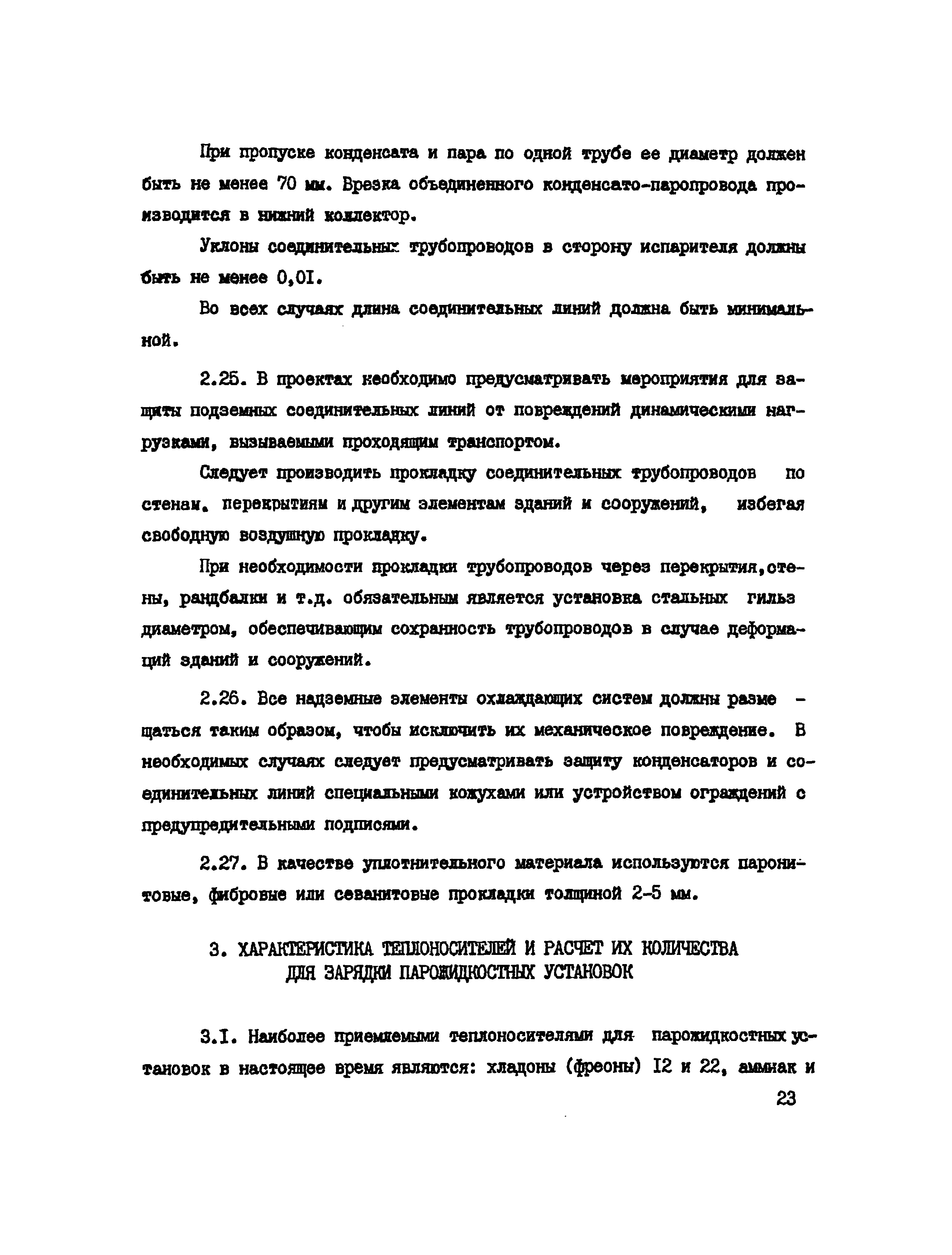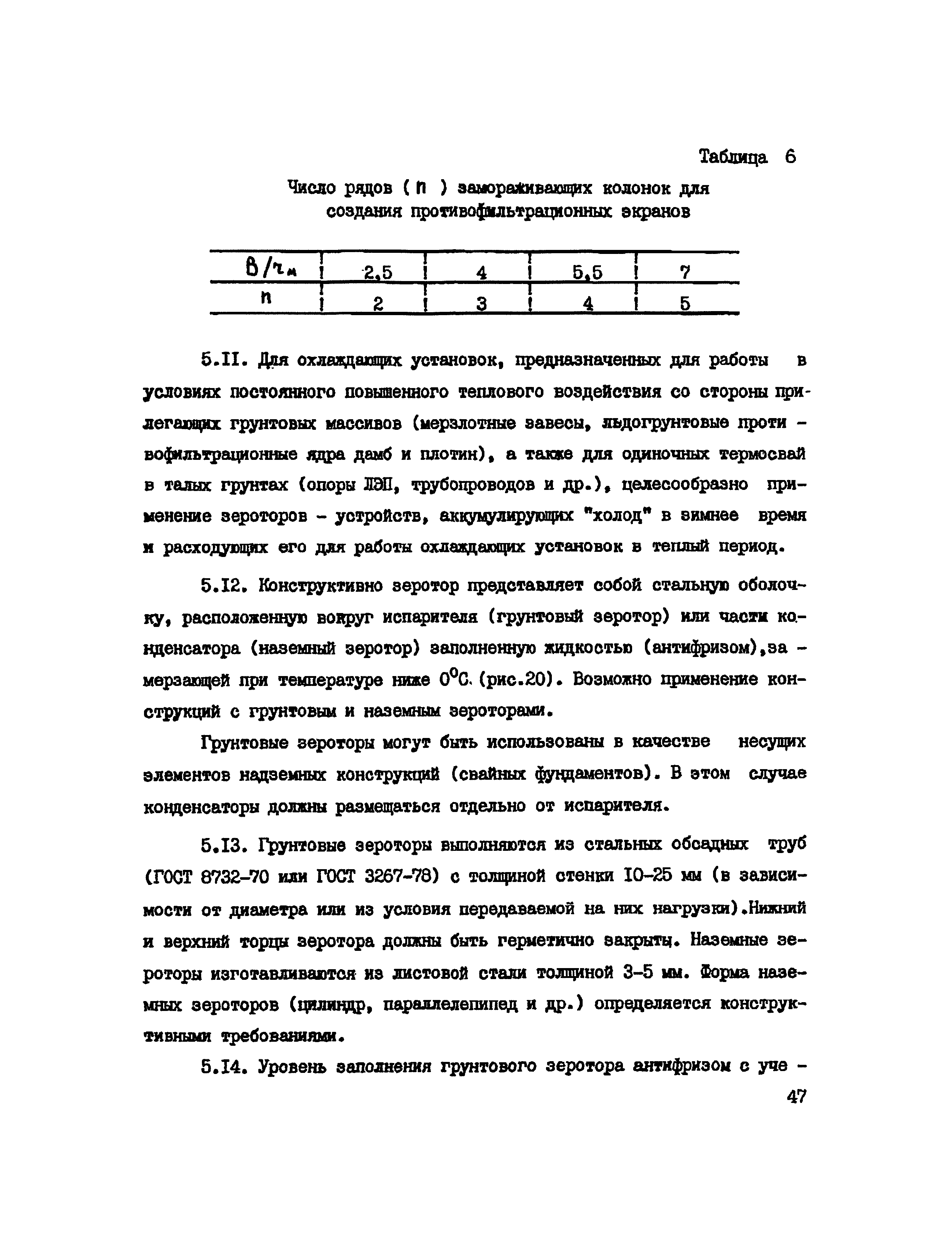 Рекомендации по проектированию и применению в строительстве охлаждающих установок, работающих без энергетических затрат| Статус: | справочные материалы, мп, тпр | | Название рус.: | Рекомендации по проектированию и применению в строительстве охлаждающих установок, работающих без энергетических затрат | | Дата добавления в базу: | 01.10.2014 | | Дата актуализации: | 01.01.2021 | | Область применения: | Рекомендации содержат положения по назначению, области применения, конструированию, устройству и эксплуатации автономных холодильных установок с легкокипящим теплоносителем, работающих за счет низких температур воздуха в зимний период. Приводятся рекомендации по предпостроечному замораживанию грунтов в основании сооружений, но их замораживанию в процессе строительства, по восстановлению мерзлого состояния грунтов, по созданию противофильтрационных экранов и мерзлотных завес. Дана методика теплотехнических расчетов замораживания грунта. Рекомендации предназначены для проектных и строительных организаций, занимающихся вопросами строительства в суровых климатических условиях | | Оглавление: | 1 Общие положения 2 Конструкция парожидкостных охлаждающих установок 3 Характеристика теплоносителей и расчет их количества для зарядки парожидкостных установок. 4 Изготовление, монтаж, испытания и заправка охлаждающих установок 5 Использование парожидкостных установок в строительстве 6 Эксплуатация парожидкостных охлаждающих систем и основные положения по технике безопасности 7 Теплотехнические расчеты парожидкостных охлаждающих установок Литература Приложение 1. Технический паспорт парожидкостной охлаждающей установки (рекомендуемая форма) Приложение 2. Журнал осмотра, профилактических и ремонтных работ парожидкостной охлаждающей установок (рекомендуемая форма) Приложение 3. Коэффициент теплопроводности теплоизоляционных материалов (в сухом состоянии) Приложение 4. Значения интегрального логарифма | | Разработан: | НИИОСП им. Герсеванова Госстроя России