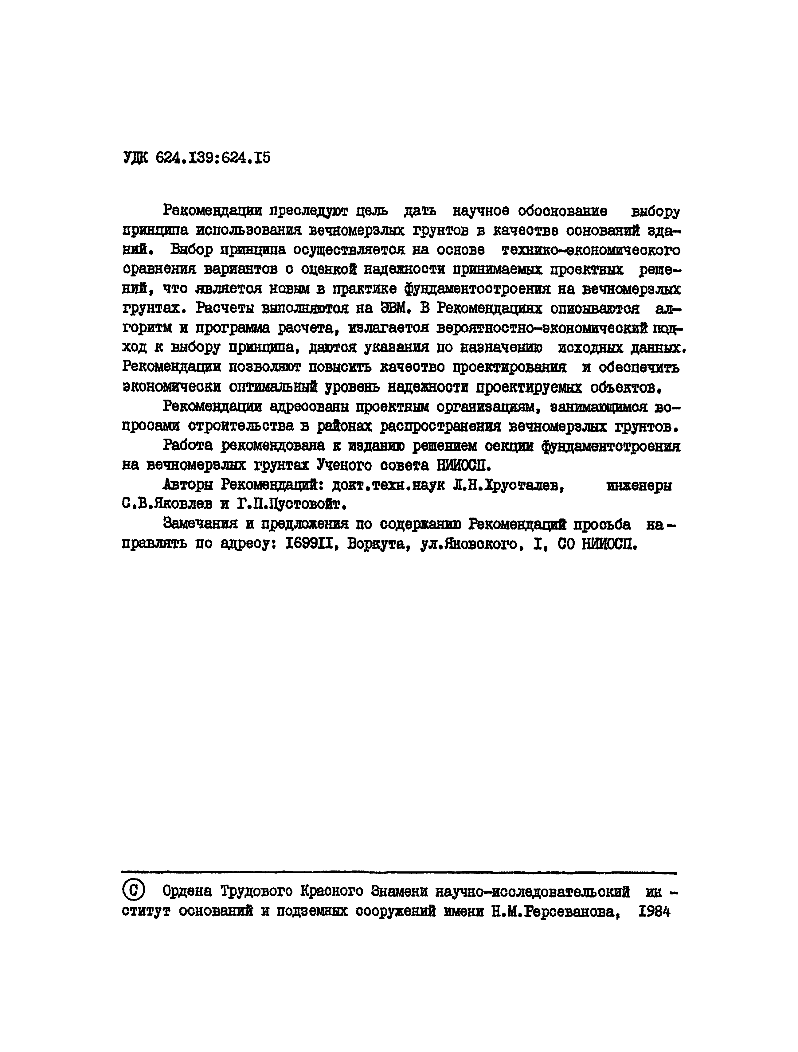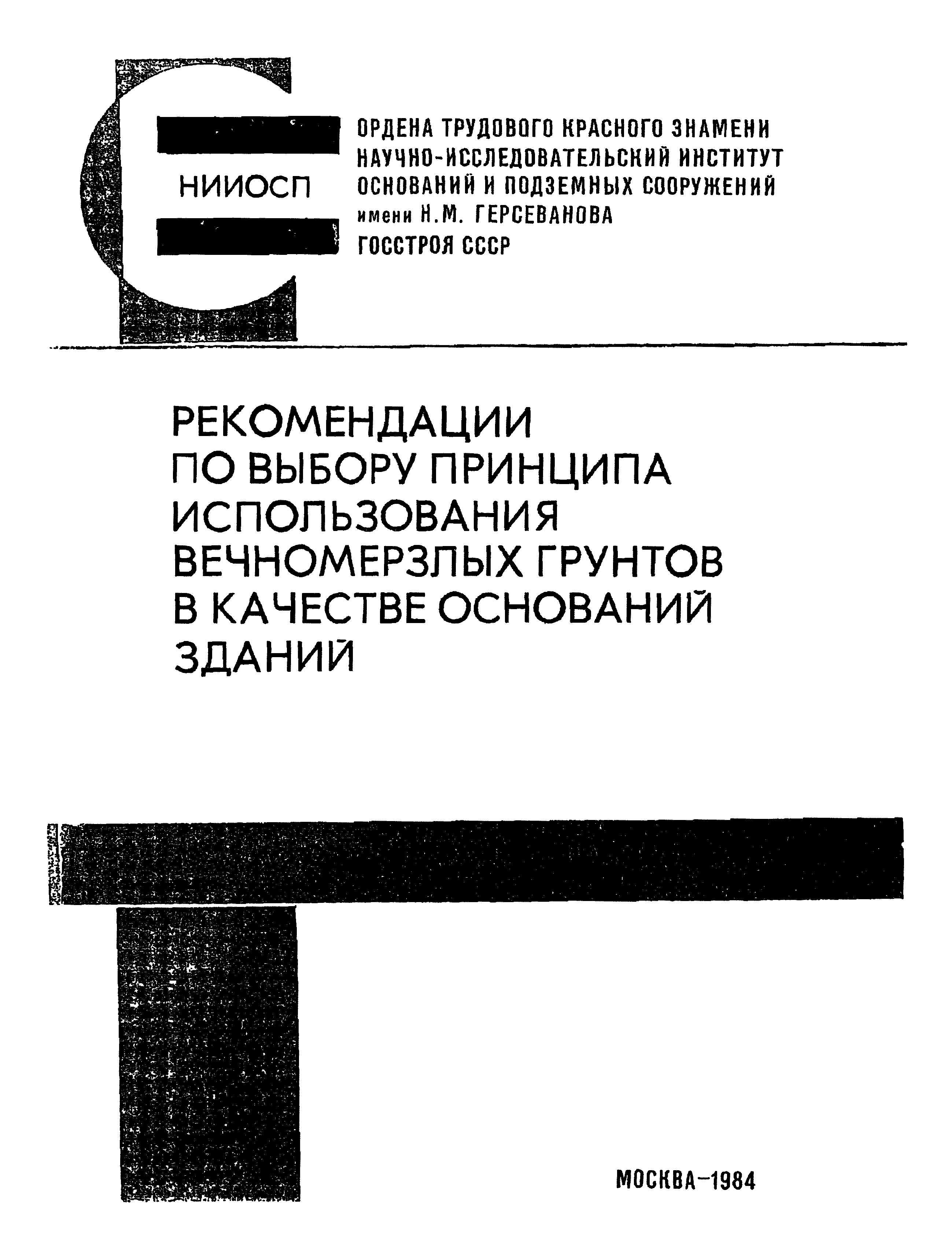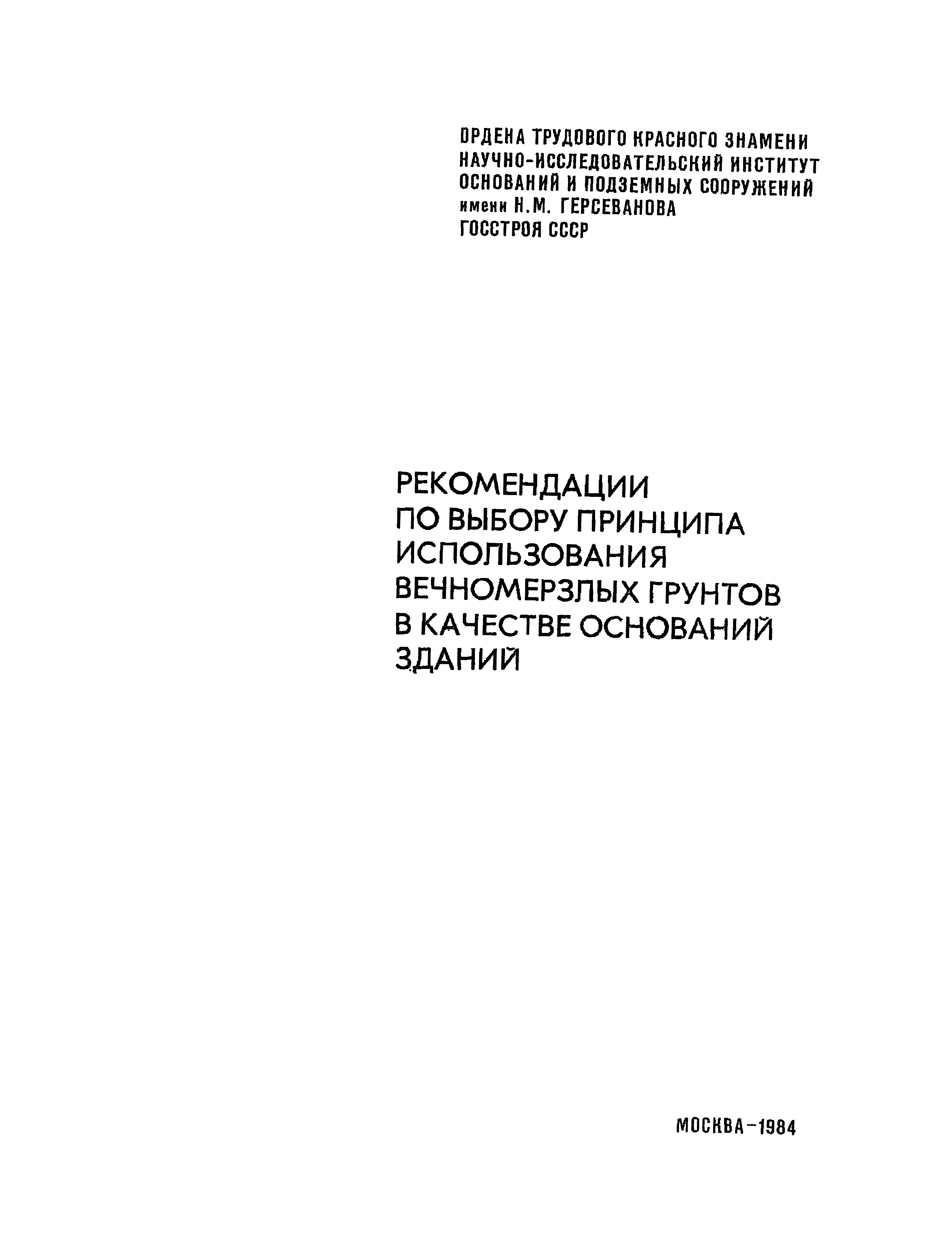 | Название рус.: | Рекомендации по выбору принципа использования вечномерзлых грунтов в качестве оснований зданий |