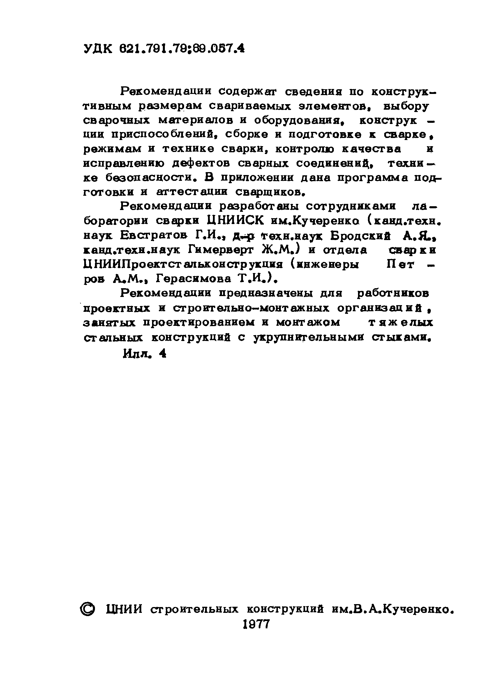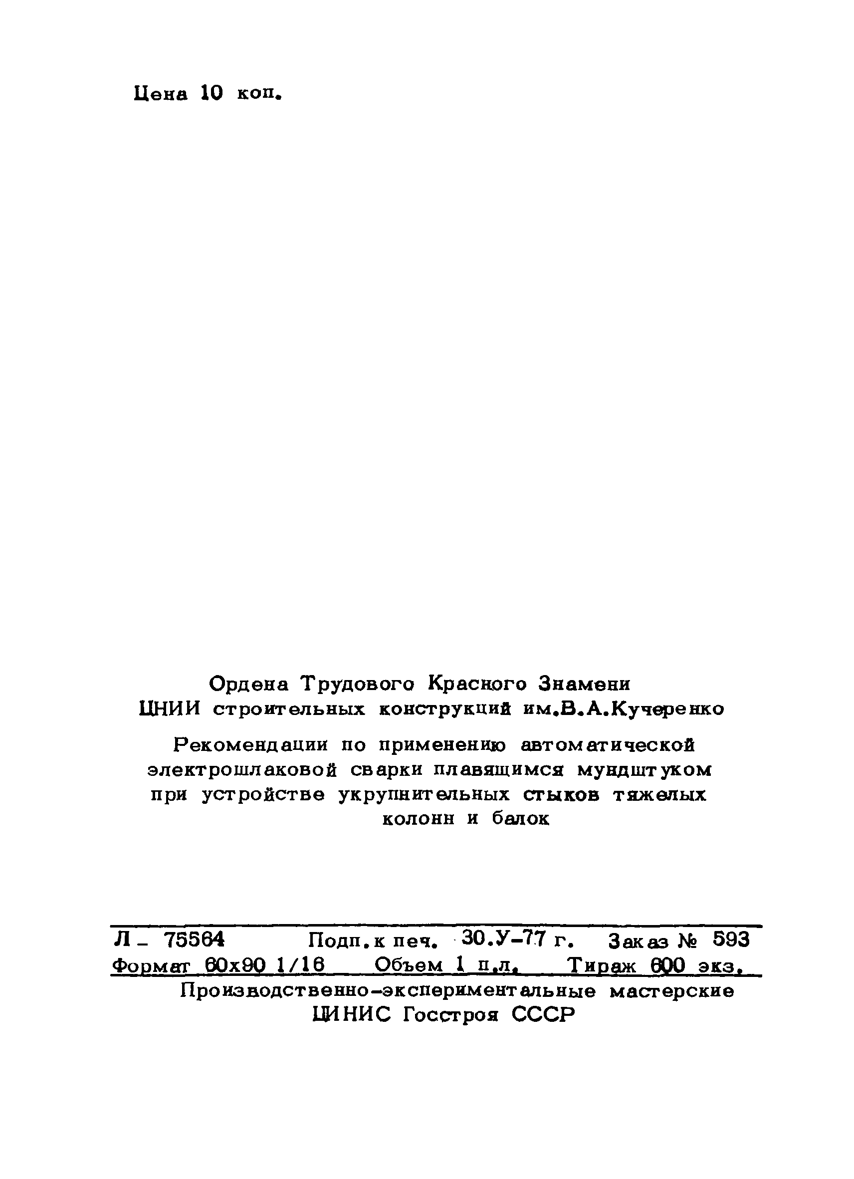 | Название рус.: | Рекомендации по применению автоматической электрошлаковой сварки плавящимся мундштуком при устройстве укрупнительных стыков тяжелых колонн и балок |