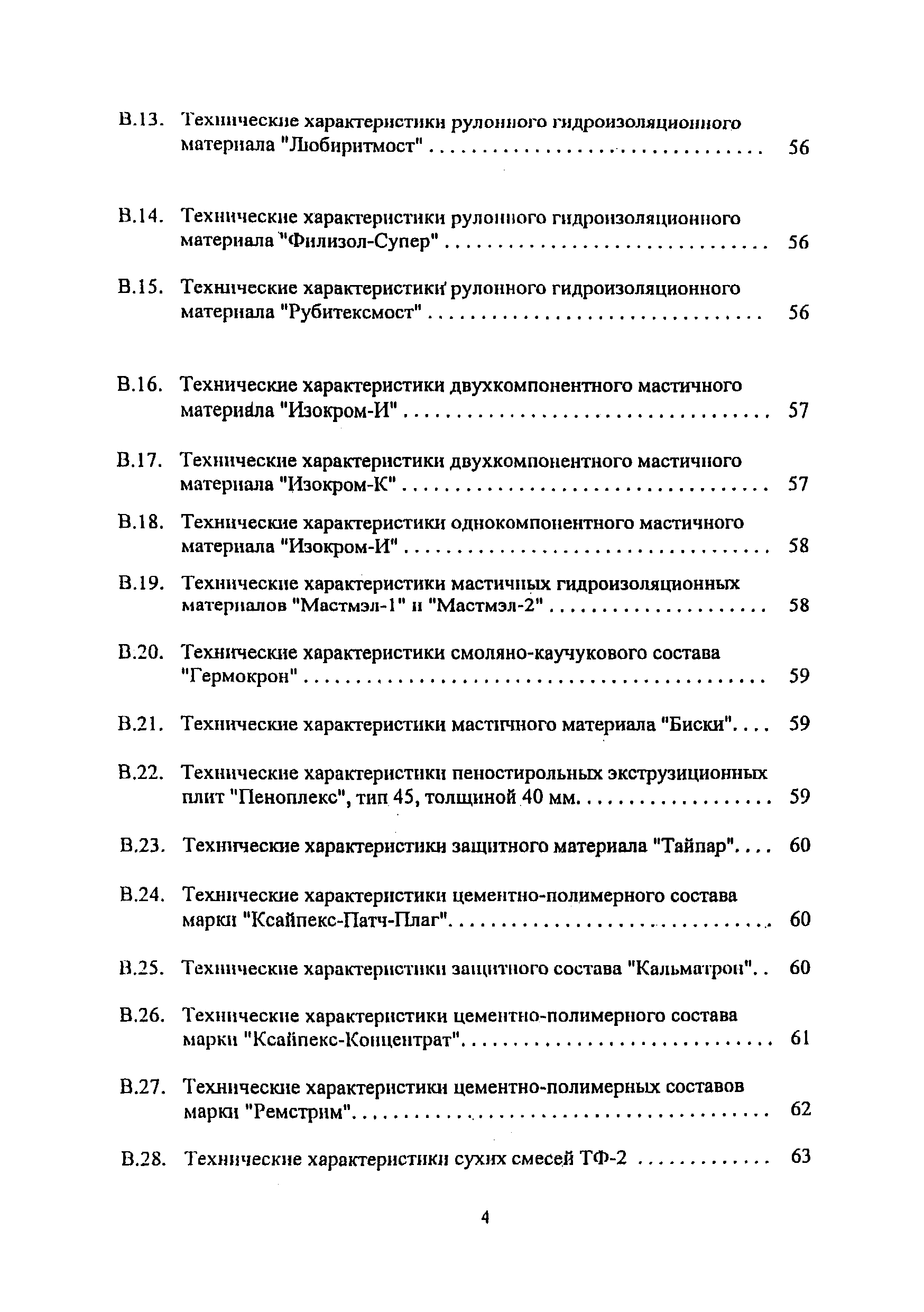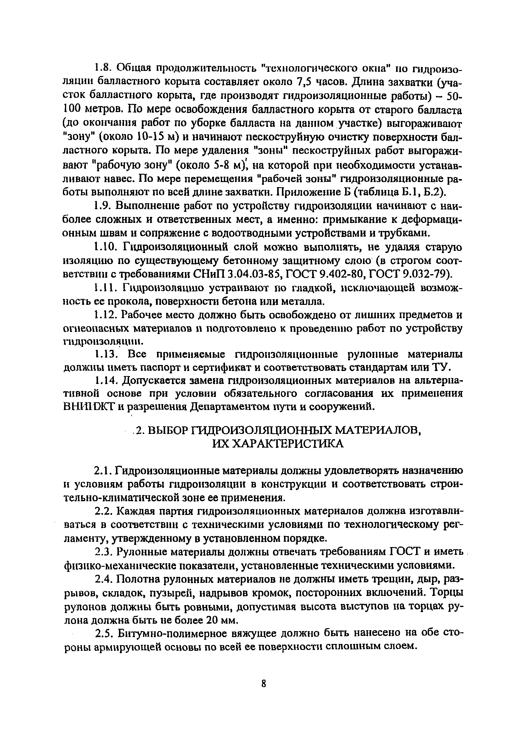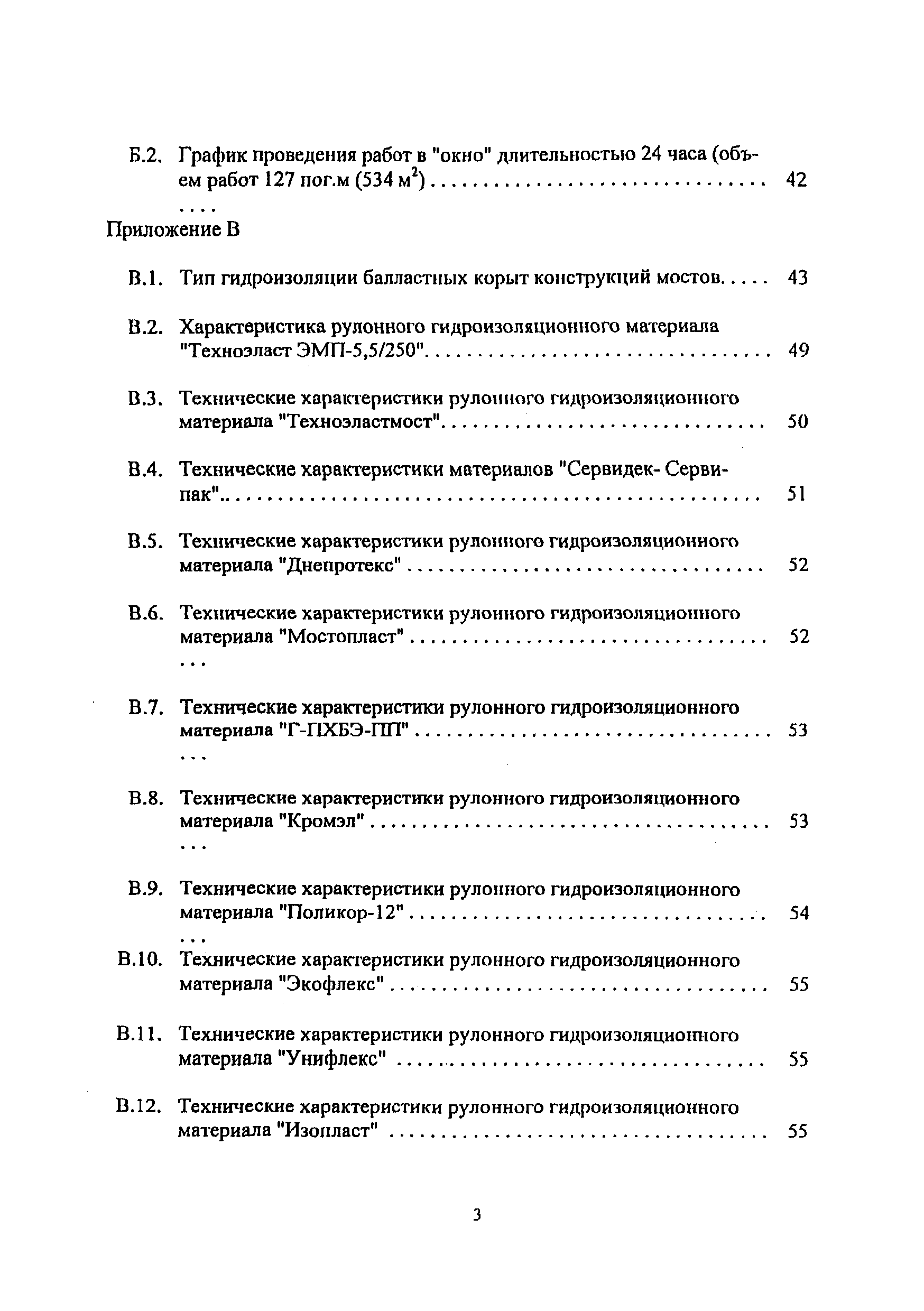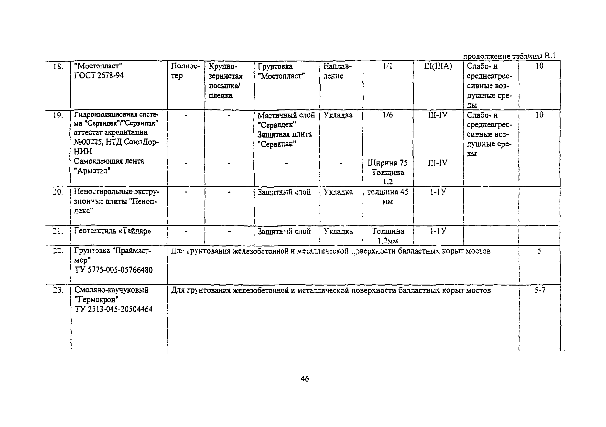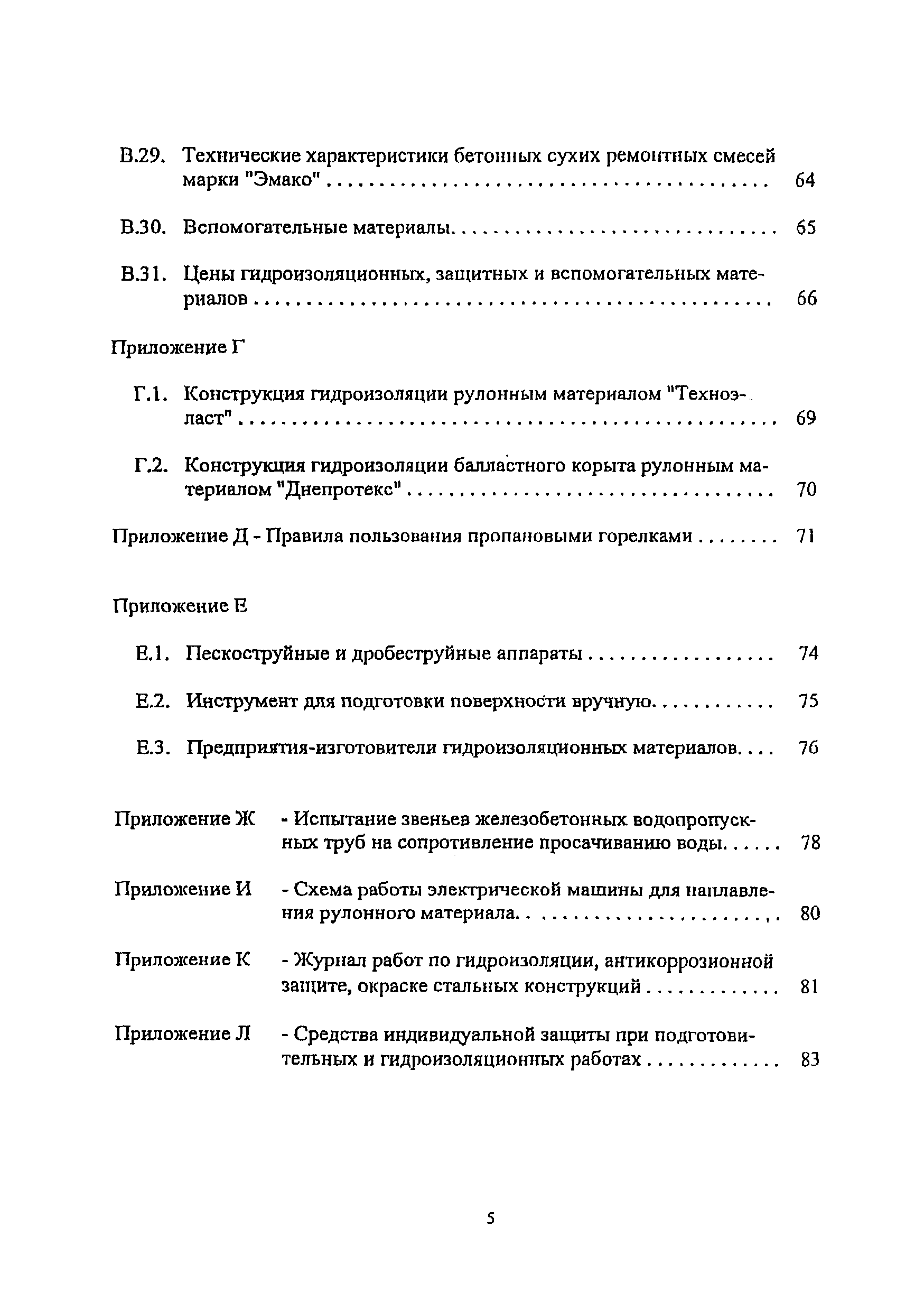 | Оглавление: | Введение 1. Общие положения 2. Выбор гидроизоляционных материалов, их характеристика 3. Конструкция гидроизоляции 4. Подготовка поверхности под гидроизоляцию 5. Устройство гидроизоляции в местах примыкания к водоотводным трубкам 6. Технология выполнения гидроизоляции 7. Защитный слой гидроизоляции 8. Контроль качества материала в правила приемки гидроизоляционного слоя 9. Оборудование для производства работ по устройству гидроизоляции 10. Хранение гидроизоляционных материалов 11. Охрана труда, окружающей среды и пожарная безопасность при устройстве гидроизоляции Список использованных источников Приложение А А. 1. Климатическое районирование А.2. Технические требования к качеству поверхности перед окрашиванием Приложение Б Б.1. График проведения работ в "окно" длительностью 7,5 часов (объем работ 25 пог.м (105 м2) Б.2. График проведения работ в "окно" длительностью 24 часа (объем работ 127 пог.м (534 м2) Приложение В В.1. Тип гидроизоляции балластных корыт конструкций мостов В.2. Характеристика рулонного гидроизоляционного материала "Техноэласт ЭМП-5,5/250" В.3. Технические характеристики рулонного гидроизоляционного материала "Техноэластмост" В.4. Технические характеристики материалов "Сервидек- Сервипак" В.5. Технические характеристики рулонного гидроизоляционного материала "Днепротекс" В.6. Технические характеристики рулонного гидроизоляционного материала "Мостопласт" В.7. Технические характеристики рулонного гидроизоляционного материала "Г-ПХБЭ-ПП" В.8. Технические характеристики рулонного гидроизоляционного материала "Кромэл" В.9. Технические характеристики рулонного гидроизоляционного материала "Поликор-12" В.10. Технические характеристики рулонного гидроизоляционного материала "Экофлекс" В.11. Технические характеристики рулонного гидроизоляционного материала "Унифлекс" В.12. Технические характеристики рулонного гидроизоляционного материала "Изопласт" В.13. Технические характеристики рулонного гидроизоляционного материала "Любиритмост" В.14. Технические характеристики рулонного гидроизоляционного материала "Филизол-Супер" В.15. Технические характеристика рулонного гидроизоляционного материала "Рубитексмост" В.16. Технические характеристики двухкомпонентного мастичного материала "Изокром-И" В.17. Технические характеристики двухкомпонентного мастичного материала "Изокром-К" В.18. Технические характеристики однокомпонентного мастичного материала "Изокром-И" В.19. Технические характеристики мастичных гидроизоляционных материалов "Мастмэл-1" и "Мастмэл-2" В.20. Технические характеристики смоляно-каучукового состава "Гермокрон" В.21. Технические характеристики мастичного материала "Биски" В.22. Технические характеристики пеностирольных экструзиционных плит "Пеноплекс", тип 45, толщиной 40 мм В.23. Технические характеристики защитного материала "Тайпар" В.24. Технические характеристики цементно-полимерного состава марки "Ксайпекс-Патч-Плаг" В.25. Технические характеристики защитного состава "Кальматрон" В.26. Технические характеристики цементно-полимерного состава марки "Ксайпекс-Концентрат" В.27. Технические характеристика цементно-полимерных составов марки "Ремстрим" В.28. Технические характеристики сухих смесей ТФ-2 В.29. Технические характеристики бетонных сухих ремонтных смесей марки "Эмако" В.30. Вспомогательные материалы 