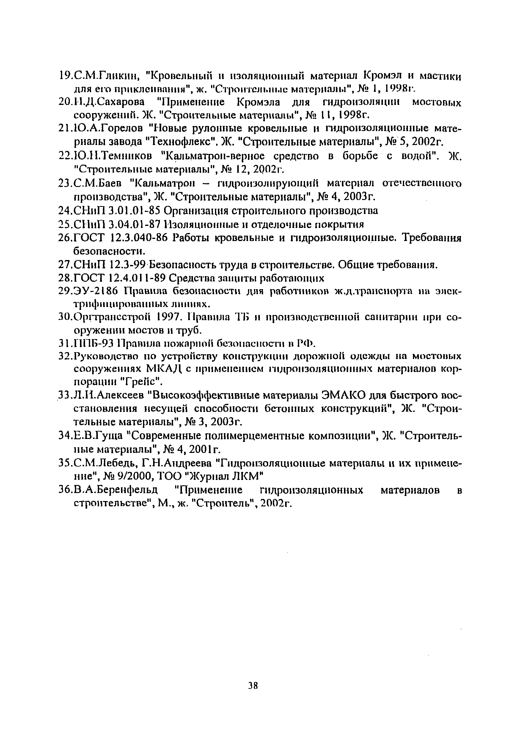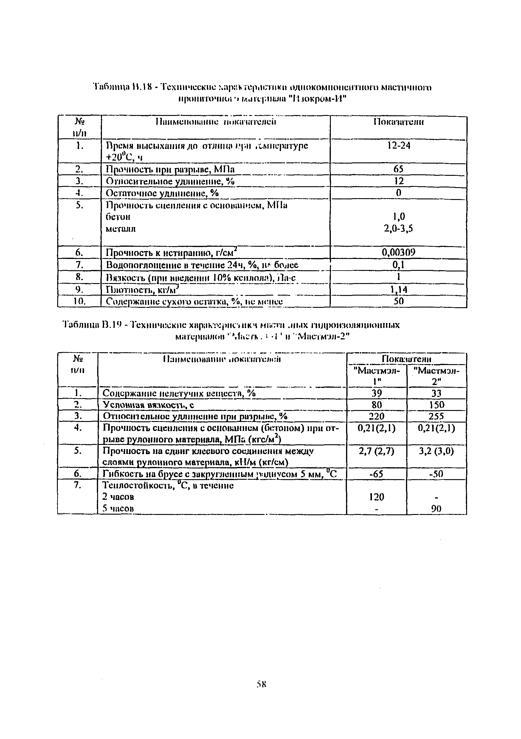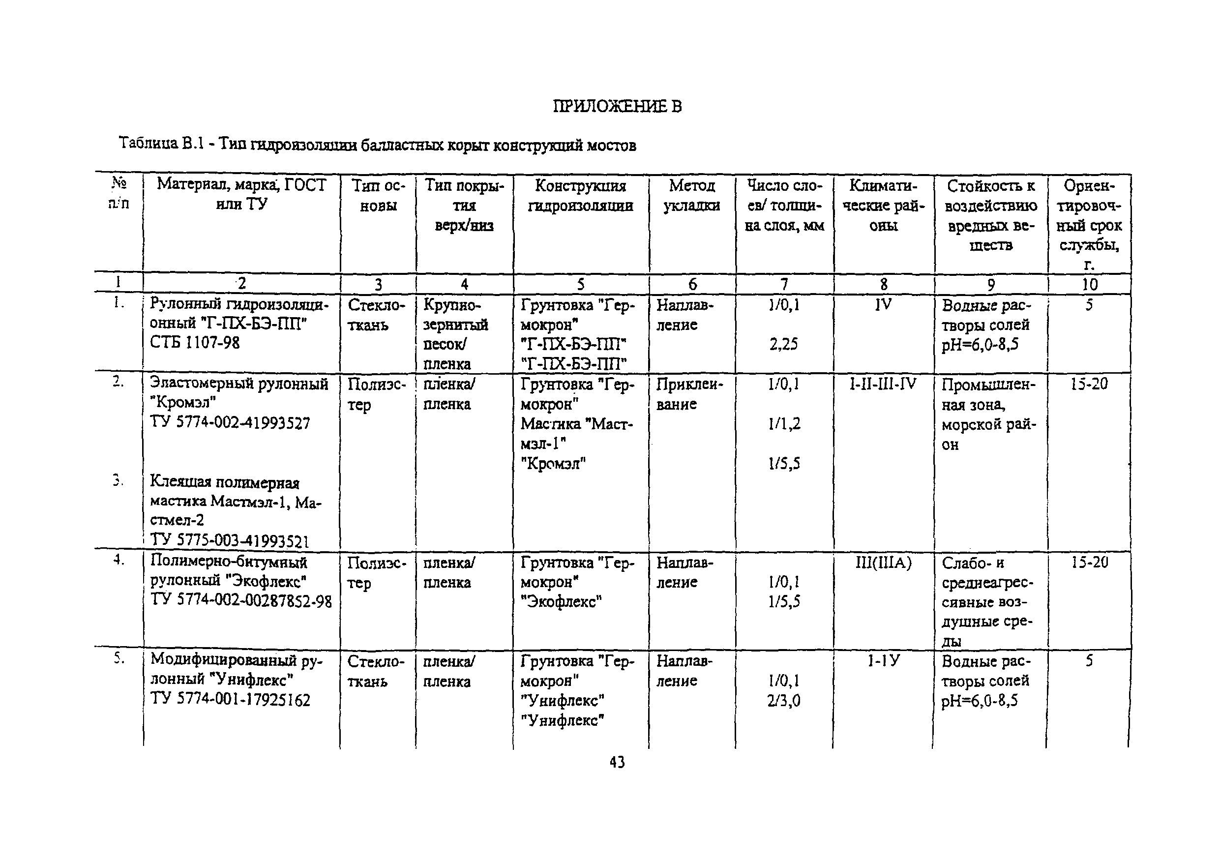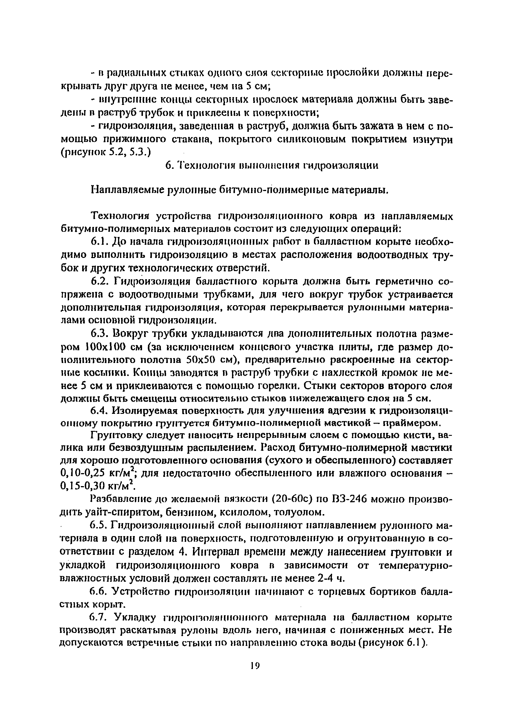 | Оглавление: | Введение 1. Общие положения 2. Выбор гидроизоляционных материалов, их характеристика 3. Конструкция гидроизоляции 4. Подготовка поверхности под гидроизоляцию 5. Устройство гидроизоляции в местах примыкания к водоотводным трубкам 6. Технология выполнения гидроизоляции 7. Защитный слой гидроизоляции 8. Контроль качества материала в правила приемки гидроизоляционного слоя 9. Оборудование для производства работ по устройству гидроизоляции 10. Хранение гидроизоляционных материалов 11. Охрана труда, окружающей среды и пожарная безопасность при устройстве гидроизоляции Список использованных источников Приложение А А. 1. Климатическое районирование А.2. Технические требования к качеству поверхности перед окрашиванием Приложение Б Б.1. График проведения работ в "окно" длительностью 7,5 часов (объем работ 25 пог.м (105 м2) Б.2. График проведения работ в "окно" длительностью 24 часа (объем работ 127 пог.м (534 м2) Приложение В В.1. Тип гидроизоляции балластных корыт конструкций мостов В.2. Характеристика рулонного гидроизоляционного материала "Техноэласт ЭМП-5,5/250" В.3. Технические характеристики рулонного гидроизоляционного материала "Техноэластмост" В.4. Технические характеристики материалов "Сервидек- Сервипак" В.5. Технические характеристики рулонного гидроизоляционного материала "Днепротекс" В.6. Технические характеристики рулонного гидроизоляционного материала "Мостопласт" В.7. Технические характеристики рулонного гидроизоляционного материала "Г-ПХБЭ-ПП" В.8. Технические характеристики рулонного гидроизоляционного материала "Кромэл" В.9. Технические характеристики рулонного гидроизоляционного материала "Поликор-12" В.10. Технические характеристики рулонного гидроизоляционного материала "Экофлекс" В.11. Технические характеристики рулонного гидроизоляционного материала "Унифлекс" В.12. Технические характеристики рулонного гидроизоляционного материала "Изопласт" В.13. Технические характеристики рулонного гидроизоляционного материала "Любиритмост" В.14. Технические характеристики рулонного гидроизоляционного материала "Филизол-Супер" В.15. Технические характеристика рулонного гидроизоляционного материала "Рубитексмост" В.16. Технические характеристики двухкомпонентного мастичного материала "Изокром-И" В.17. Технические характеристики двухкомпонентного мастичного материала "Изокром-К" В.18. Технические характеристики однокомпонентного мастичного материала "Изокром-И" В.19. Технические характеристики мастичных гидроизоляционных материалов "Мастмэл-1" и "Мастмэл-2" В.20. Технические характеристики смоляно-каучукового состава "Гермокрон" В.21. Технические характеристики мастичного материала "Биски" В.22. Технические характеристики пеностирольных экструзиционных плит "Пеноплекс", тип 45, толщиной 40 мм В.23. Технические характеристики защитного материала "Тайпар" В.24. Технические характеристики цементно-полимерного состава марки "Ксайпекс-Патч-Плаг" В.25. Технические характеристики защитного состава "Кальматрон" В.26. Технические характеристики цементно-полимерного состава марки "Ксайпекс-Концентрат" В.27. Технические характеристика цементно-полимерных составов марки "Ремстрим" В.28. Технические характеристики сухих смесей ТФ-2 В.29. Технические характеристики бетонных сухих ремонтных смесей марки "Эмако" В.30. Вспомогательные материалы 